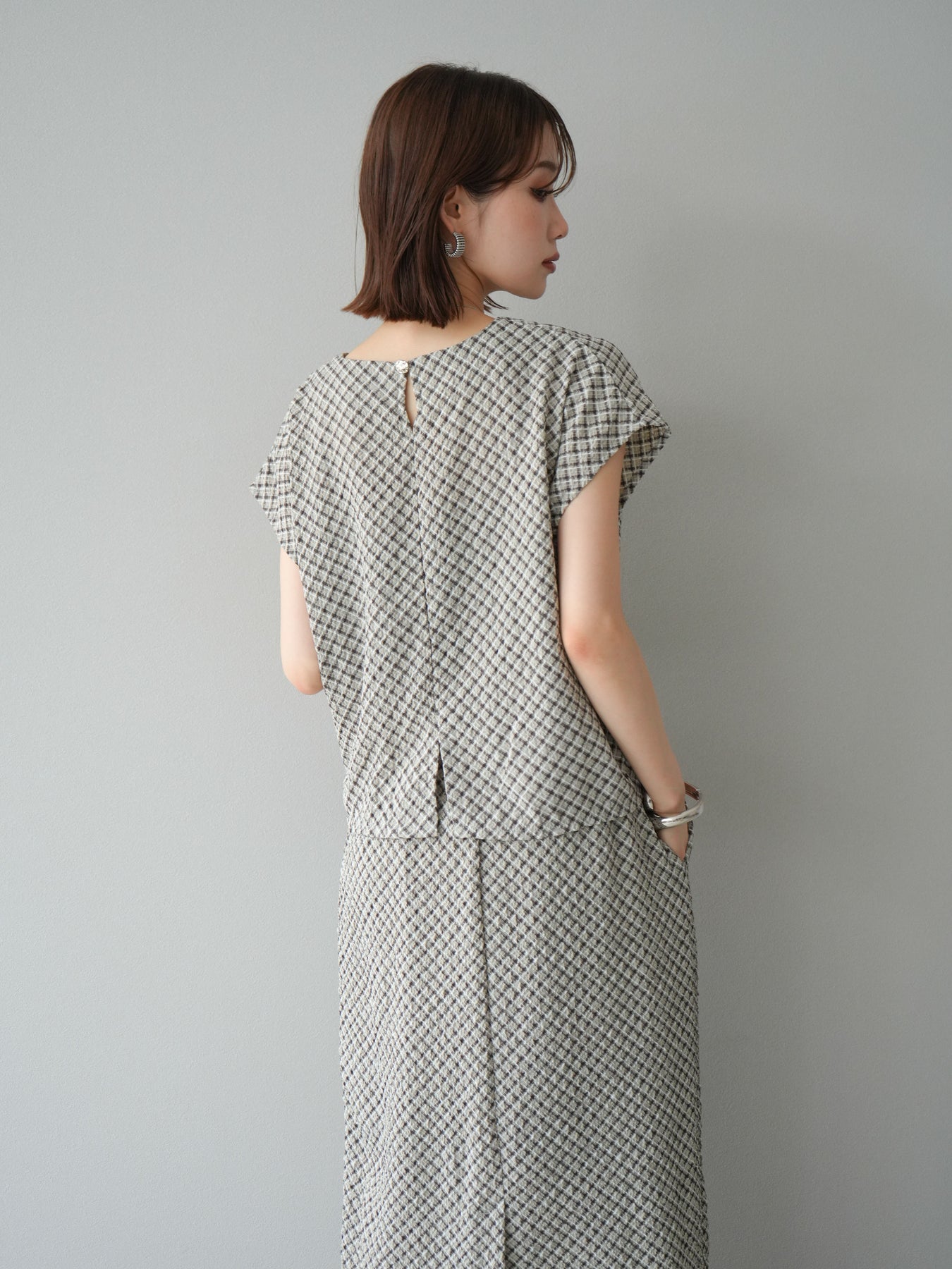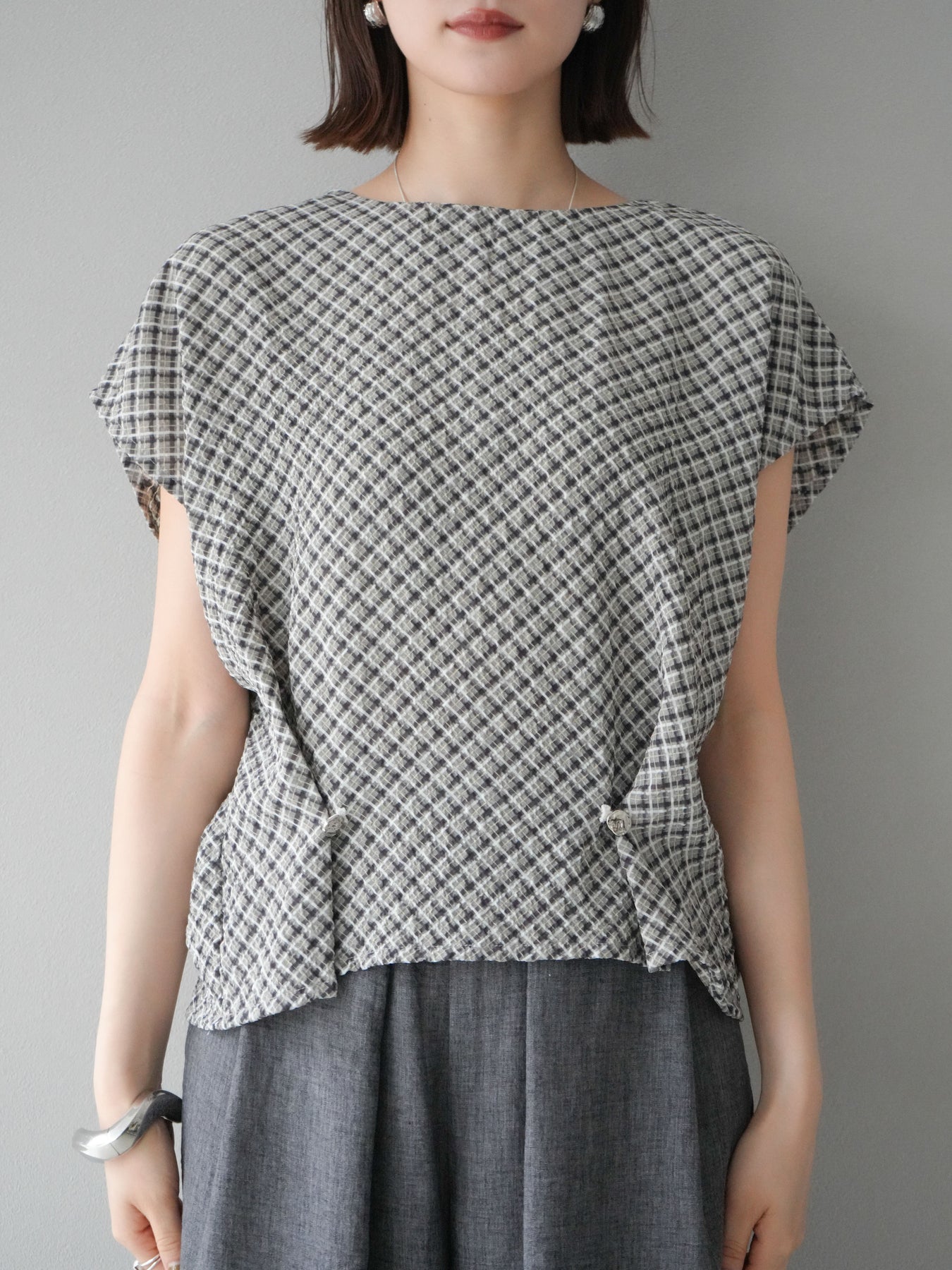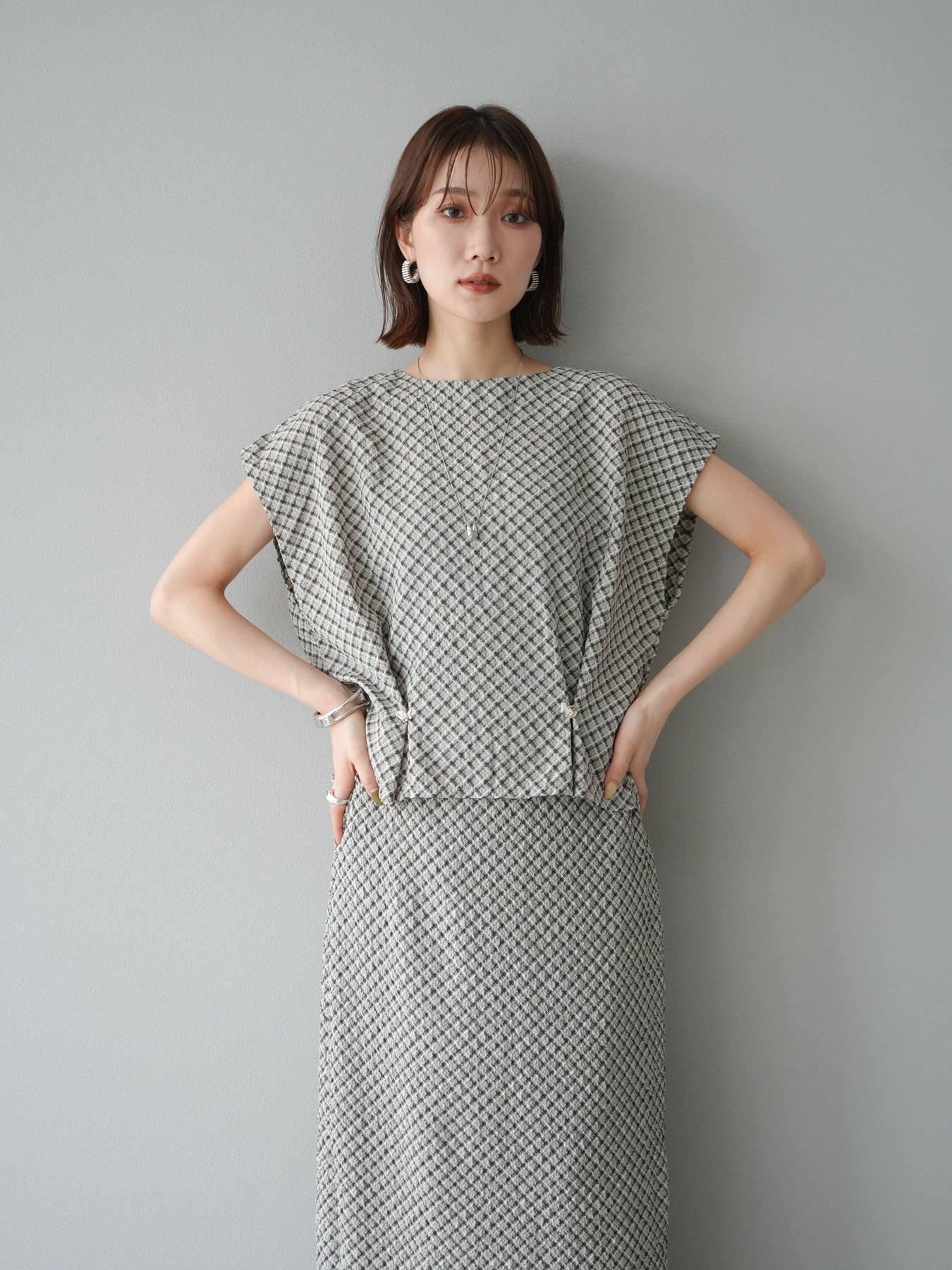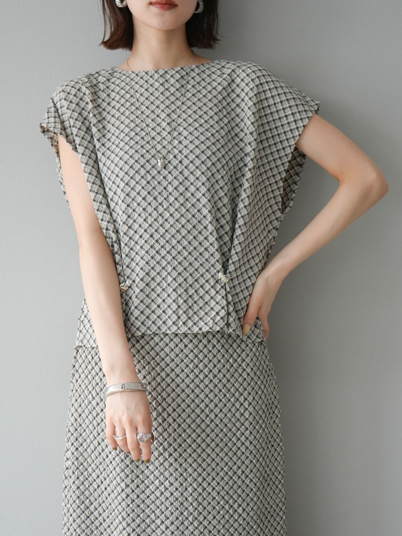 凹凸感のある立体的なチェック柄生地を使用した、上品な印象のフレンチスリーブトップス。両サイドに施されたタックとボタンデザインが、ウエストラインに自然なアクセントを添え、スタイルに立体感を与えてくれます。 二の腕をさりげなくカバーするフレンチスリーブ仕様で、1枚でもきちんと感のある着こなしに。パンツにもスカートにも合わせやすく、同素材のスカートとセットアップで着用すれば統一感のあるスタイリングが完成します。 オンにもオフにも活躍する、洗練された大人のためのトップスです。 ※ボトムス、キャミソール(インナー)以外の商品は一律でインナーは付属していません。
