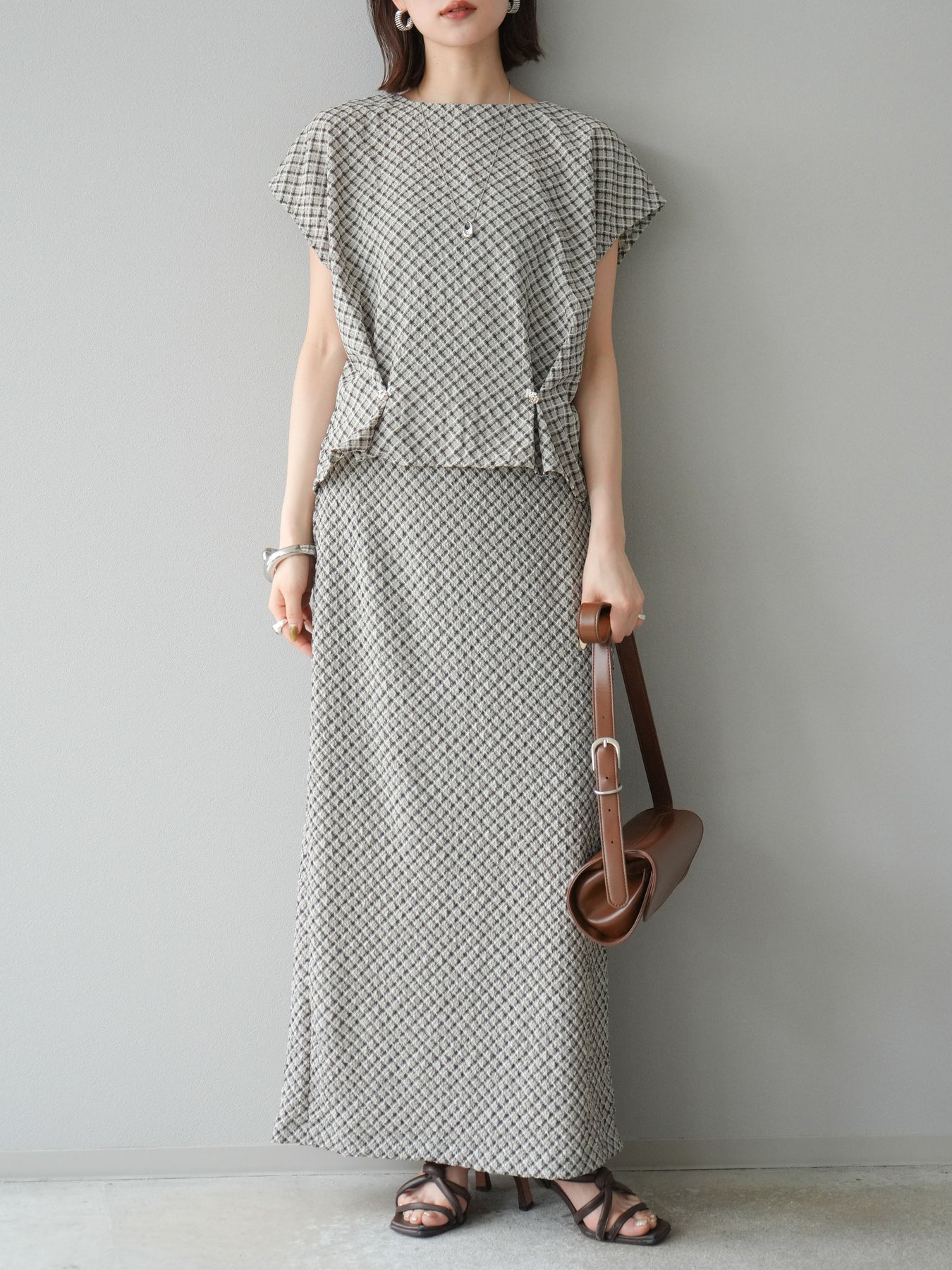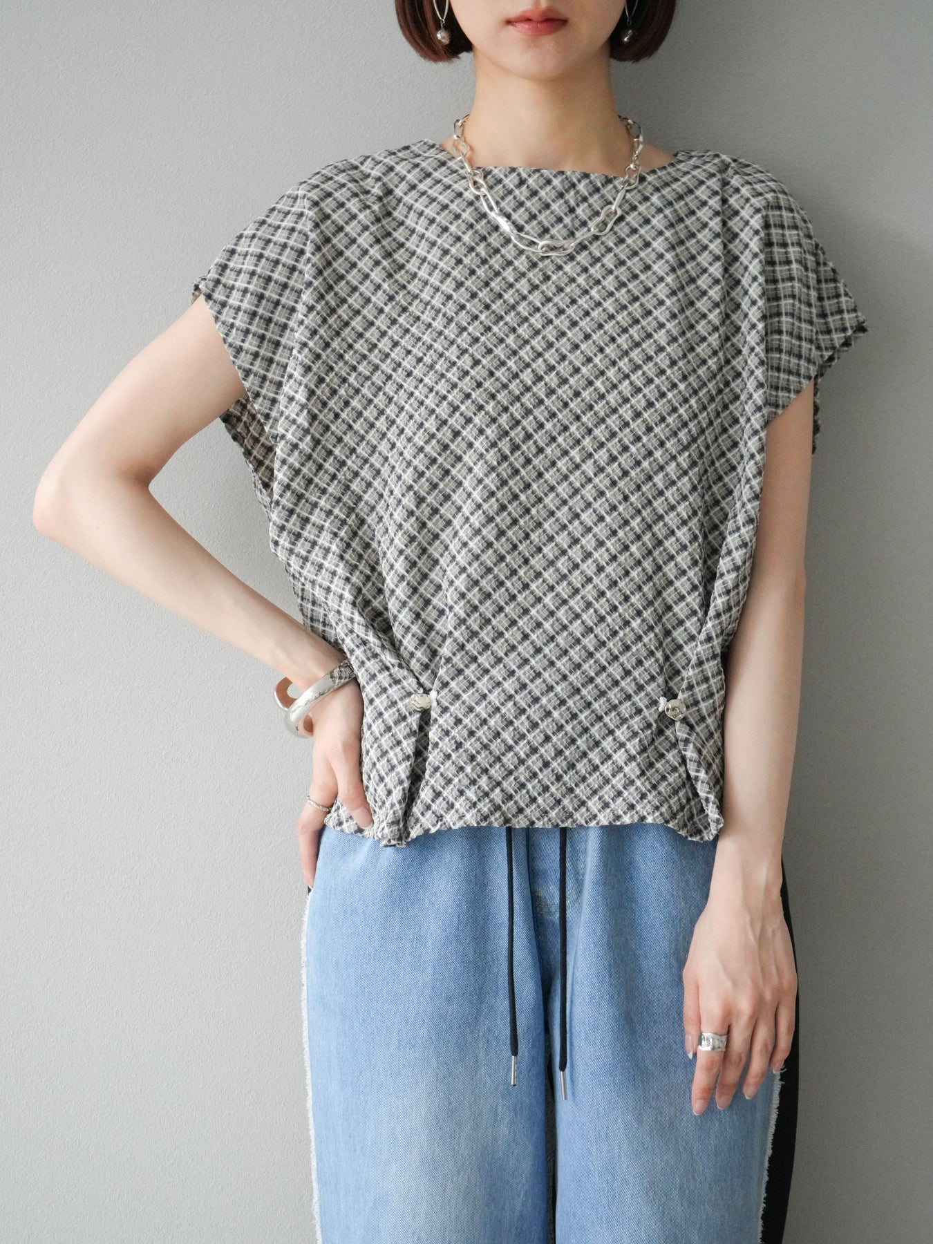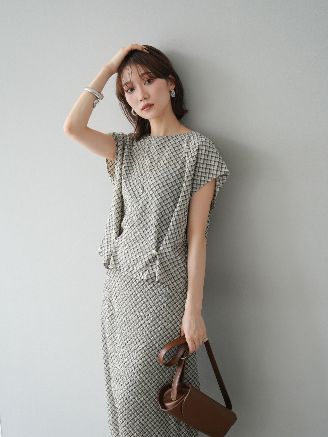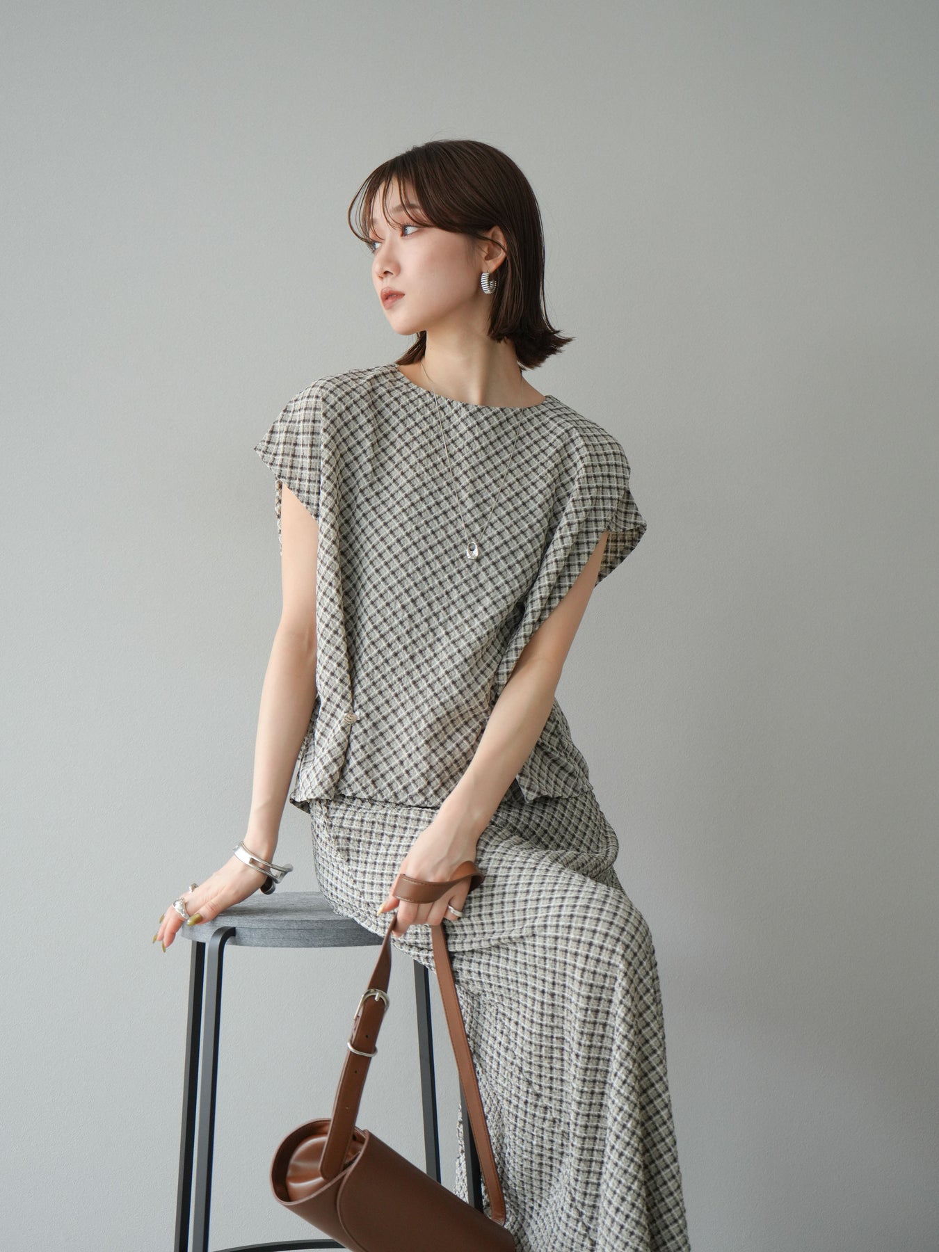 凹凸感のある立体的なチェック柄生地を使用した、上品な印象のフレンチスリーブトップス。両サイドに施されたタックとボタンデザインが、ウエストラインに自然なアクセントを添え、スタイルに立体感を与えてくれます。 二の腕をさりげなくカバーするフレンチスリーブ仕様で、1枚でもきちんと感のある着こなしに。パンツにもスカートにも合わせやすく、同素材のスカートとセットアップで着用すれば統一感のあるスタイリングが完成します。 オンにもオフにも活躍する、洗練された大人のためのトップスです。 ※ボトムス、キャミソール(インナー)以外の商品は一律でインナーは付属していません。