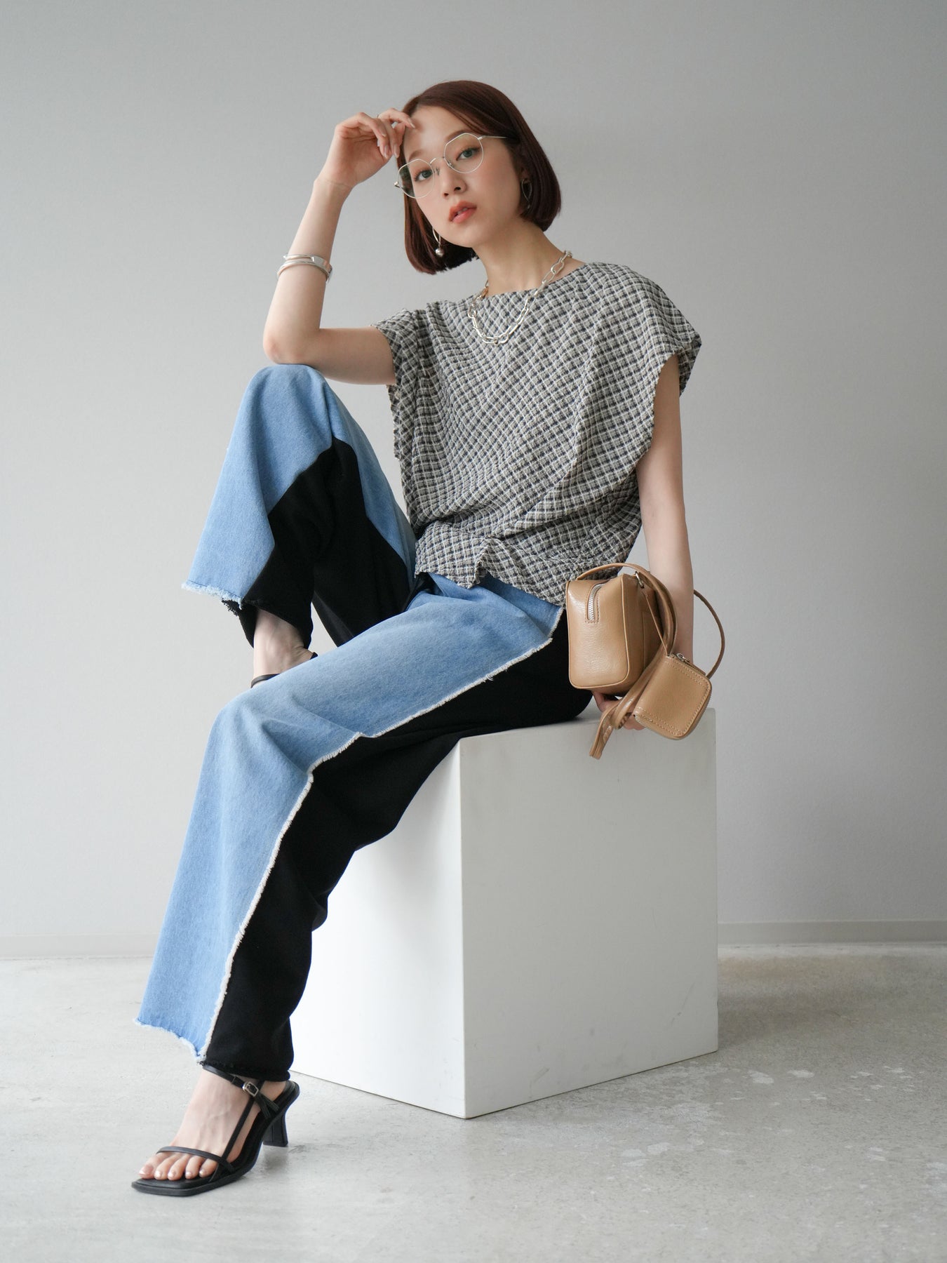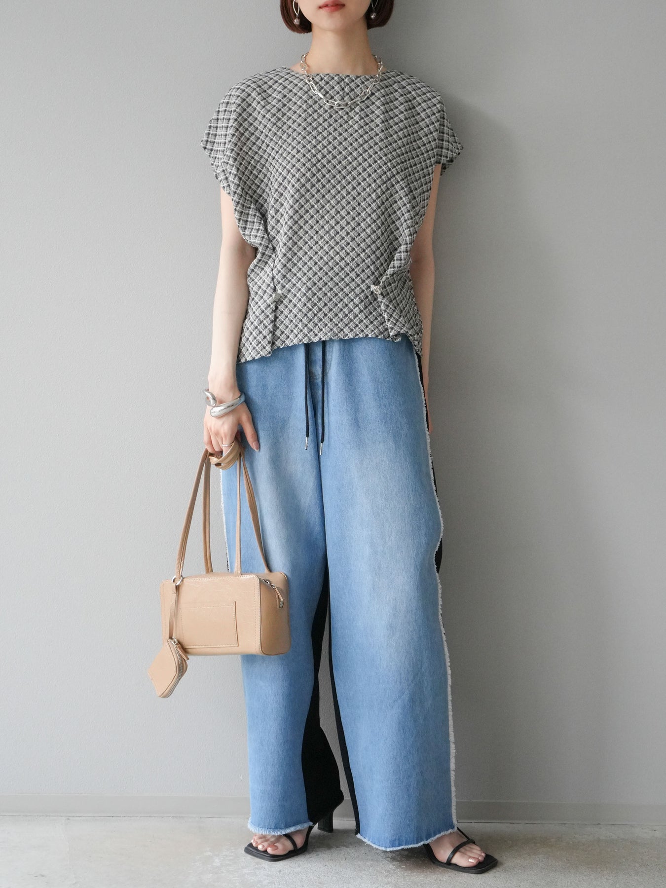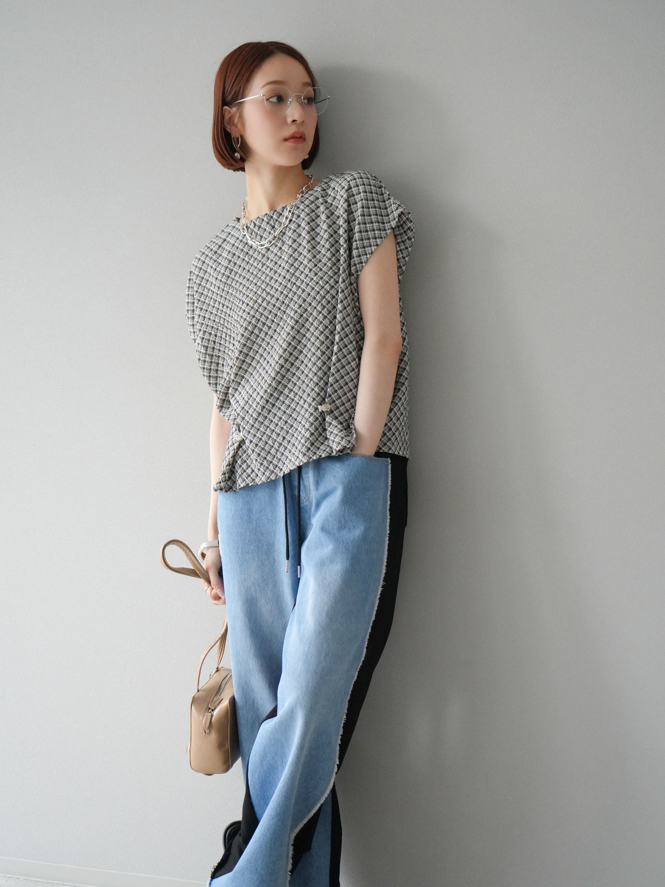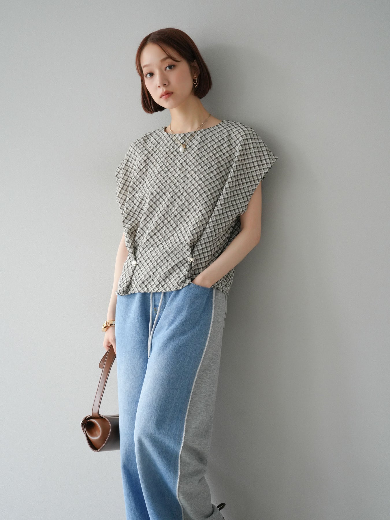 凹凸感のある立体的なチェック柄生地を使用した、上品な印象のフレンチスリーブトップス。両サイドに施されたタックとボタンデザインが、ウエストラインに自然なアクセントを添え、スタイルに立体感を与えてくれます。 二の腕をさりげなくカバーするフレンチスリーブ仕様で、1枚でもきちんと感のある着こなしに。パンツにもスカートにも合わせやすく、同素材のスカートとセットアップで着用すれば統一感のあるスタイリングが完成します。 オンにもオフにも活躍する、洗練された大人のためのトップスです。 ※ボトムス、キャミソール(インナー)以外の商品は一律でインナーは付属していません。