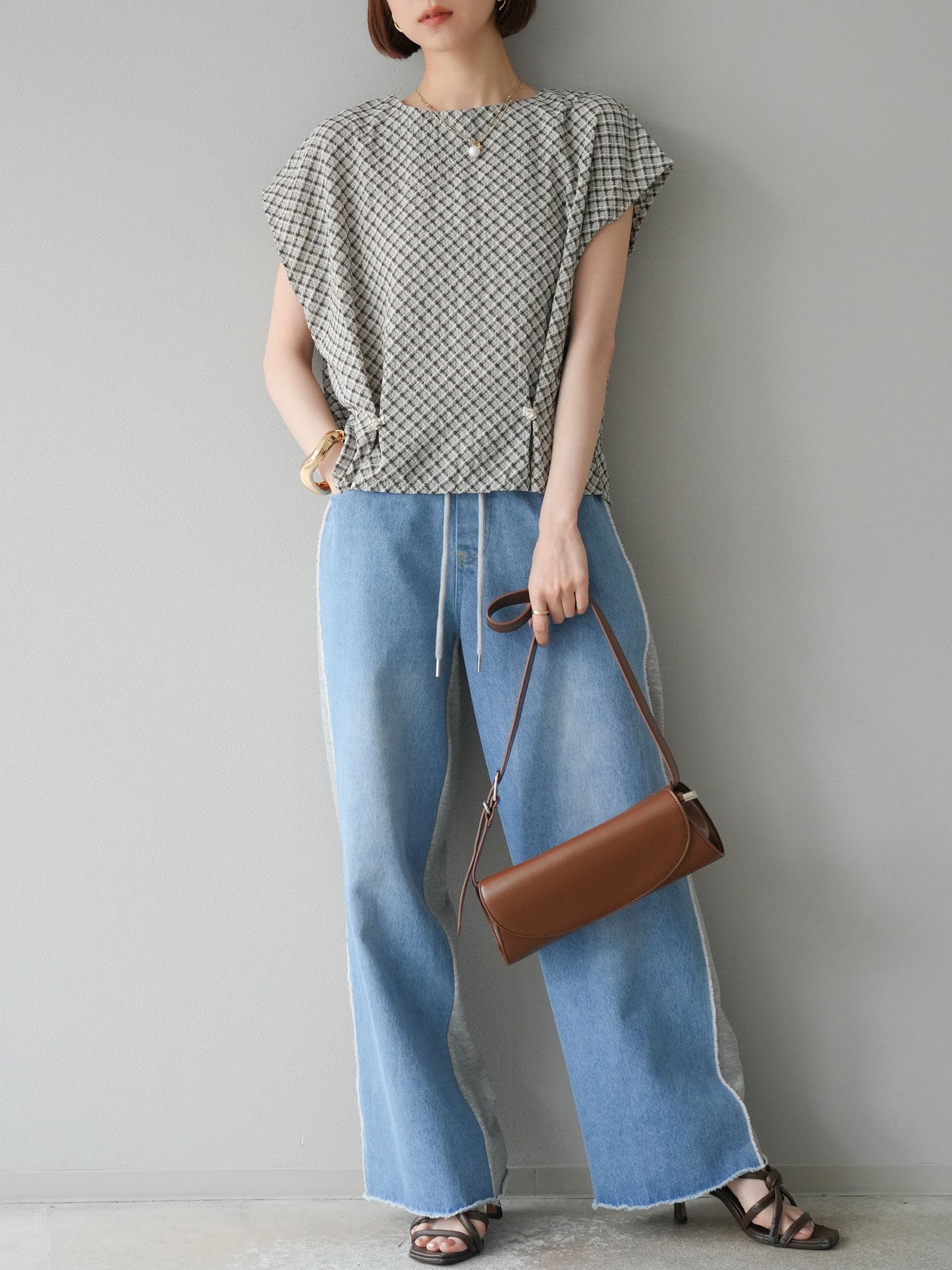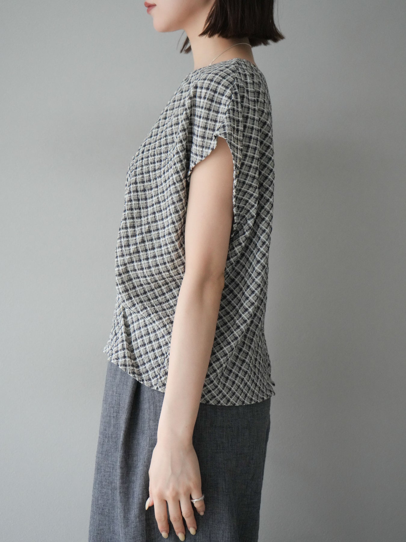 [予約]チェック柄タックデザインフレンチスリーブトップス/ブラウン