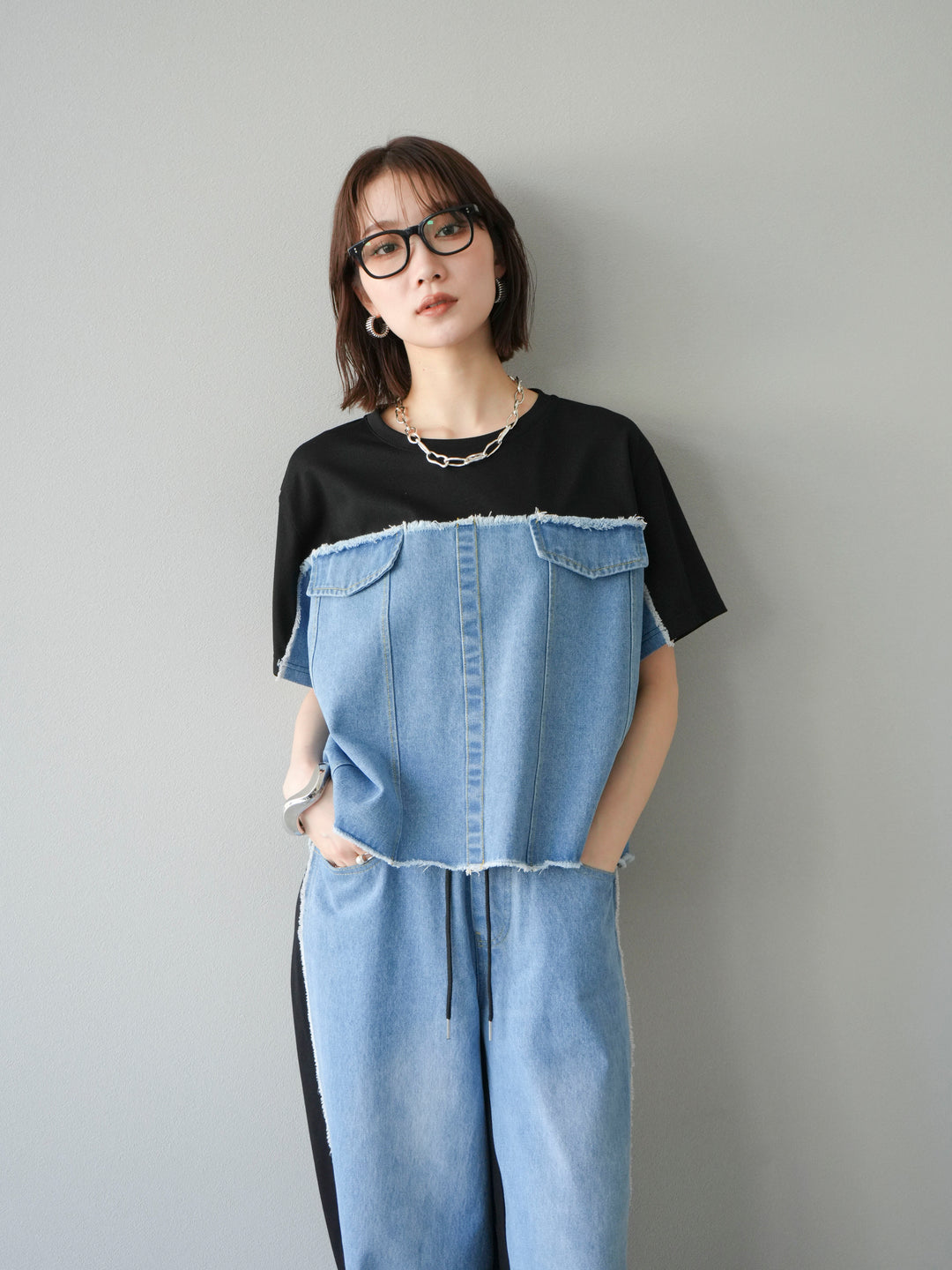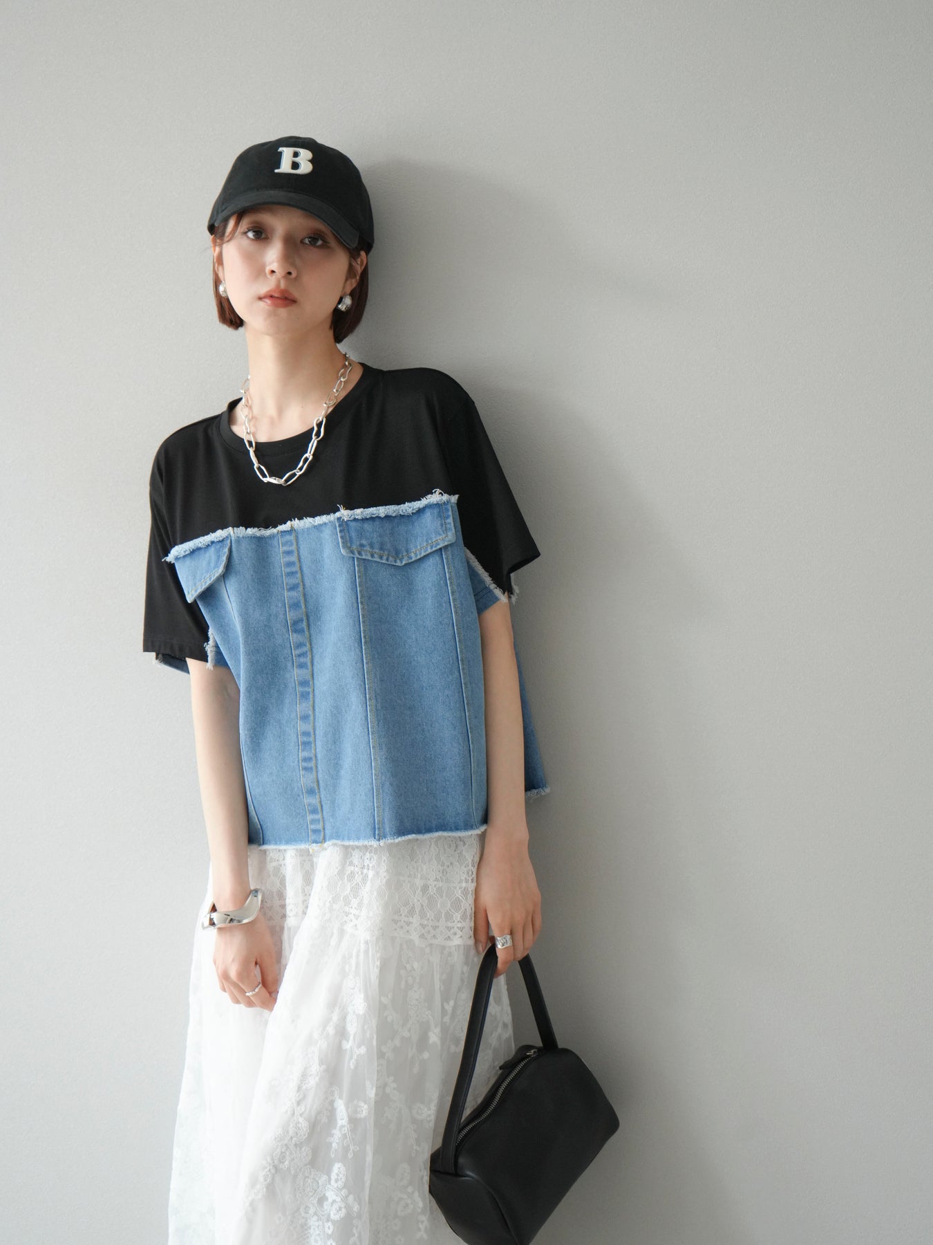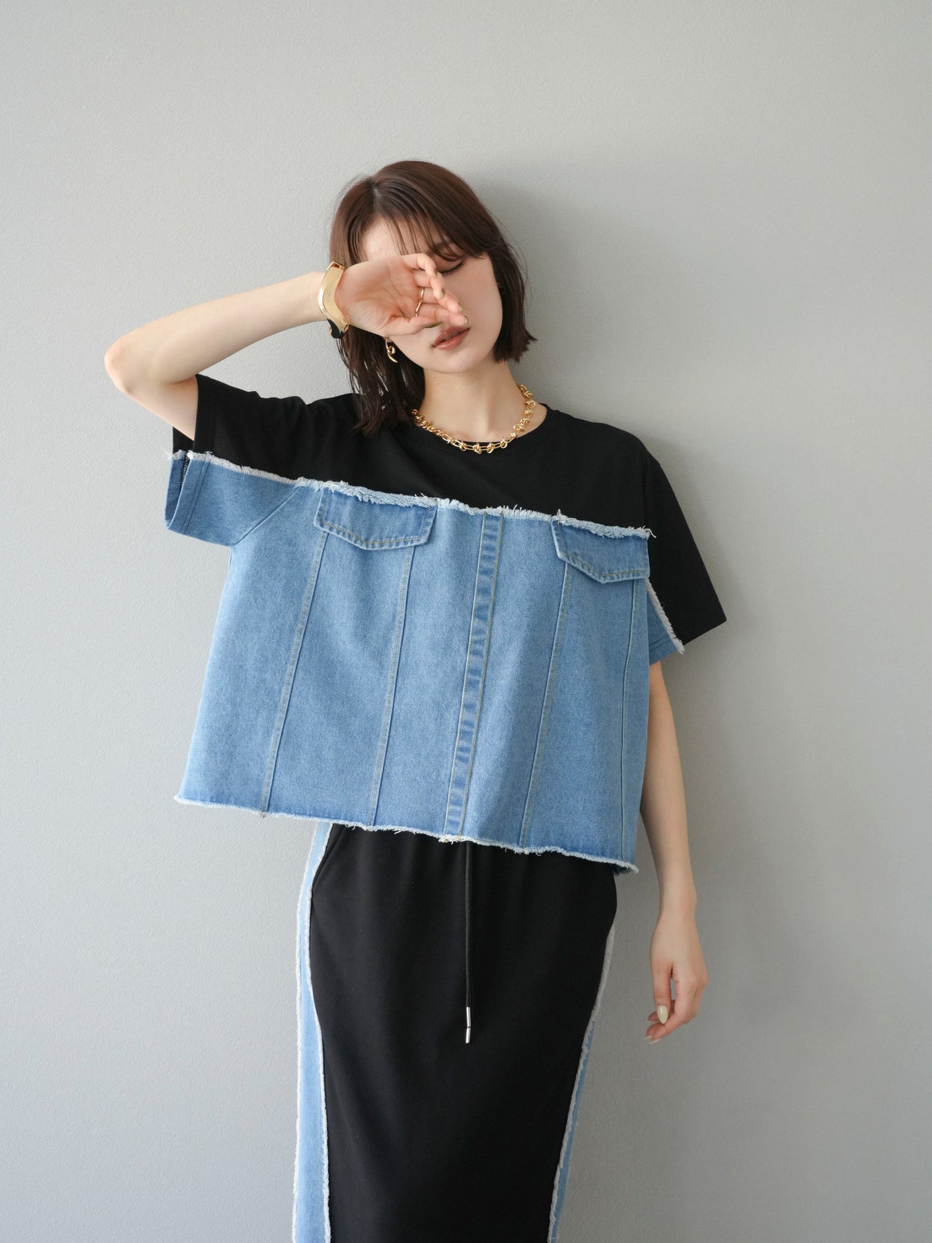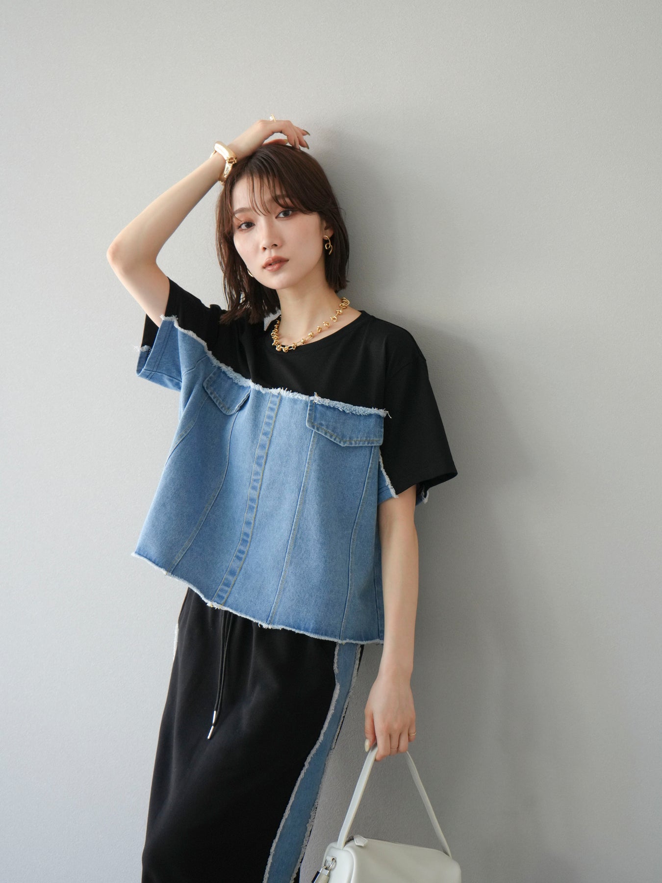 Tシャツとデニムをドッキングした、1枚で着映えるデザインカットソー。胸元にはリアルなフラップポケット風ディテールを施し、カジュアルながらもこなれた印象に。裾や切り替え部分のカットオフ仕様が、ラフさと抜け感をプラスします。パンツにもスカートにも合わせやすく、デイリーに活躍するアイテムです。 ※ボトムス、キャミソール(インナー)以外の商品は一律でインナーは付属していません。