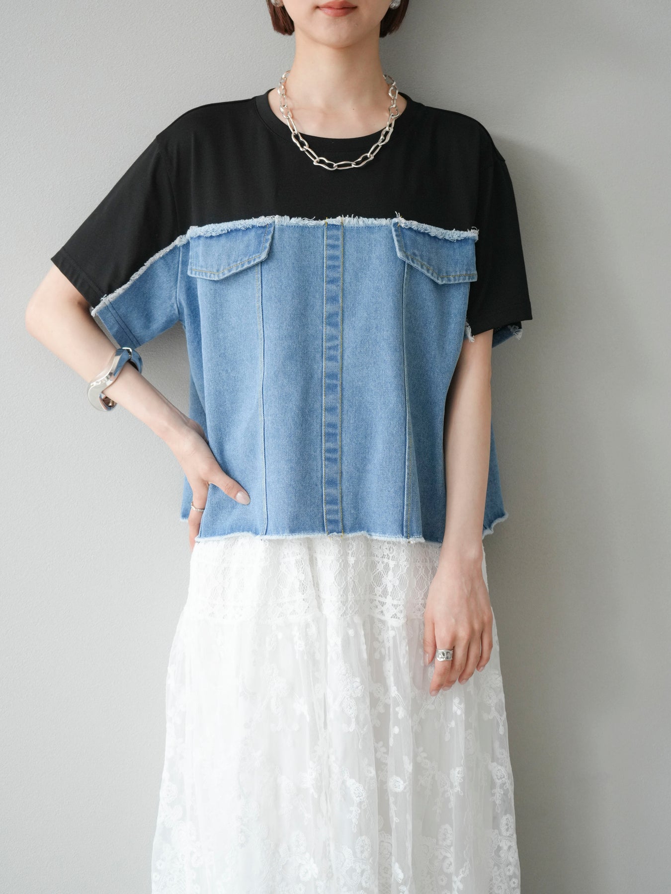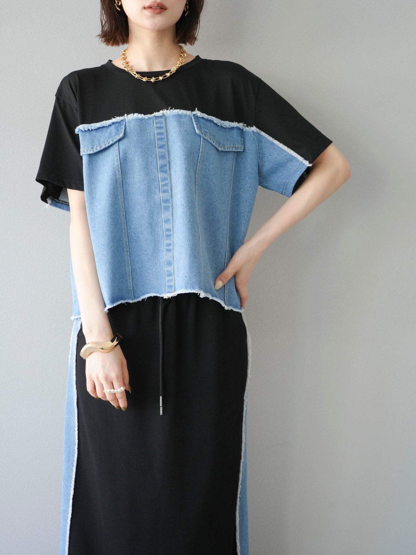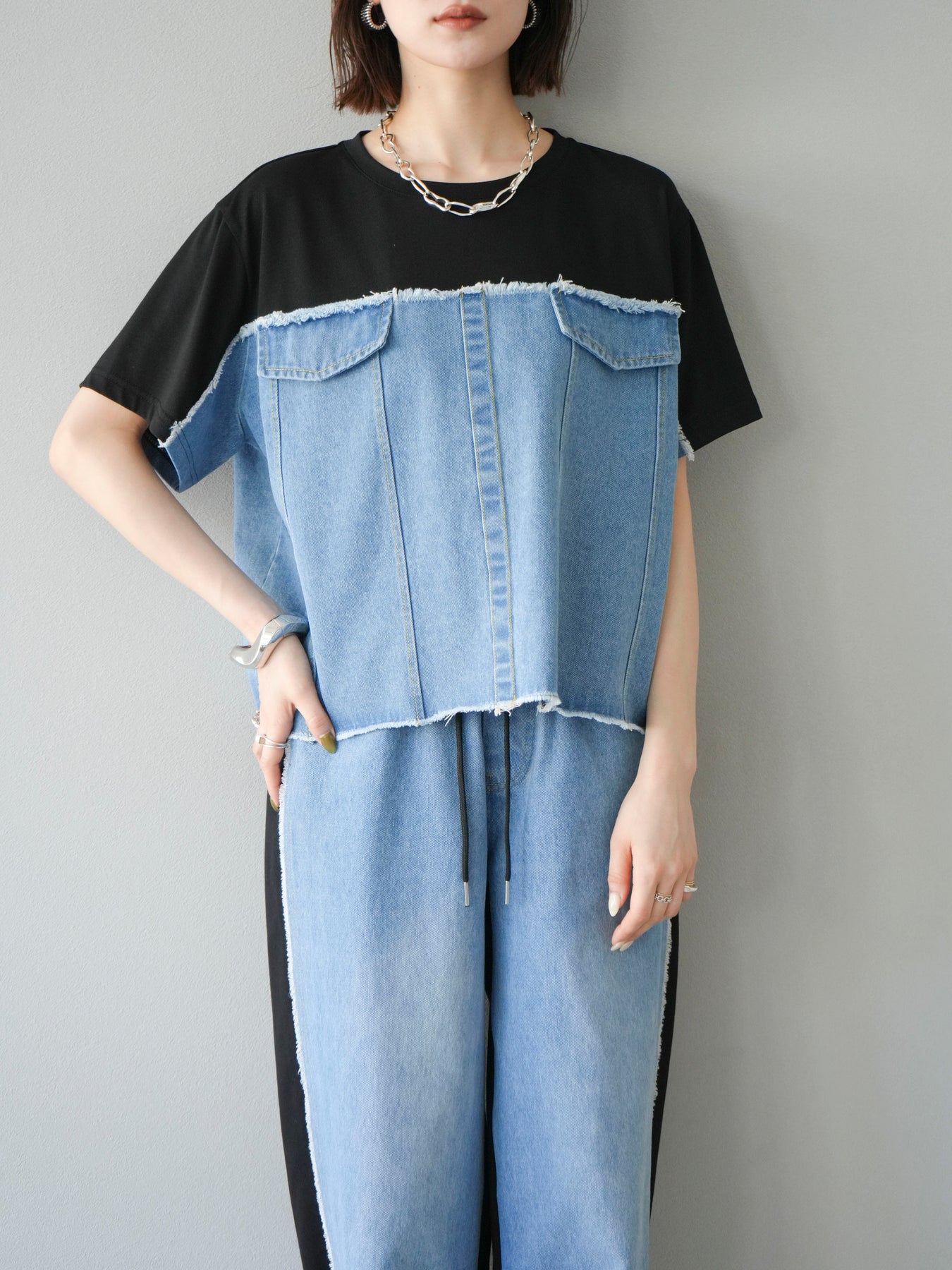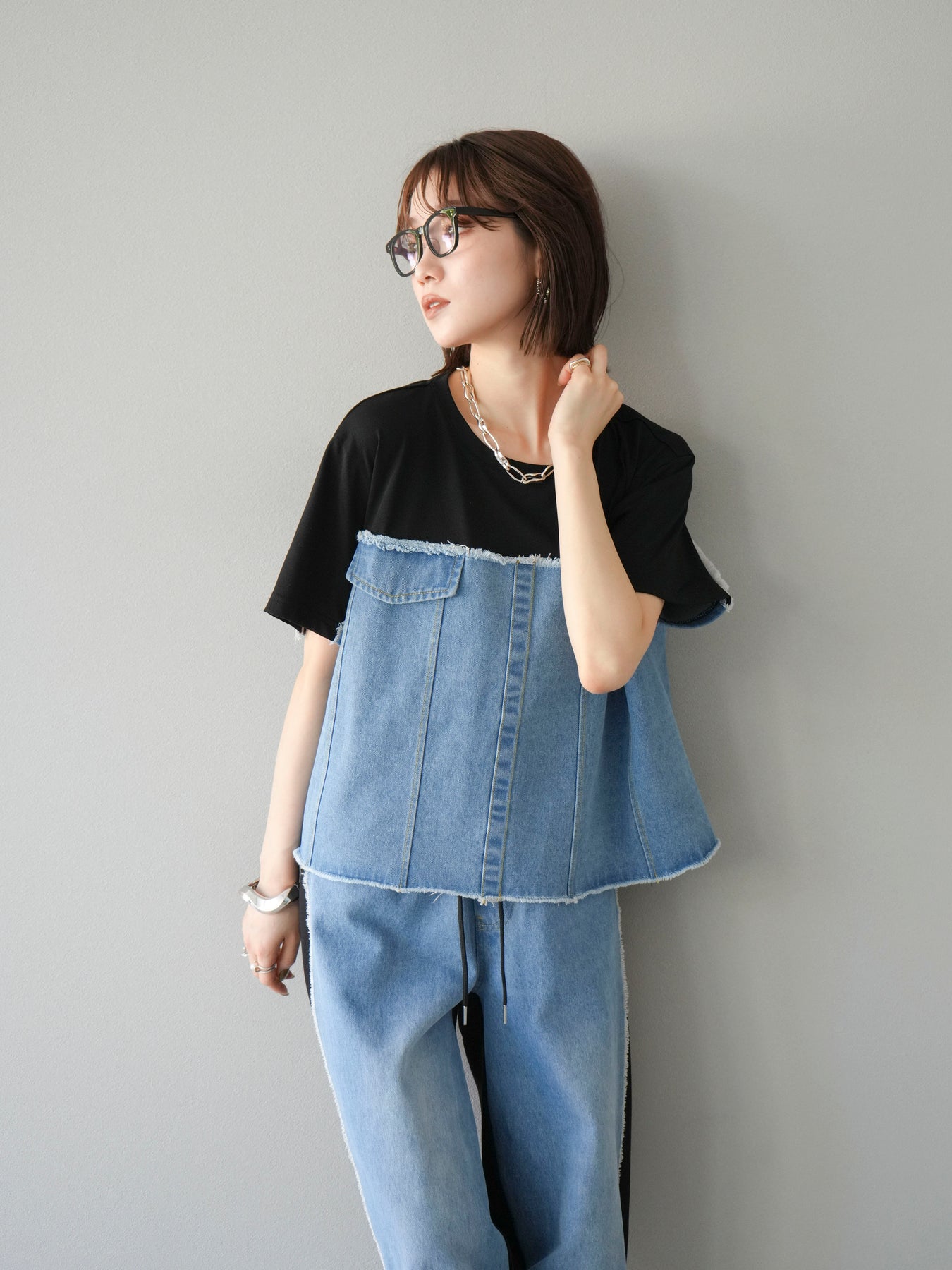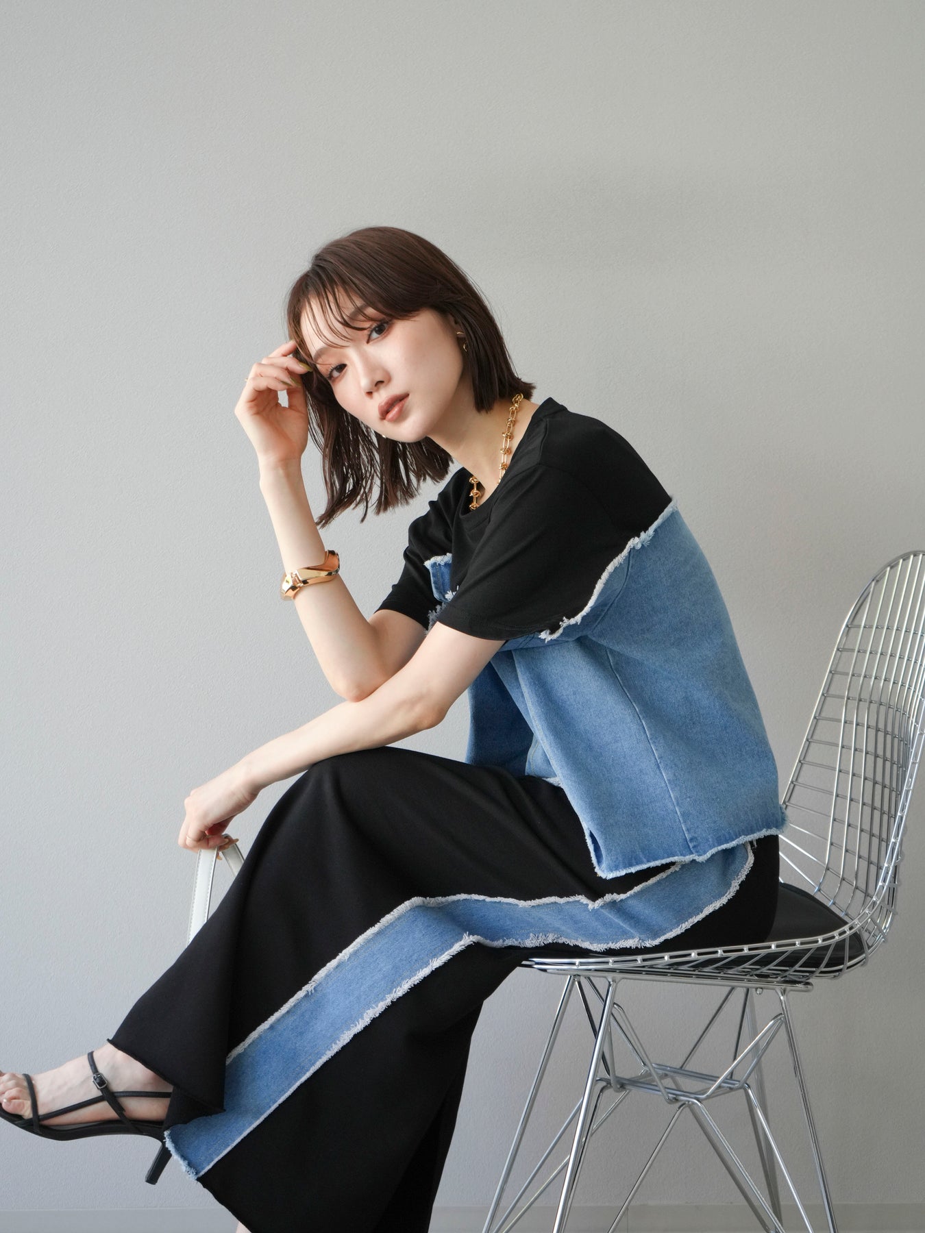 Tシャツとデニムをドッキングした、1枚で着映えるデザインカットソー。胸元にはリアルなフラップポケット風ディテールを施し、カジュアルながらもこなれた印象に。裾や切り替え部分のカットオフ仕様が、ラフさと抜け感をプラスします。パンツにもスカートにも合わせやすく、デイリーに活躍するアイテムです。 ※ボトムス、キャミソール(インナー)以外の商品は一律でインナーは付属していません。