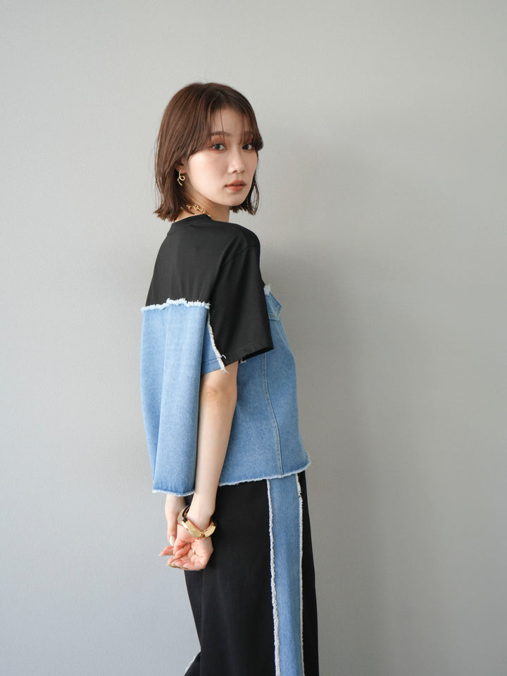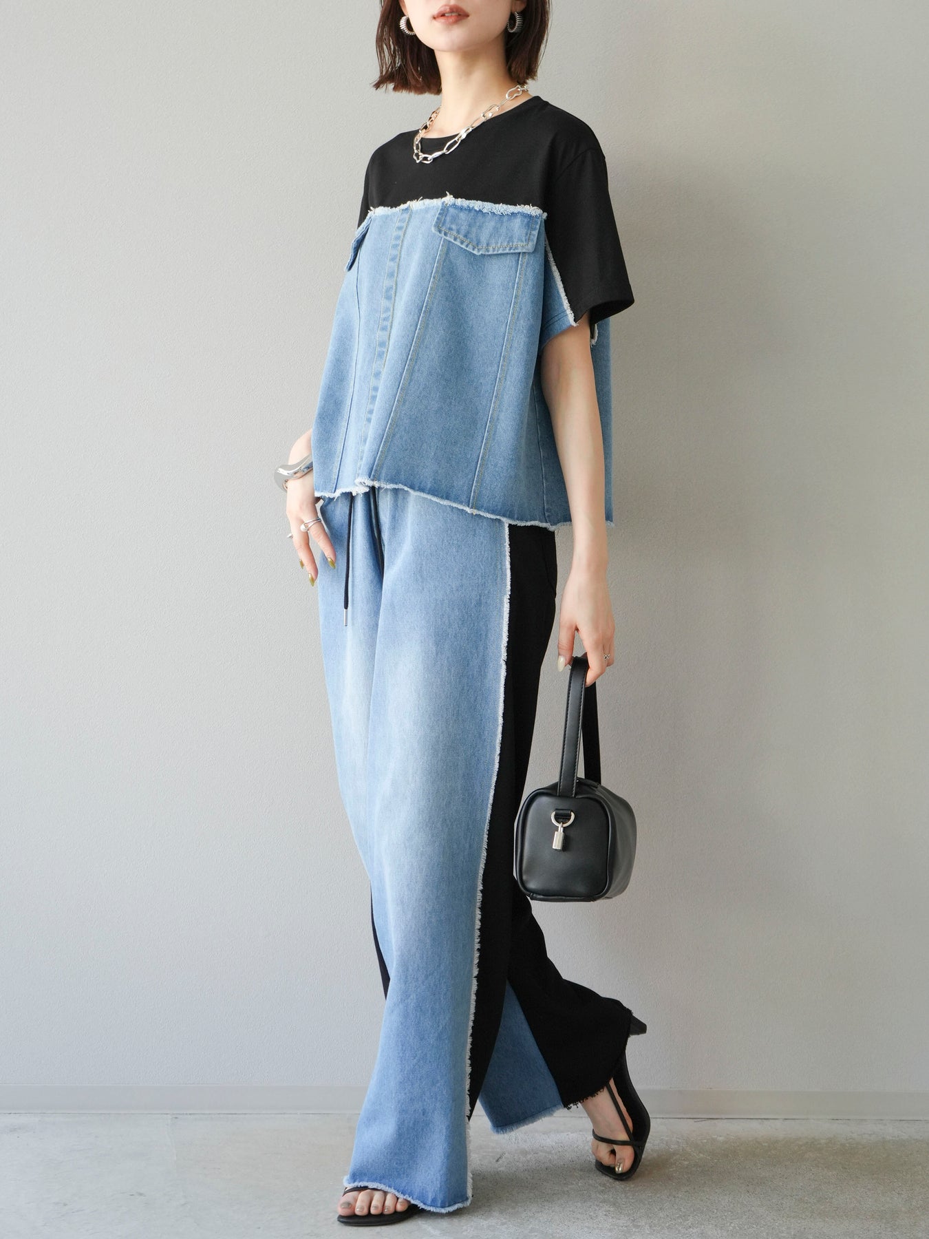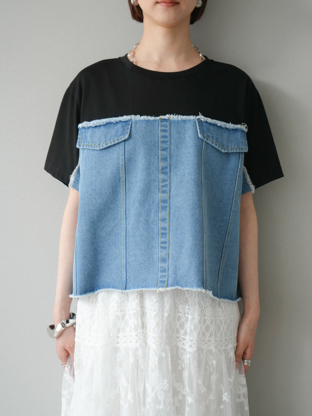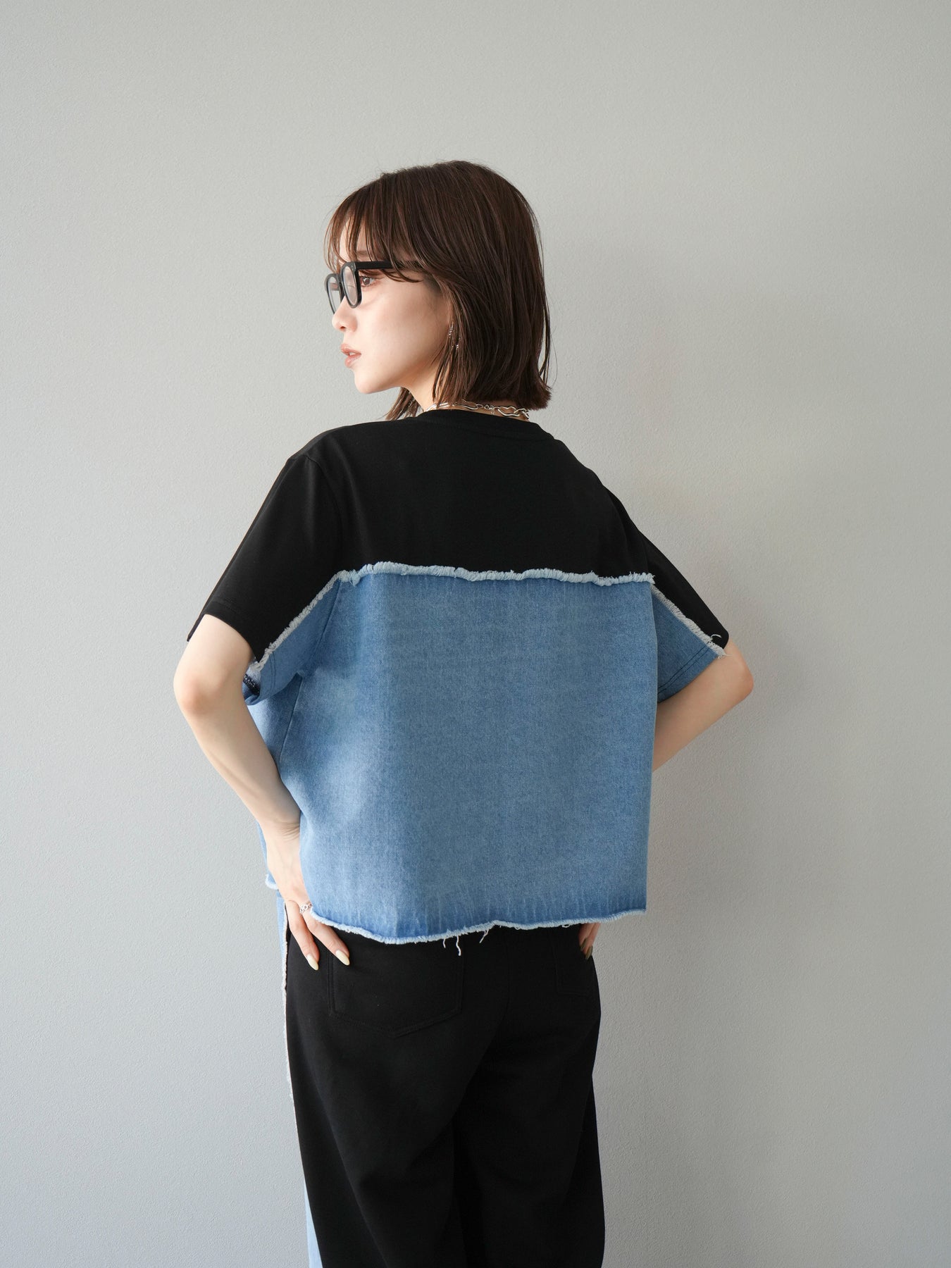 Tシャツとデニムをドッキングした、1枚で着映えるデザインカットソー。胸元にはリアルなフラップポケット風ディテールを施し、カジュアルながらもこなれた印象に。裾や切り替え部分のカットオフ仕様が、ラフさと抜け感をプラスします。パンツにもスカートにも合わせやすく、デイリーに活躍するアイテムです。 ※ボトムス、キャミソール(インナー)以外の商品は一律でインナーは付属していません。
