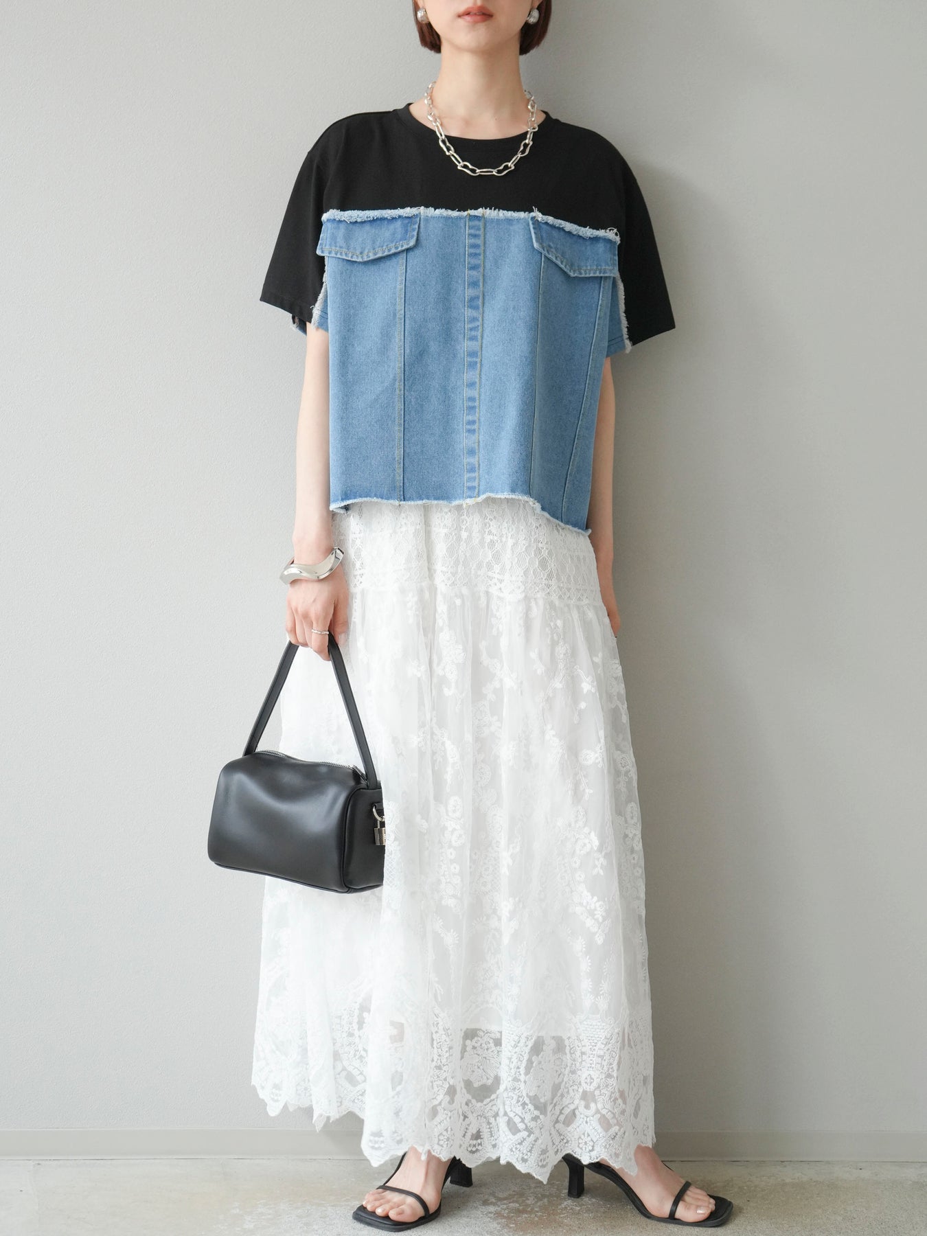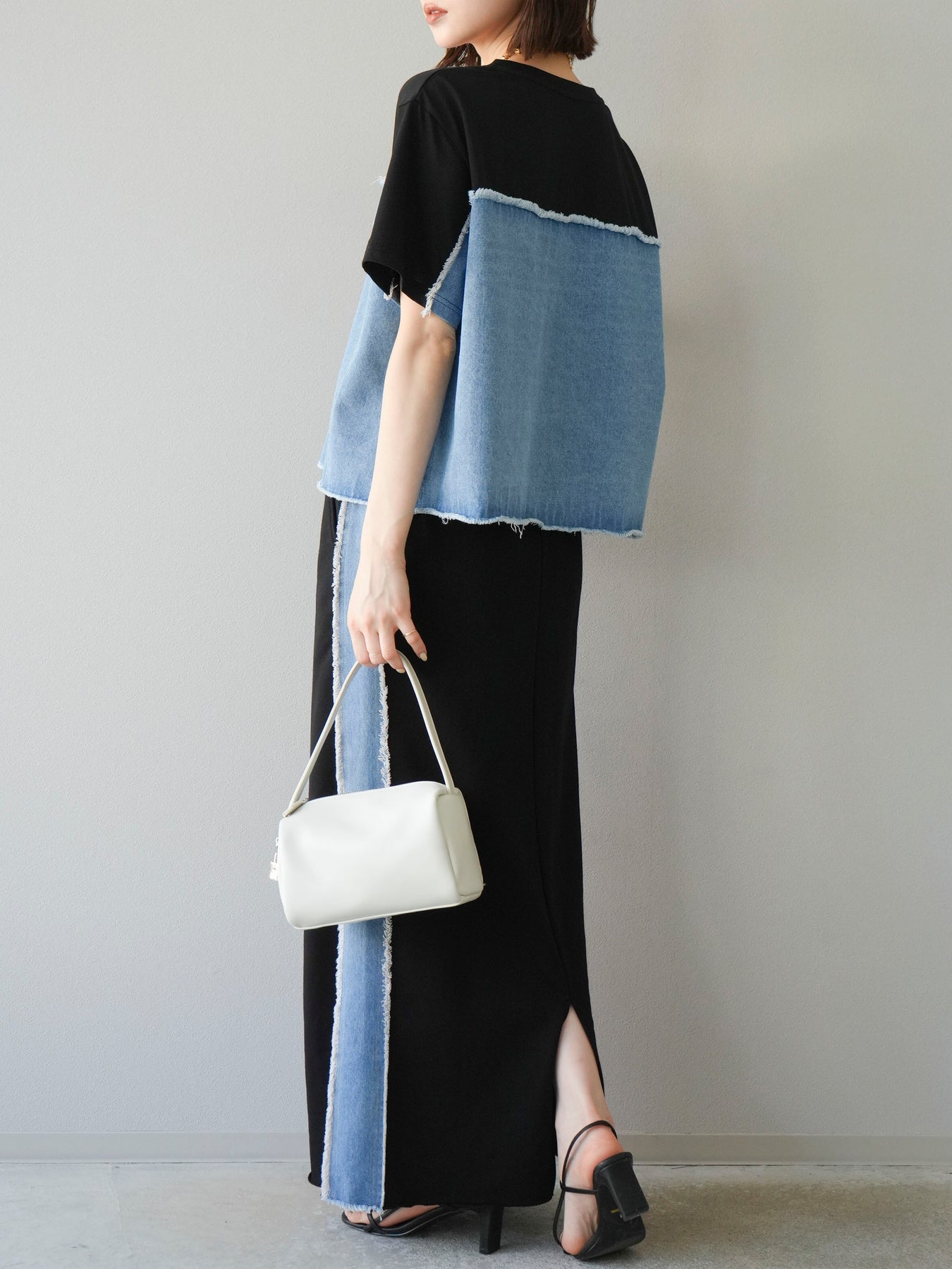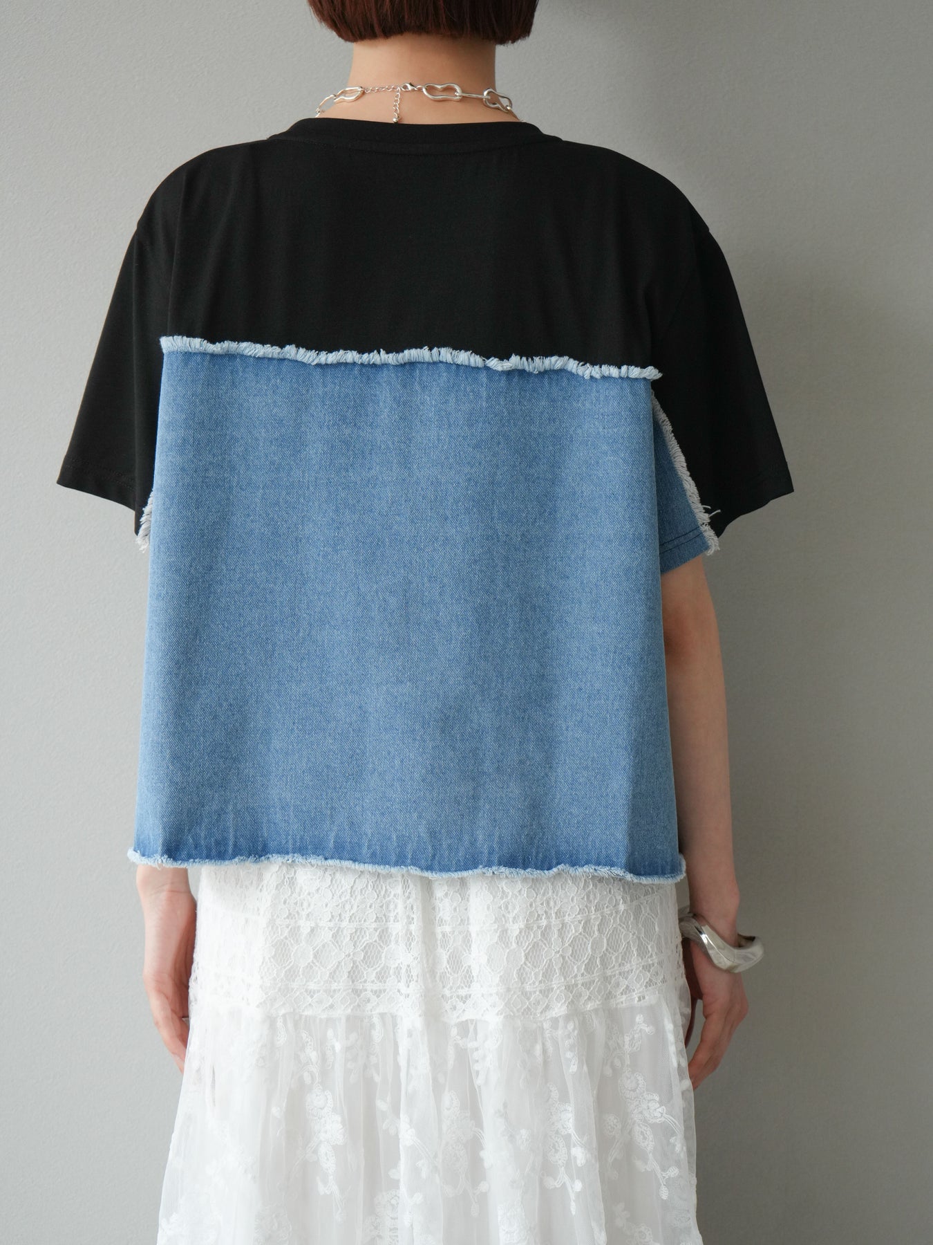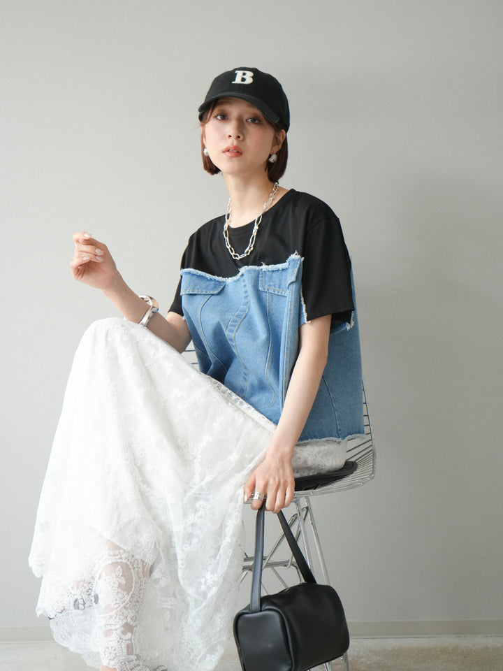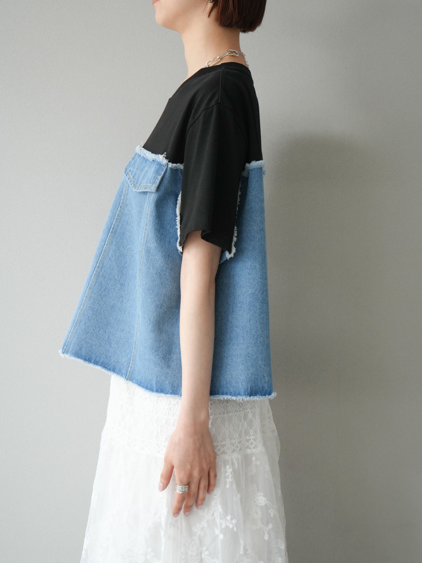 Tシャツとデニムをドッキングした、1枚で着映えるデザインカットソー。胸元にはリアルなフラップポケット風ディテールを施し、カジュアルながらもこなれた印象に。裾や切り替え部分のカットオフ仕様が、ラフさと抜け感をプラスします。パンツにもスカートにも合わせやすく、デイリーに活躍するアイテムです。 ※ボトムス、キャミソール(インナー)以外の商品は一律でインナーは付属していません。