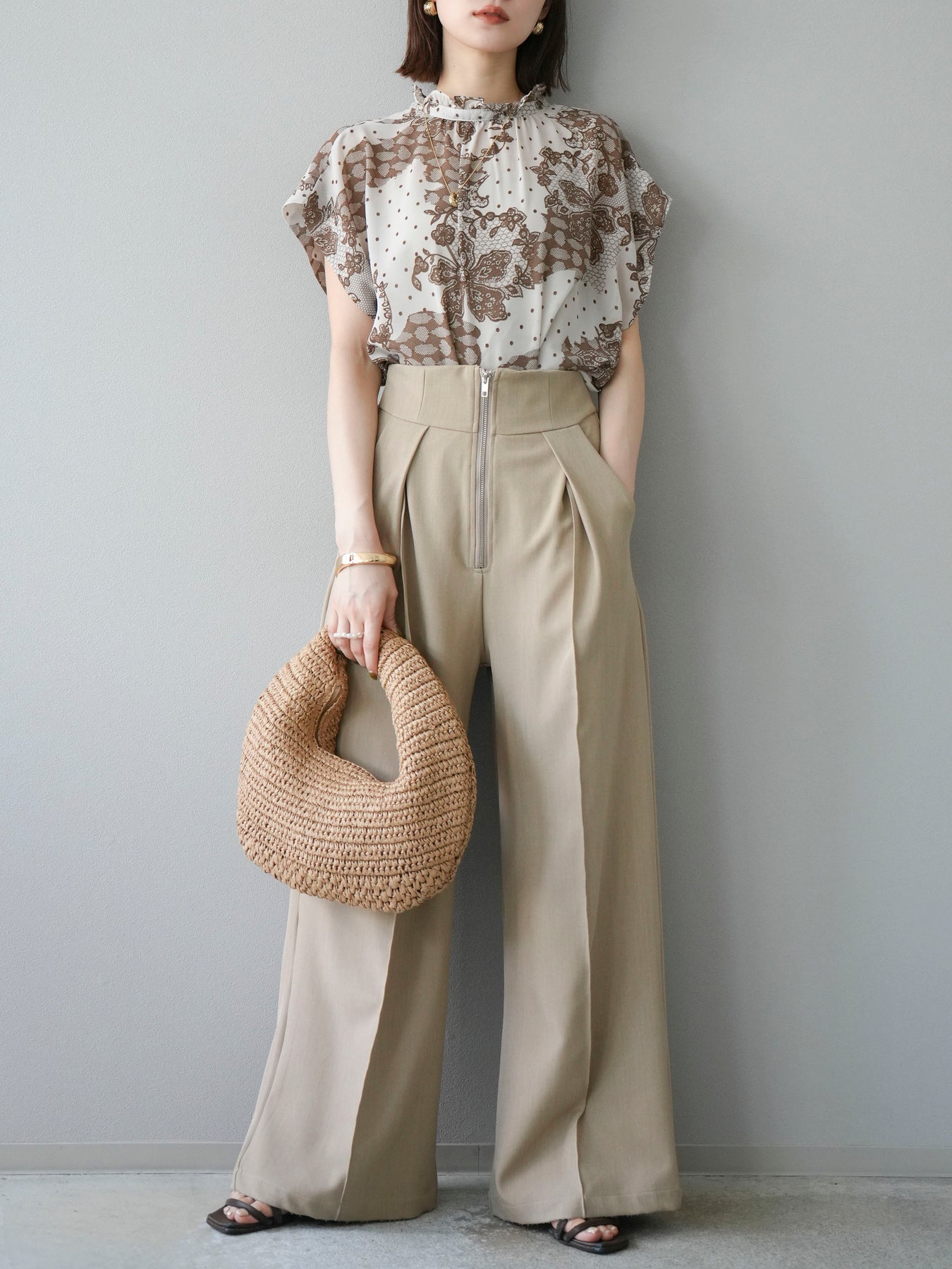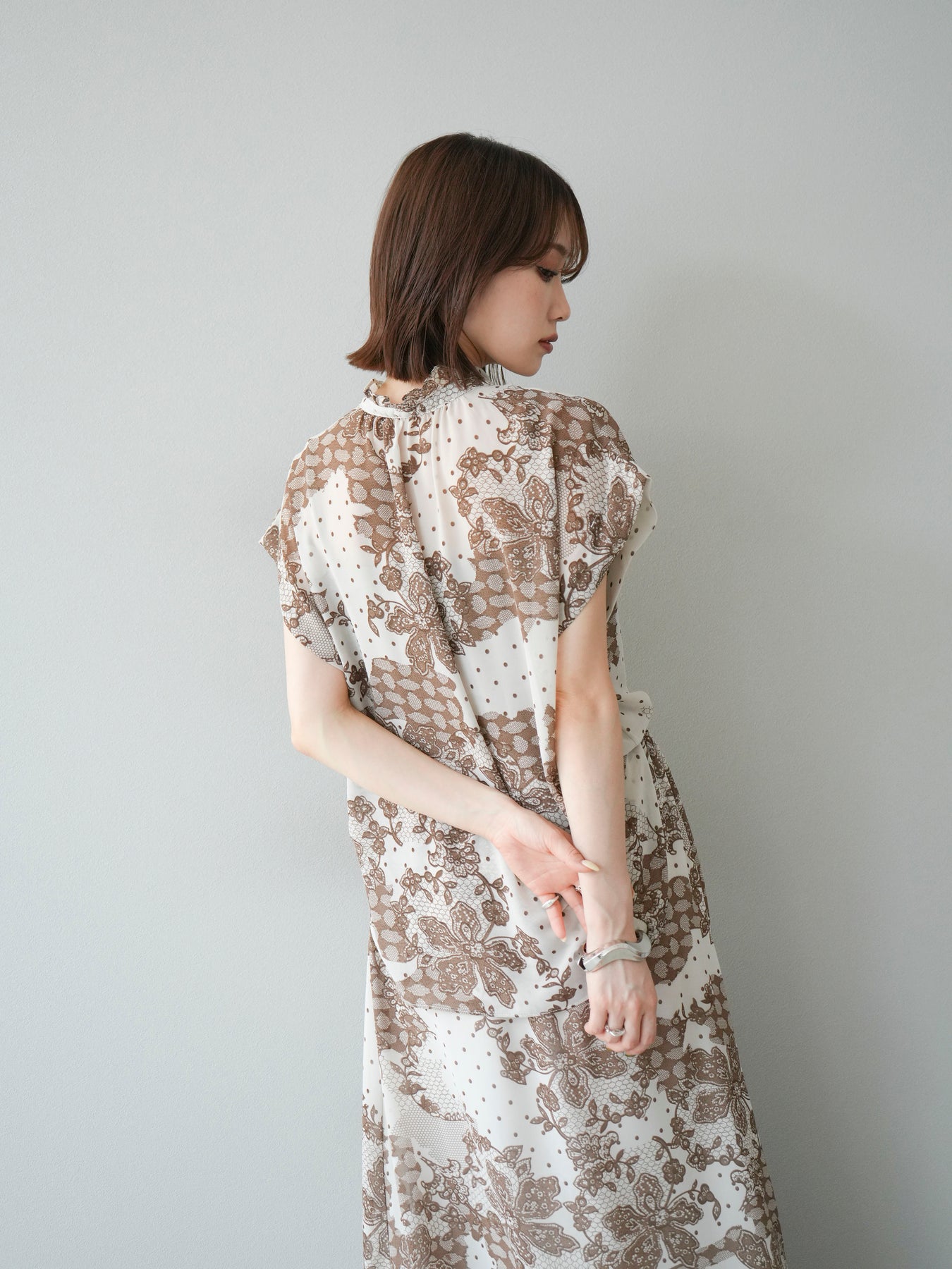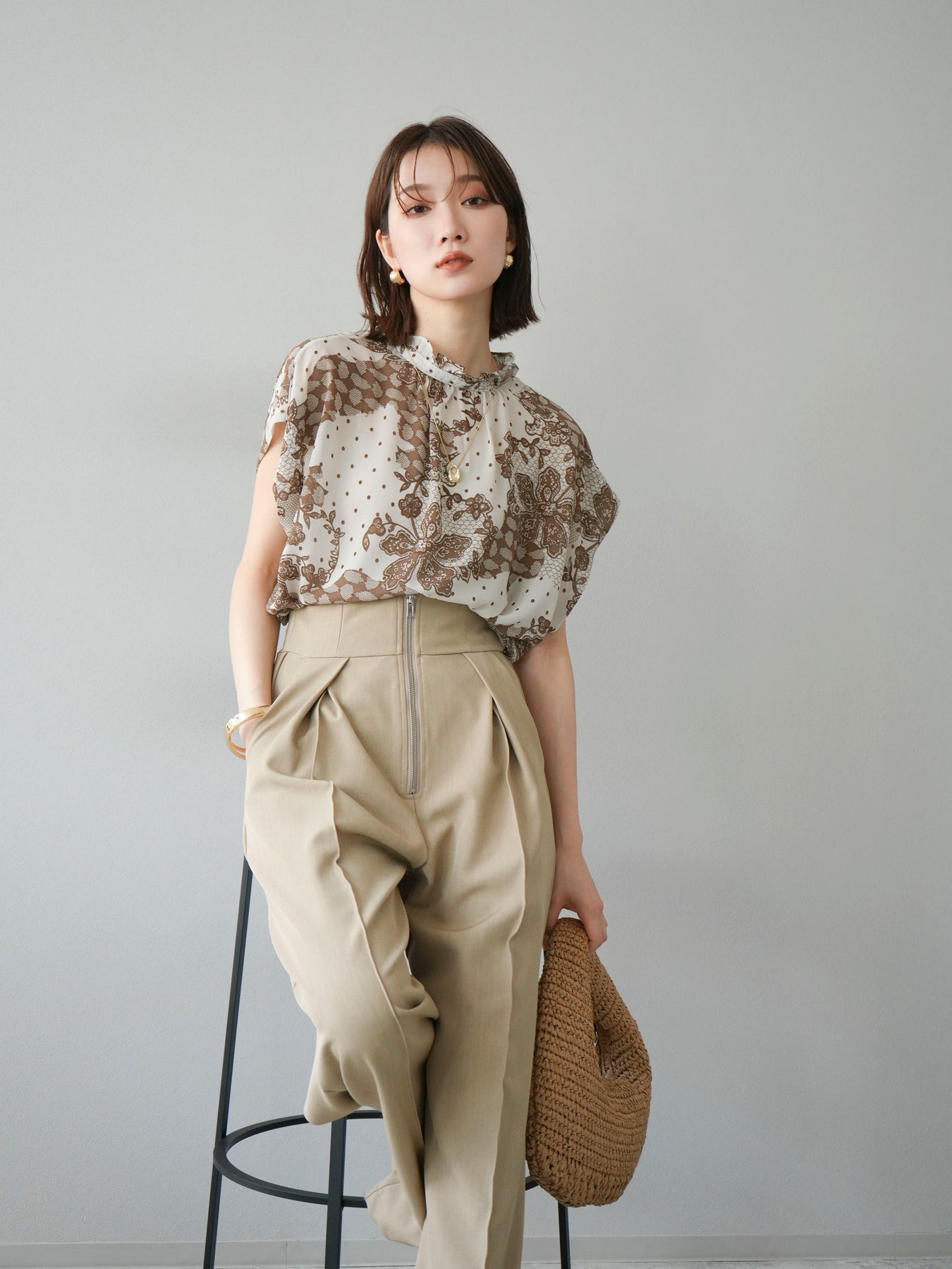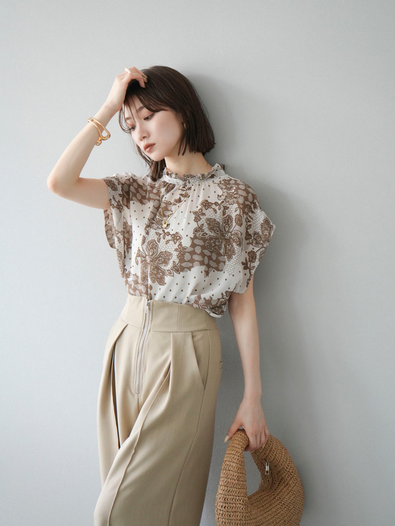 [予約]フラワーパターンフレンチスリーブブラウス/ベージュ