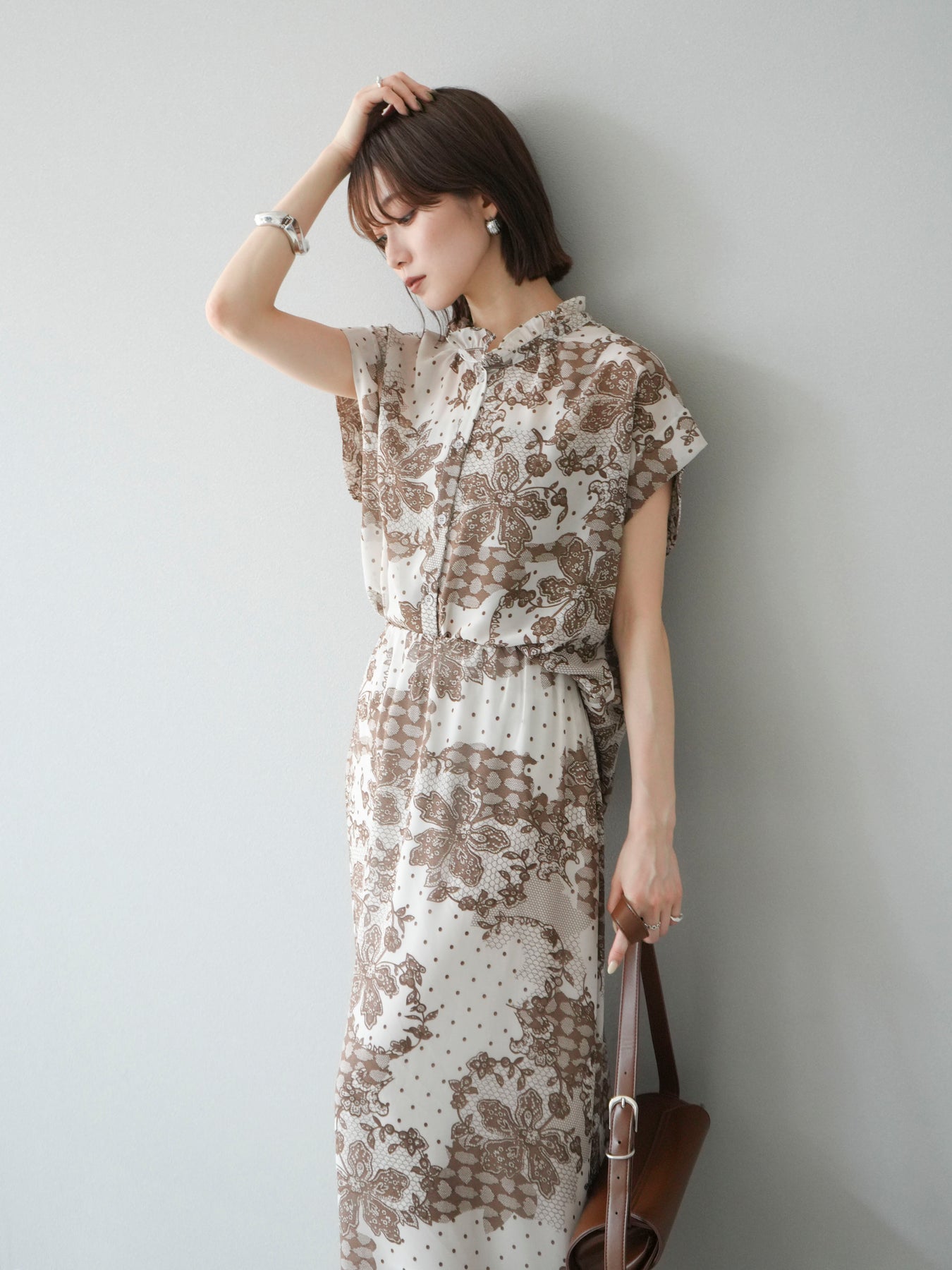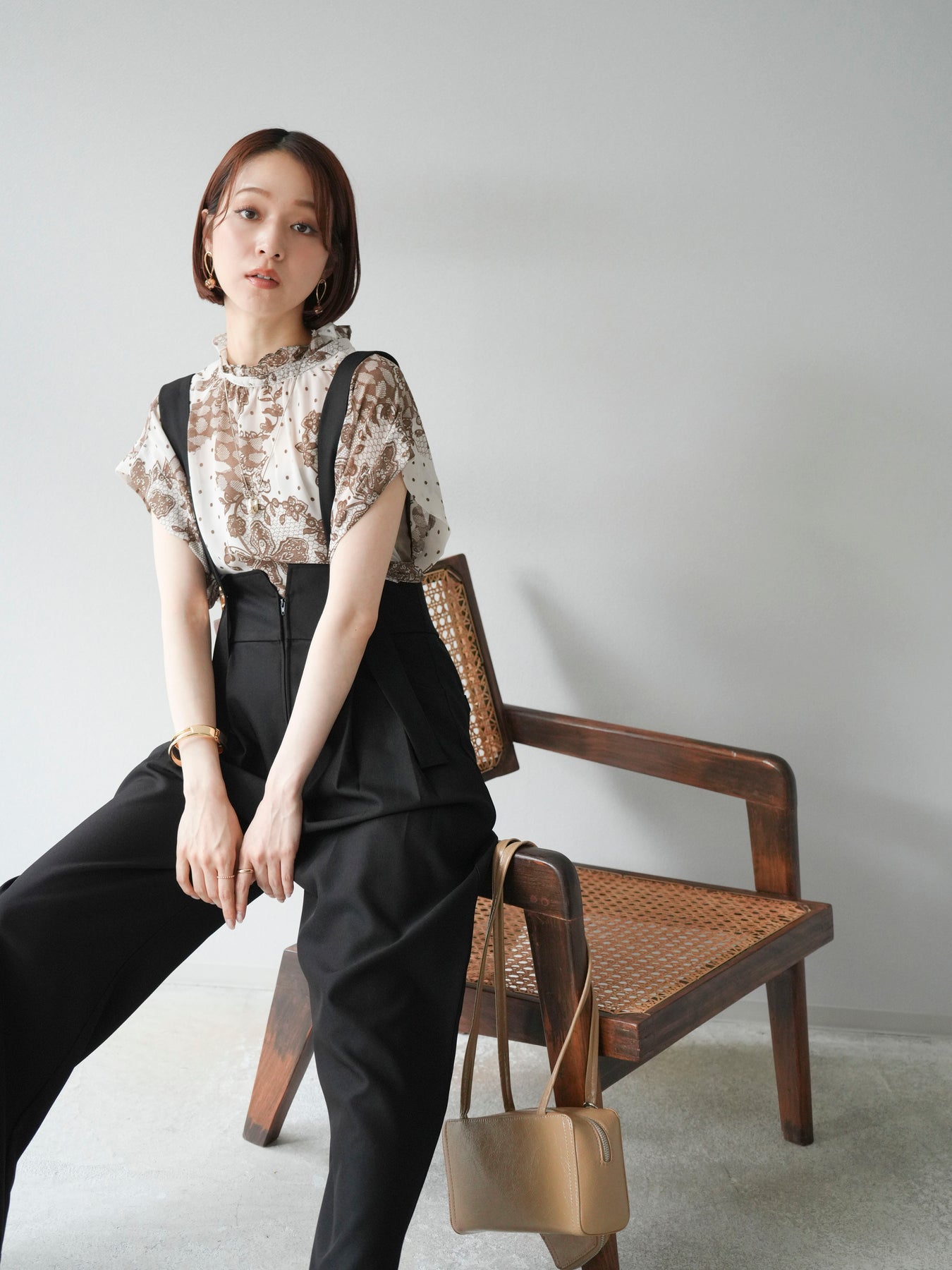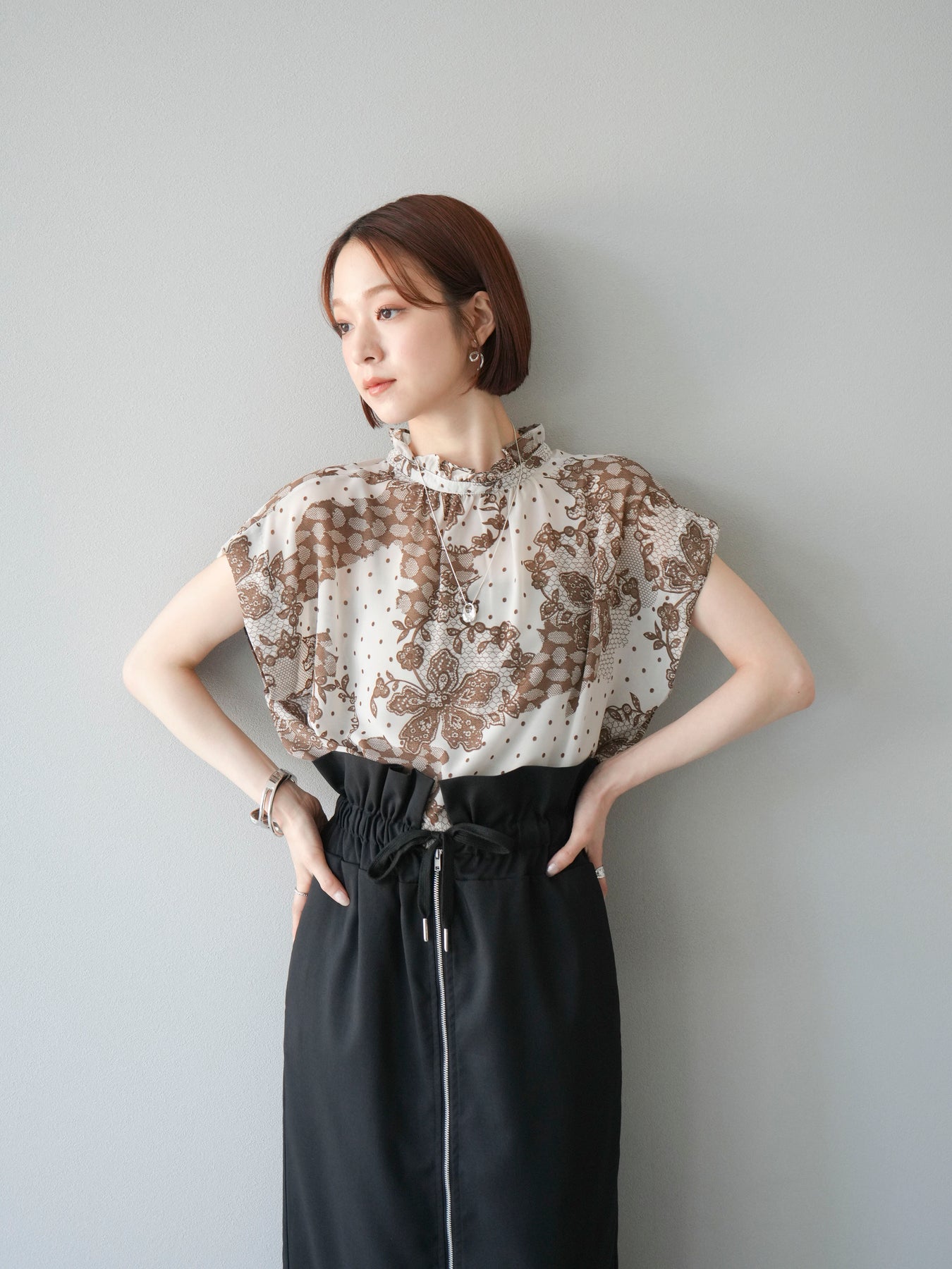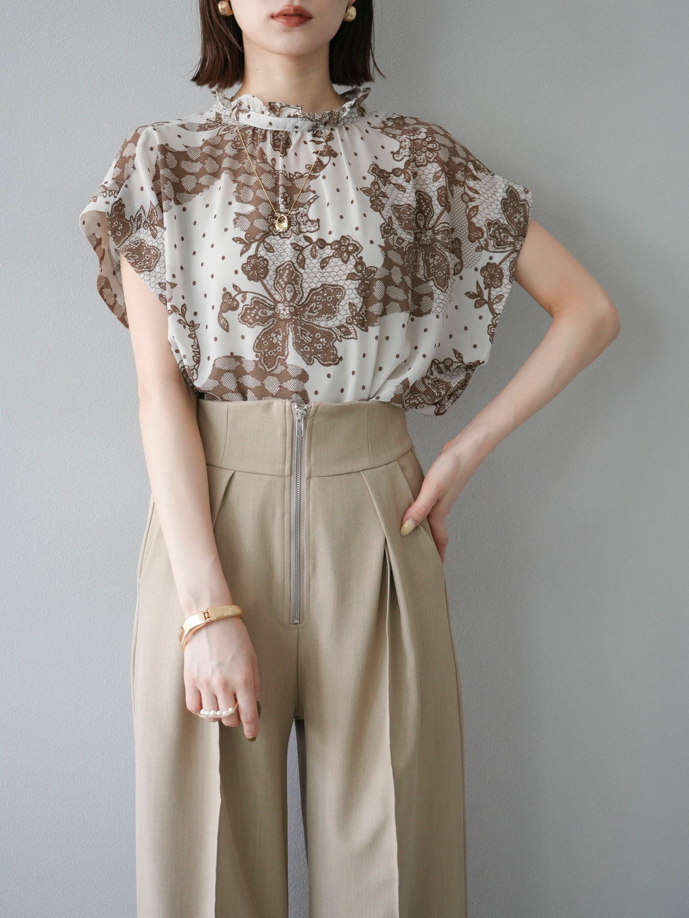 [予約]フラワーパターンフレンチスリーブブラウス/ベージュ
