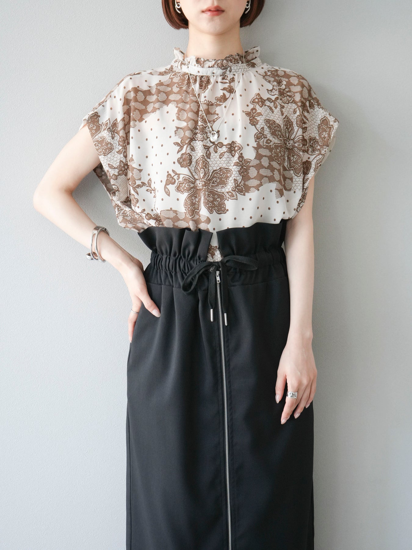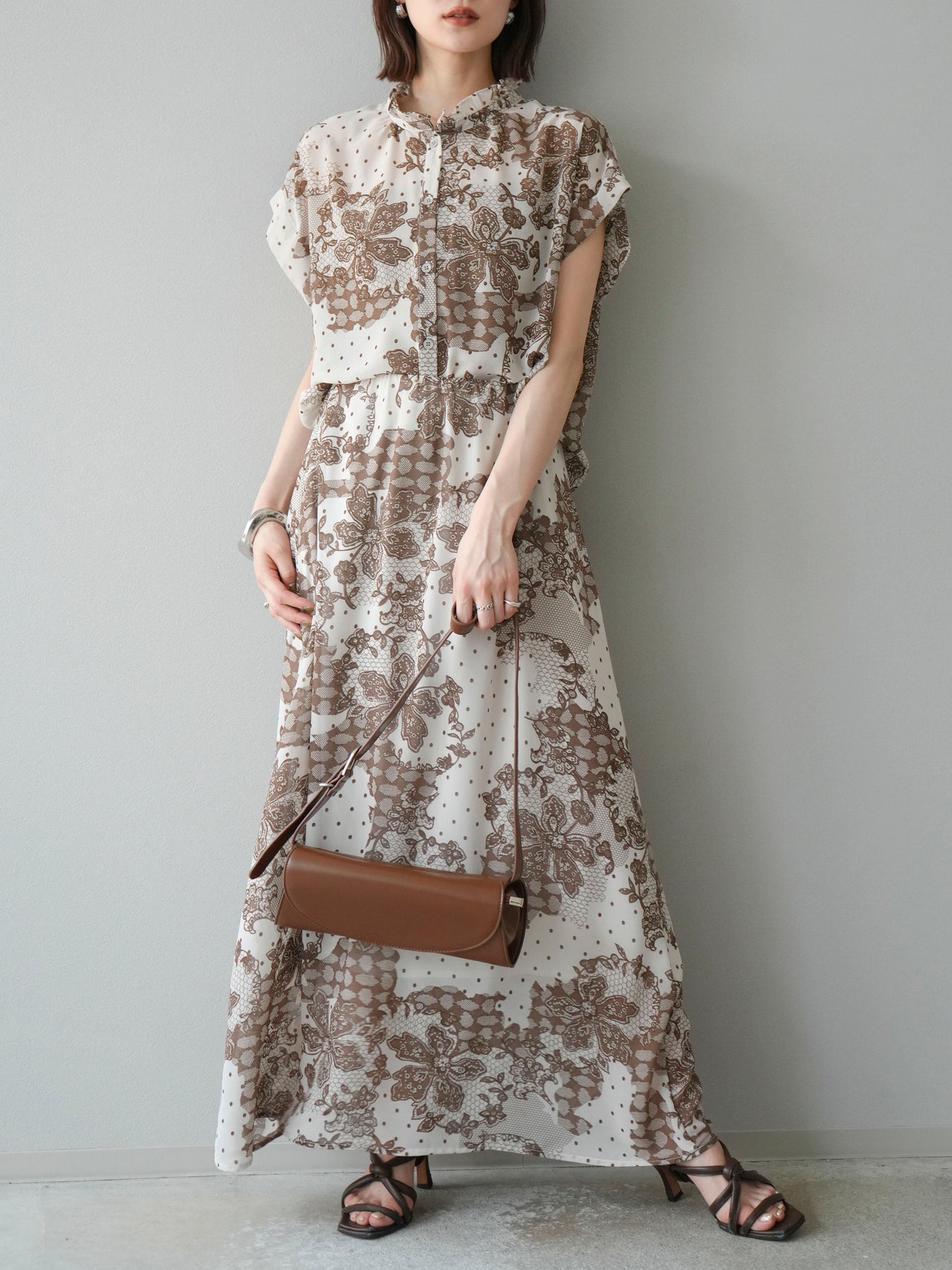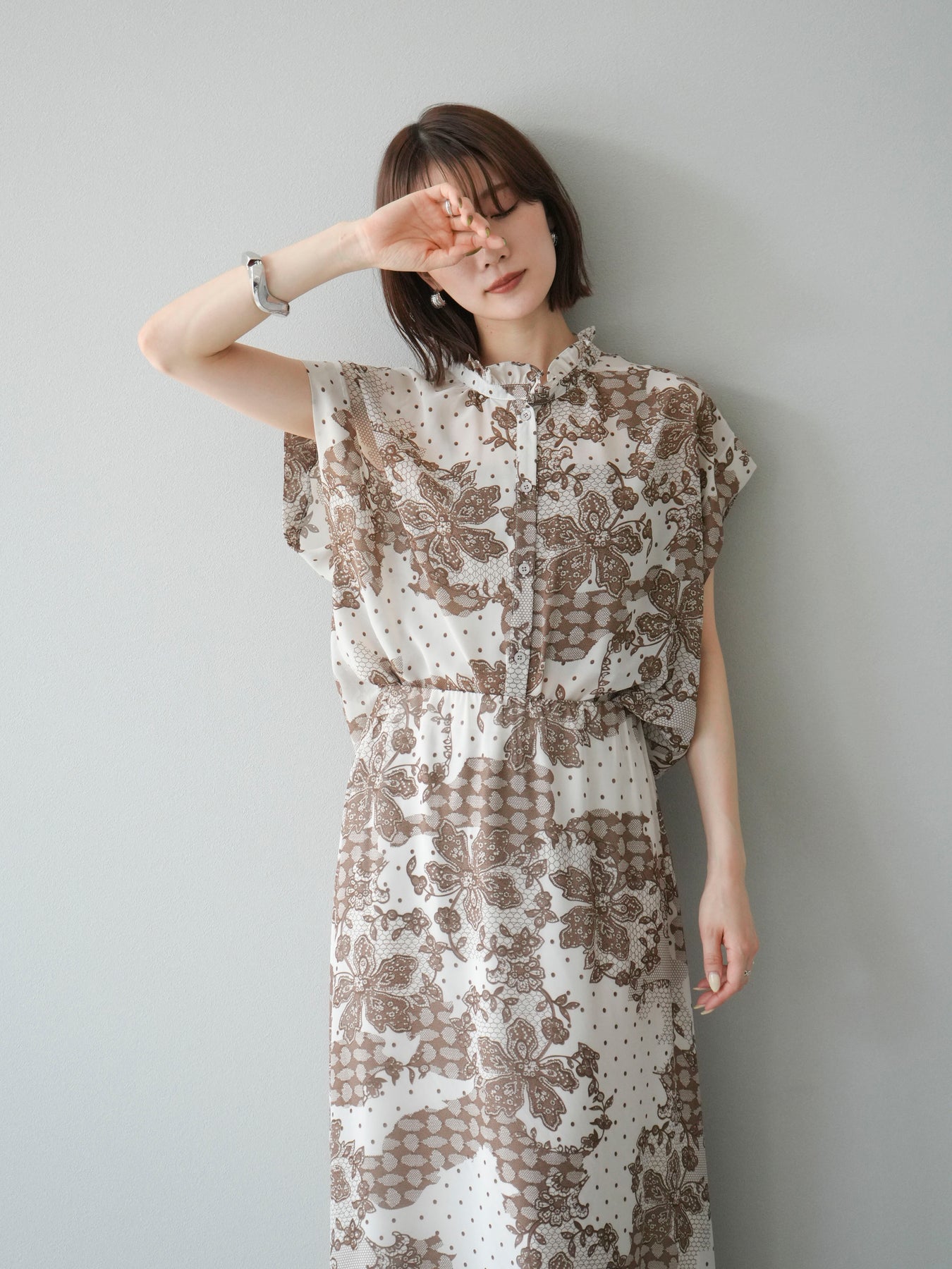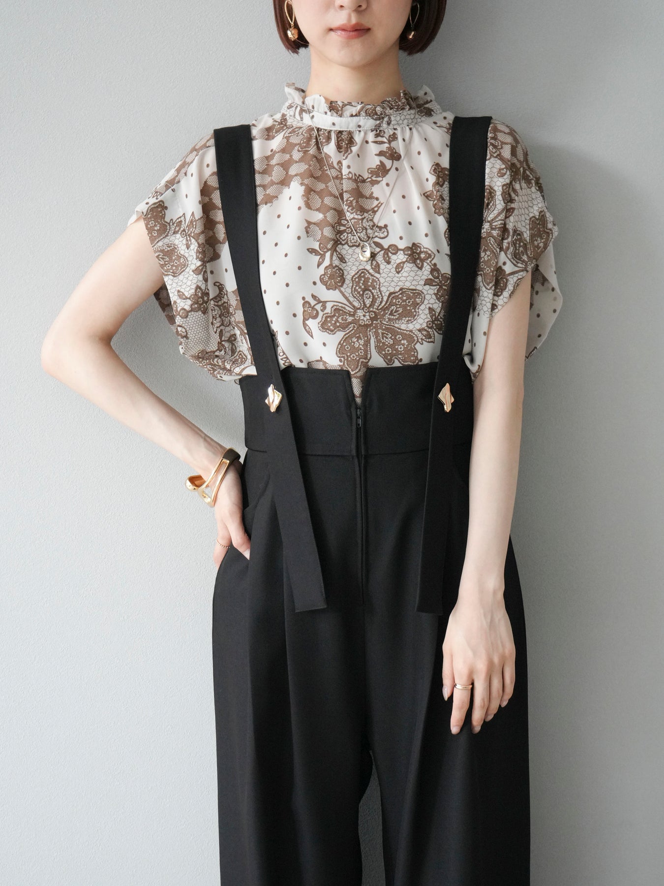 [予約]フラワーパターンフレンチスリーブブラウス/ベージュ
