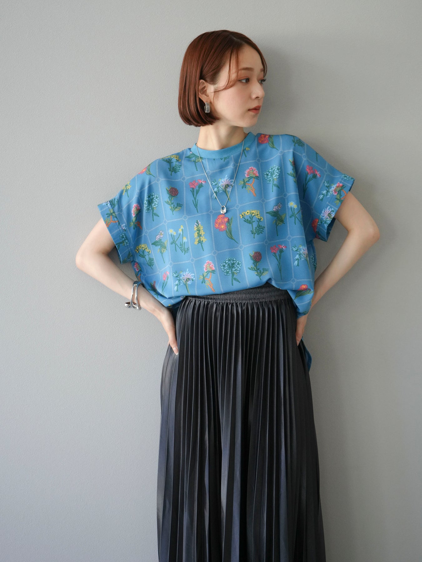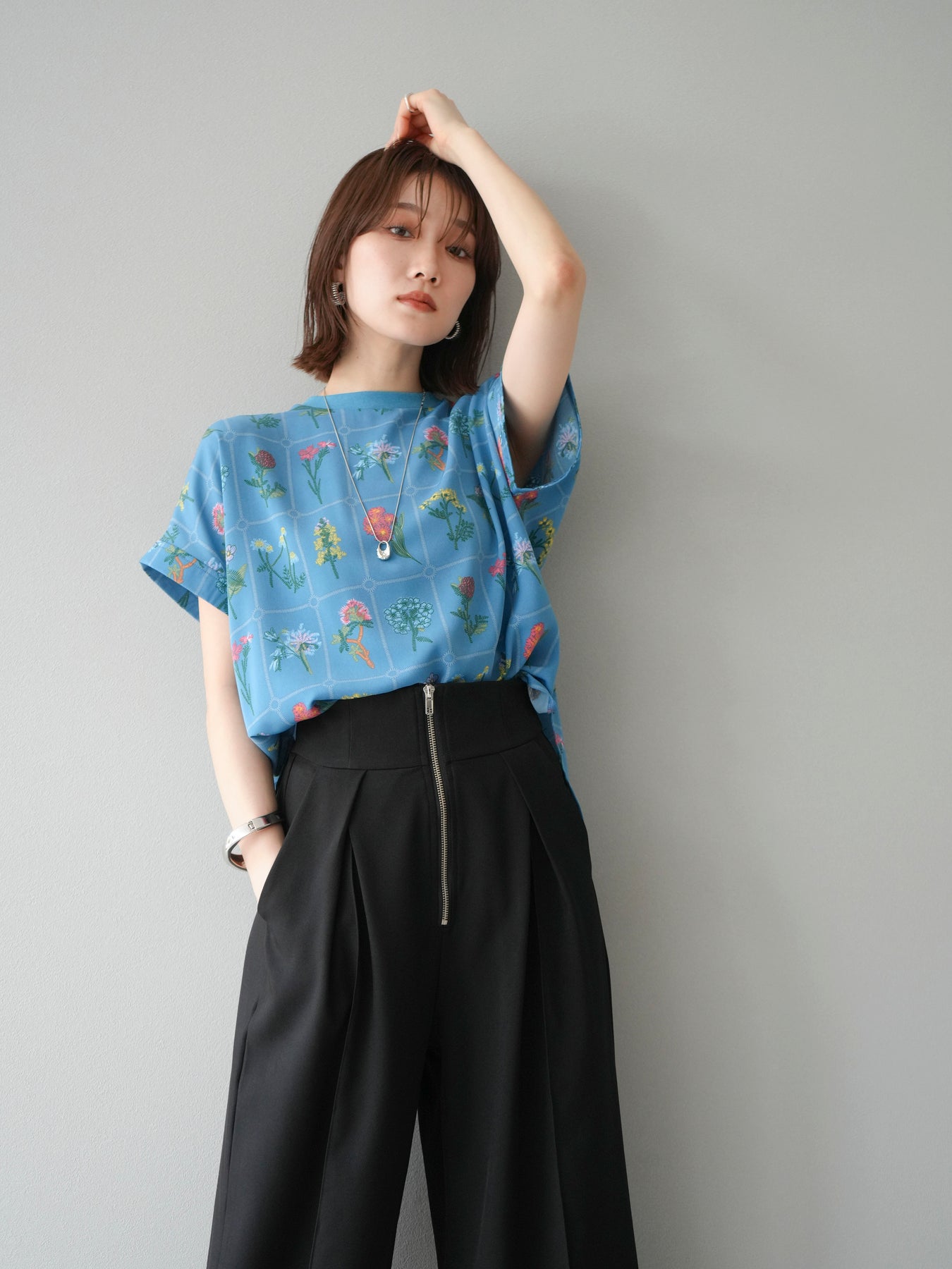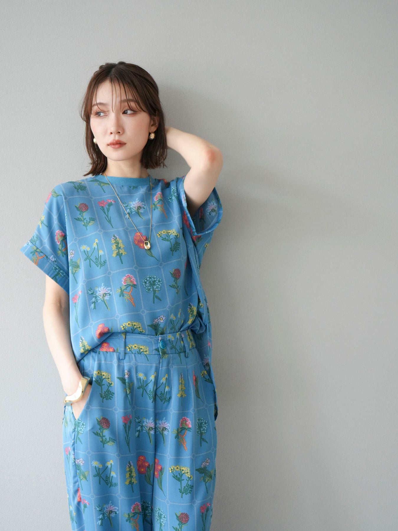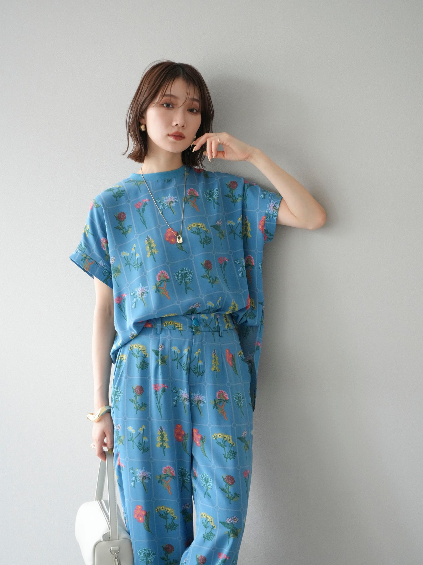 カラフルな花柄をパッチワーク風にレイアウトした華やかなプリントが目を引くプルオーバー。さらっとした素材感と程よいハリのあるシルエットで、身体のラインを拾いにくく涼しげな印象に仕上げています。 袖口はロールアップ風のデザインで、カジュアルさときちんと感のバランスが絶妙。パンツにもスカートにも合わせやすく、単品使いはもちろん、同柄のボトムとセットアップでの着用もおすすめです。 一枚で着映えする、夏にぴったりな主役トップスです。 ※ボトムス、キャミソール(インナー)以外の商品は一律でインナーは付属していません。