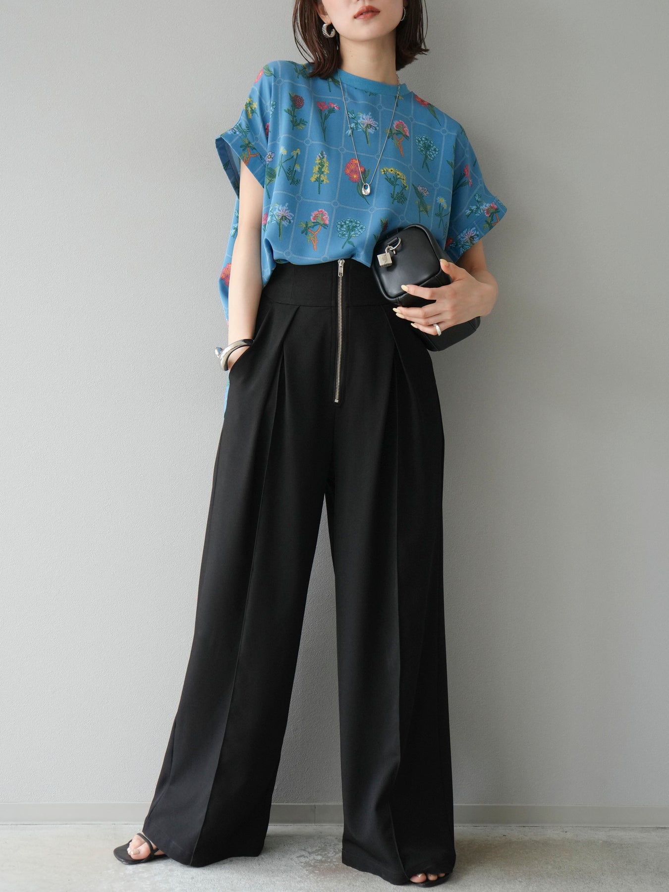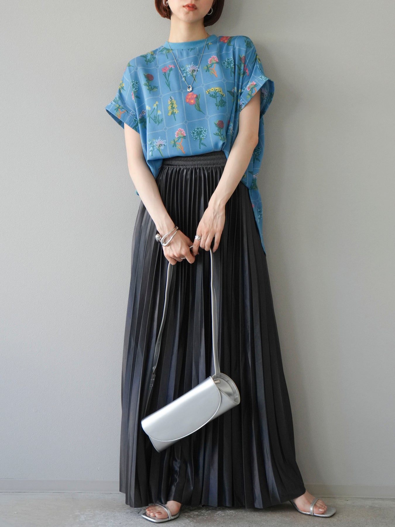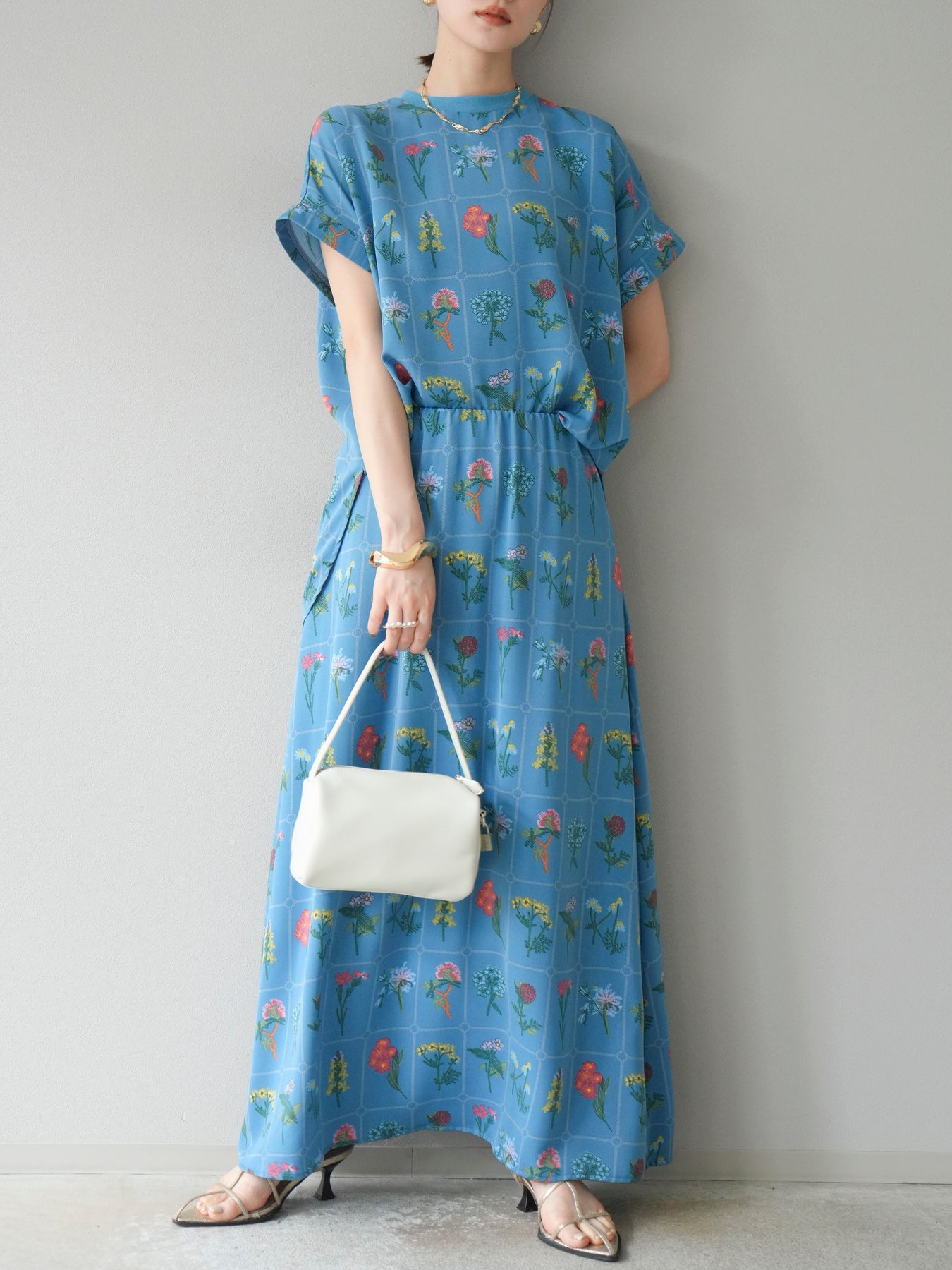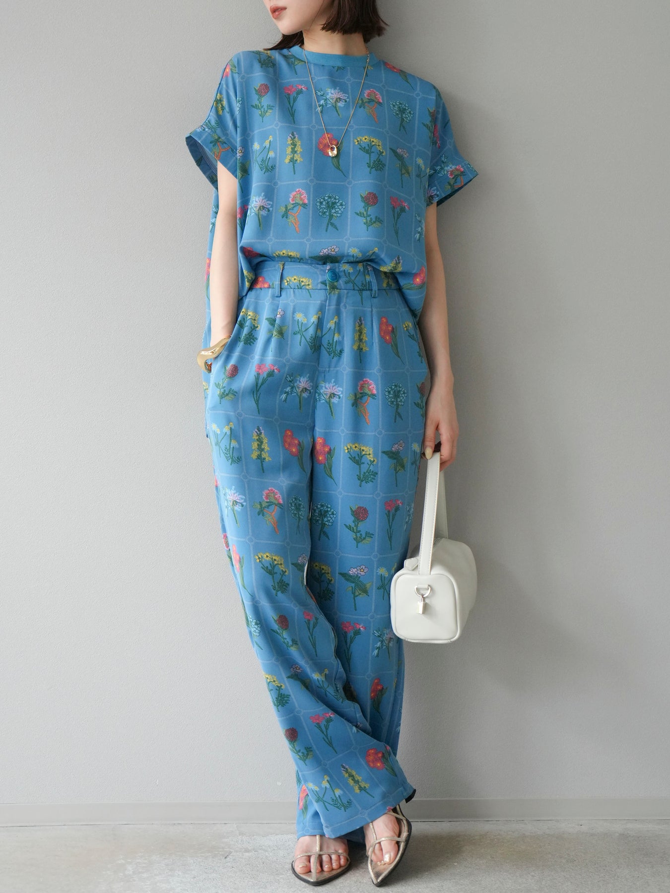 カラフルな花柄をパッチワーク風にレイアウトした華やかなプリントが目を引くプルオーバー。さらっとした素材感と程よいハリのあるシルエットで、身体のラインを拾いにくく涼しげな印象に仕上げています。 袖口はロールアップ風のデザインで、カジュアルさときちんと感のバランスが絶妙。パンツにもスカートにも合わせやすく、単品使いはもちろん、同柄のボトムとセットアップでの着用もおすすめです。 一枚で着映えする、夏にぴったりな主役トップスです。 ※ボトムス、キャミソール(インナー)以外の商品は一律でインナーは付属していません。
