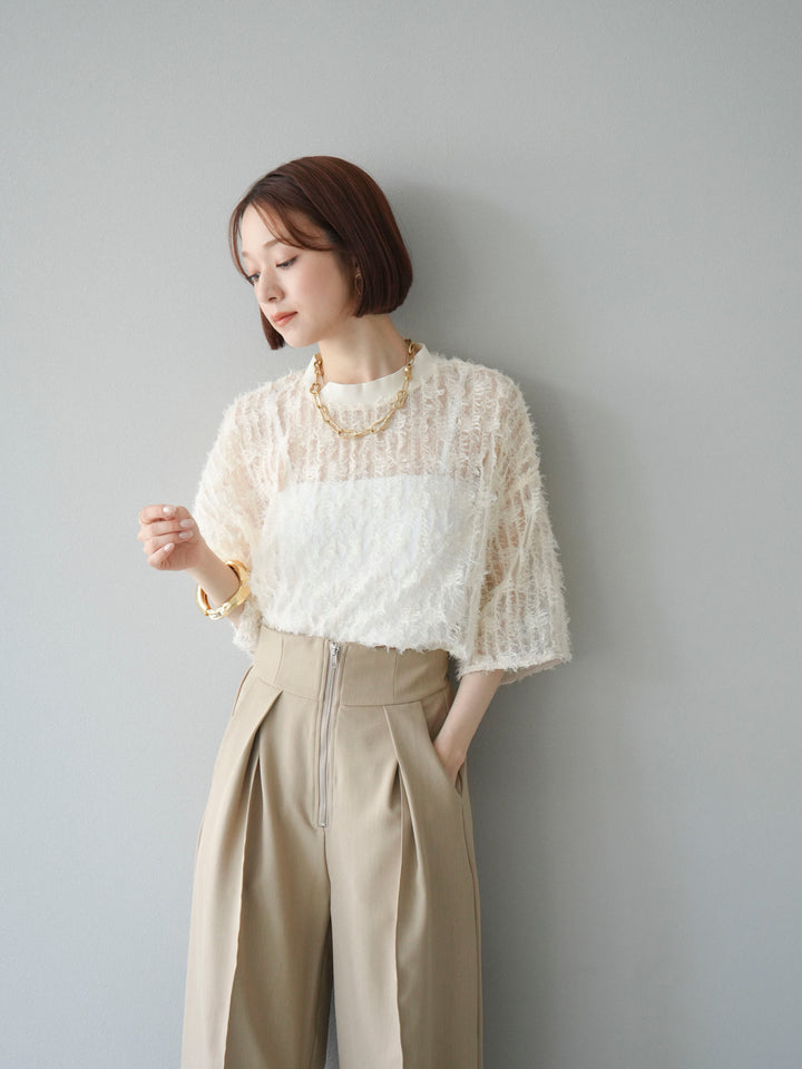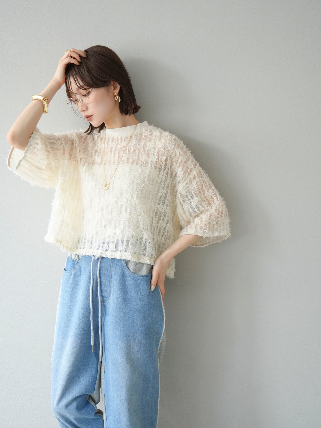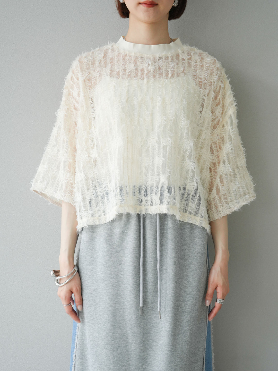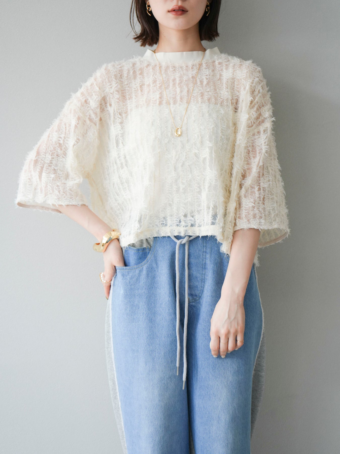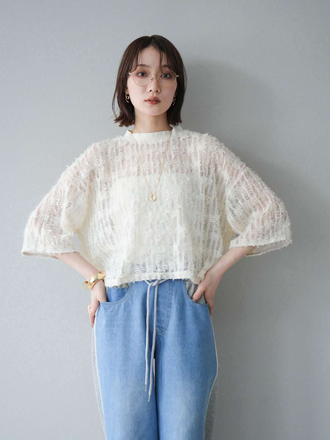 表情豊かなフリンジデザインが目を惹く、シアー素材のショートプルオーバー。 繊細な透け感とランダムなフリンジが、着こなしに個性と軽やかさをプラスしてくれます。 ショート丈ながら程よいゆとりのあるシルエットで、ボトムスを選ばず幅広くスタイリング可能。 インナー次第で印象が変わるため、ロングシーズン活躍するアイテムです。 ※ボトムス、キャミソール(インナー)以外の商品は一律でインナーは付属していません。