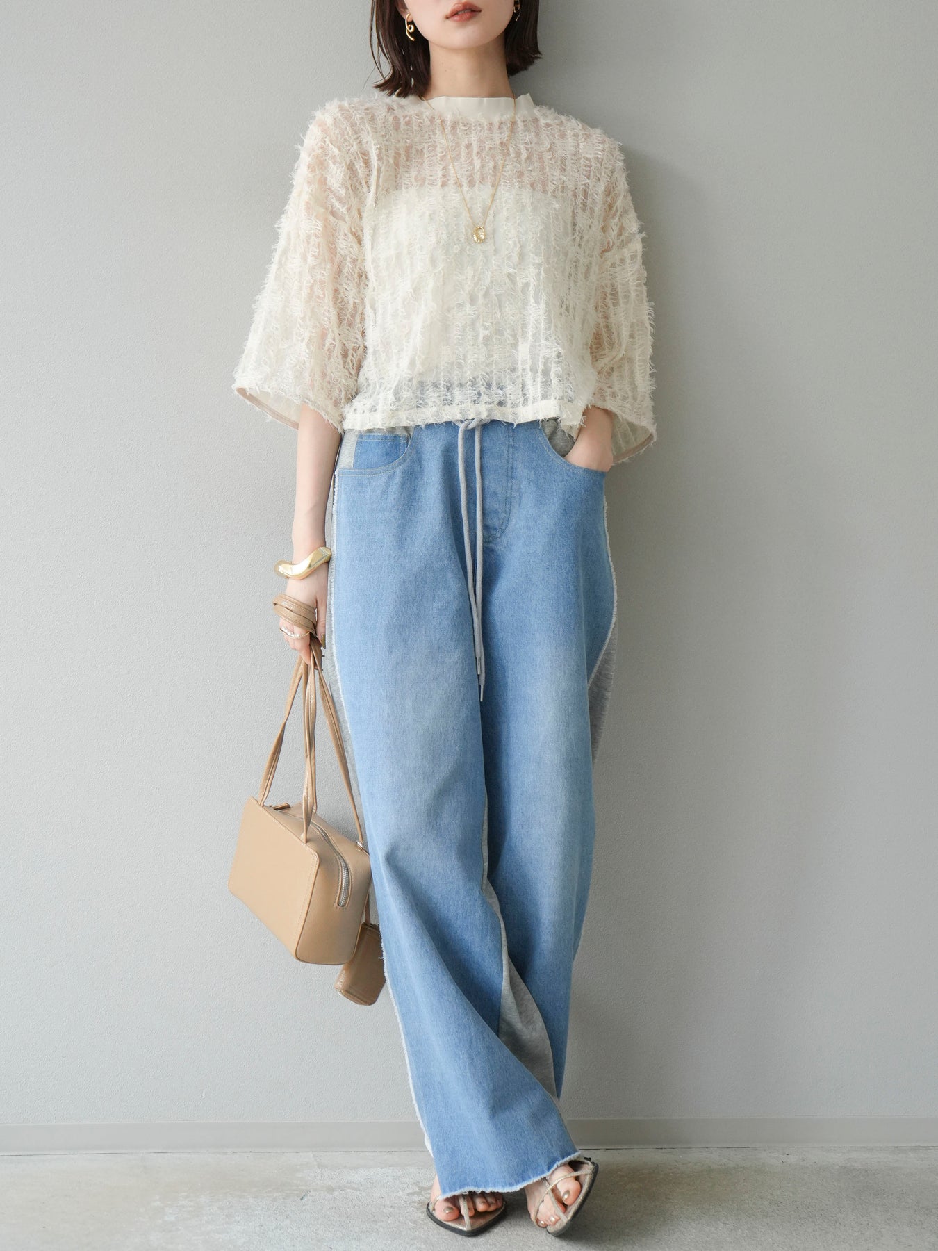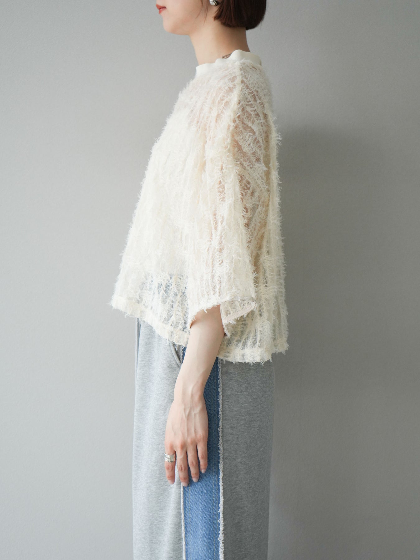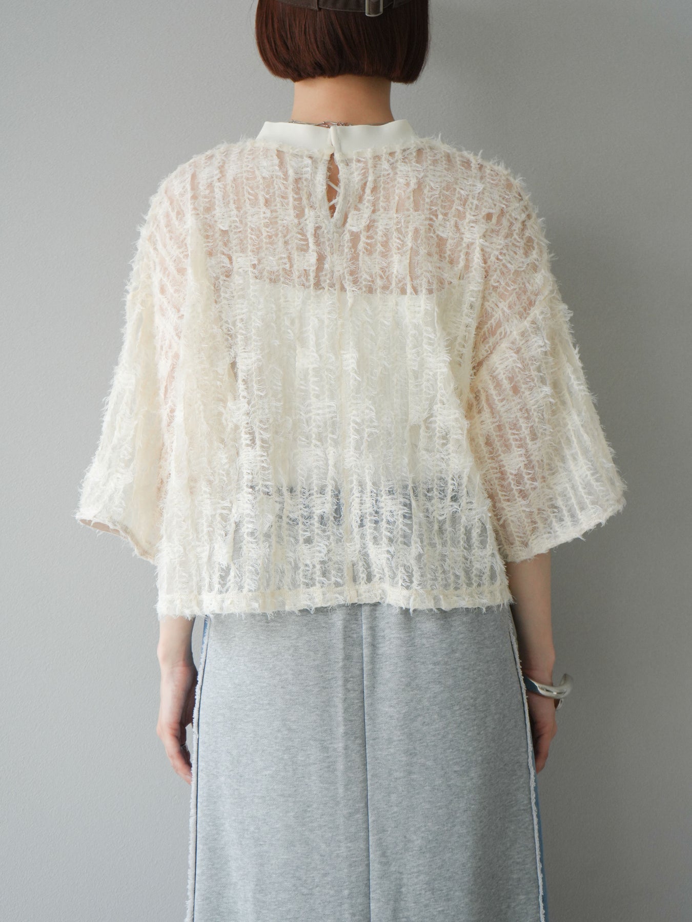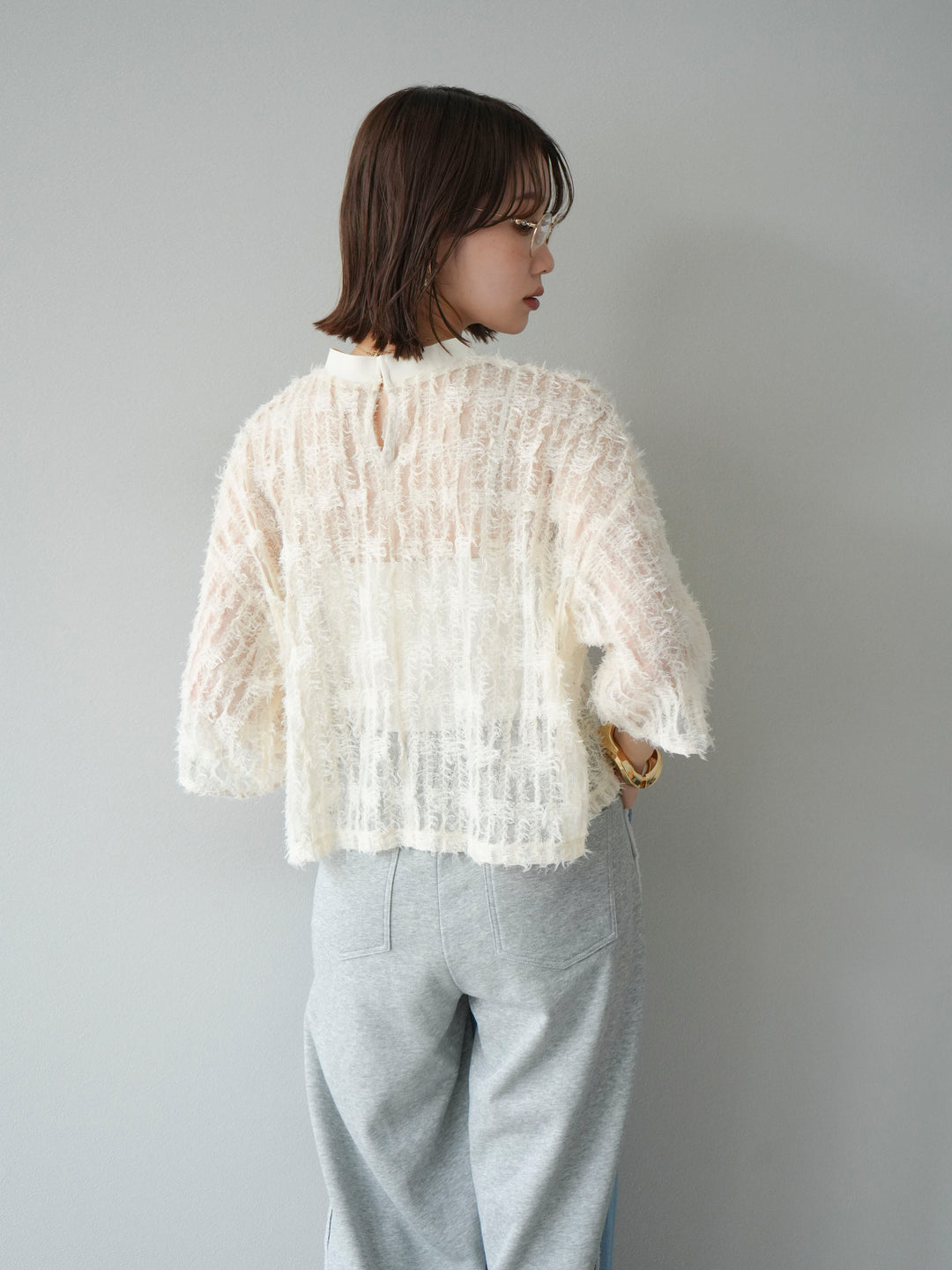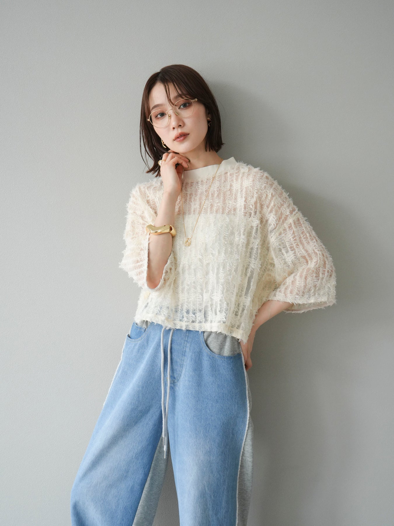 表情豊かなフリンジデザインが目を惹く、シアー素材のショートプルオーバー。 繊細な透け感とランダムなフリンジが、着こなしに個性と軽やかさをプラスしてくれます。 ショート丈ながら程よいゆとりのあるシルエットで、ボトムスを選ばず幅広くスタイリング可能。 インナー次第で印象が変わるため、ロングシーズン活躍するアイテムです。 ※ボトムス、キャミソール(インナー)以外の商品は一律でインナーは付属していません。