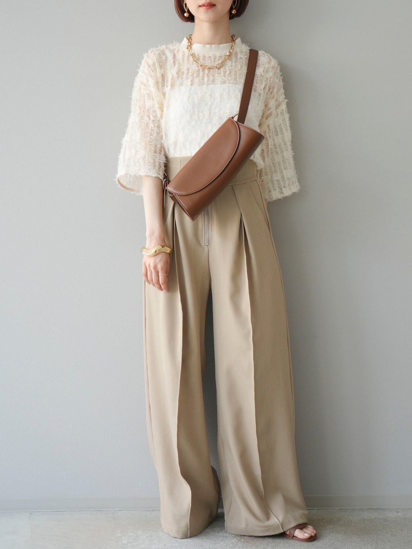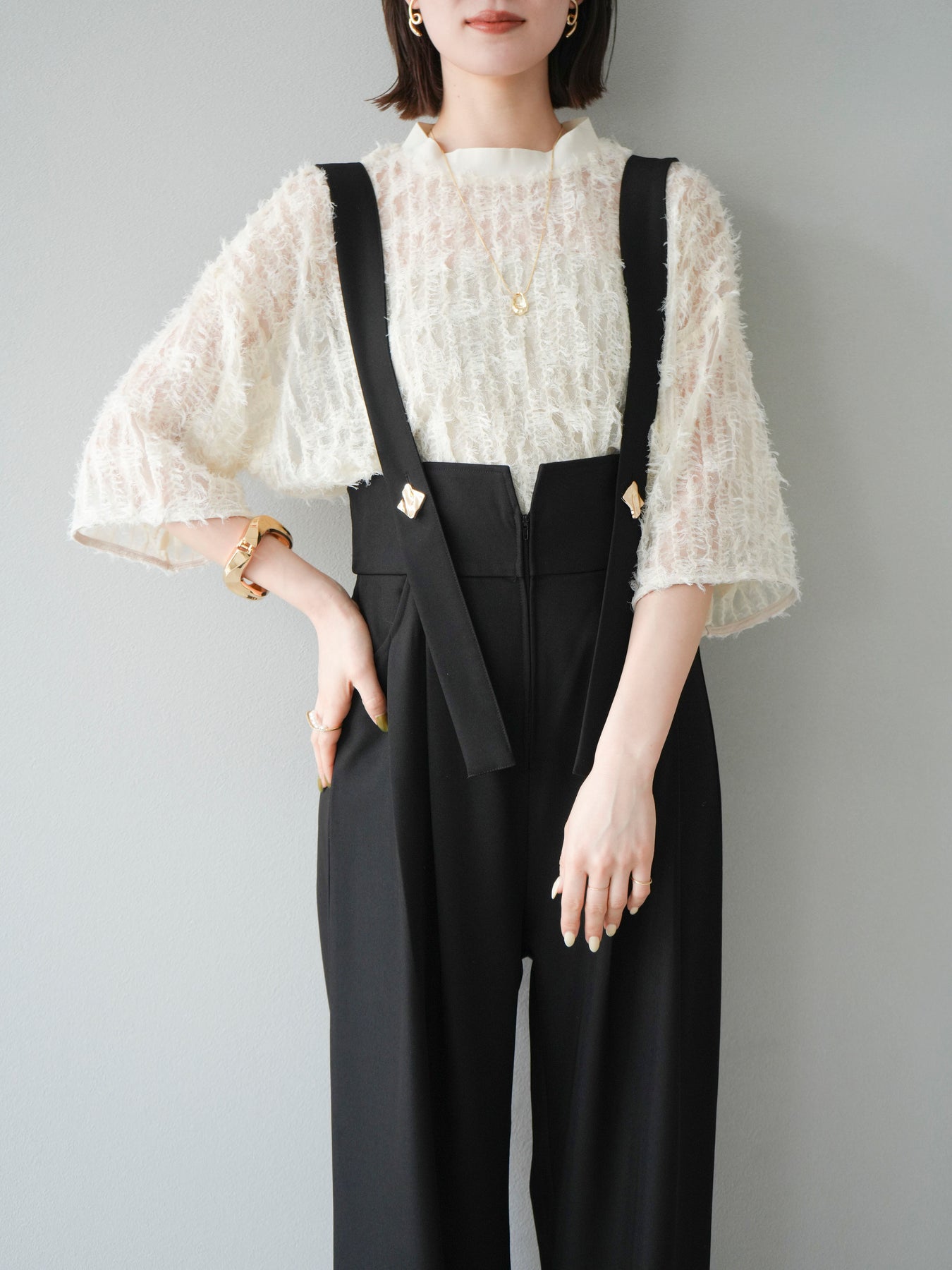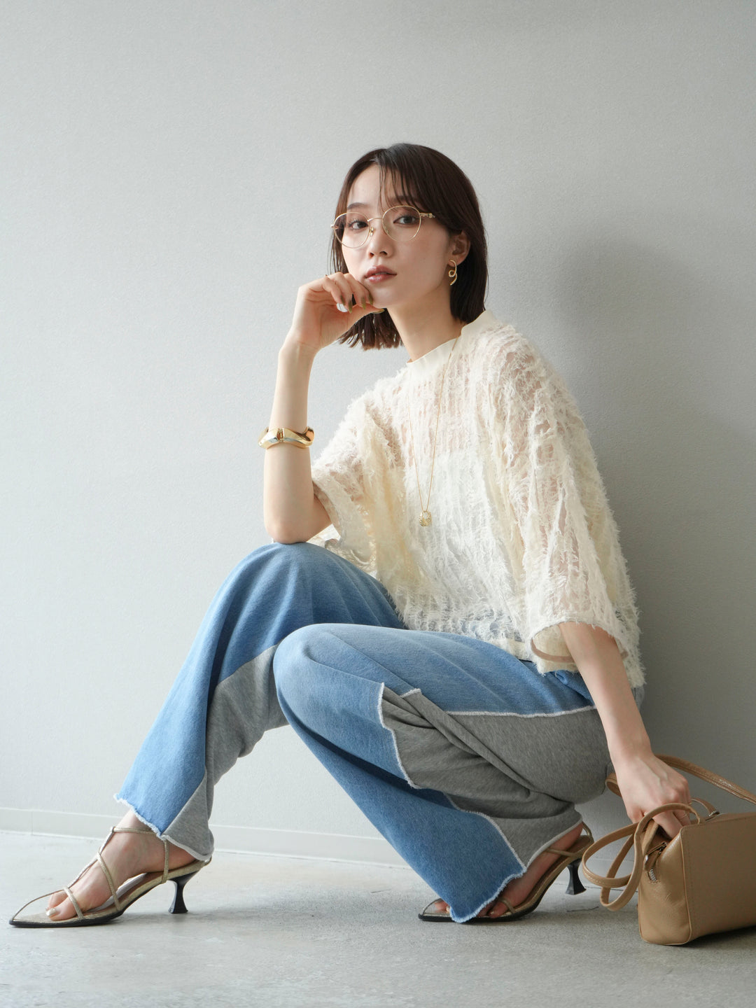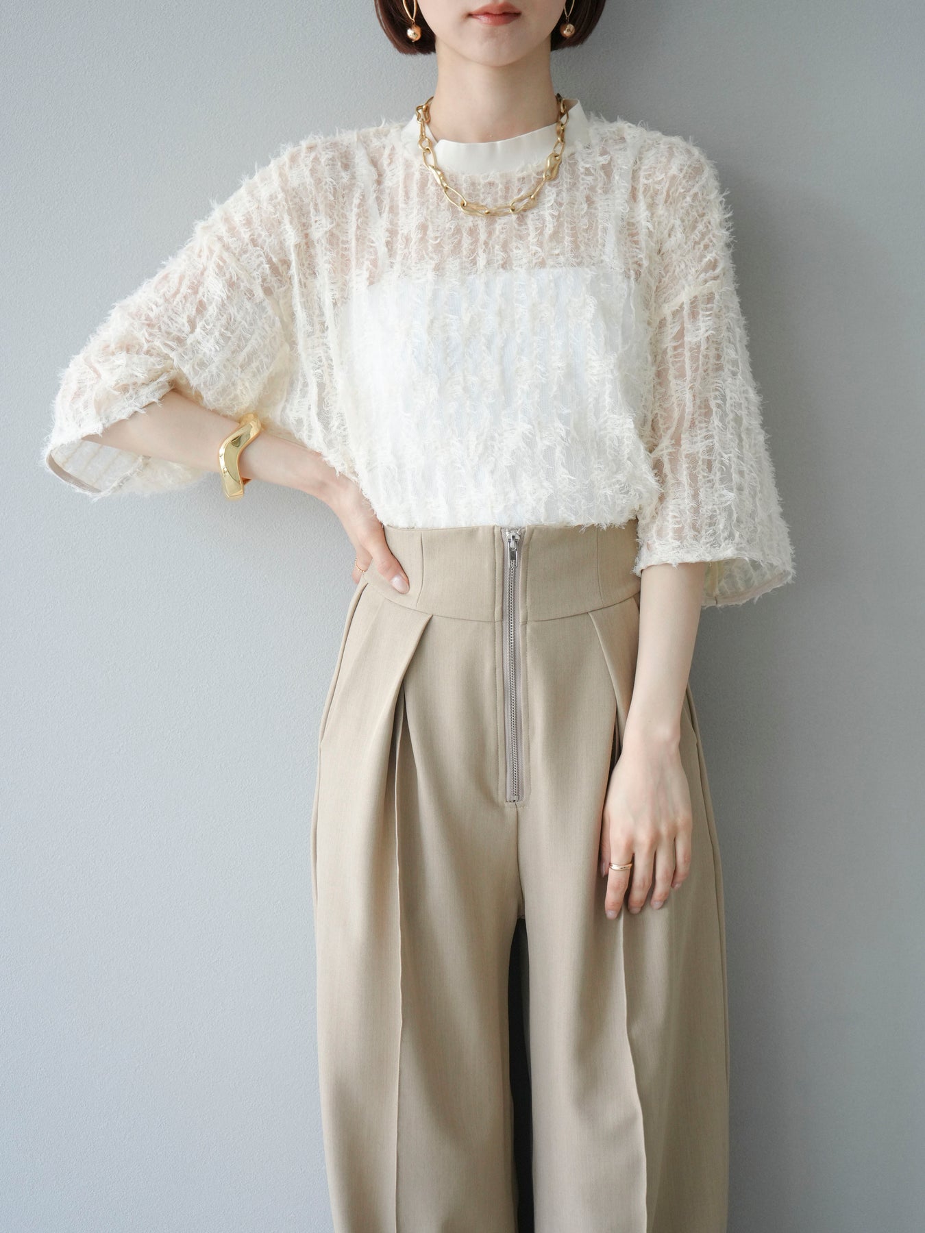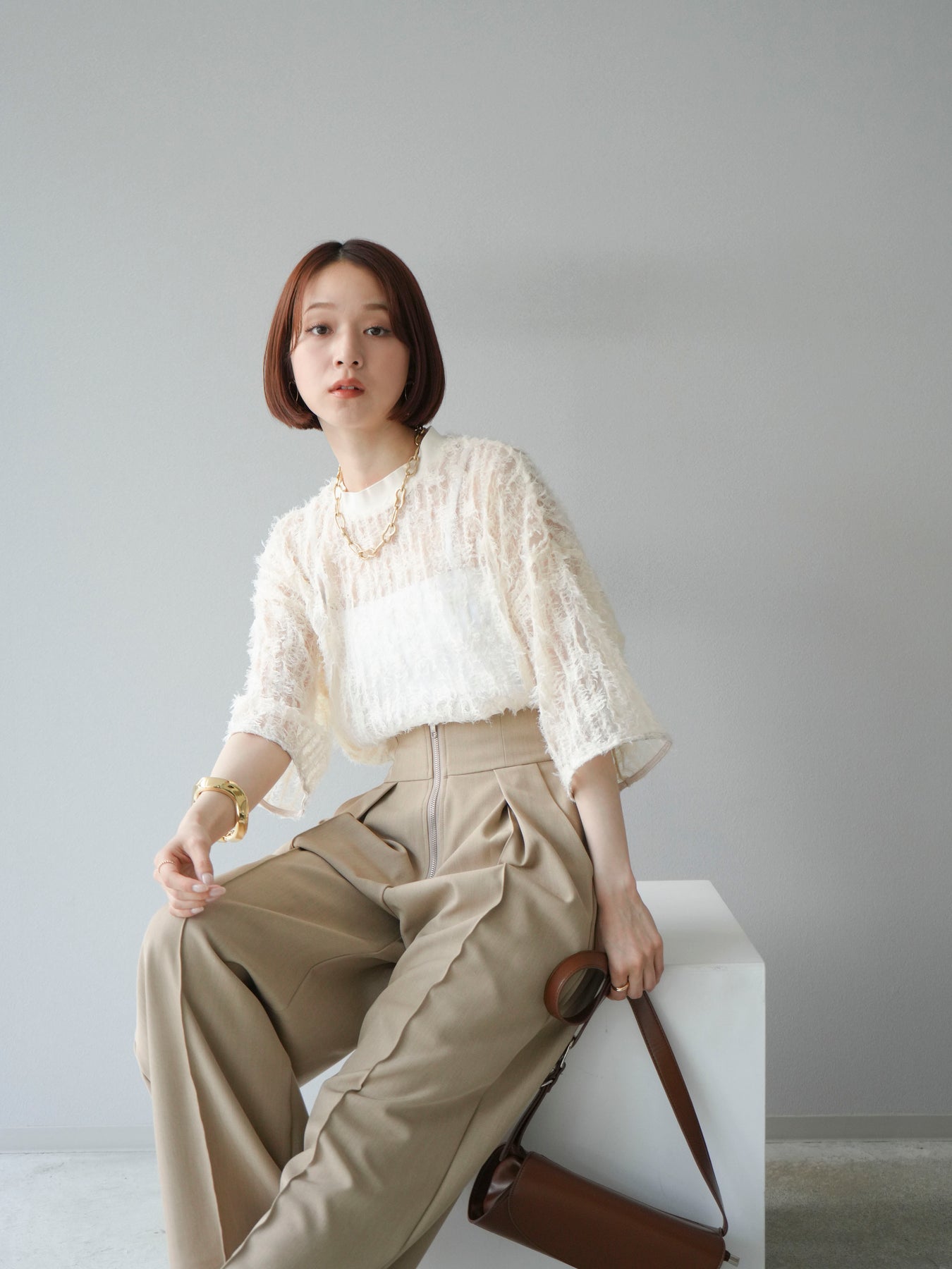 表情豊かなフリンジデザインが目を惹く、シアー素材のショートプルオーバー。 繊細な透け感とランダムなフリンジが、着こなしに個性と軽やかさをプラスしてくれます。 ショート丈ながら程よいゆとりのあるシルエットで、ボトムスを選ばず幅広くスタイリング可能。 インナー次第で印象が変わるため、ロングシーズン活躍するアイテムです。 ※ボトムス、キャミソール(インナー)以外の商品は一律でインナーは付属していません。