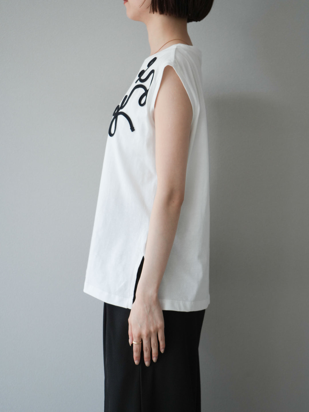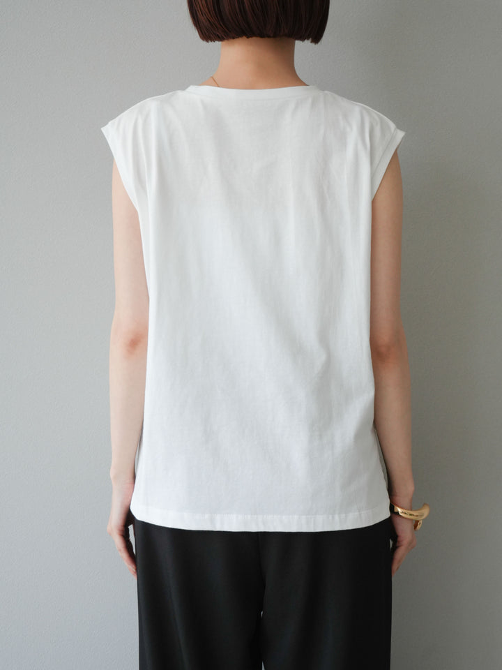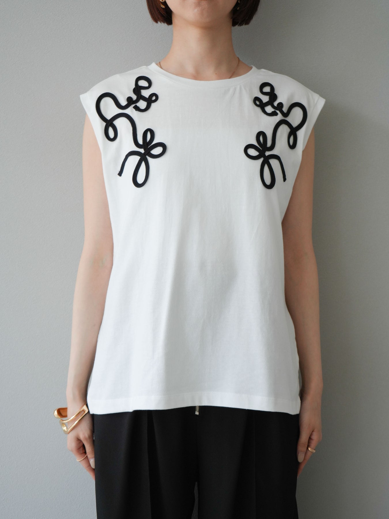程よい厚みのコットン素材を使用した、さらりとした着心地のTシャツ。肩にかかるフレンチスリーブが腕まわりをさりげなくカバーし、女性らしさを引き立ててくれます。フロントにはコードを使った立体的な刺繍が施され、シンプルながらもモード感漂うデザインが魅力。ボトムスを選ばずデニムやスカート、きれいめパンツとの相性も良く、日常使いからお出かけまで幅広く活躍するアイテムです。 ※ボトムス、キャミソール(インナー)以外の商品は一律でインナーは付属していません。