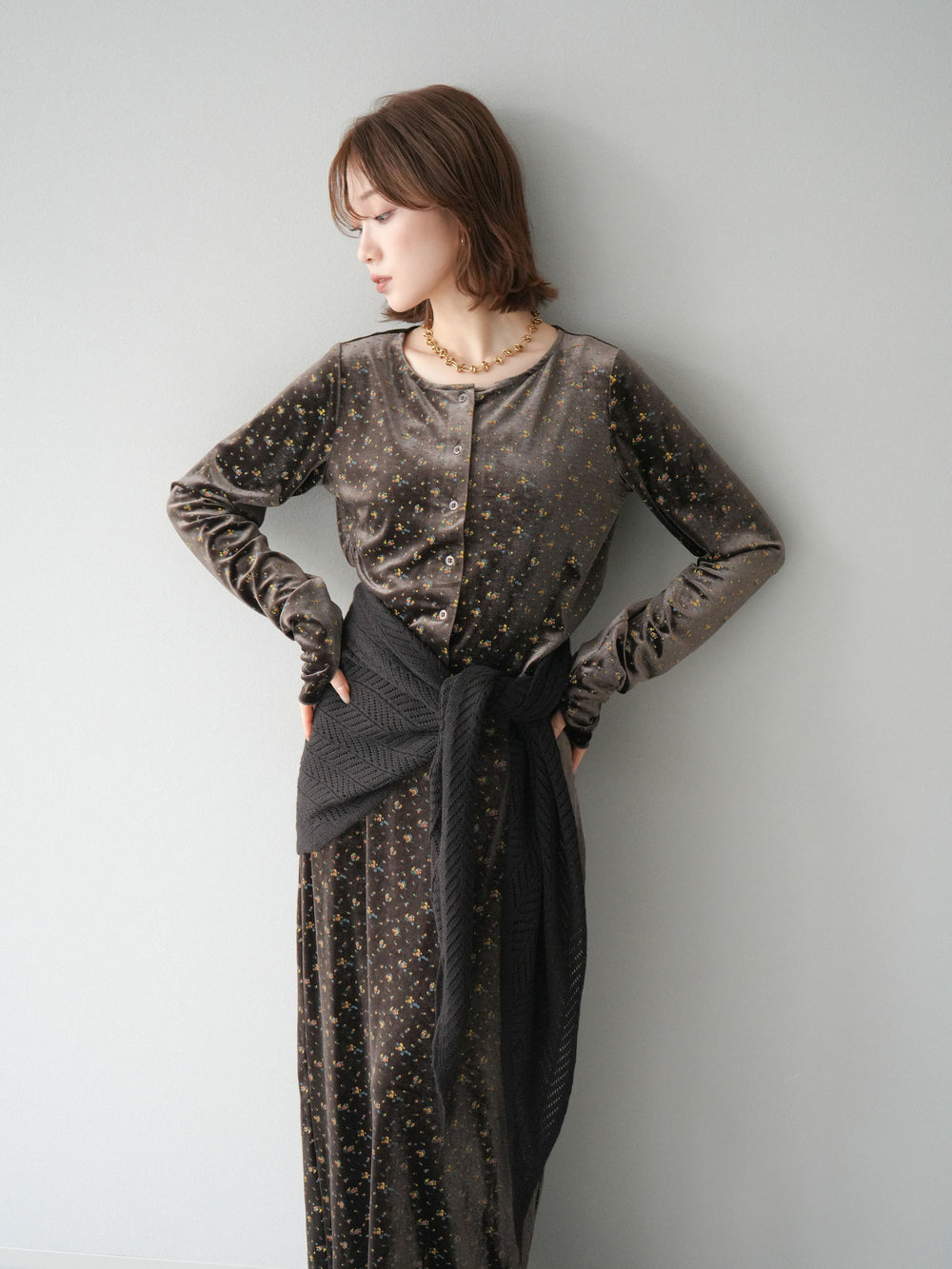 [予約]ベロアフラワープリントカーディガン/ブラウンxイエロー