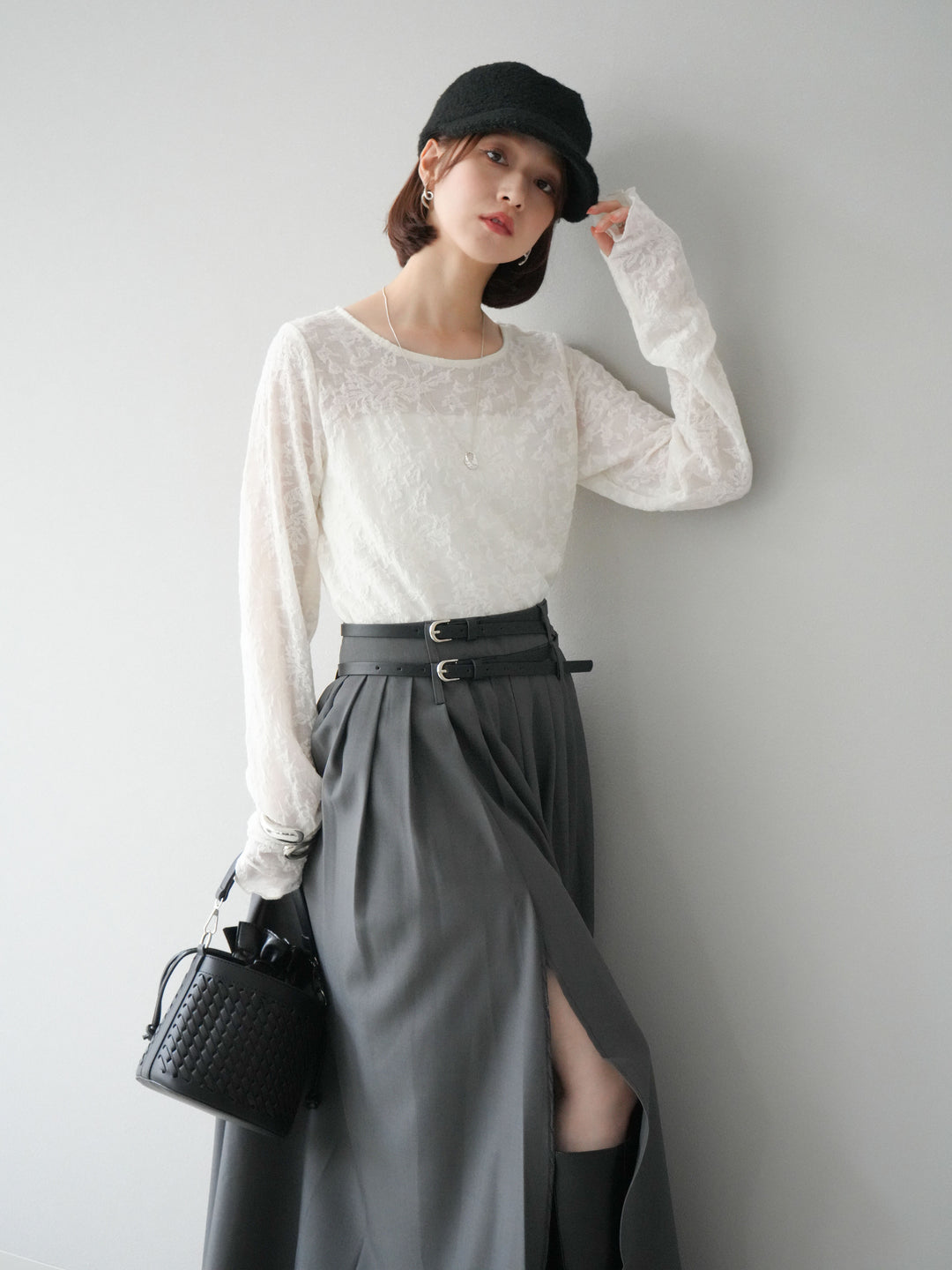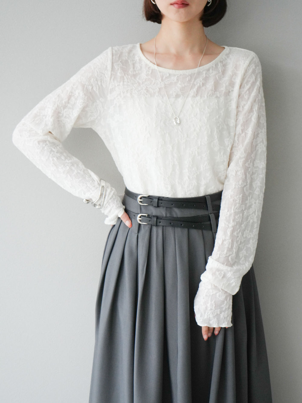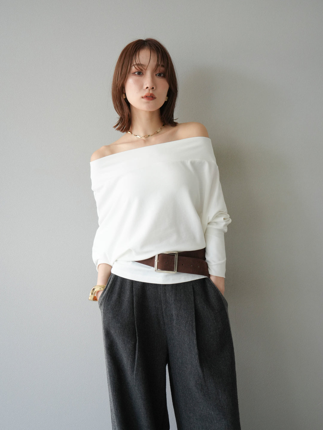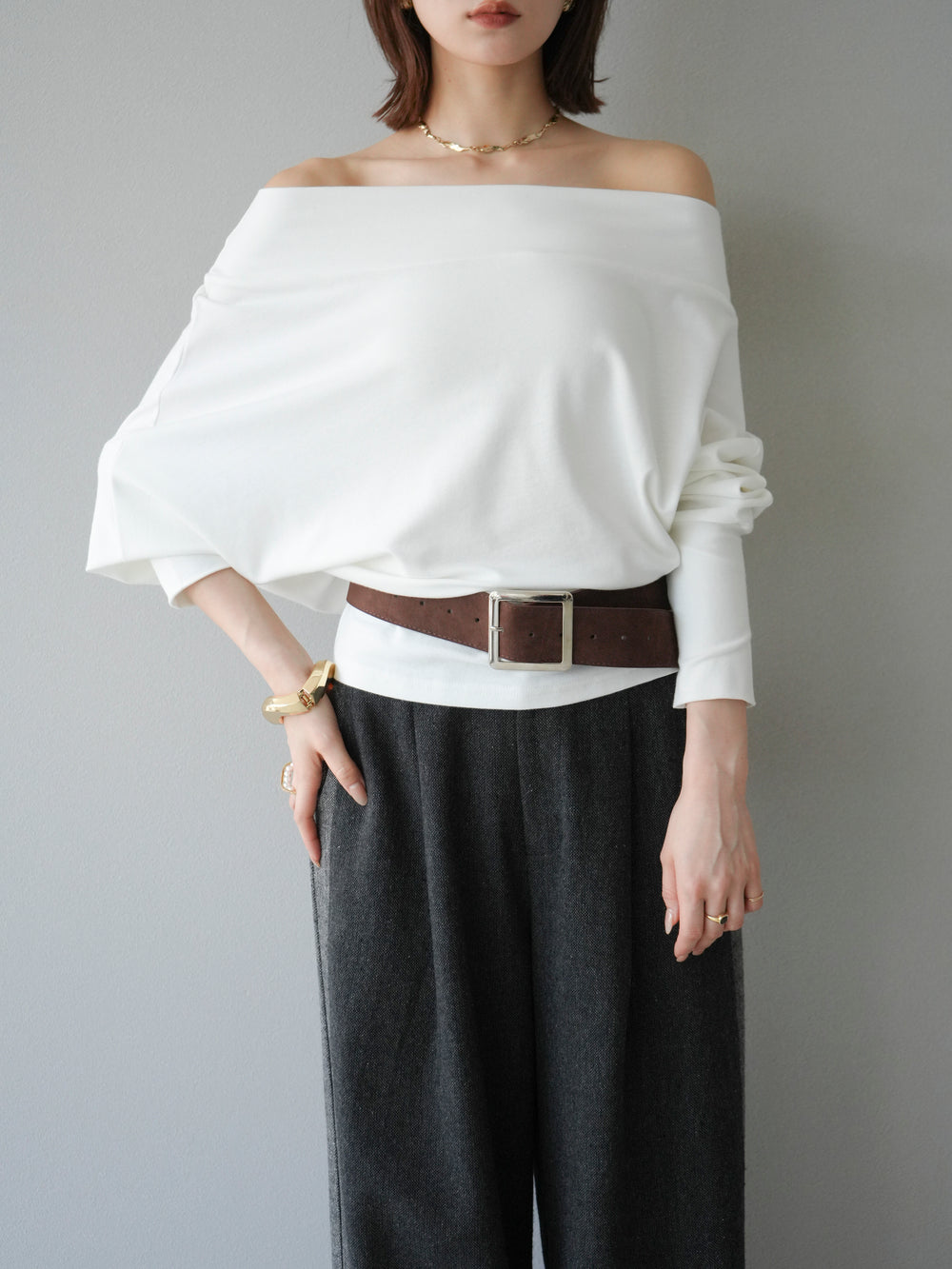 [予約]ベルト付オフショルカットソー/ホワイト