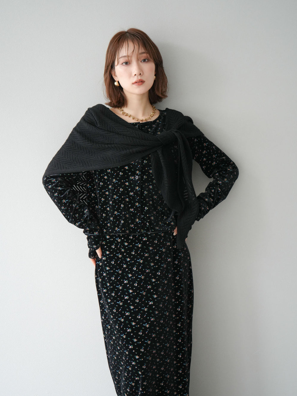 [予約]ベロアフラワープリントカーディガン/ブラックxイエロー