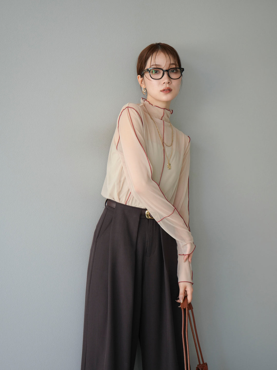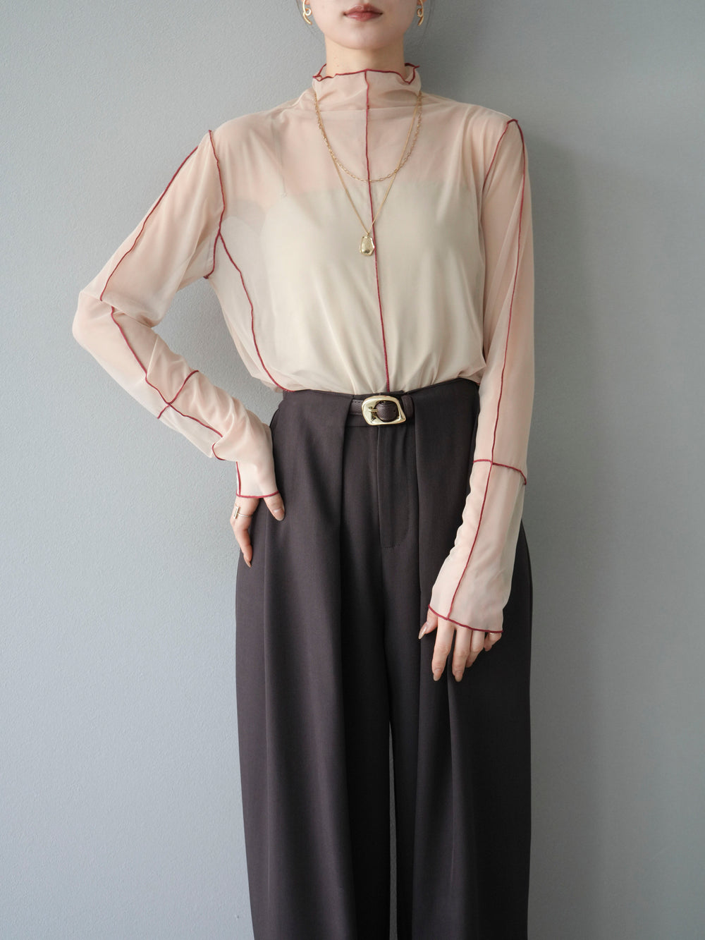 [予約]シアーパイピングカットソー/グレージュ×レッド