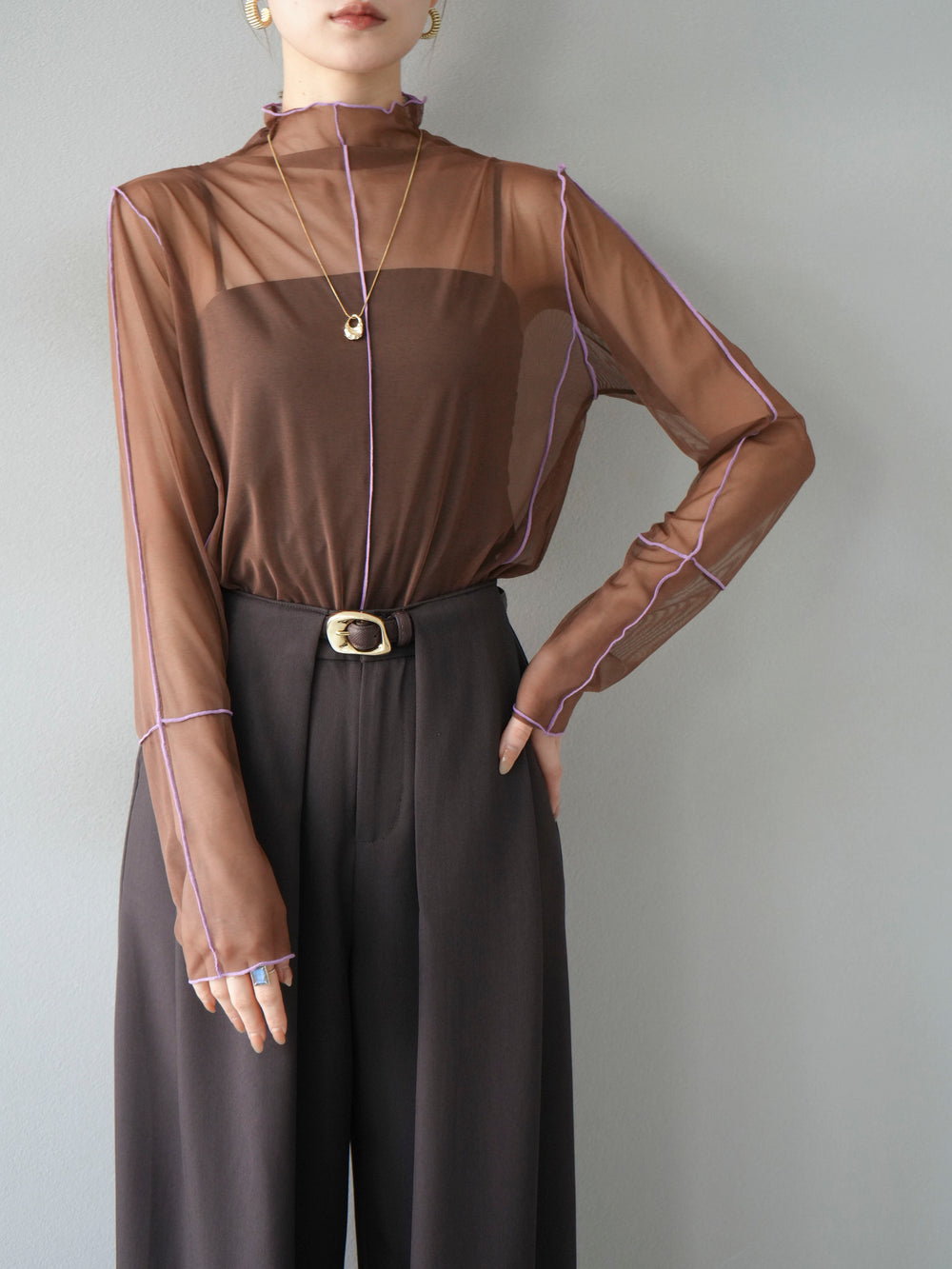 [予約]シアーパイピングカットソー/ダークブラウン×ラベンダー