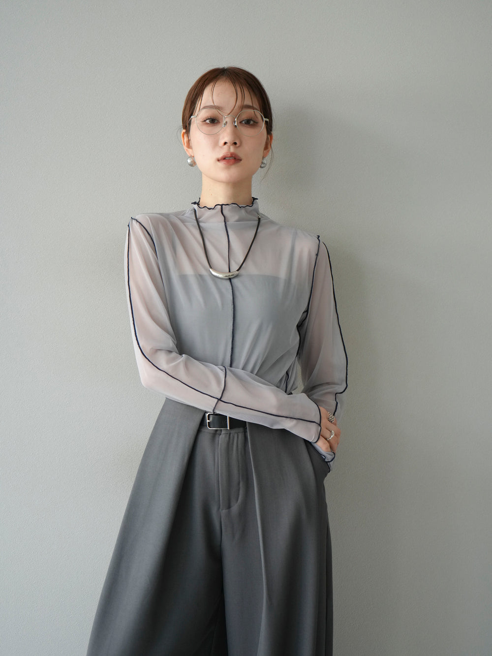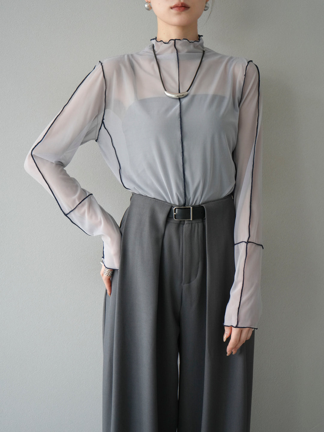 [予約]シアーパイピングカットソー/ライトグレー×ネイビー