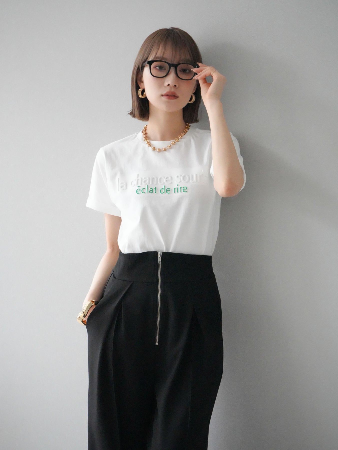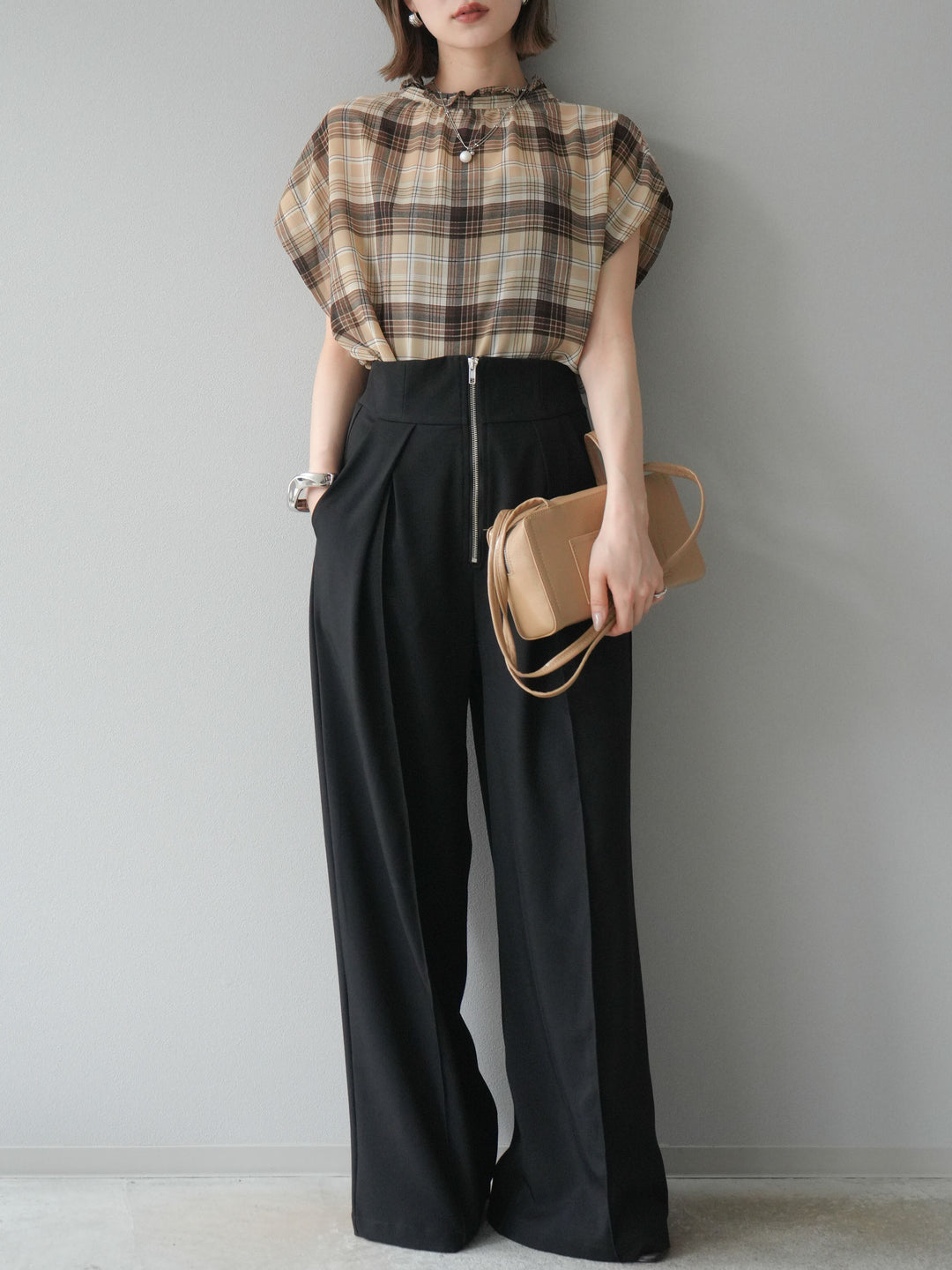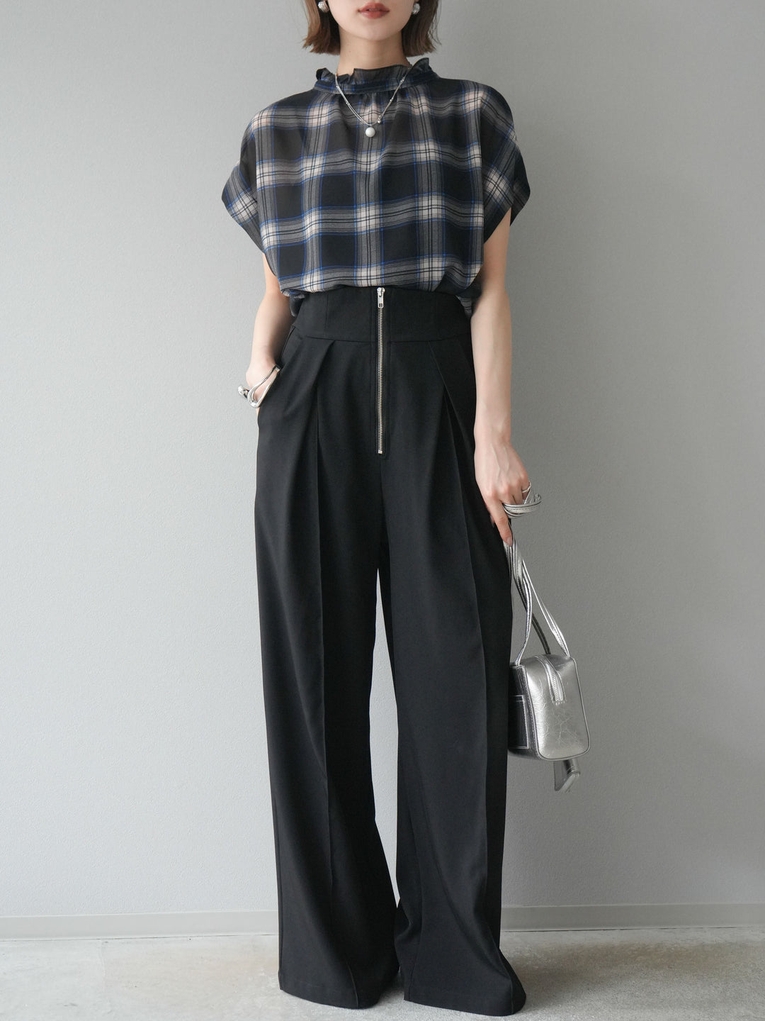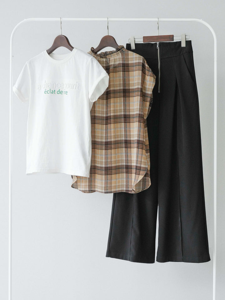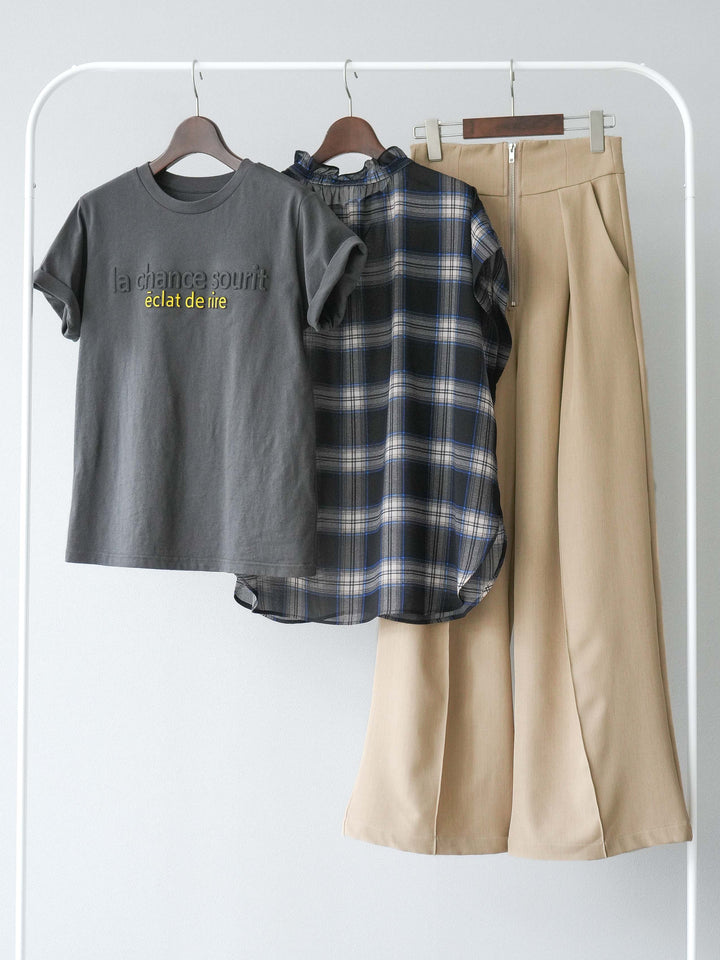 【着回しセット】[SET]エンボスロゴTシャツ+2WAYシアーチェックフレンチスリーブブラウス+ジップタックワイドパンツ(3set)