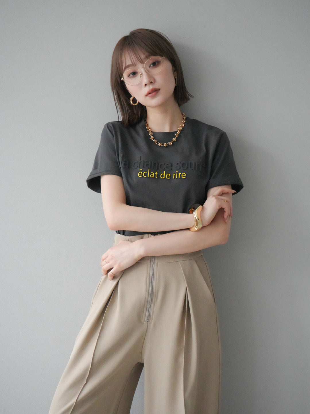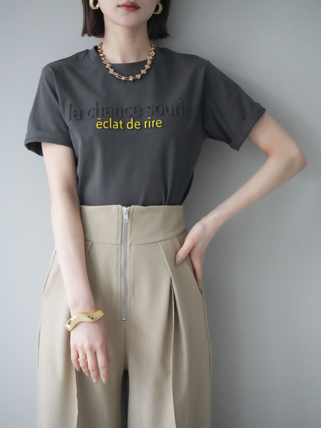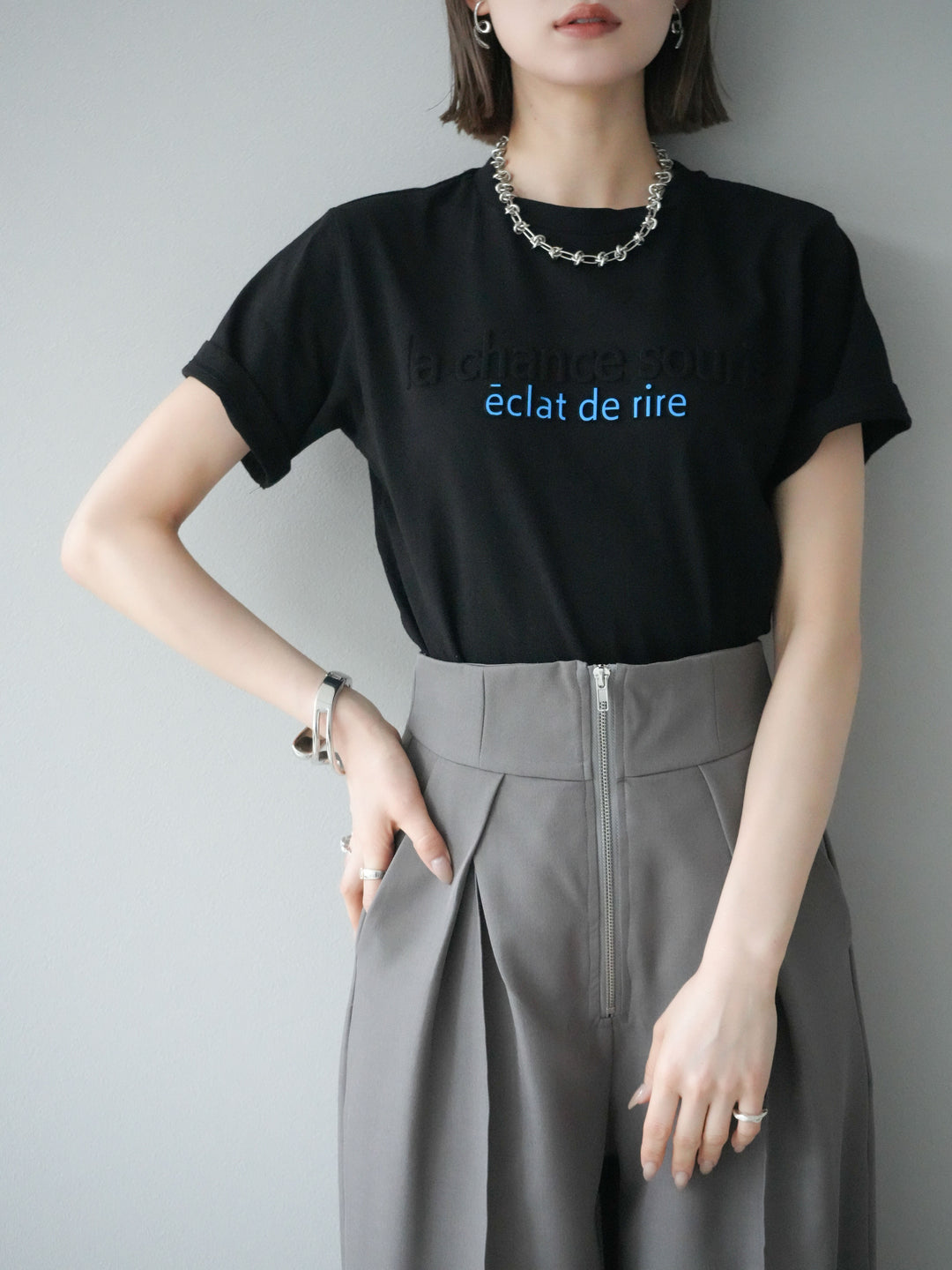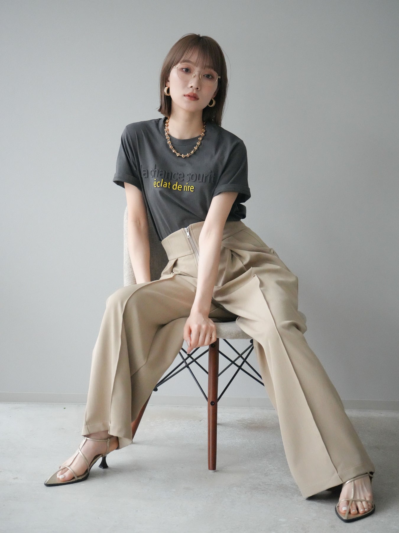 【着回しセット】[SET]エンボスロゴTシャツ+2WAYシアーチェックフレンチスリーブブラウス+ジップタックワイドパンツ(3set)
