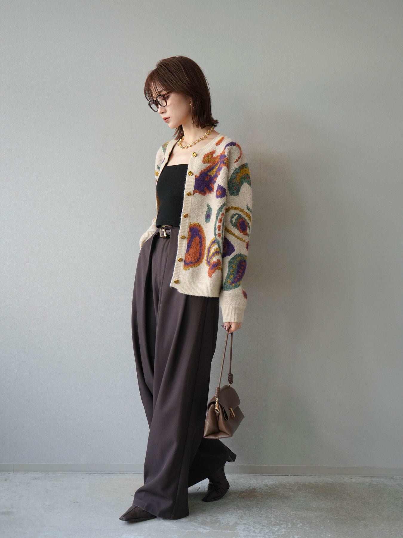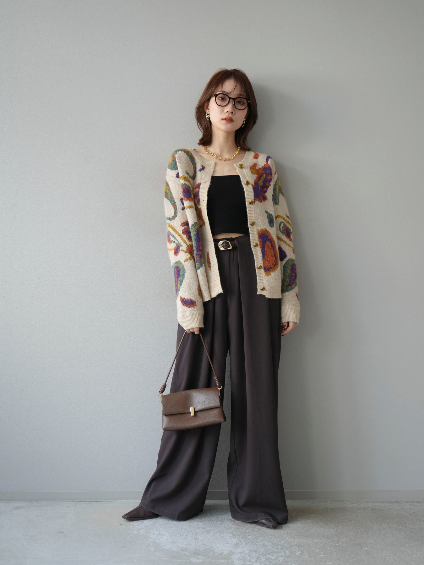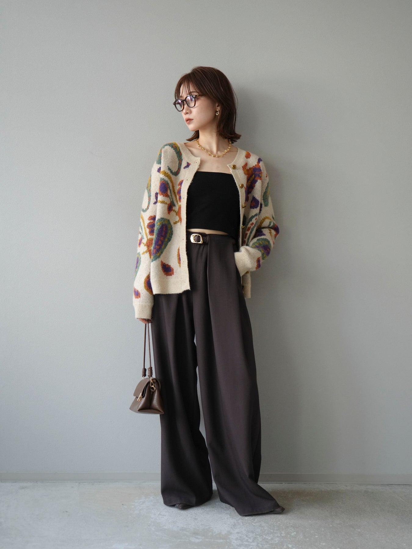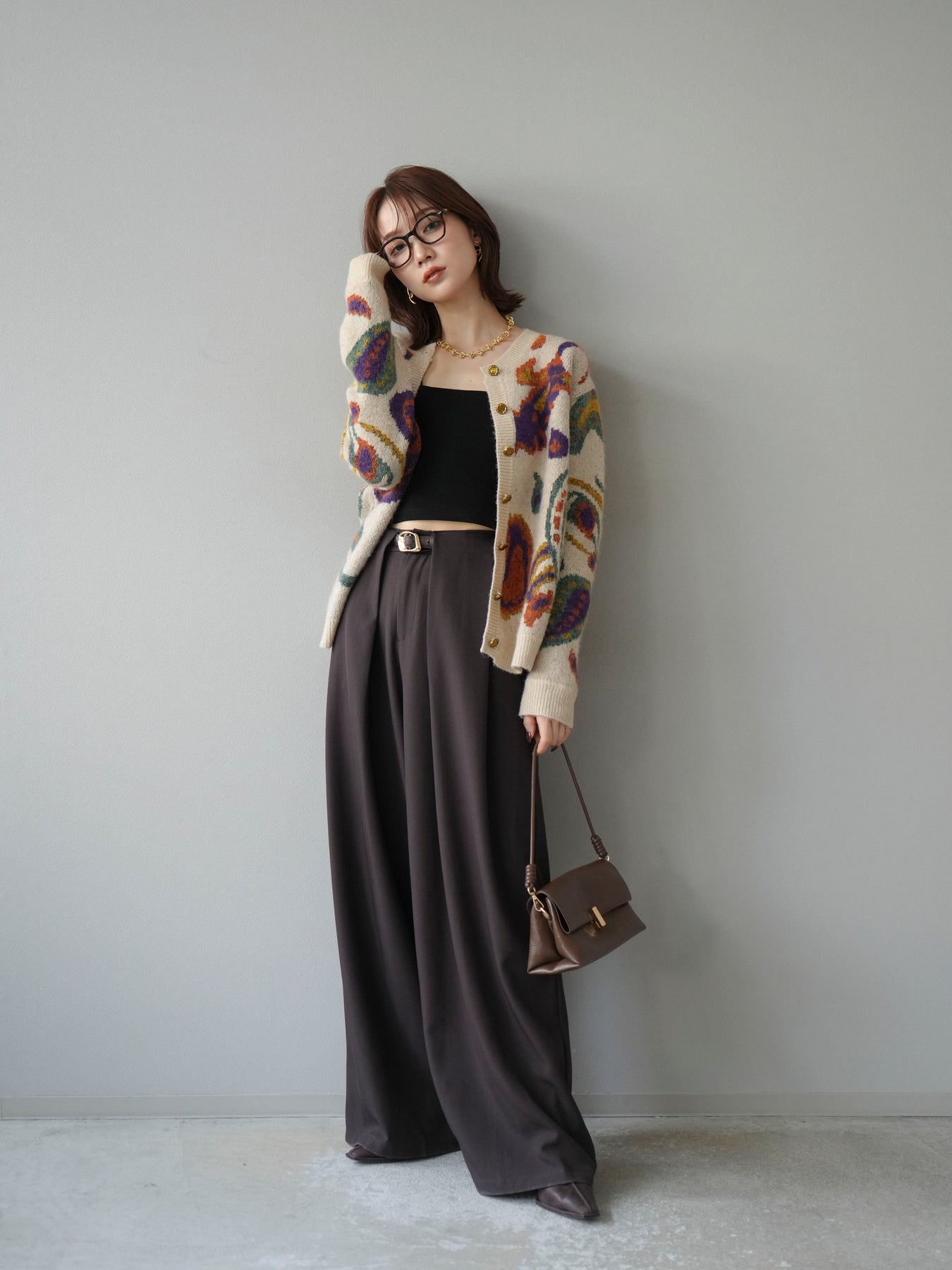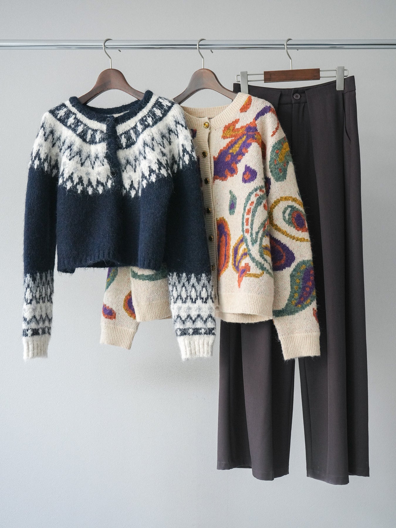【着回しセット】[SET]求心柄クロップドニットカーディガン+ミックスヤーンペイズリー柄ニットカーディガン+ベルトループデザインワイドパンツ(3set)
