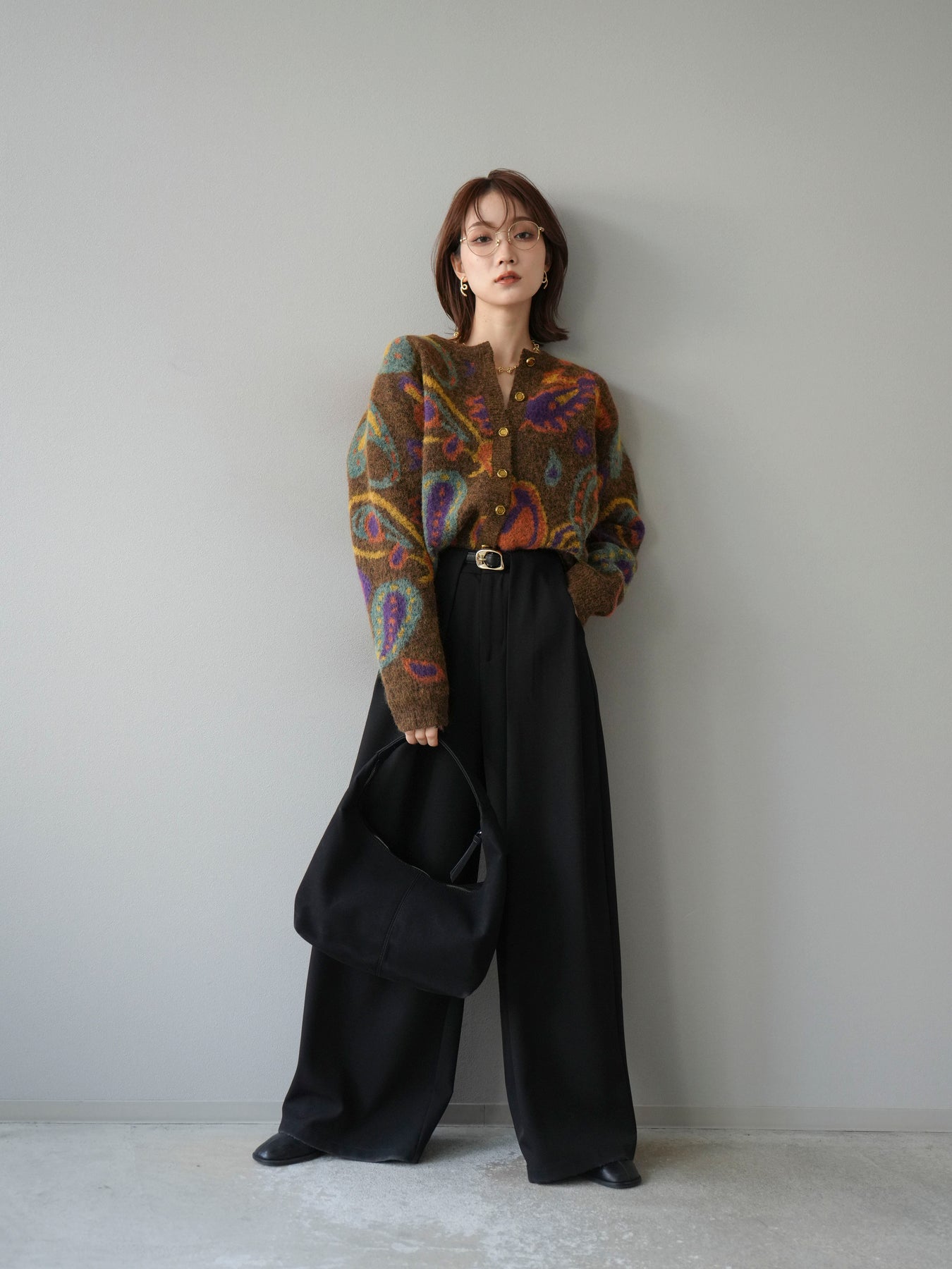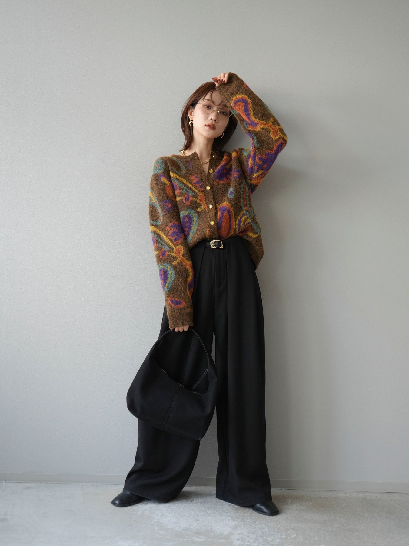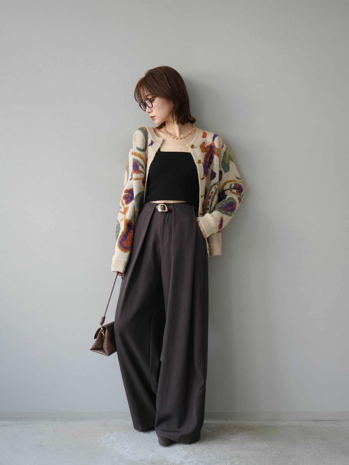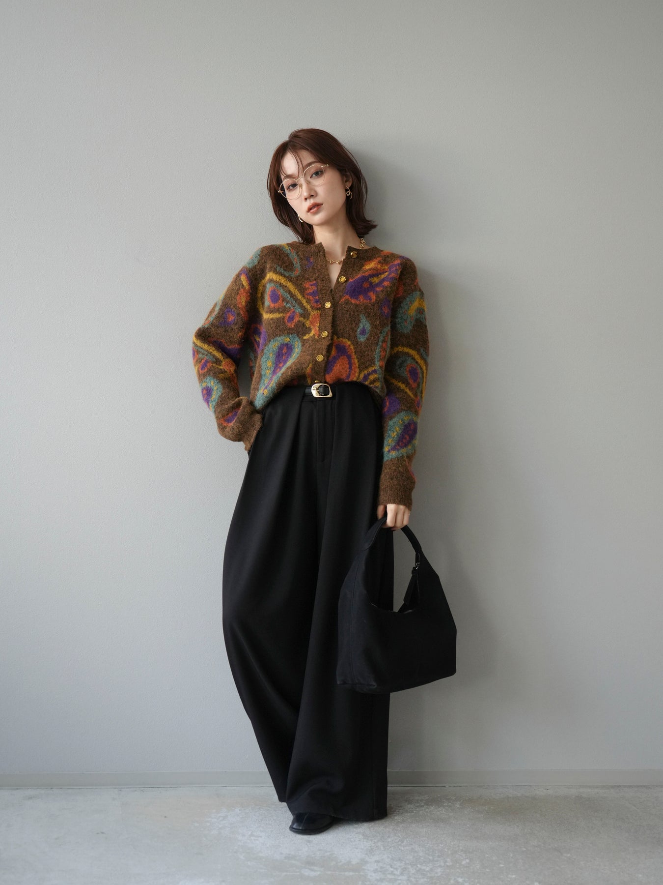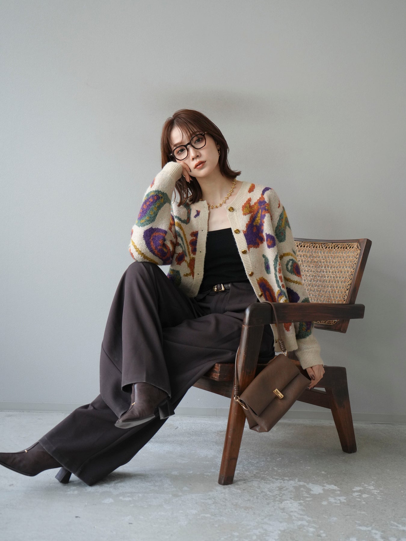 【着回しセット】[SET]求心柄クロップドニットカーディガン+ミックスヤーンペイズリー柄ニットカーディガン+ベルトループデザインワイドパンツ(3set)