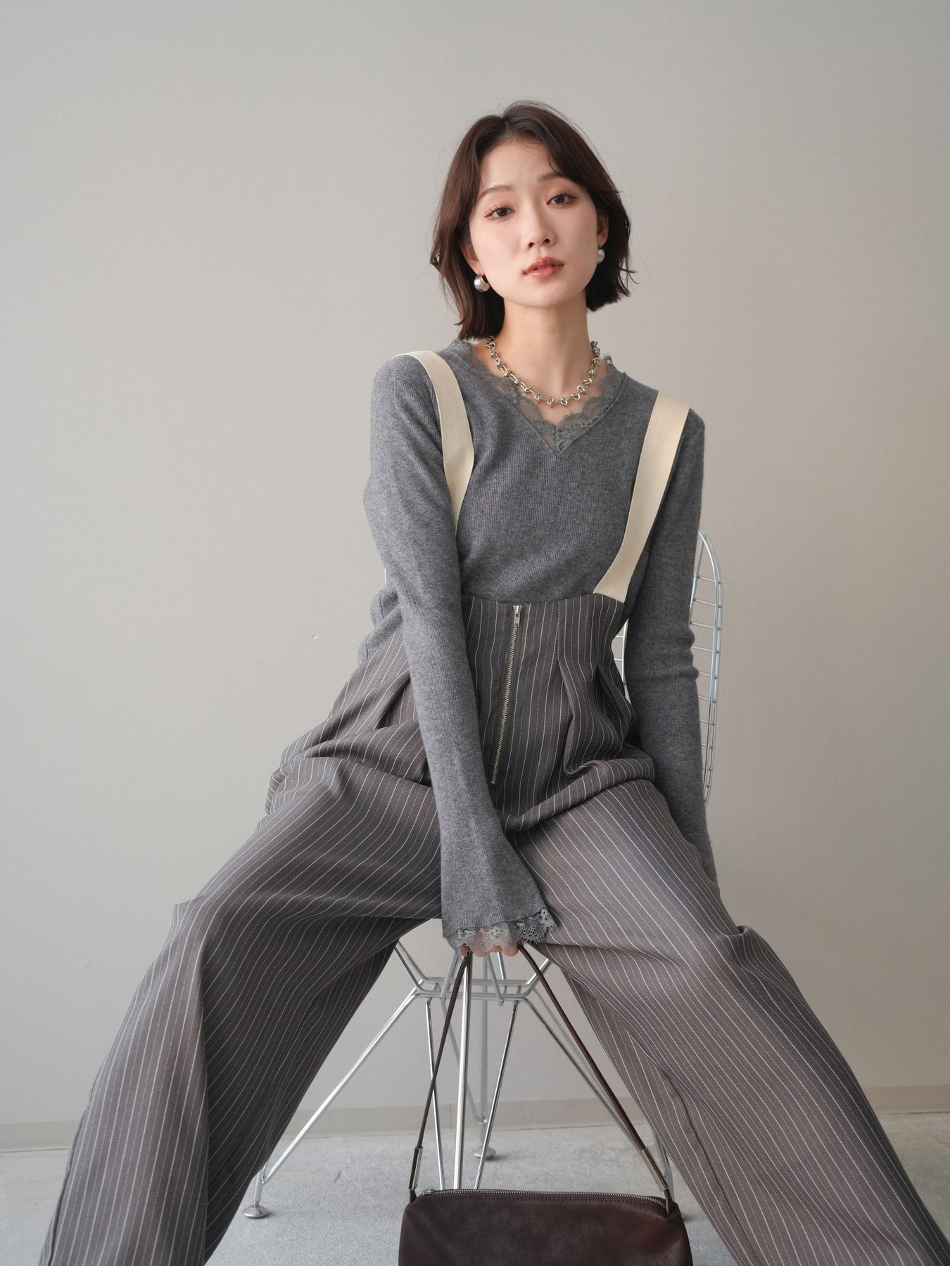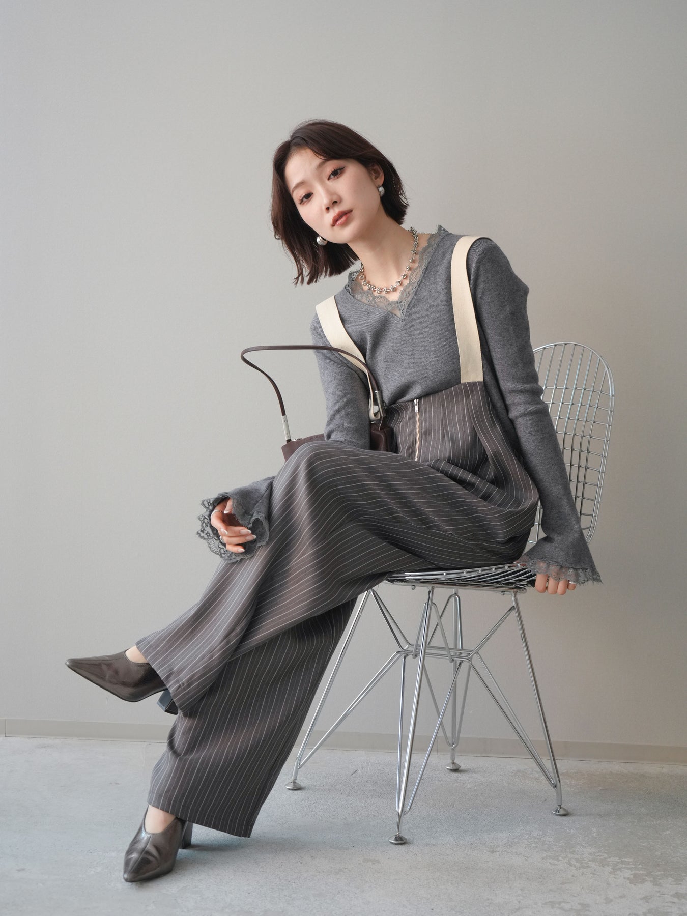繊細なレースを重ねたVネックデザインが、さりげない表情を添えるニットトップス。 首元から覗くレースが上品な抜け感を生み、シンプルながらも印象に残る一枚です。 程よくフィットするシルエットで、ボトムスにインしてもアウトでもバランスよく着用可能。 ニットの柔らかな風合いとレースの軽やかさが調和し、デニムなどのカジュアルなアイテムと合わせても、どこか洗練された雰囲気にまとまります。 一枚着としてはもちろん、ジャケットやカーディガンのインナーとしても活躍するトップスです。 ※ボトムス、キャミソール(インナー)以外の商品は一律でインナーは付属していません。