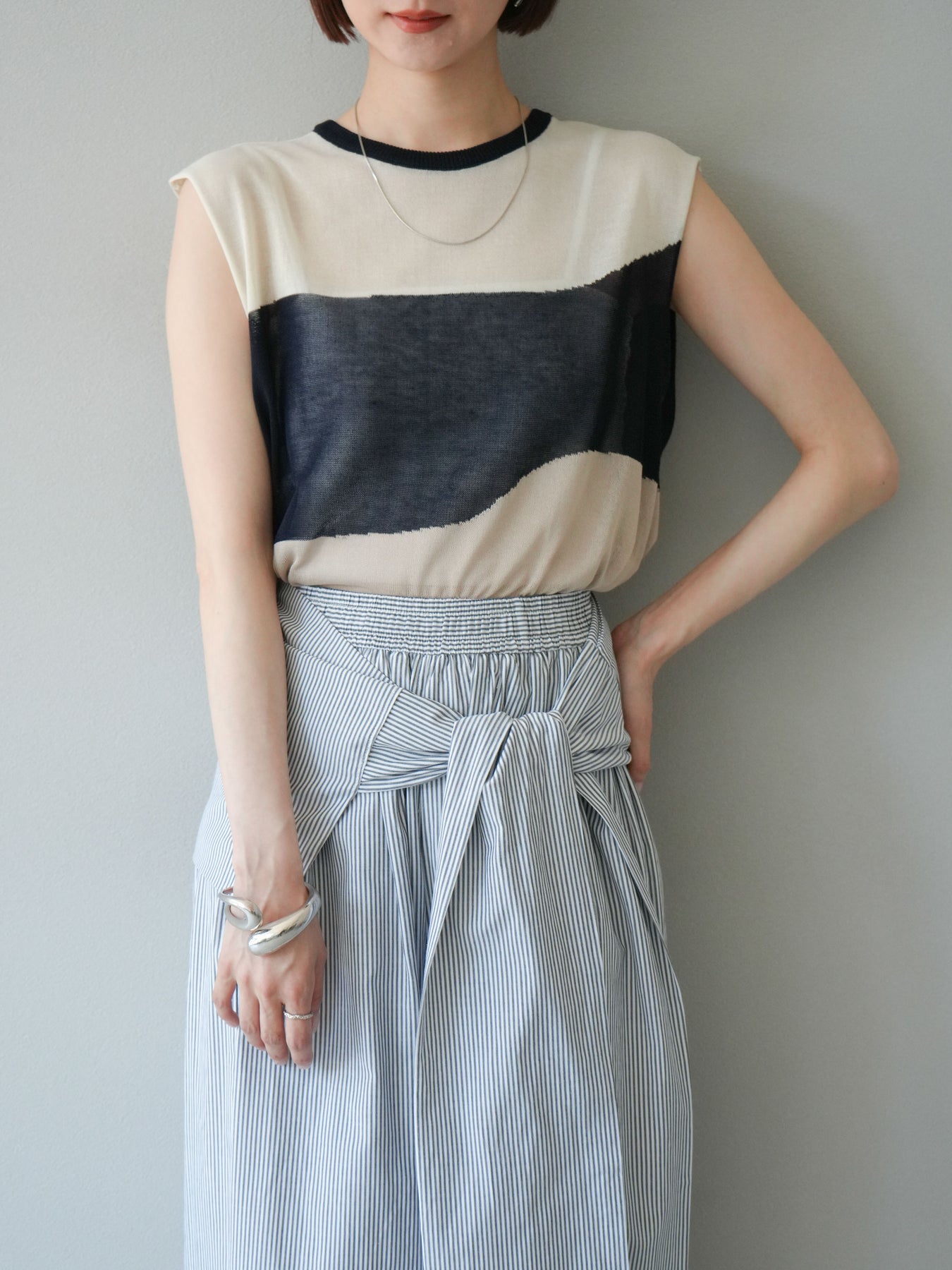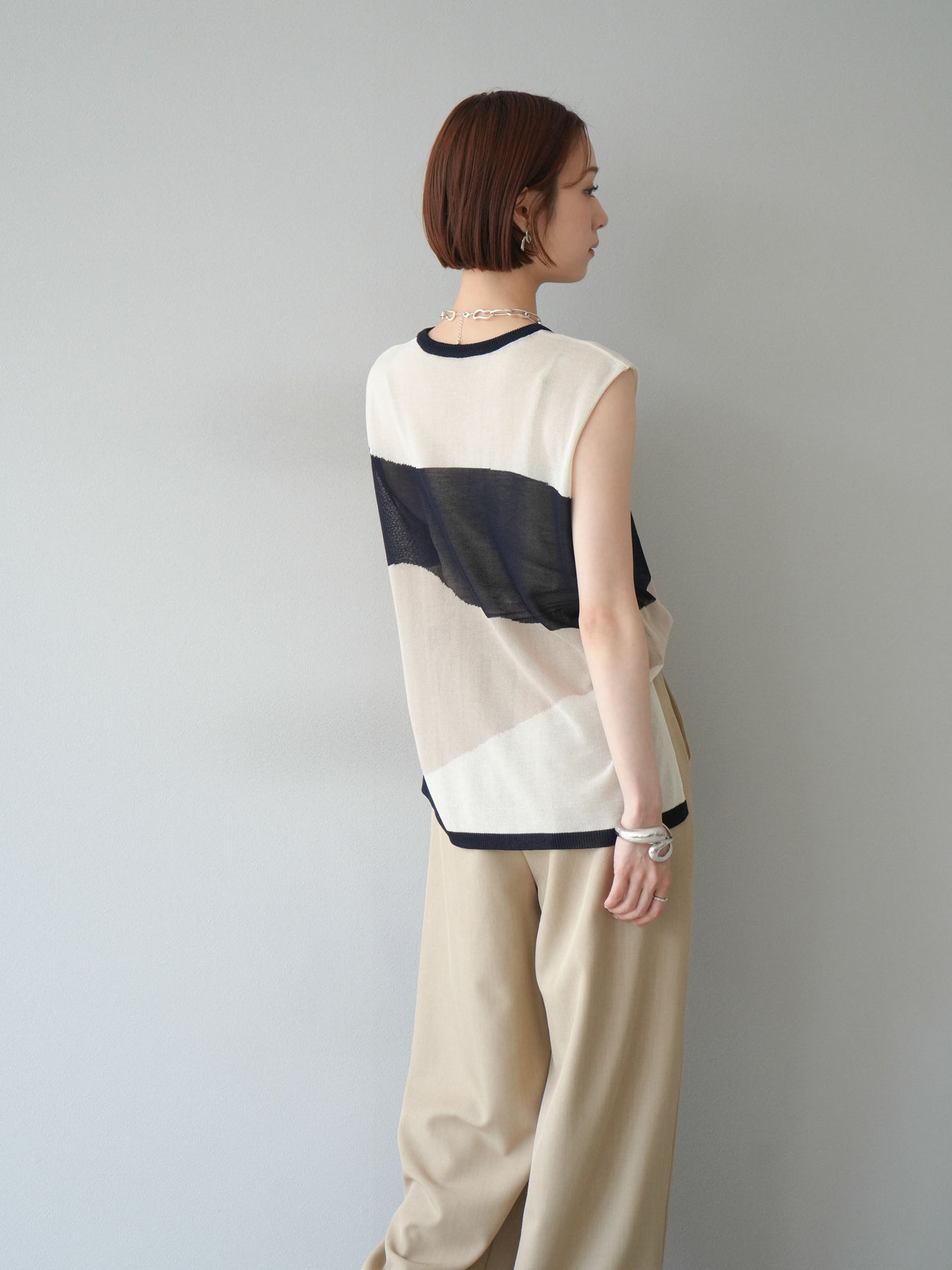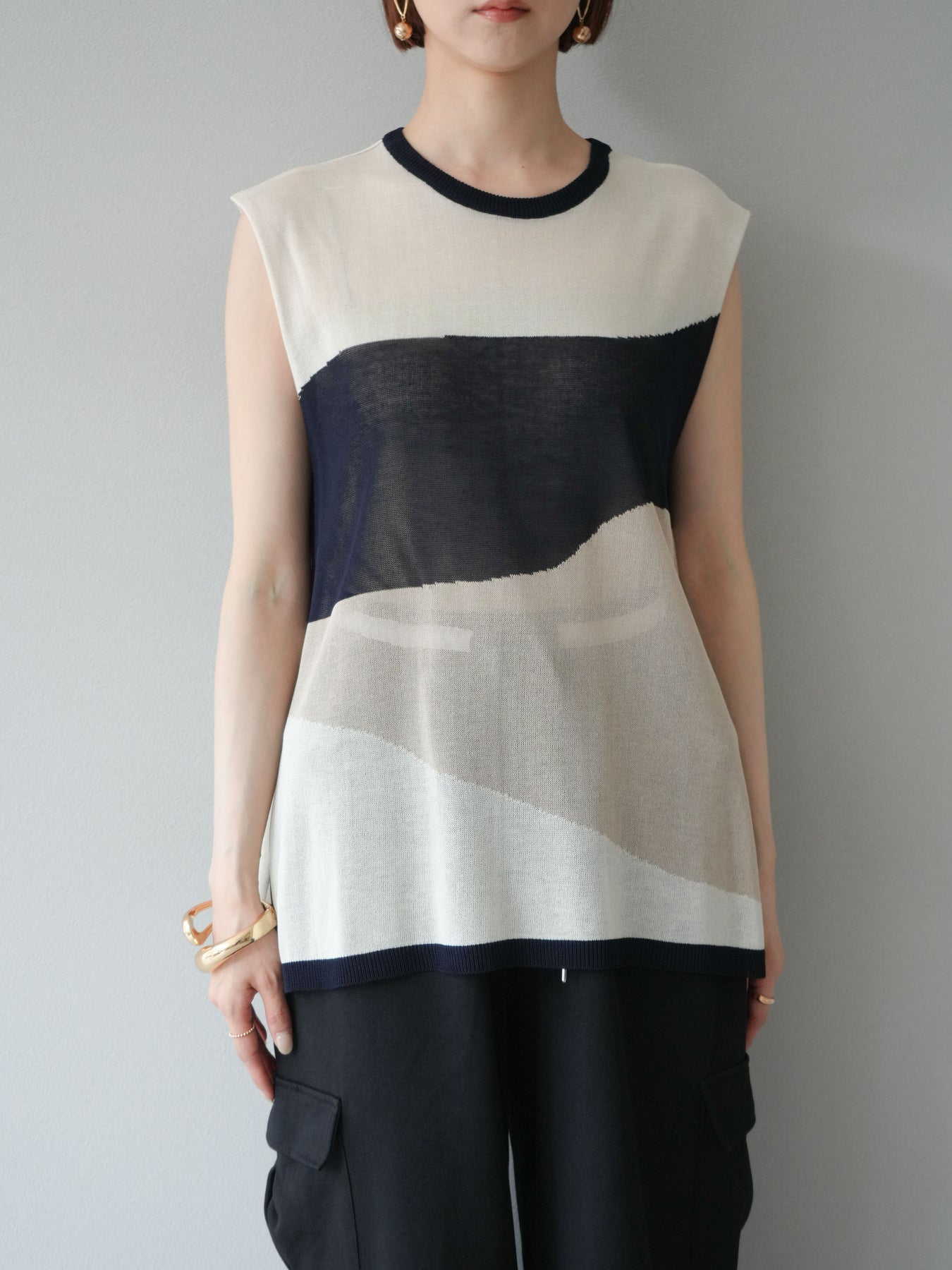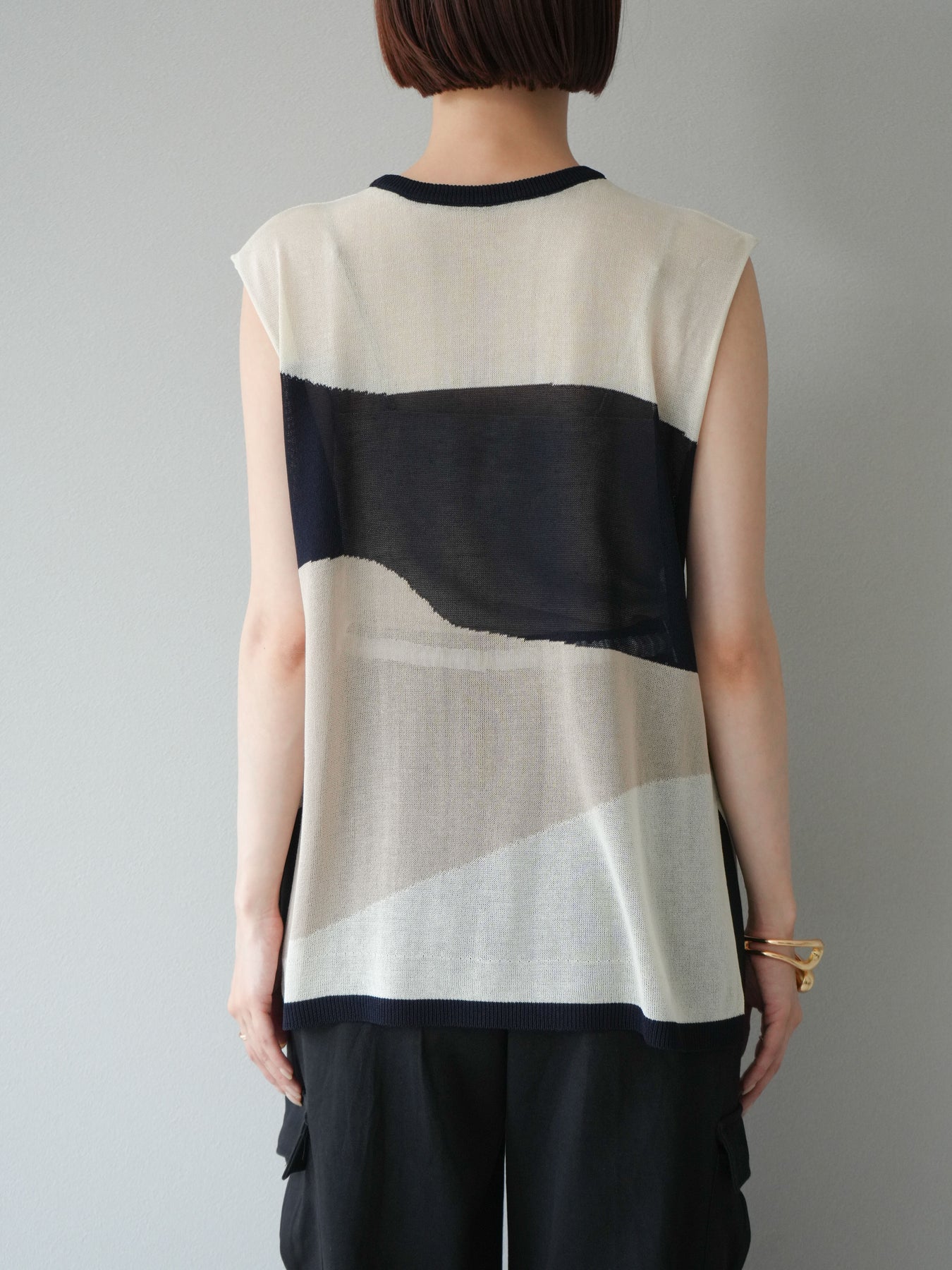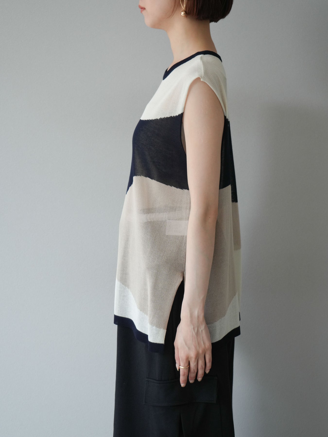 透け感のあるシアーニットと大胆なバイカラーデザインが目を惹く、ノースリーブプルオーバー。柔らかく落ち感のある素材で、身体のラインを拾いすぎず、すっきりとしたシルエットを演出します。裾にかけてやや広がるフレア感が、動きのある軽やかな印象に。インナーにタンクトップやキャミソールを合わせてレイヤードスタイルを楽しむのがおすすめ。モード感のあるデザインながらも、シンプルなボトムスと合わせるだけでスタイリングが完成する主役級トップスです。 ※ボトムス、キャミソール(インナー)以外の商品は一律でインナーは付属していません。