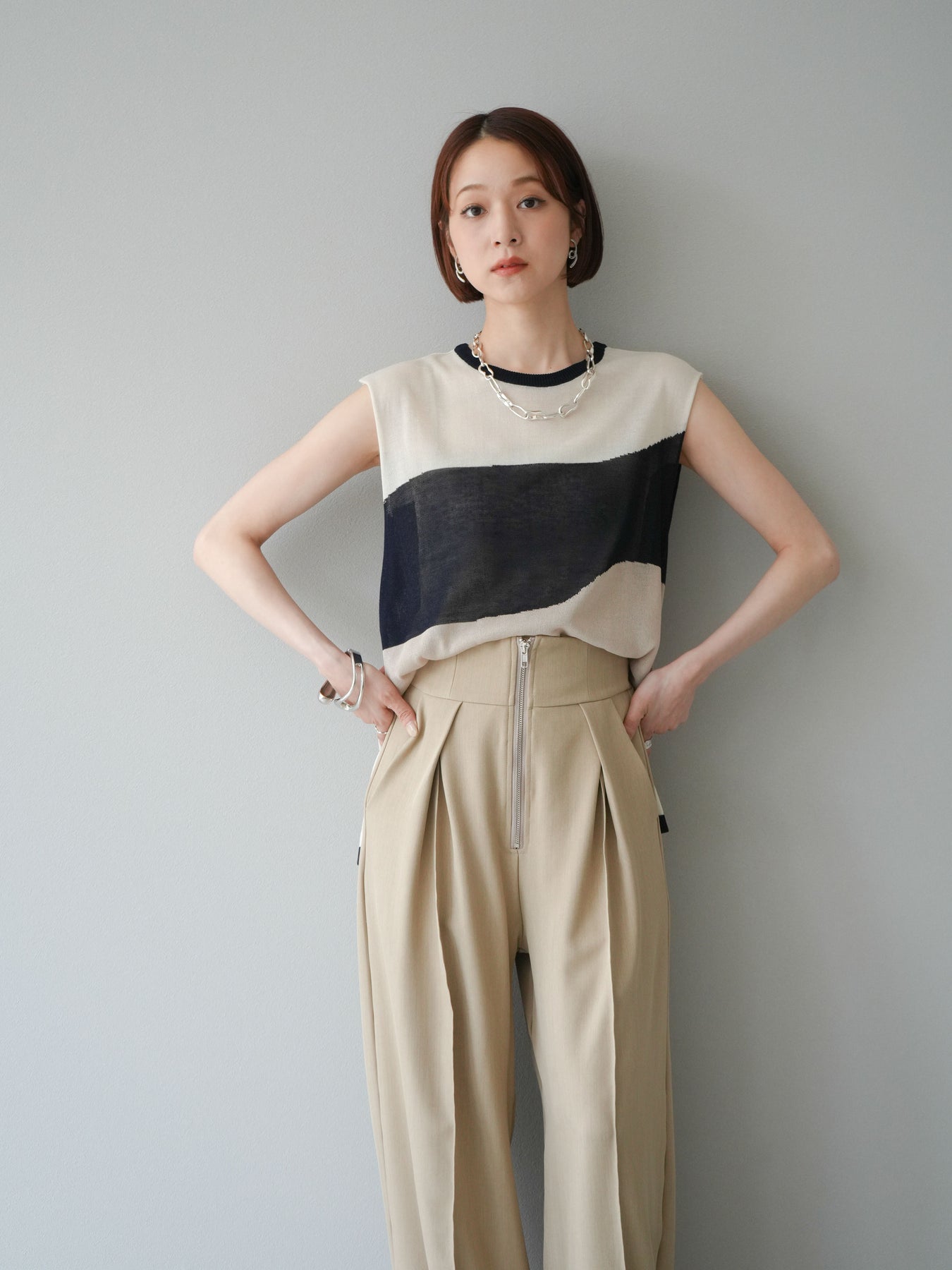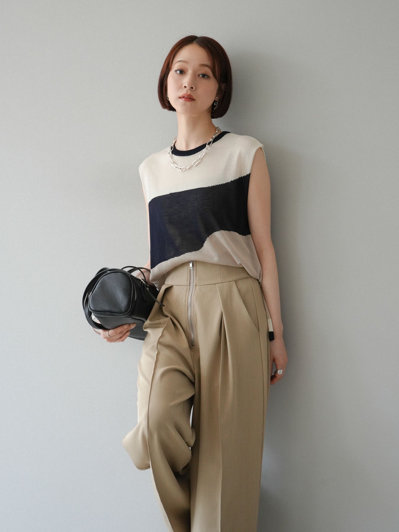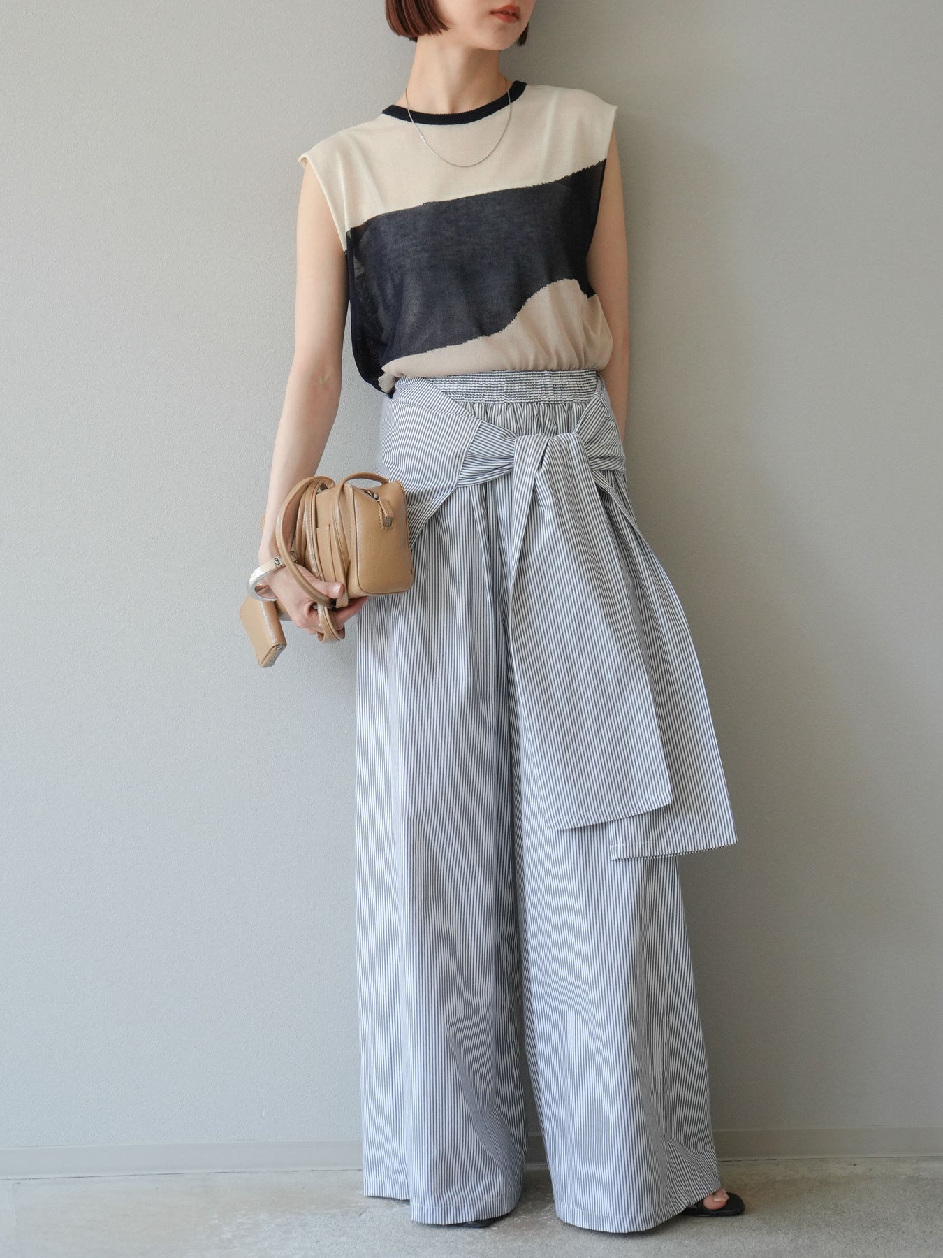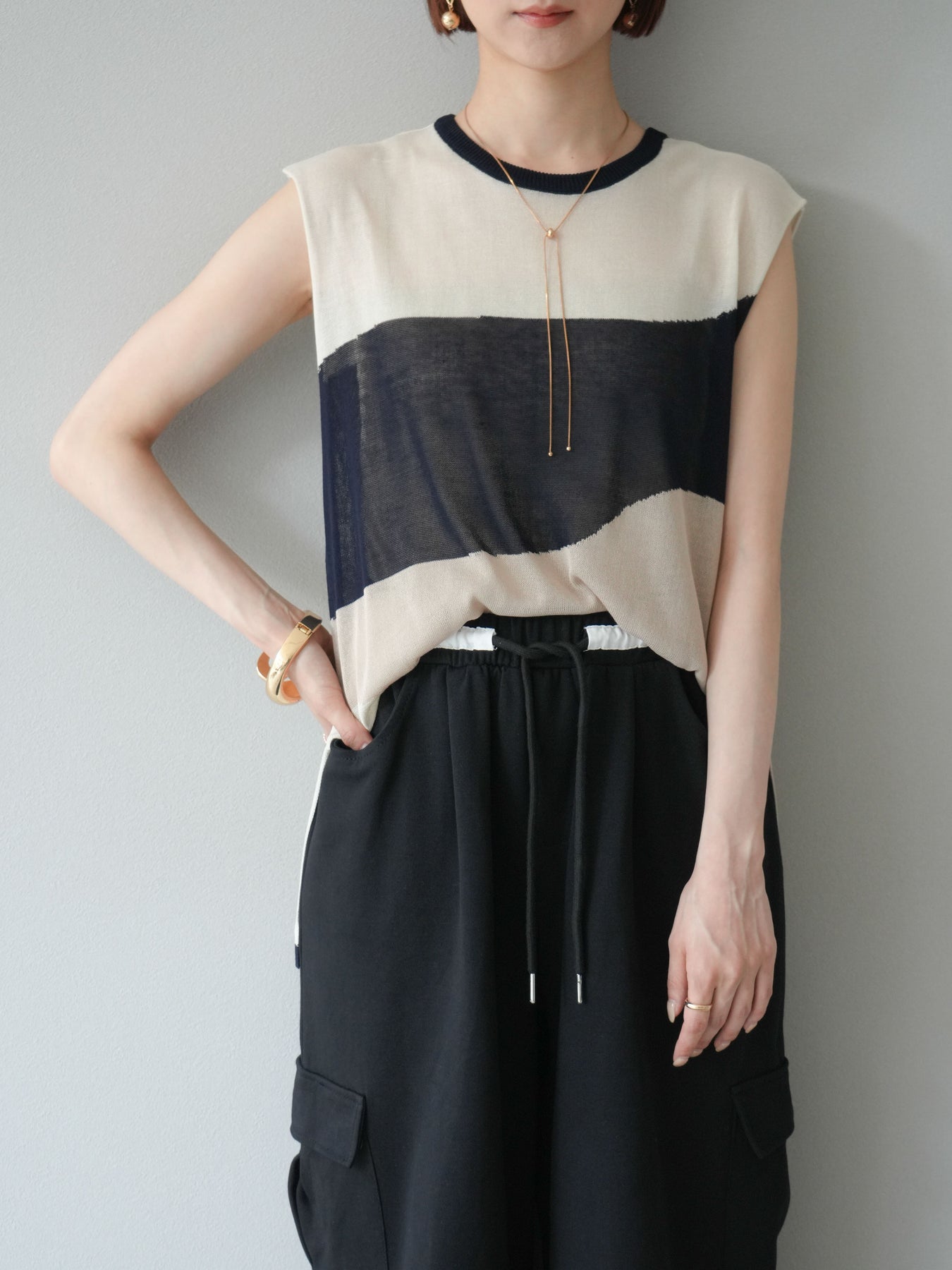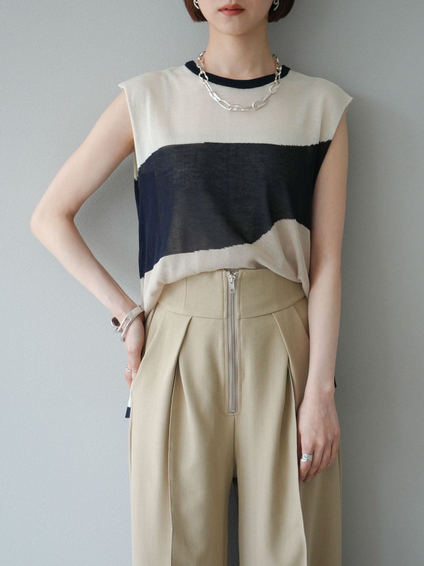 透け感のあるシアーニットと大胆なバイカラーデザインが目を惹く、ノースリーブプルオーバー。柔らかく落ち感のある素材で、身体のラインを拾いすぎず、すっきりとしたシルエットを演出します。裾にかけてやや広がるフレア感が、動きのある軽やかな印象に。インナーにタンクトップやキャミソールを合わせてレイヤードスタイルを楽しむのがおすすめ。モード感のあるデザインながらも、シンプルなボトムスと合わせるだけでスタイリングが完成する主役級トップスです。 ※ボトムス、キャミソール(インナー)以外の商品は一律でインナーは付属していません。