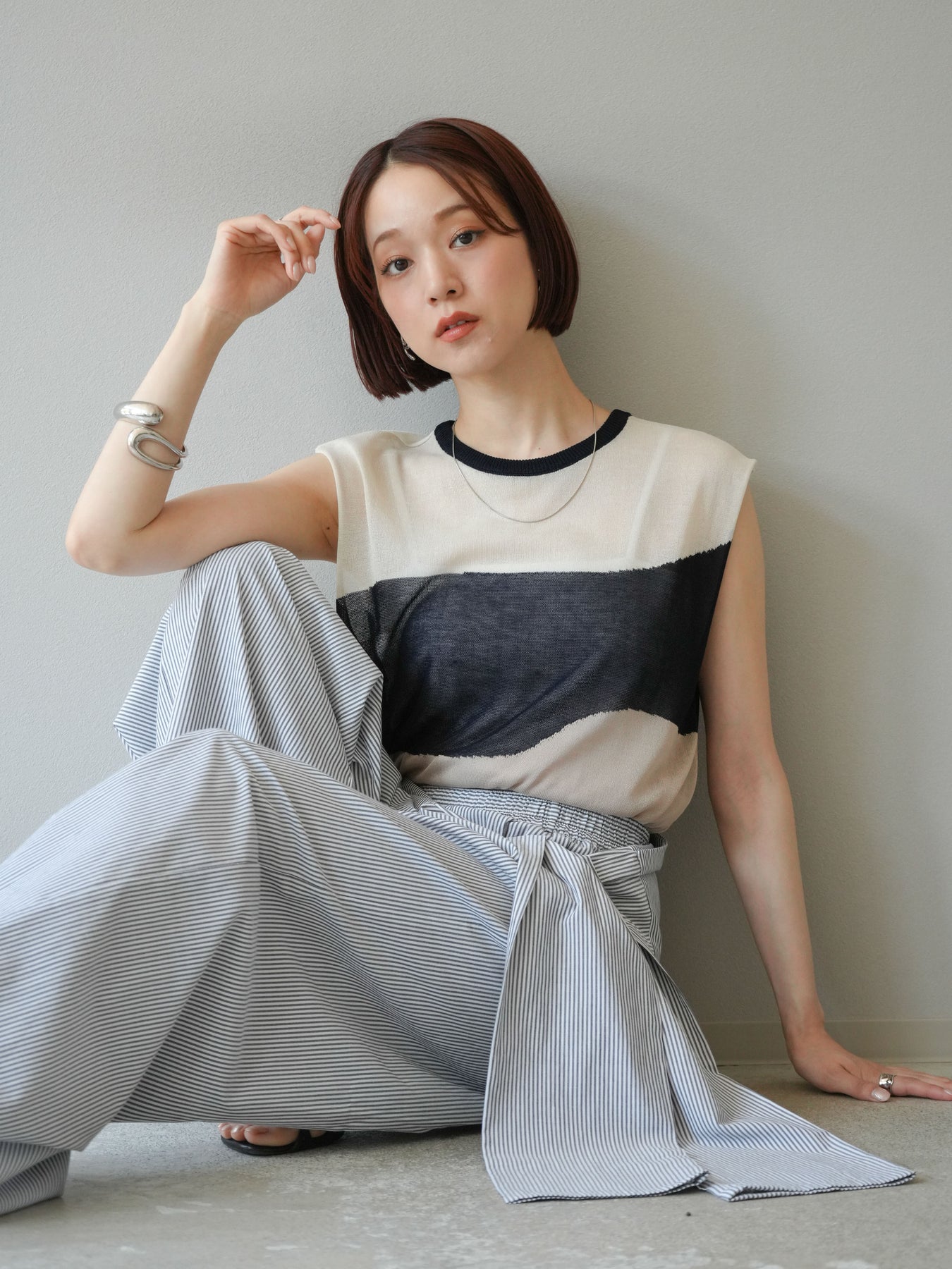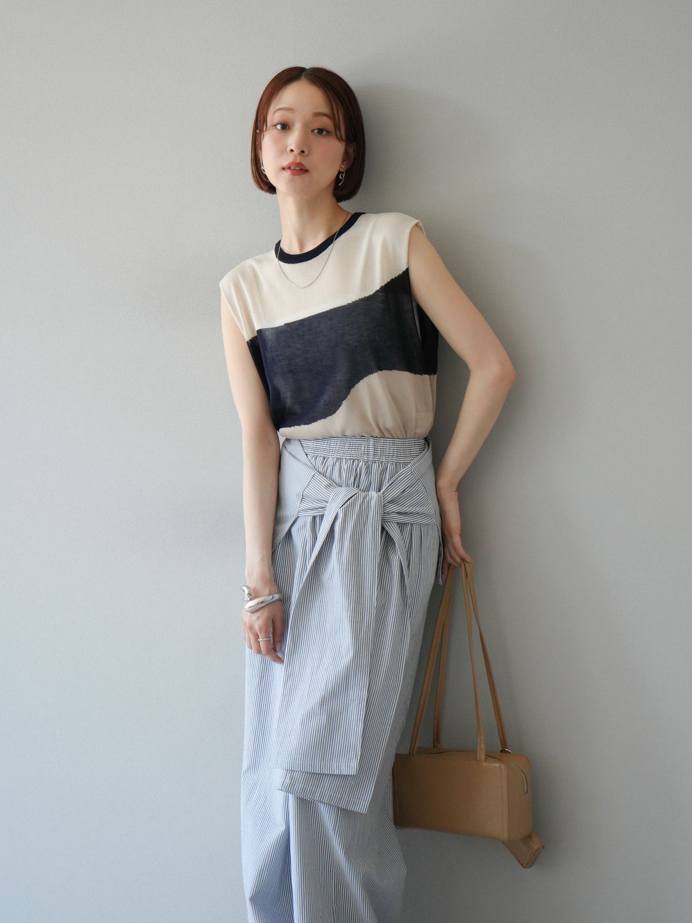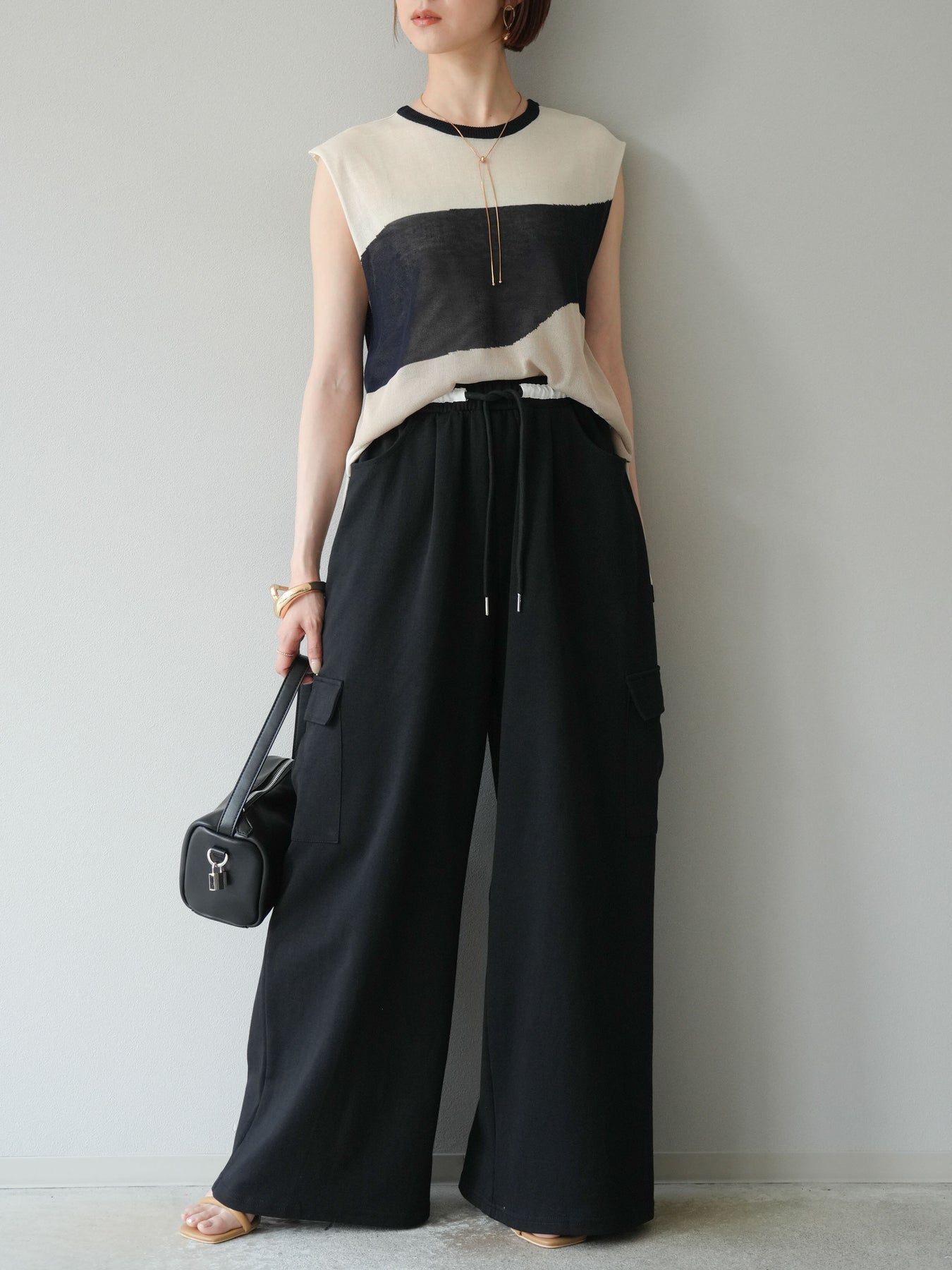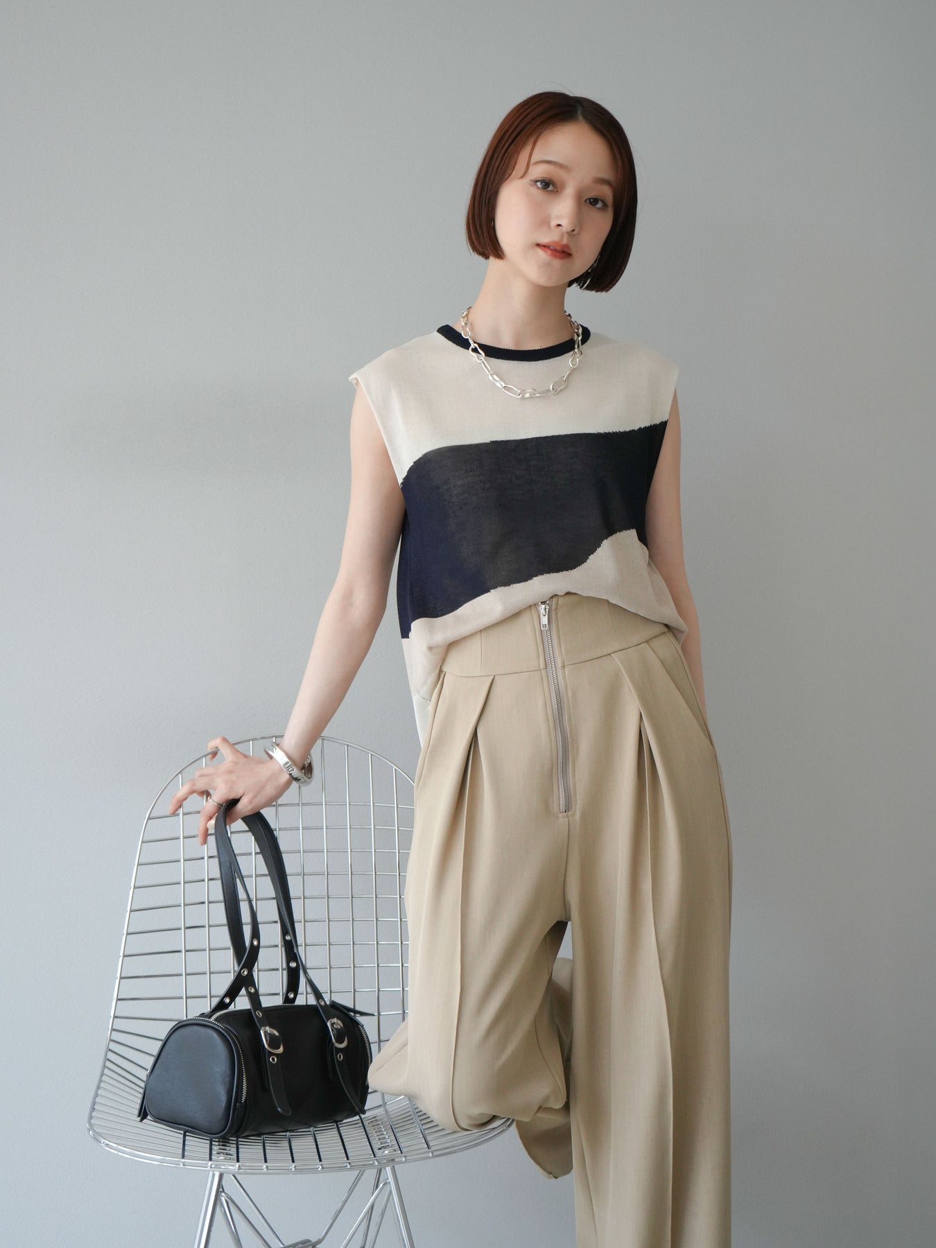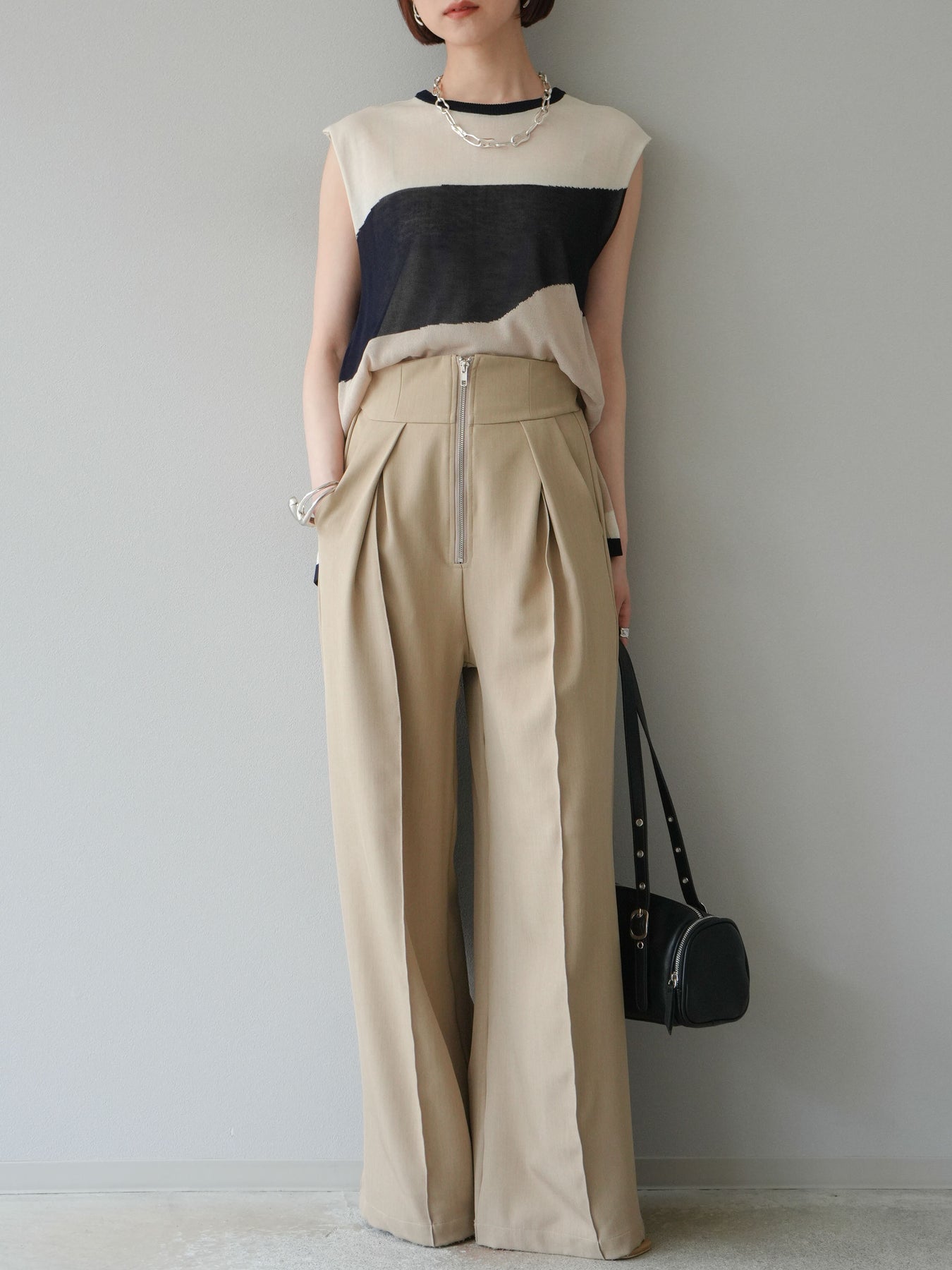 透け感のあるシアーニットと大胆なバイカラーデザインが目を惹く、ノースリーブプルオーバー。柔らかく落ち感のある素材で、身体のラインを拾いすぎず、すっきりとしたシルエットを演出します。裾にかけてやや広がるフレア感が、動きのある軽やかな印象に。インナーにタンクトップやキャミソールを合わせてレイヤードスタイルを楽しむのがおすすめ。モード感のあるデザインながらも、シンプルなボトムスと合わせるだけでスタイリングが完成する主役級トップスです。 ※ボトムス、キャミソール(インナー)以外の商品は一律でインナーは付属していません。
