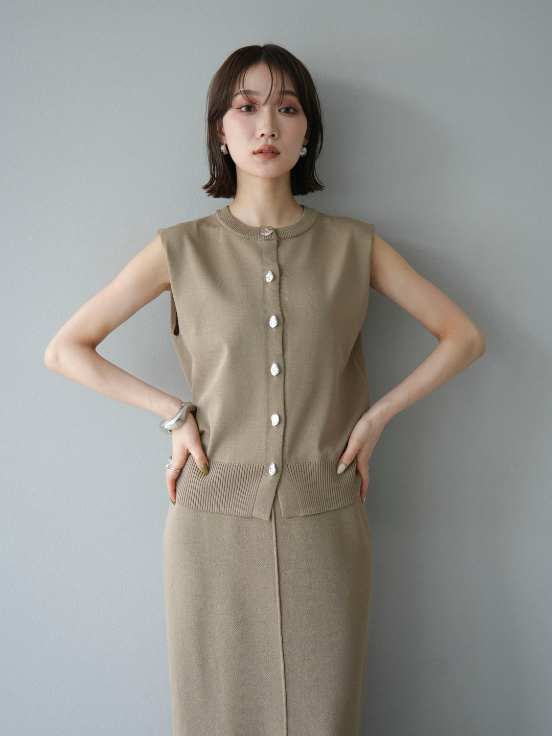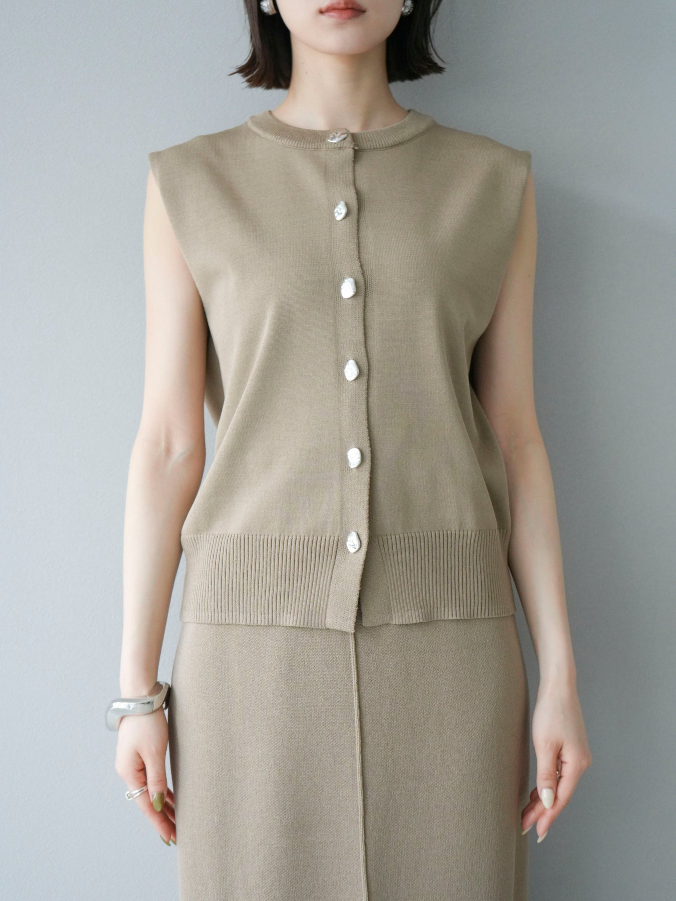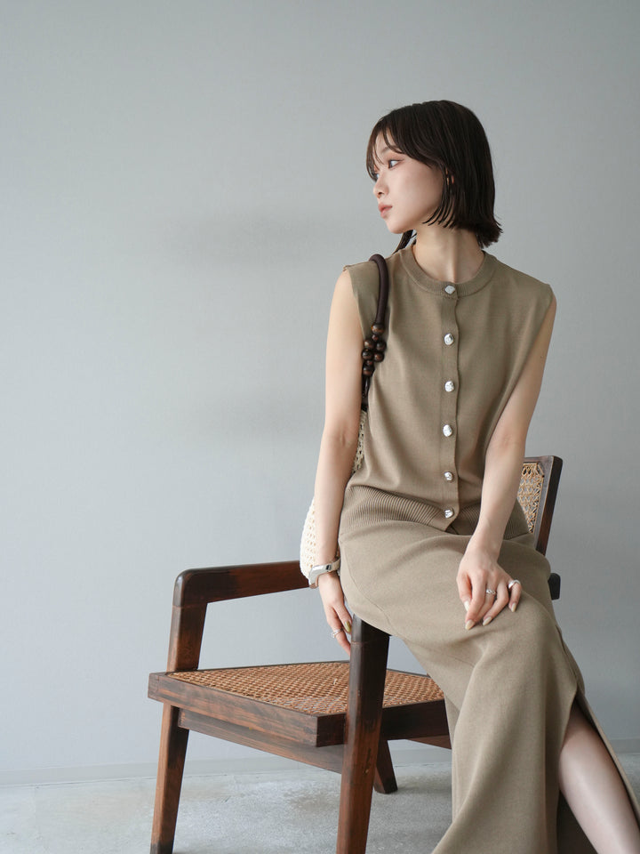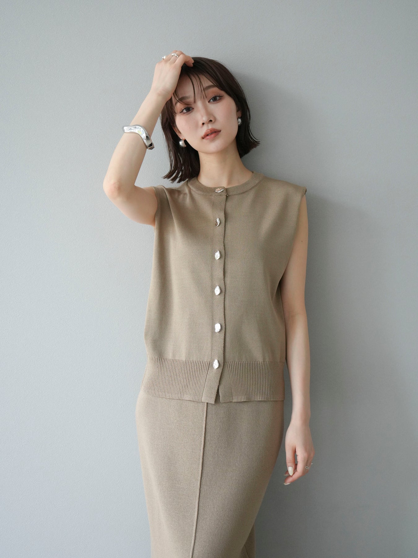 光沢感と滑らかさを兼ね備えたレーヨンポリ素材で仕立てた、上品なノースリーブニットベスト。 シンプルなシルエットに、個性的なデザインボタンが映える大人のための1枚です。 ややコンパクトな丈感で、ワンピースやスカート、ワイドパンツとのレイヤードにも好バランス。 前開き仕様なので羽織りとしても活躍し、季節の変わり目にも重宝します。 ノースリーブながらも程よく肩を覆うカッティングで、二の腕周りも気になりにくいデザイン。 きれいめからカジュアルまで、幅広いコーディネートに取り入れやすい万能アイテムです。