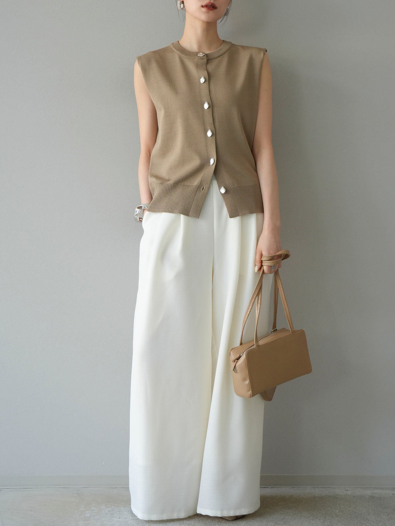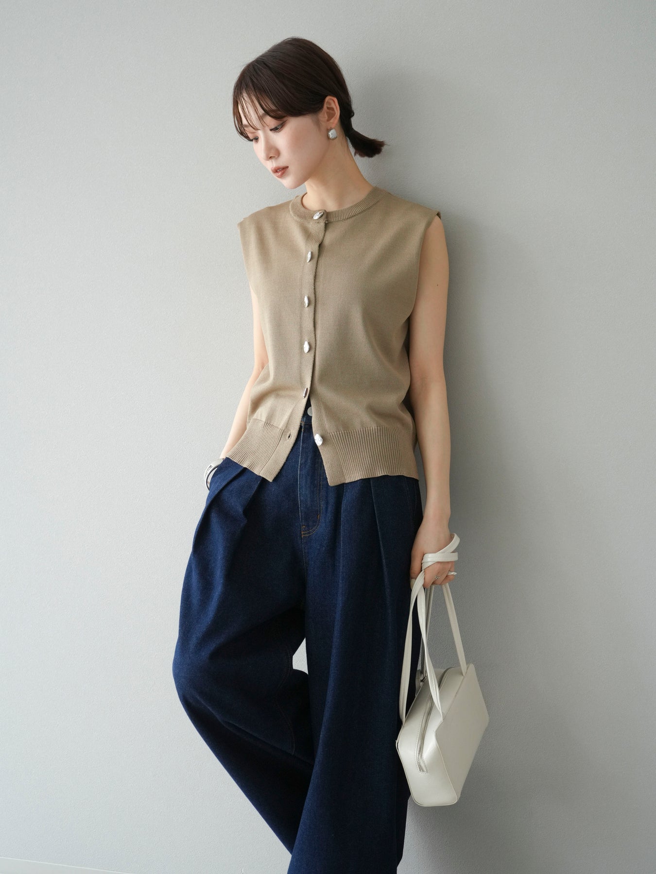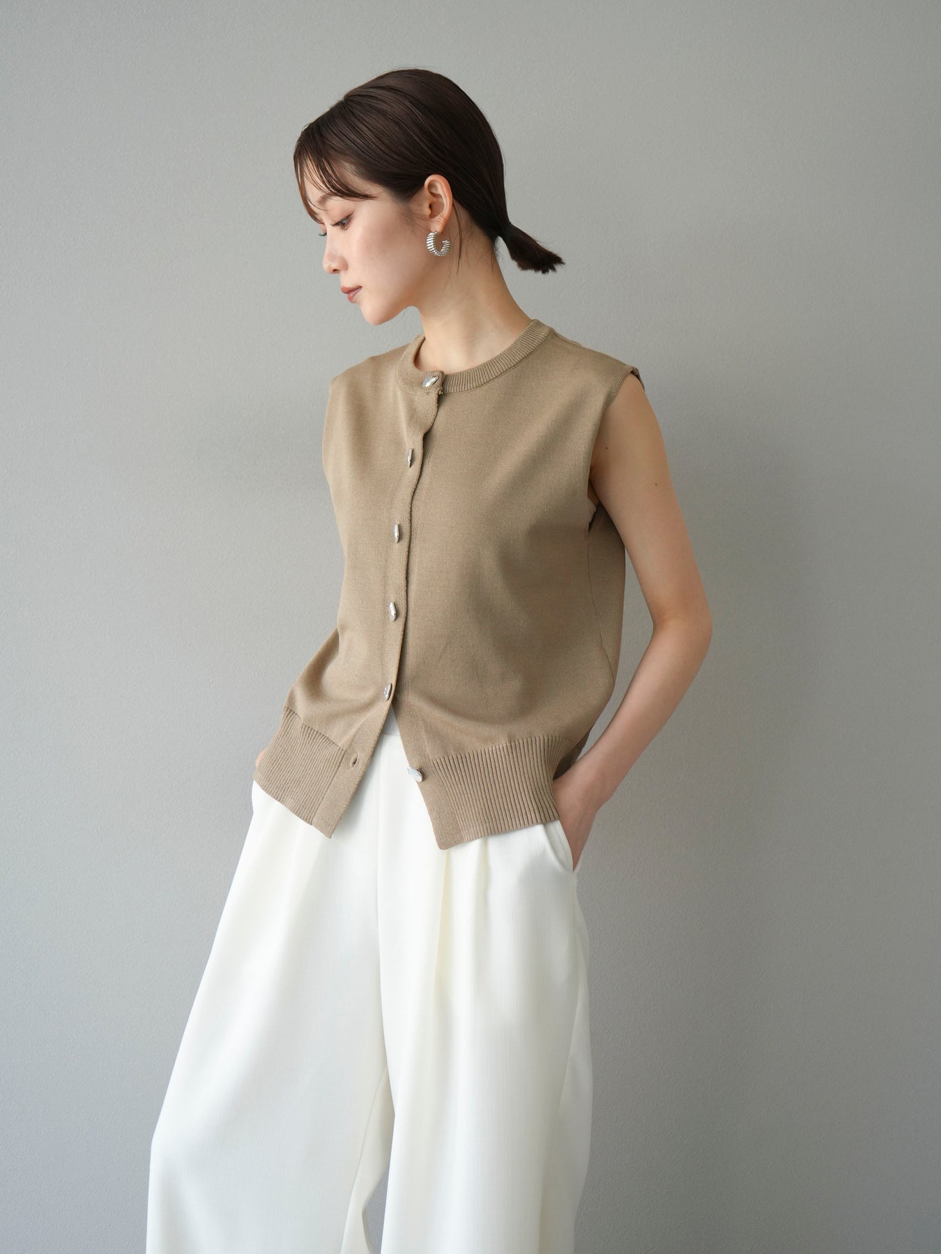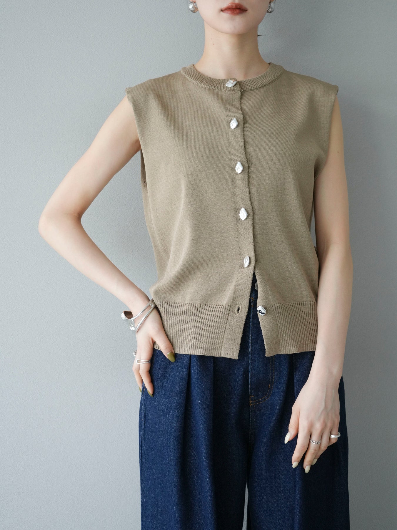 光沢感と滑らかさを兼ね備えたレーヨンポリ素材で仕立てた、上品なノースリーブニットベスト。 シンプルなシルエットに、個性的なデザインボタンが映える大人のための1枚です。 ややコンパクトな丈感で、ワンピースやスカート、ワイドパンツとのレイヤードにも好バランス。 前開き仕様なので羽織りとしても活躍し、季節の変わり目にも重宝します。 ノースリーブながらも程よく肩を覆うカッティングで、二の腕周りも気になりにくいデザイン。 きれいめからカジュアルまで、幅広いコーディネートに取り入れやすい万能アイテムです。