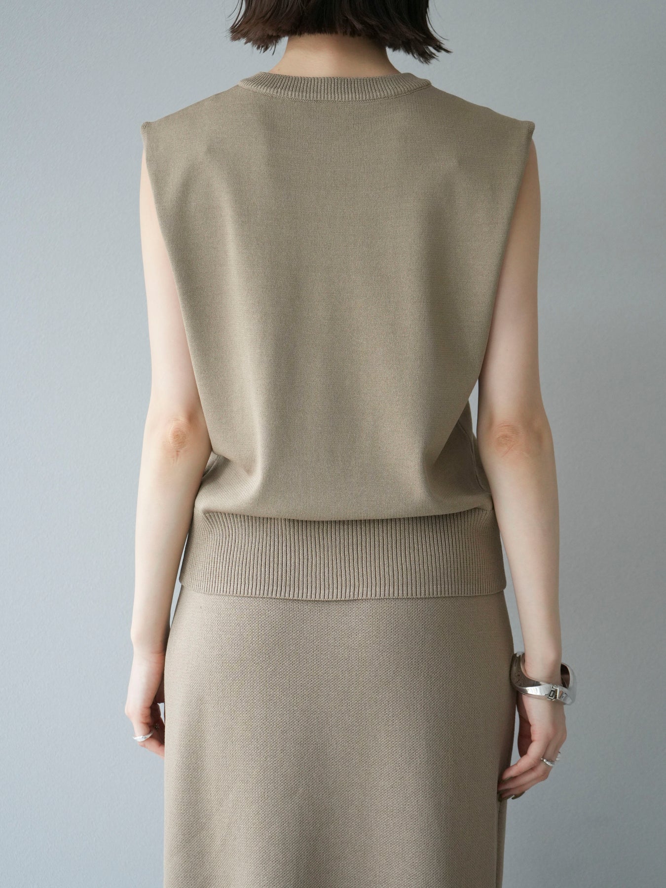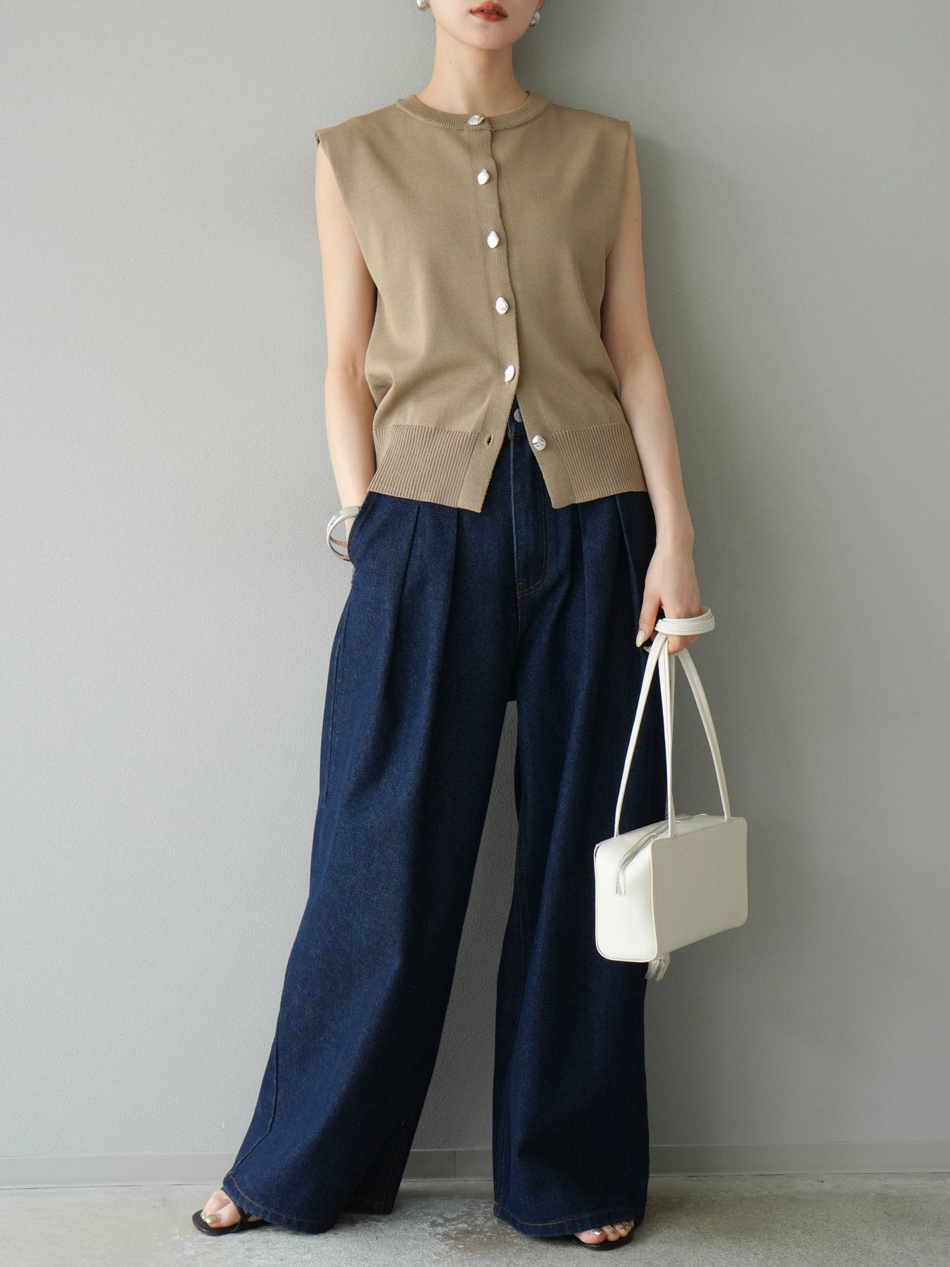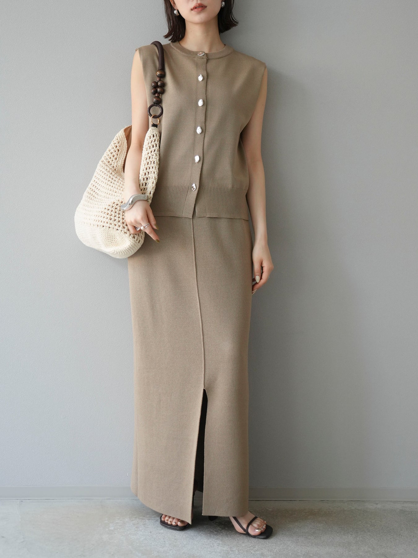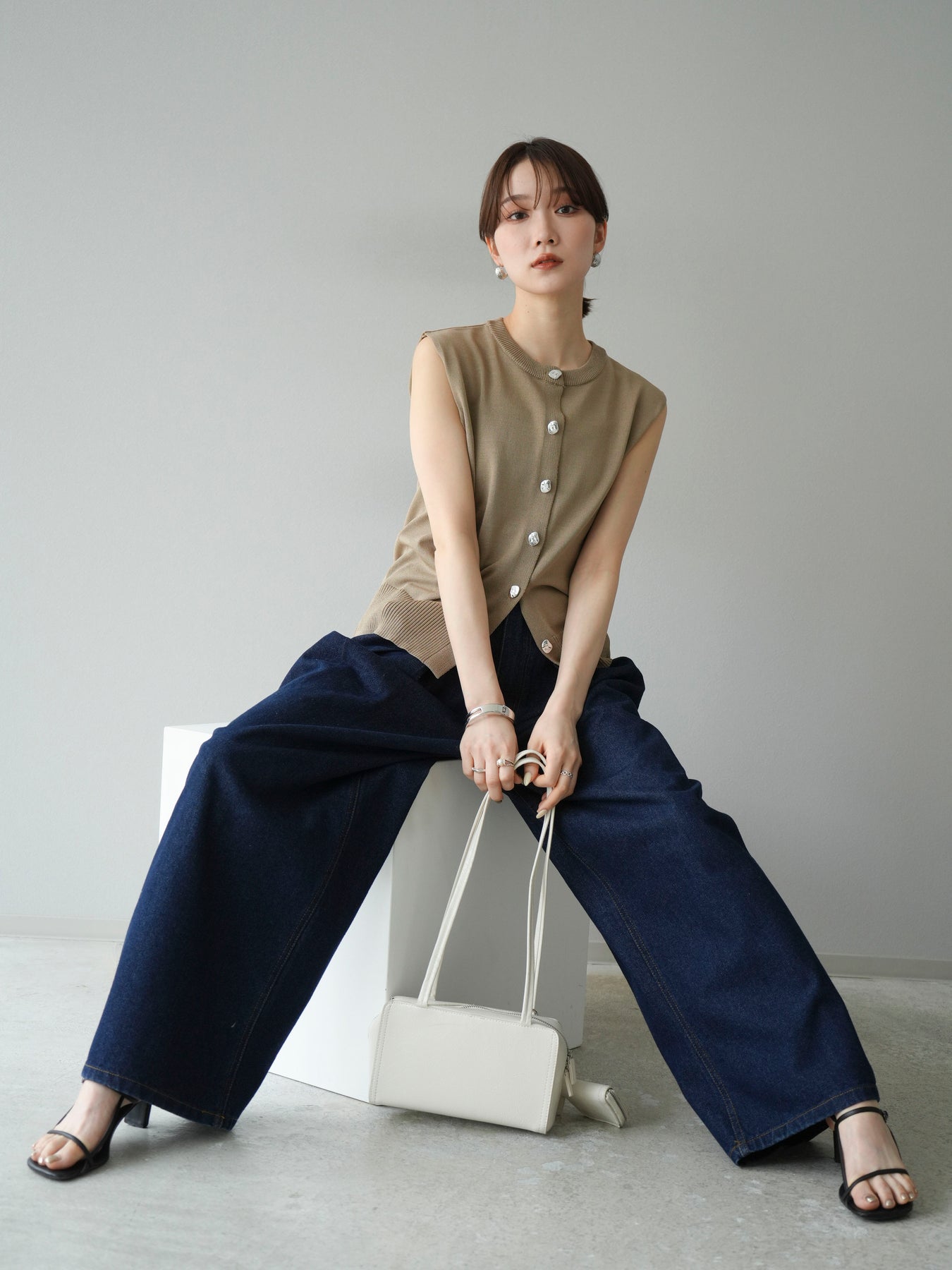 光沢感と滑らかさを兼ね備えたレーヨンポリ素材で仕立てた、上品なノースリーブニットベスト。 シンプルなシルエットに、個性的なデザインボタンが映える大人のための1枚です。 ややコンパクトな丈感で、ワンピースやスカート、ワイドパンツとのレイヤードにも好バランス。 前開き仕様なので羽織りとしても活躍し、季節の変わり目にも重宝します。 ノースリーブながらも程よく肩を覆うカッティングで、二の腕周りも気になりにくいデザイン。 きれいめからカジュアルまで、幅広いコーディネートに取り入れやすい万能アイテムです。