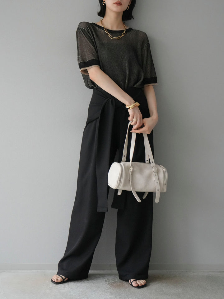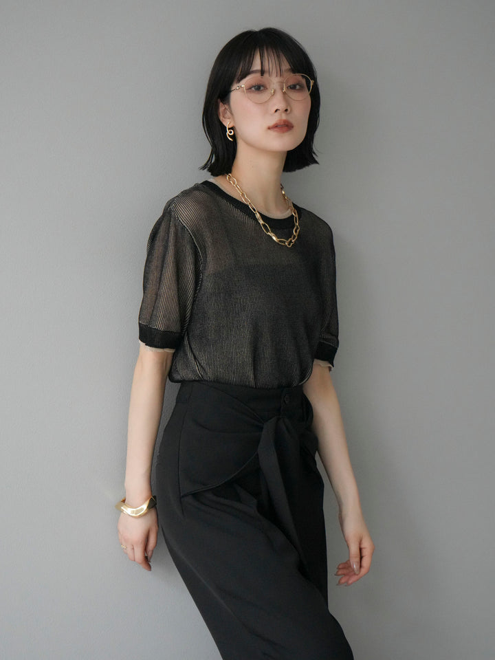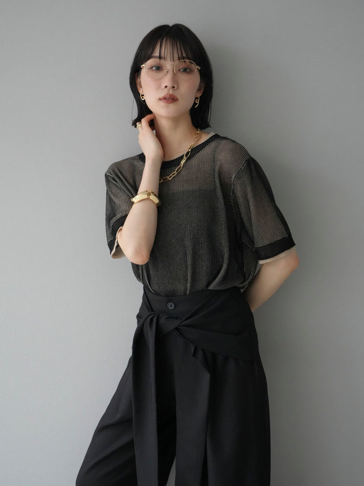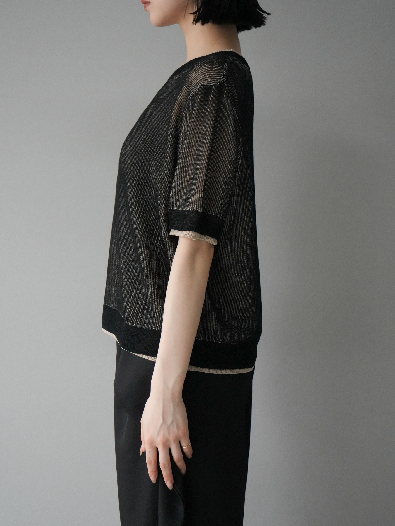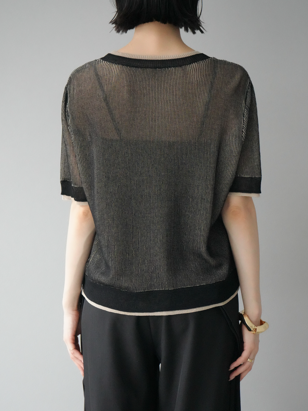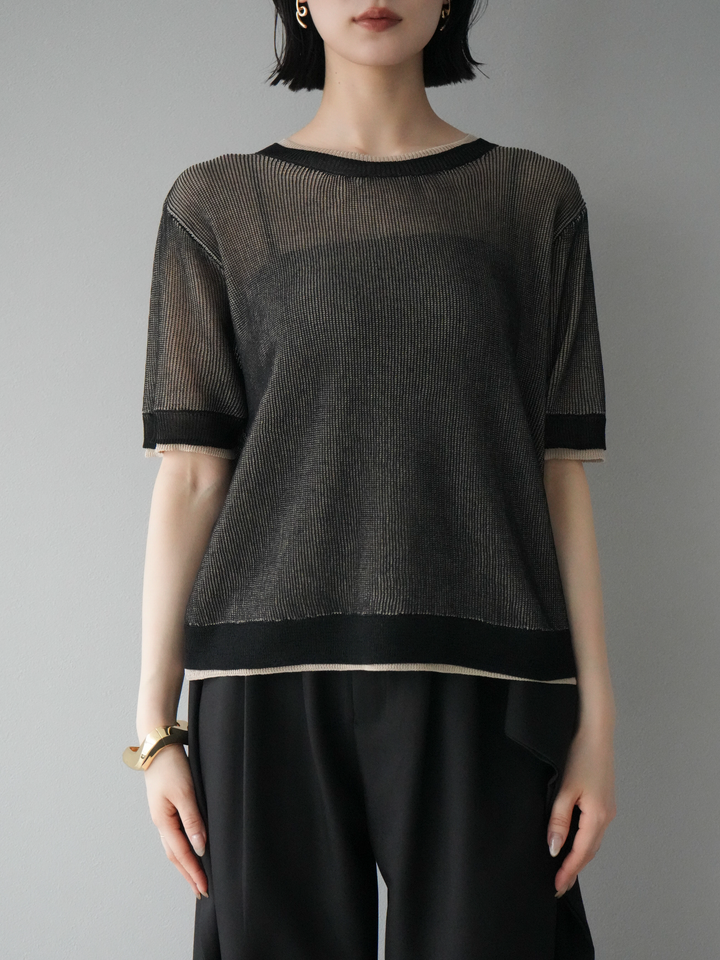 軽やかなリネンタッチ素材で仕立てた、配色デザインが目を引くハーフニットトップス。二重臼編みの繊細な透け感が、トレンド感のあるレイヤードスタイルを演出します。さらっとしたタッチと程よいシアー感で、夏の着こなしを涼しげにアップデート。裾や袖口の配色ラインがアクセントとなり、シンプルなボトムスと合わせるだけで旬のコーデが完成します。 ※ボトムス、キャミソール(インナー)以外の商品は一律でインナーは付属していません