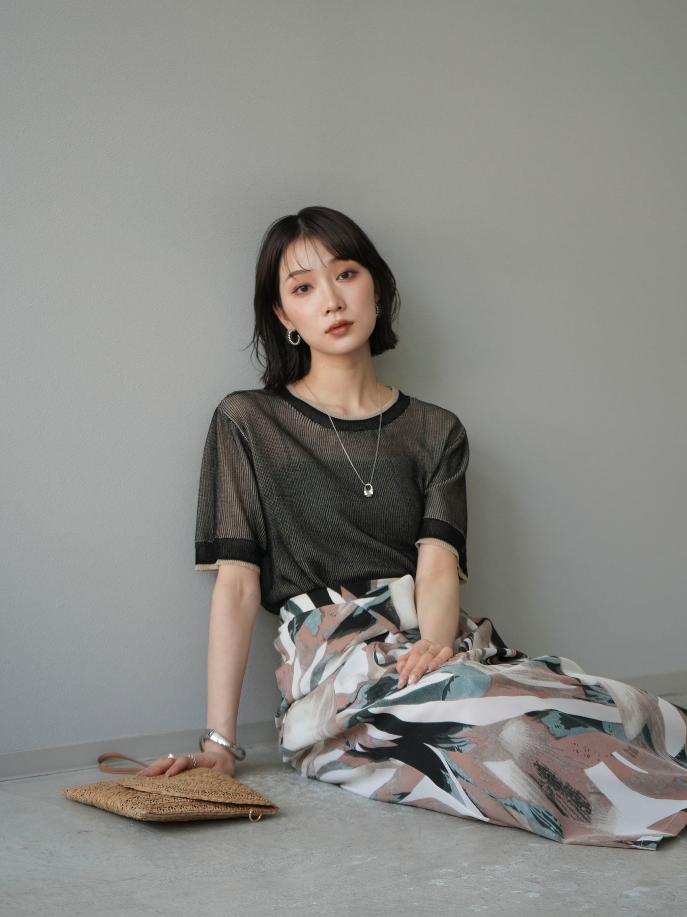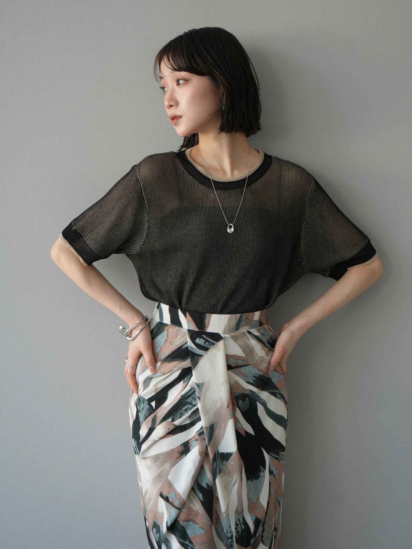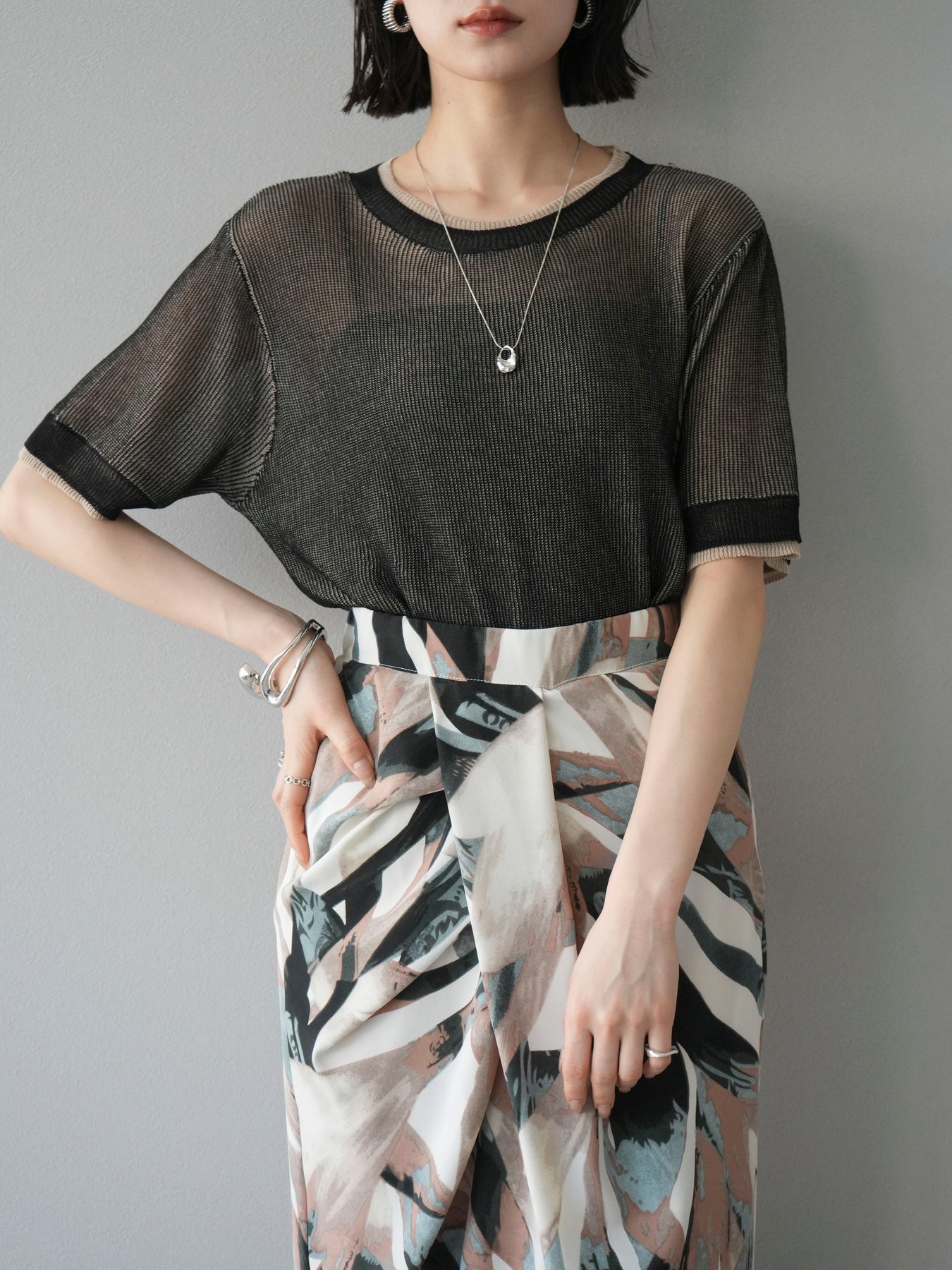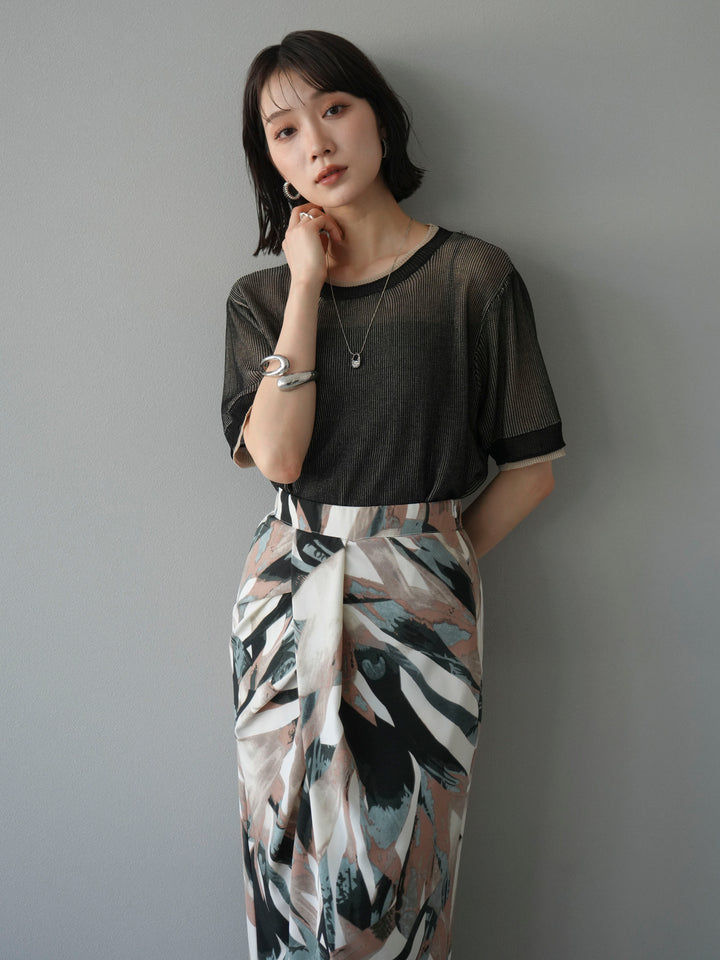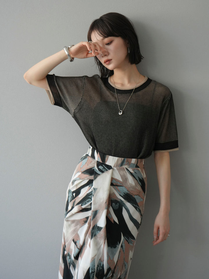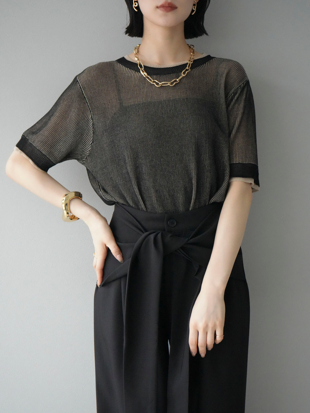 軽やかなリネンタッチ素材で仕立てた、配色デザインが目を引くハーフニットトップス。二重臼編みの繊細な透け感が、トレンド感のあるレイヤードスタイルを演出します。さらっとしたタッチと程よいシアー感で、夏の着こなしを涼しげにアップデート。裾や袖口の配色ラインがアクセントとなり、シンプルなボトムスと合わせるだけで旬のコーデが完成します。 ※ボトムス、キャミソール(インナー)以外の商品は一律でインナーは付属していません