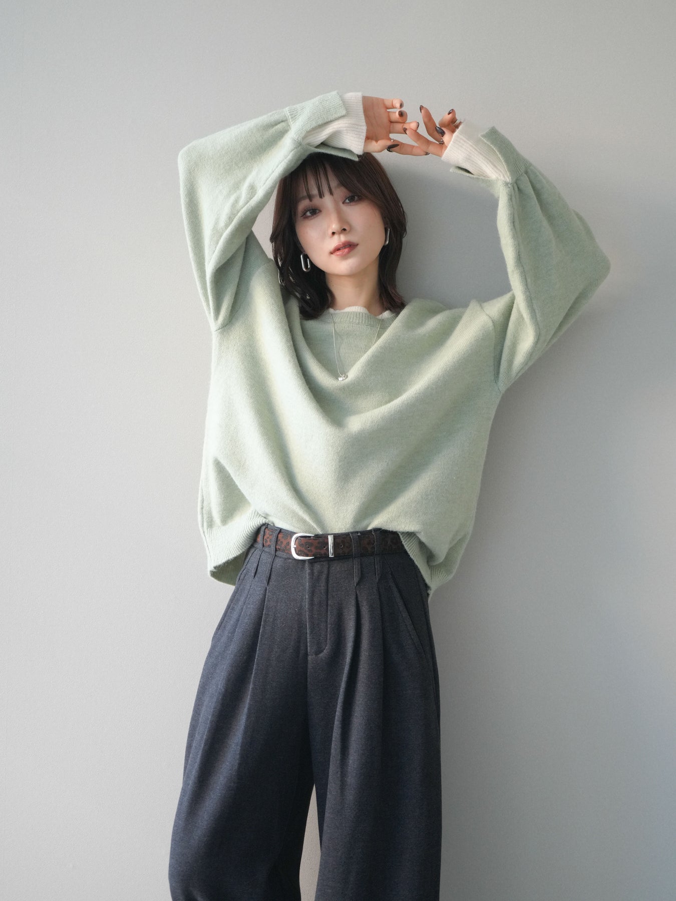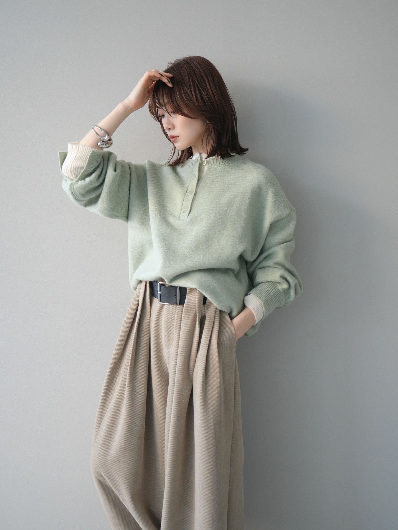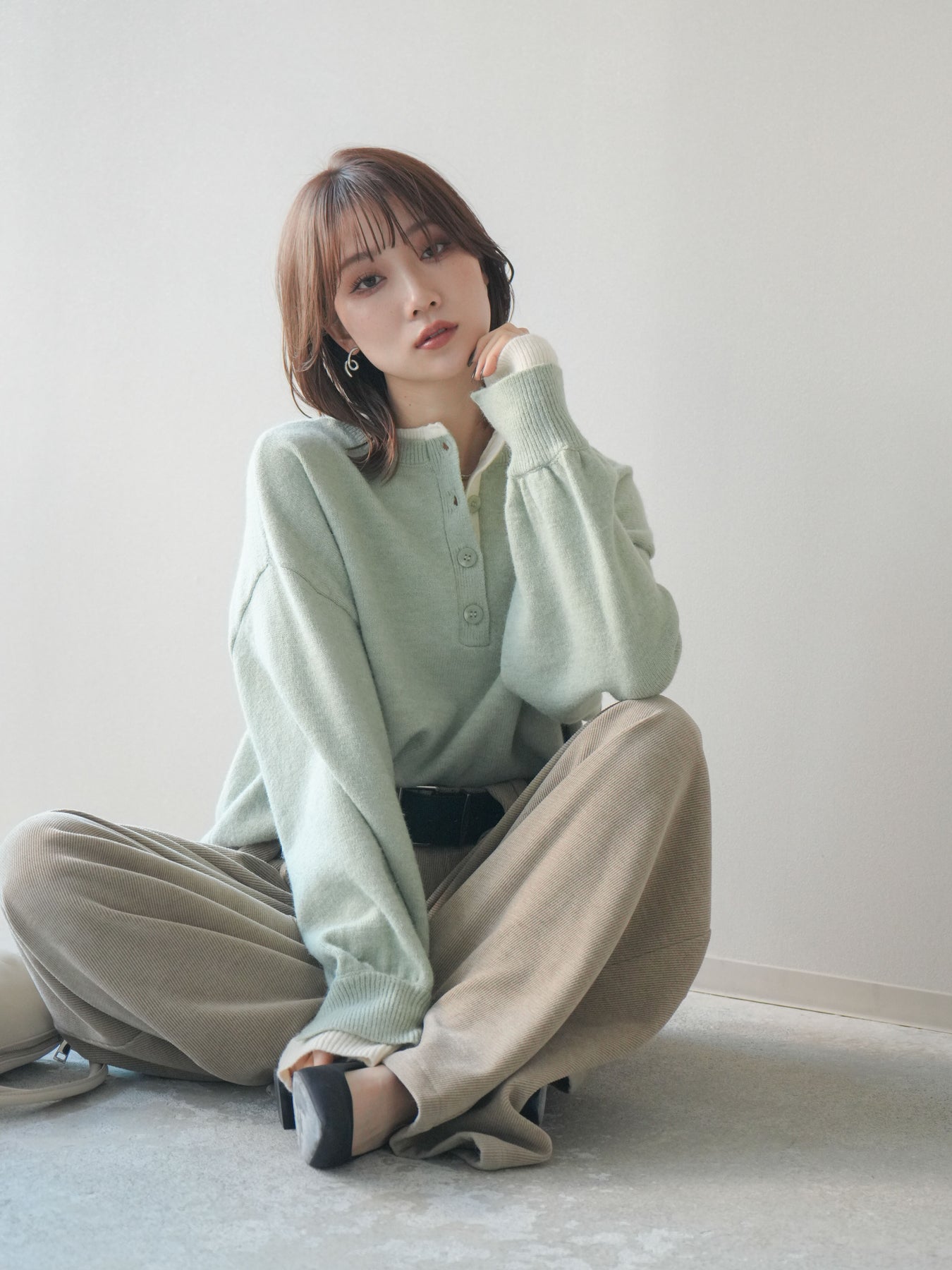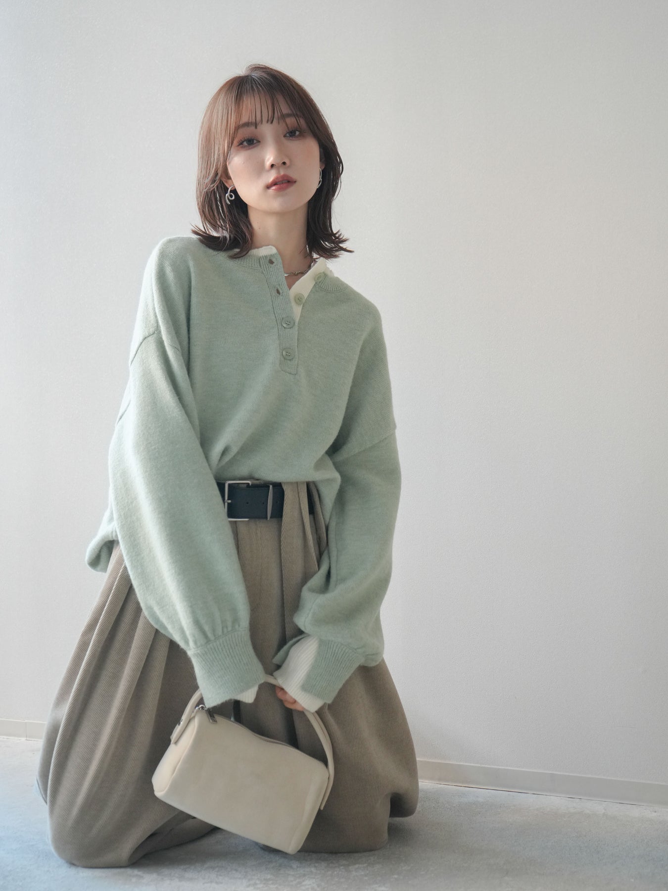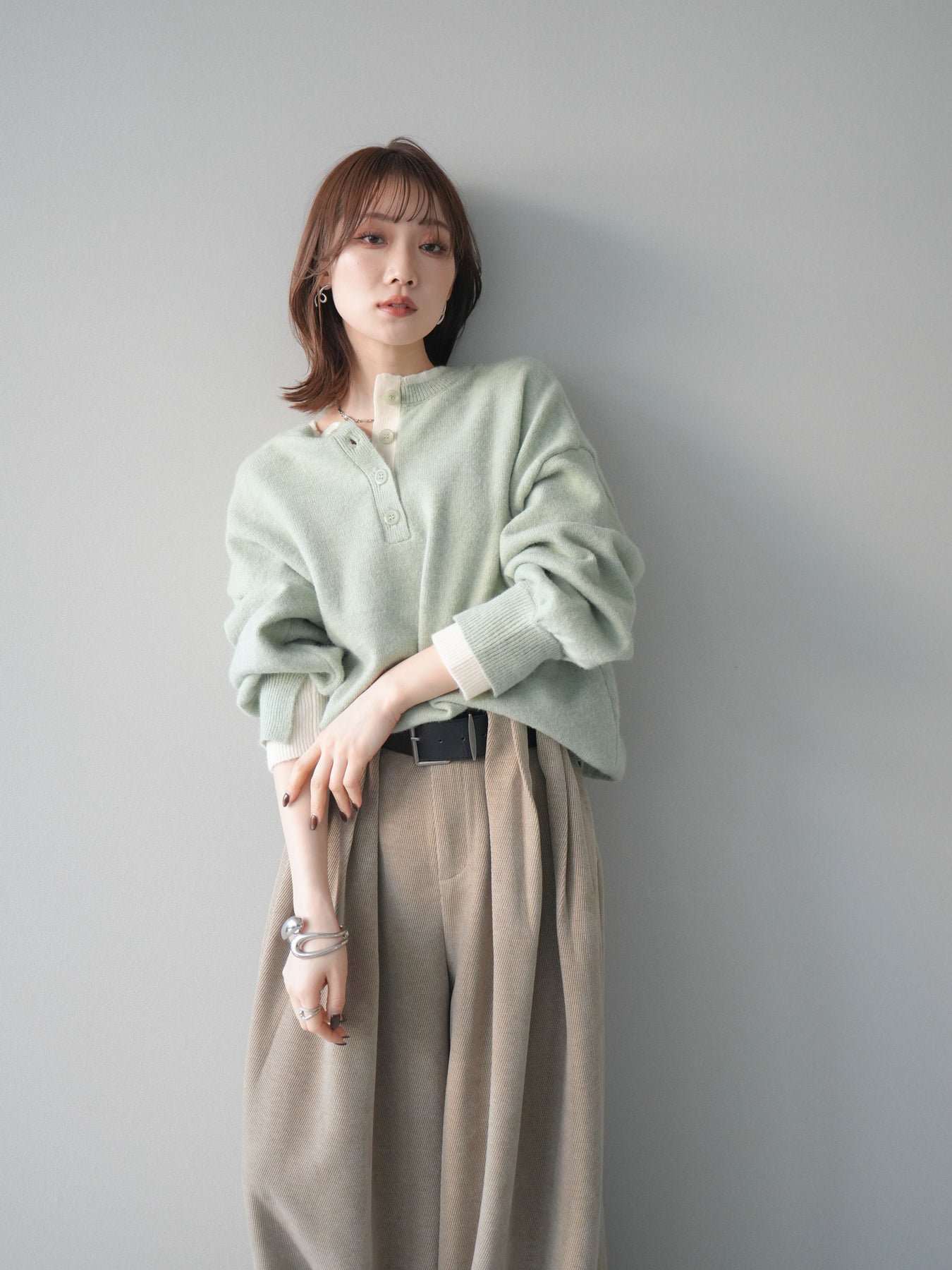[予約]ヘンリーネック配色レイヤードニットプルオーバー/mint