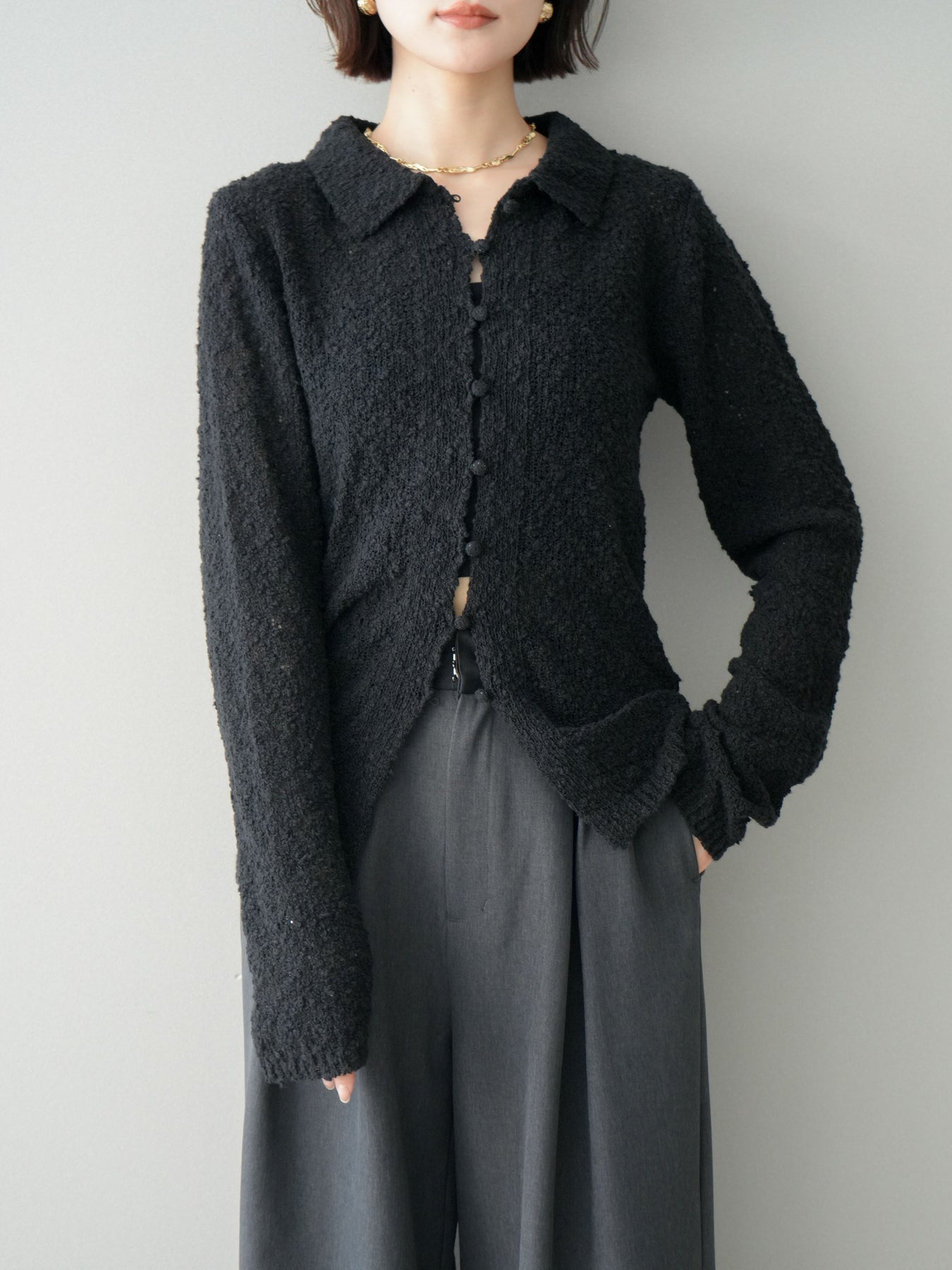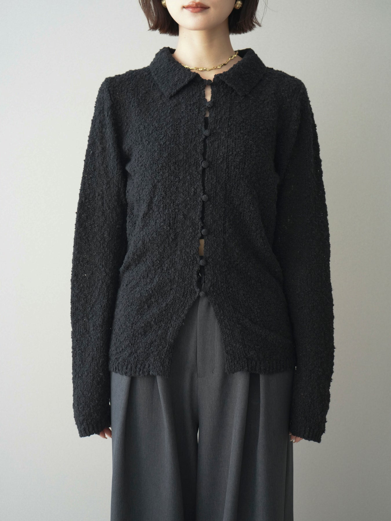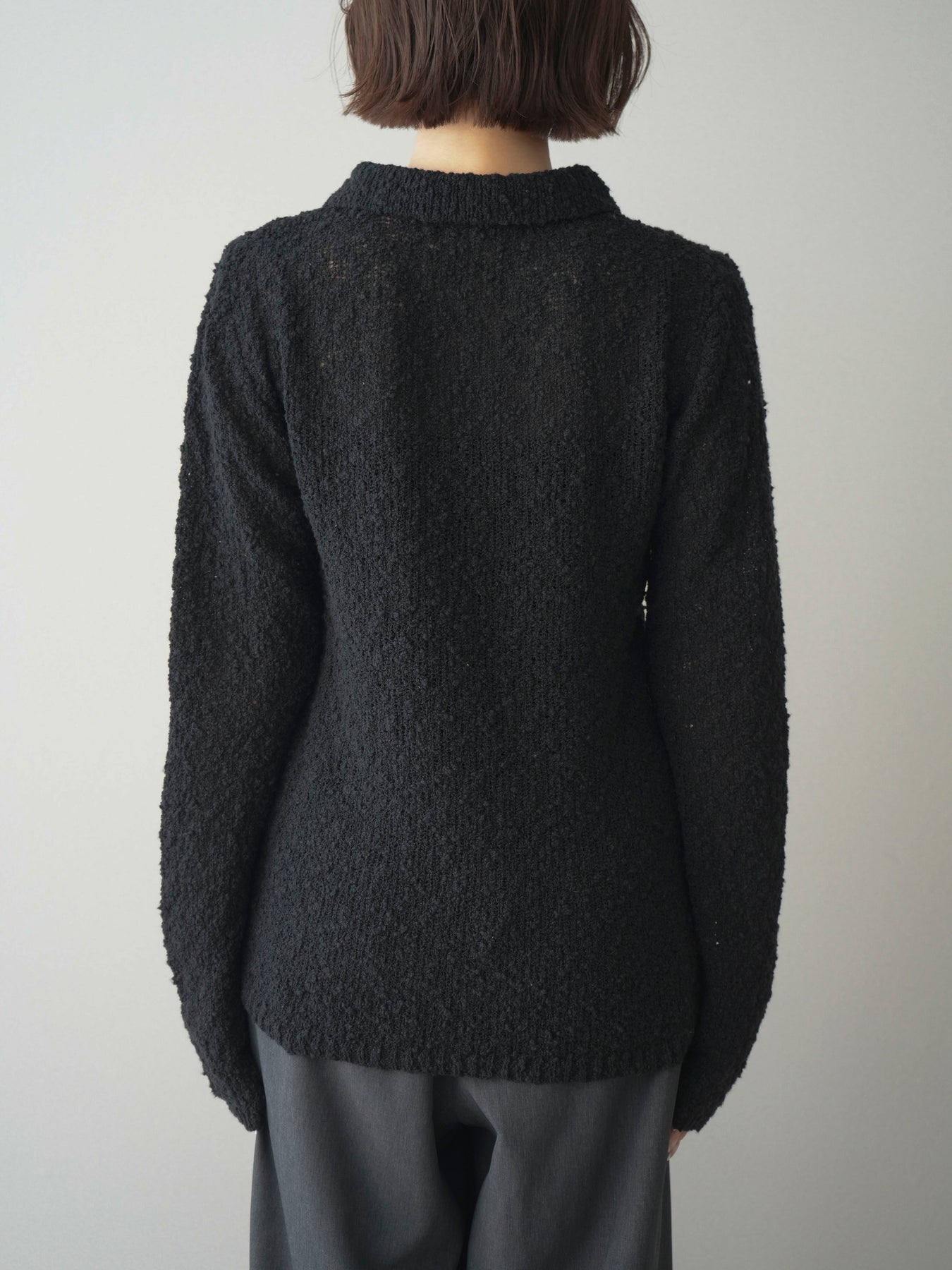 [予約]透かし編みブークレポロニットトップス/black