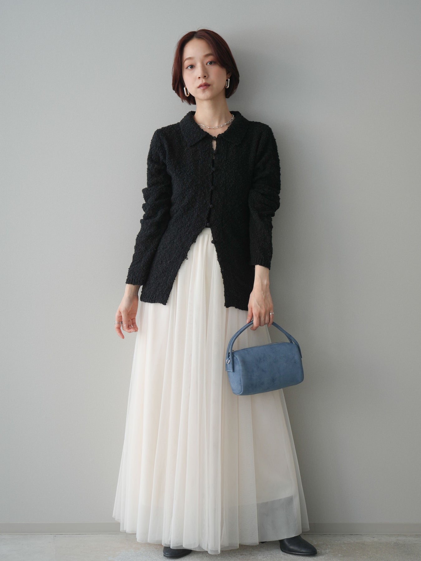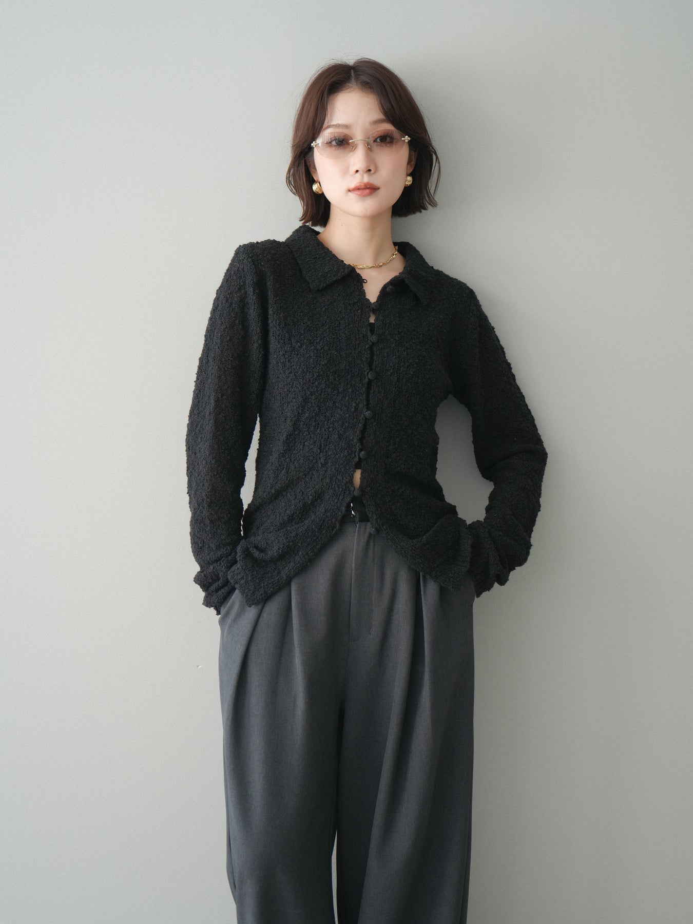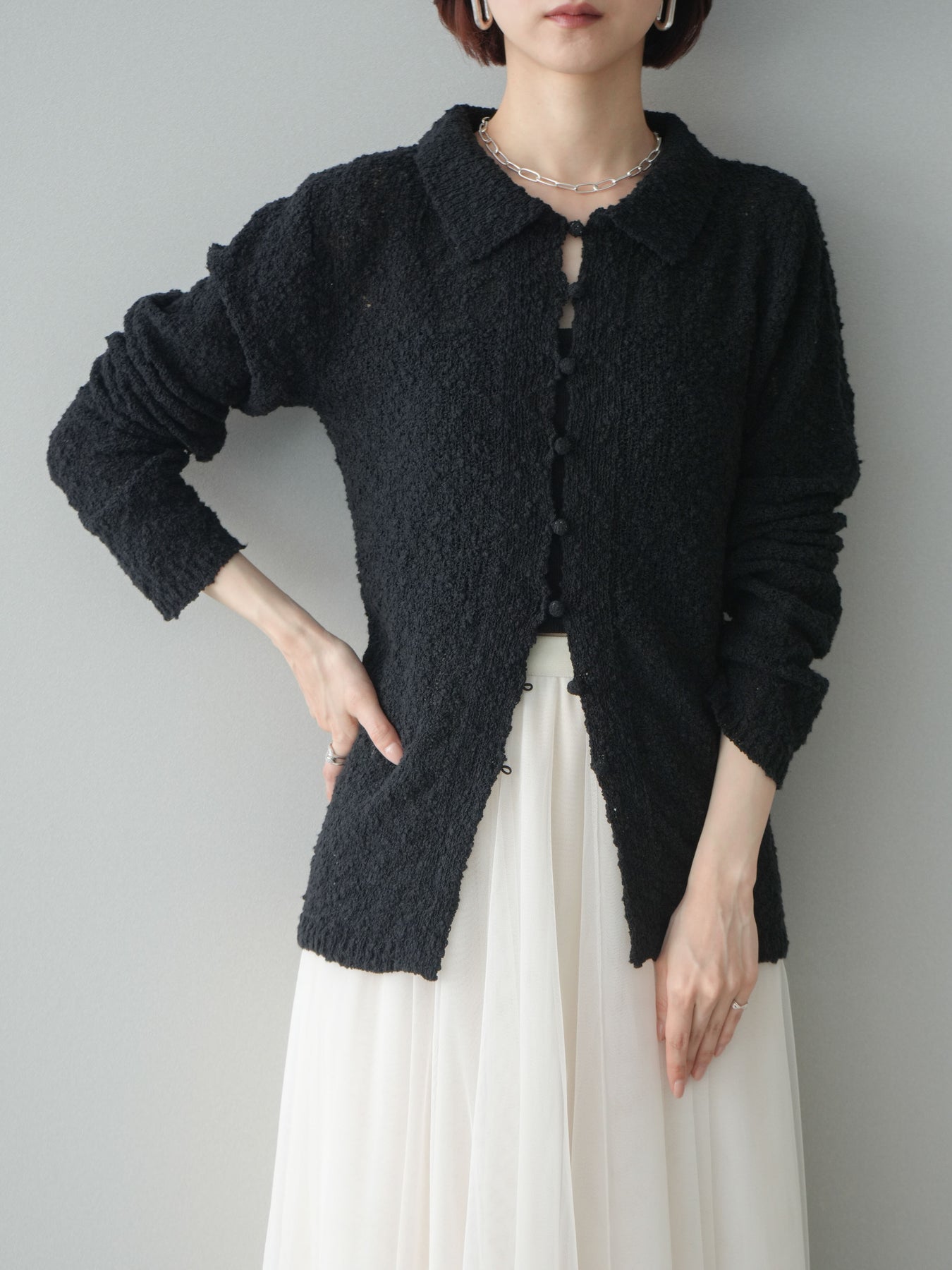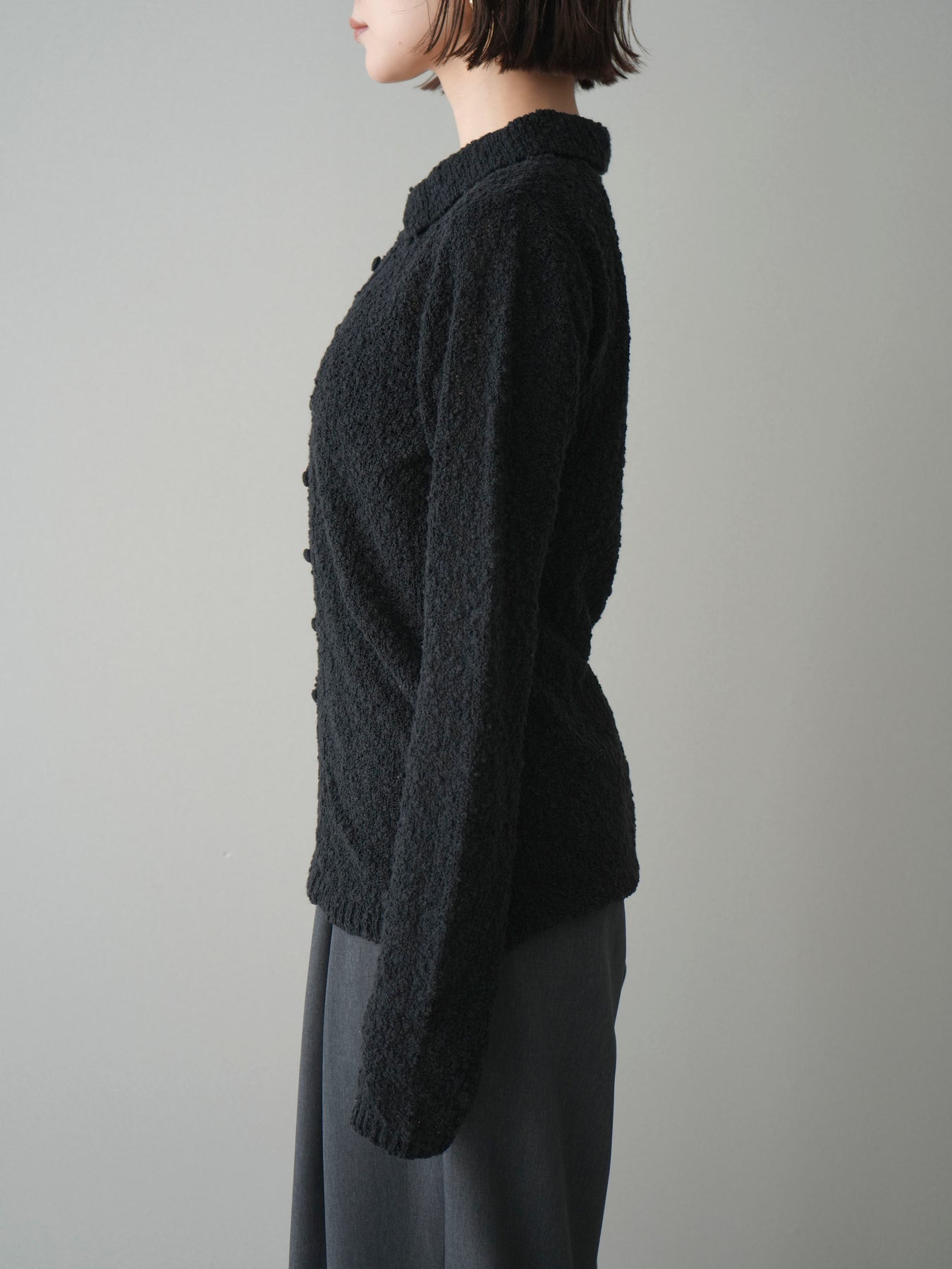 [予約]透かし編みブークレポロニットトップス/black