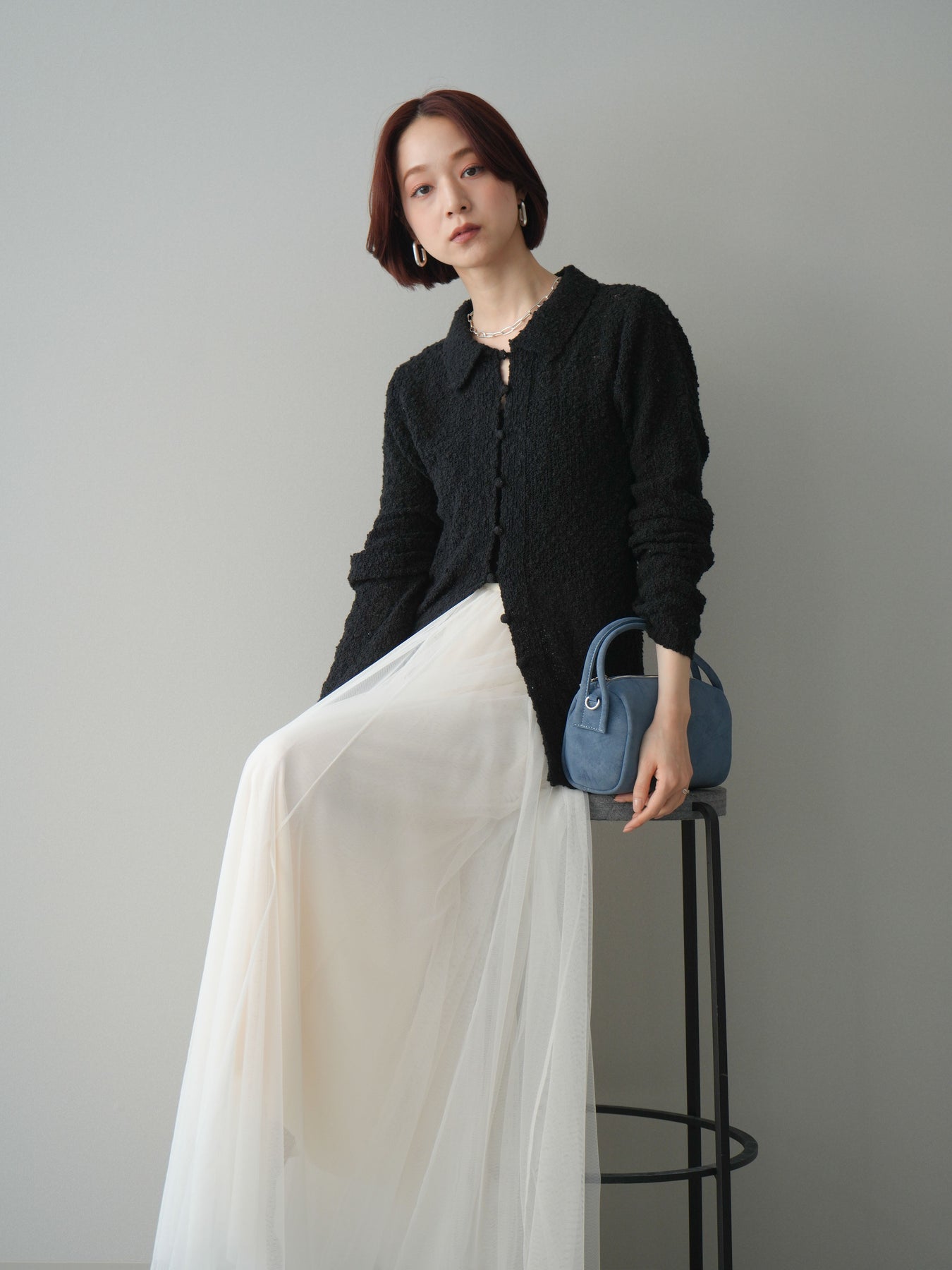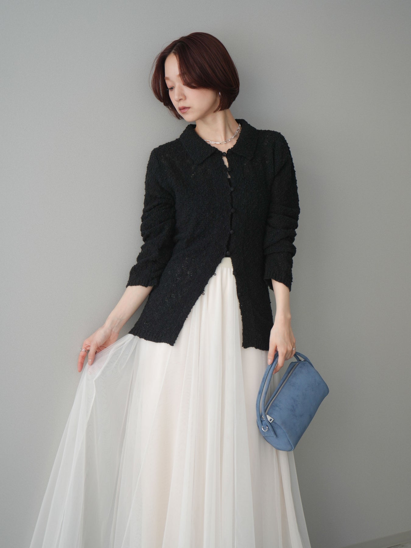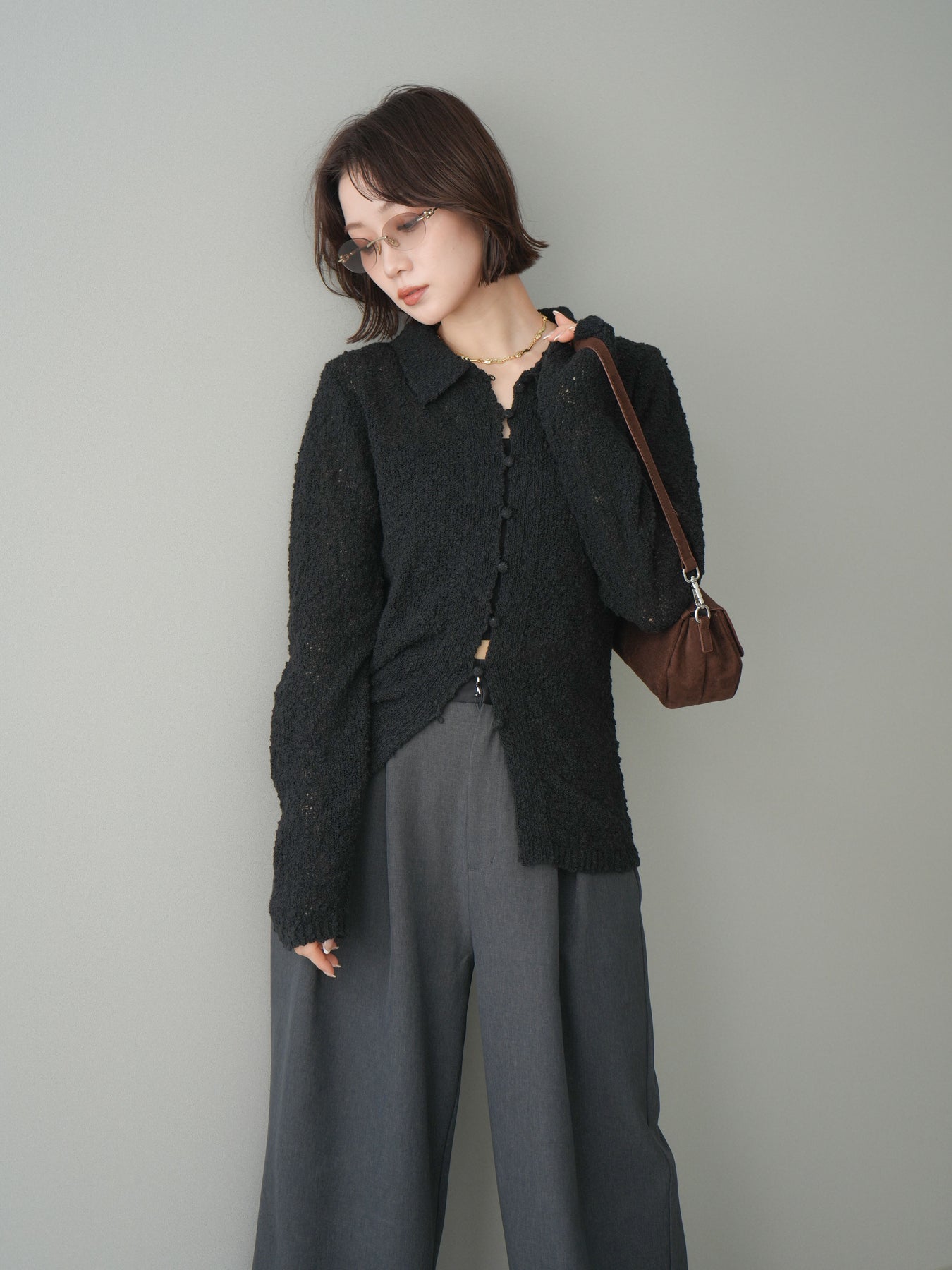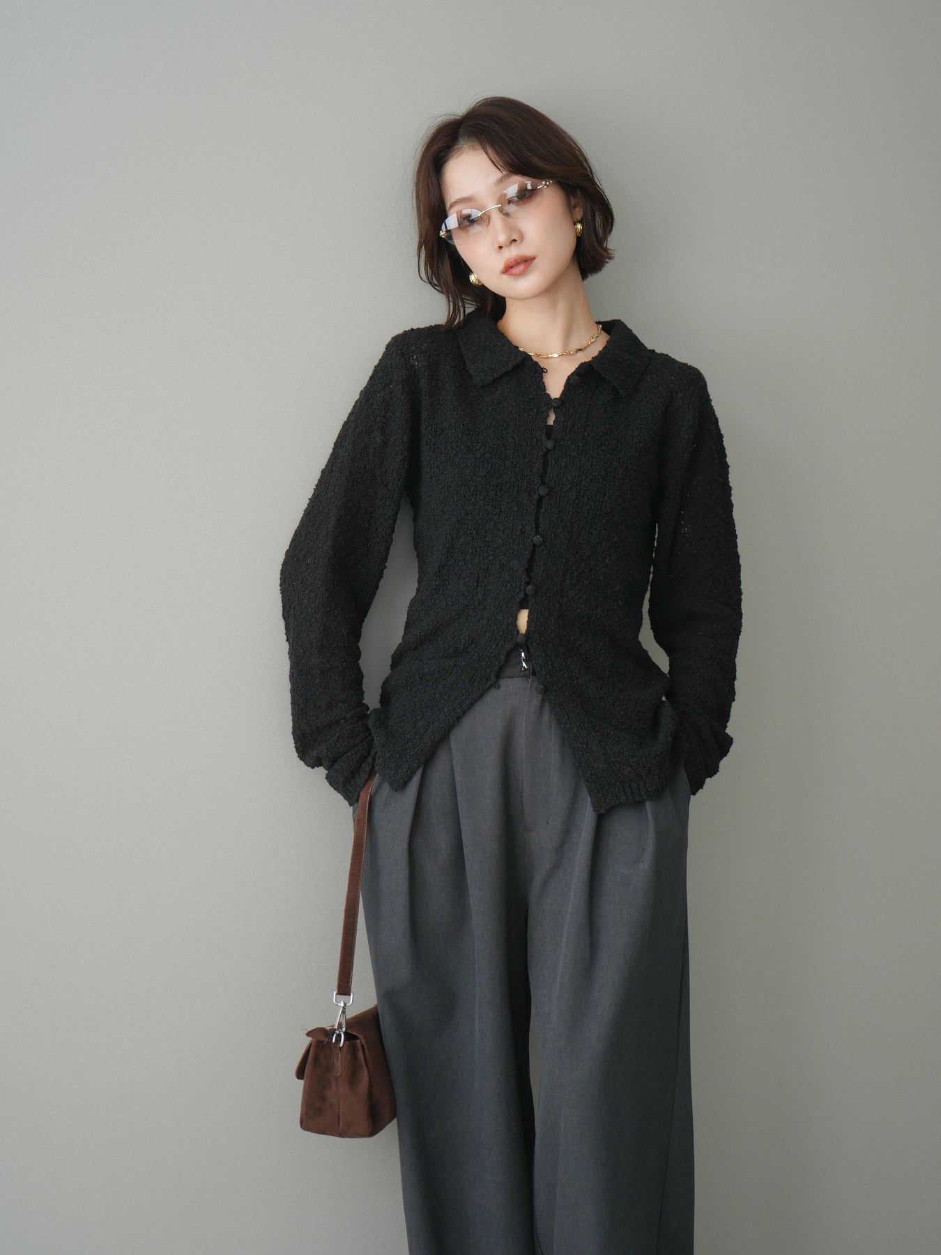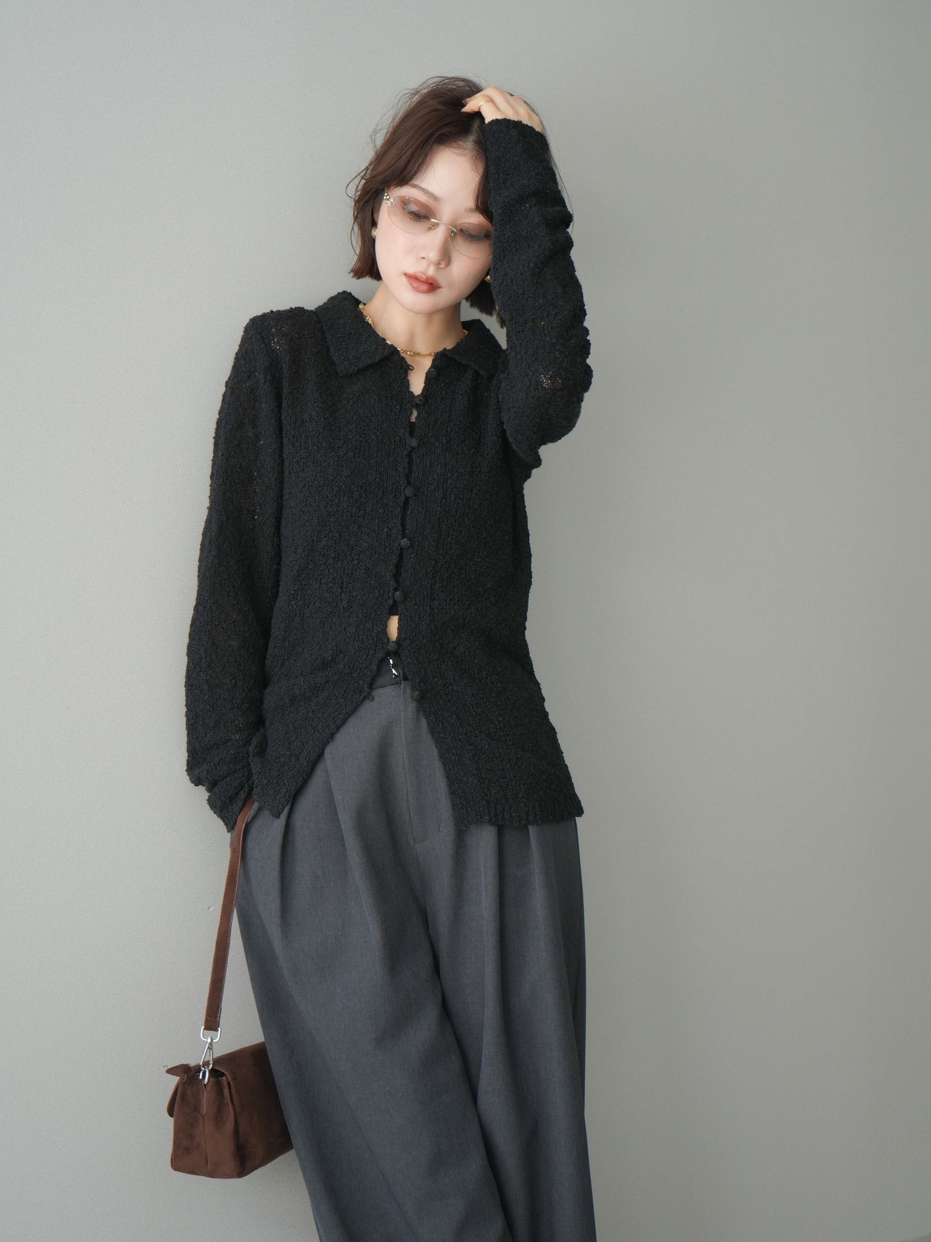 透かし編みとブークレ糸の表情が印象的な、ポロデザインのニットトップス。 立体感のある編み地がシンプルになりすぎず、着るだけで奥行きのあるスタイルに仕上がります。 ほどよくフィット感のあるシルエットに、襟付きデザインを掛け合わせることで、抜け感ときちんと感をバランスよくプラス。 透かし編みならではの軽やかさがあり、レイヤードもしやすく、インナー次第で雰囲気の変化を楽しめます。 デニムなどのカジュアルなボトムスはもちろん、きれいめなアイテムとも相性がよく、幅広いスタイリングに活躍する一着です。 ※ボトムス、キャミソール(インナー)以外の商品は一律でインナーは付属していません。