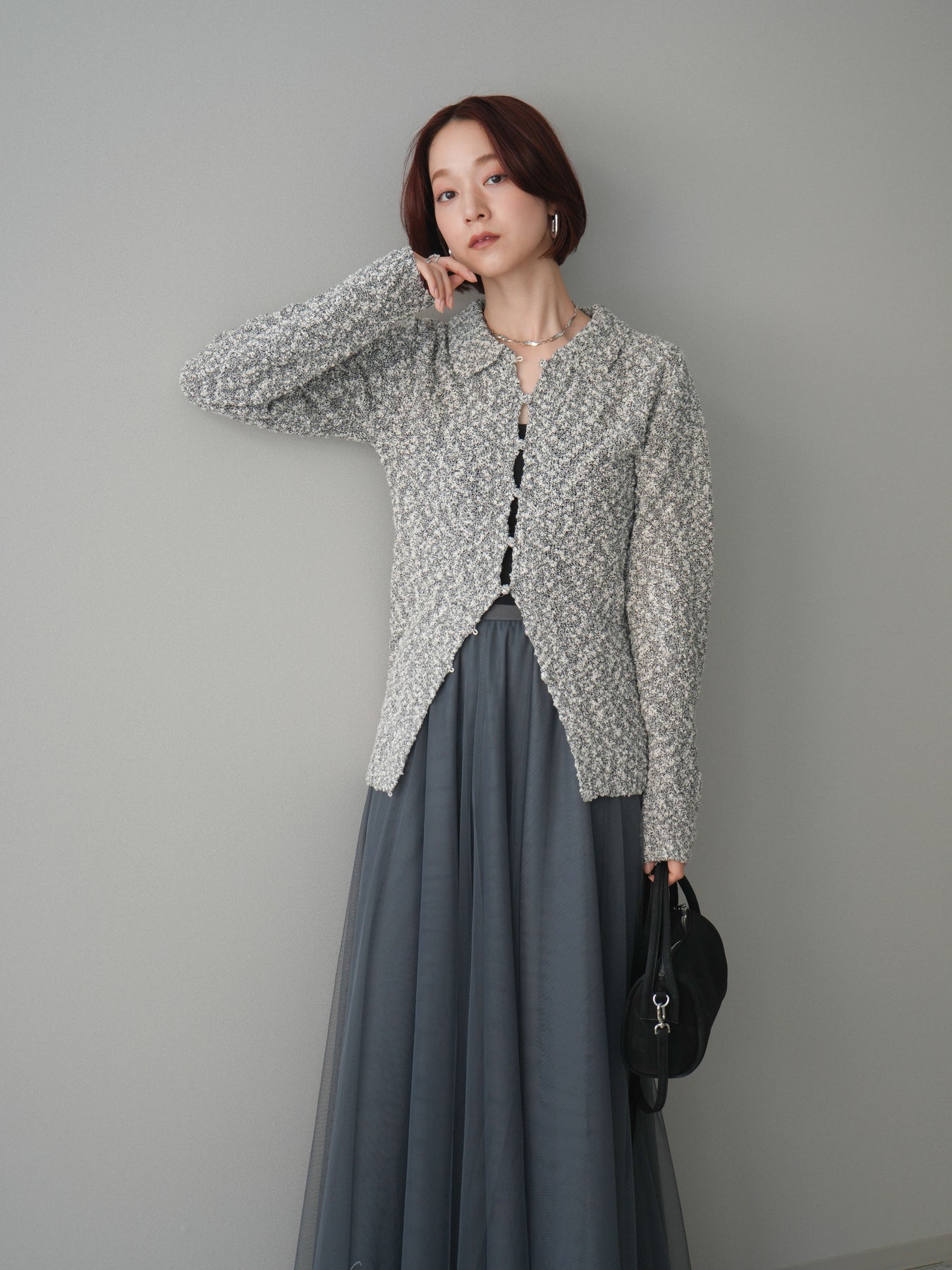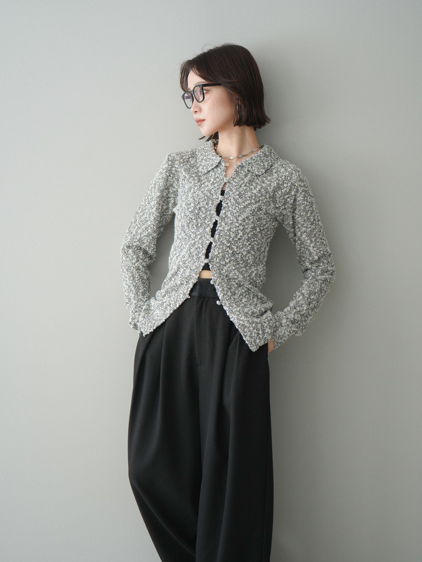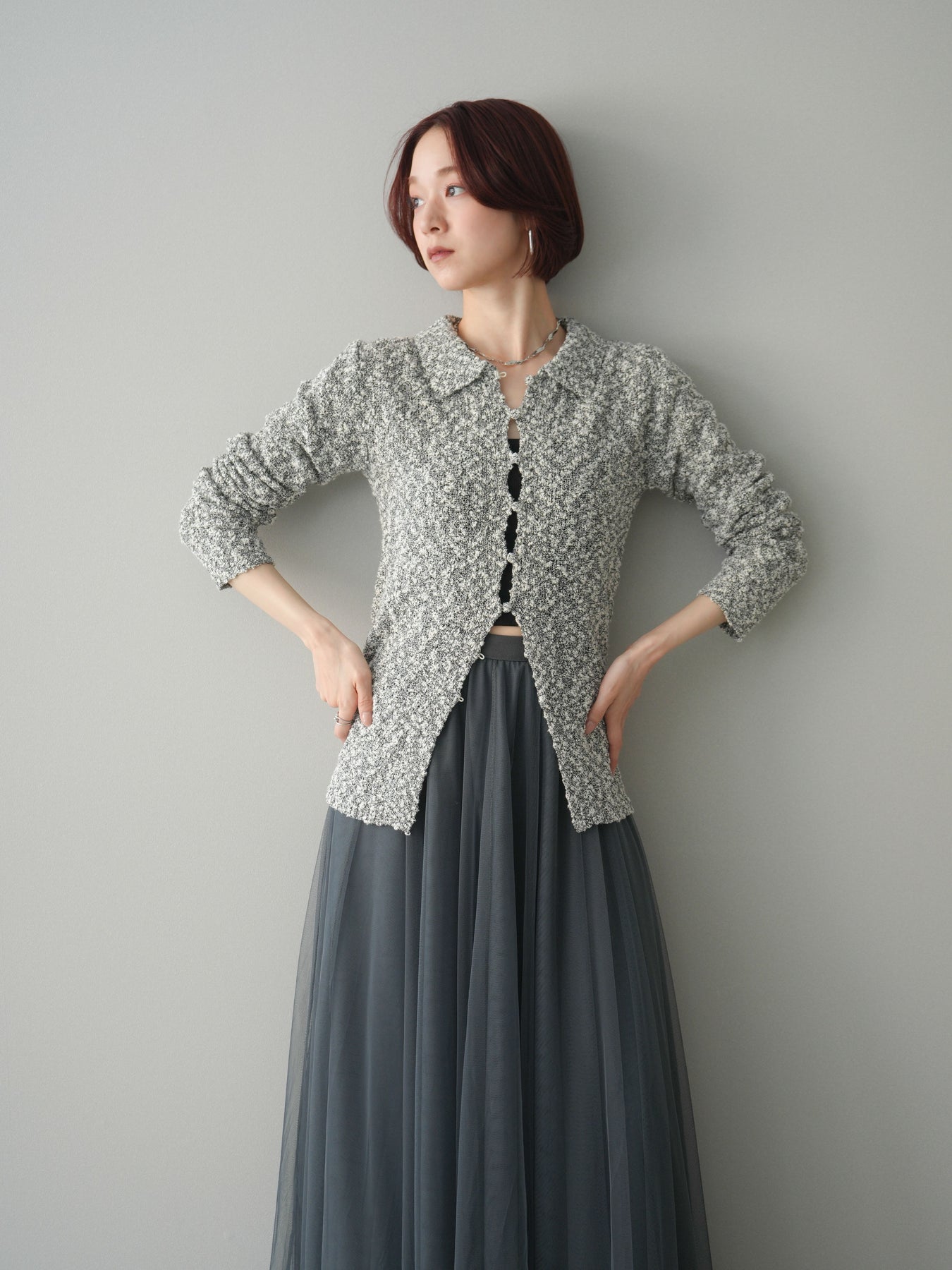 透かし編みとブークレ糸の表情が印象的な、ポロデザインのニットトップス。 立体感のある編み地がシンプルになりすぎず、着るだけで奥行きのあるスタイルに仕上がります。 ほどよくフィット感のあるシルエットに、襟付きデザインを掛け合わせることで、抜け感ときちんと感をバランスよくプラス。 透かし編みならではの軽やかさがあり、レイヤードもしやすく、インナー次第で雰囲気の変化を楽しめます。 デニムなどのカジュアルなボトムスはもちろん、きれいめなアイテムとも相性がよく、幅広いスタイリングに活躍する一着です。 ※ボトムス、キャミソール(インナー)以外の商品は一律でインナーは付属していません。