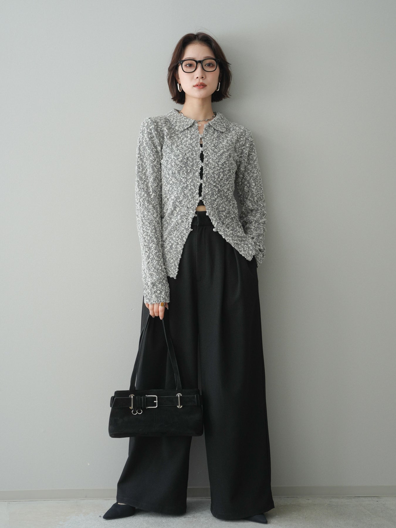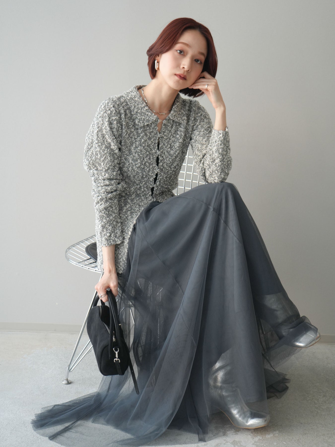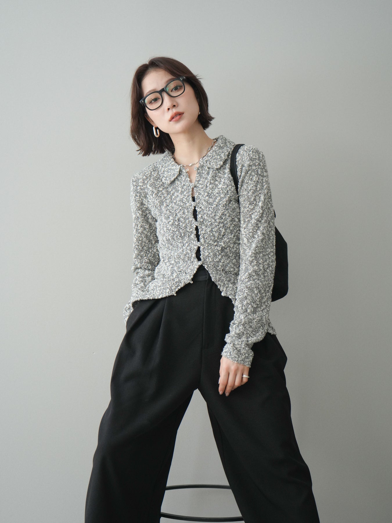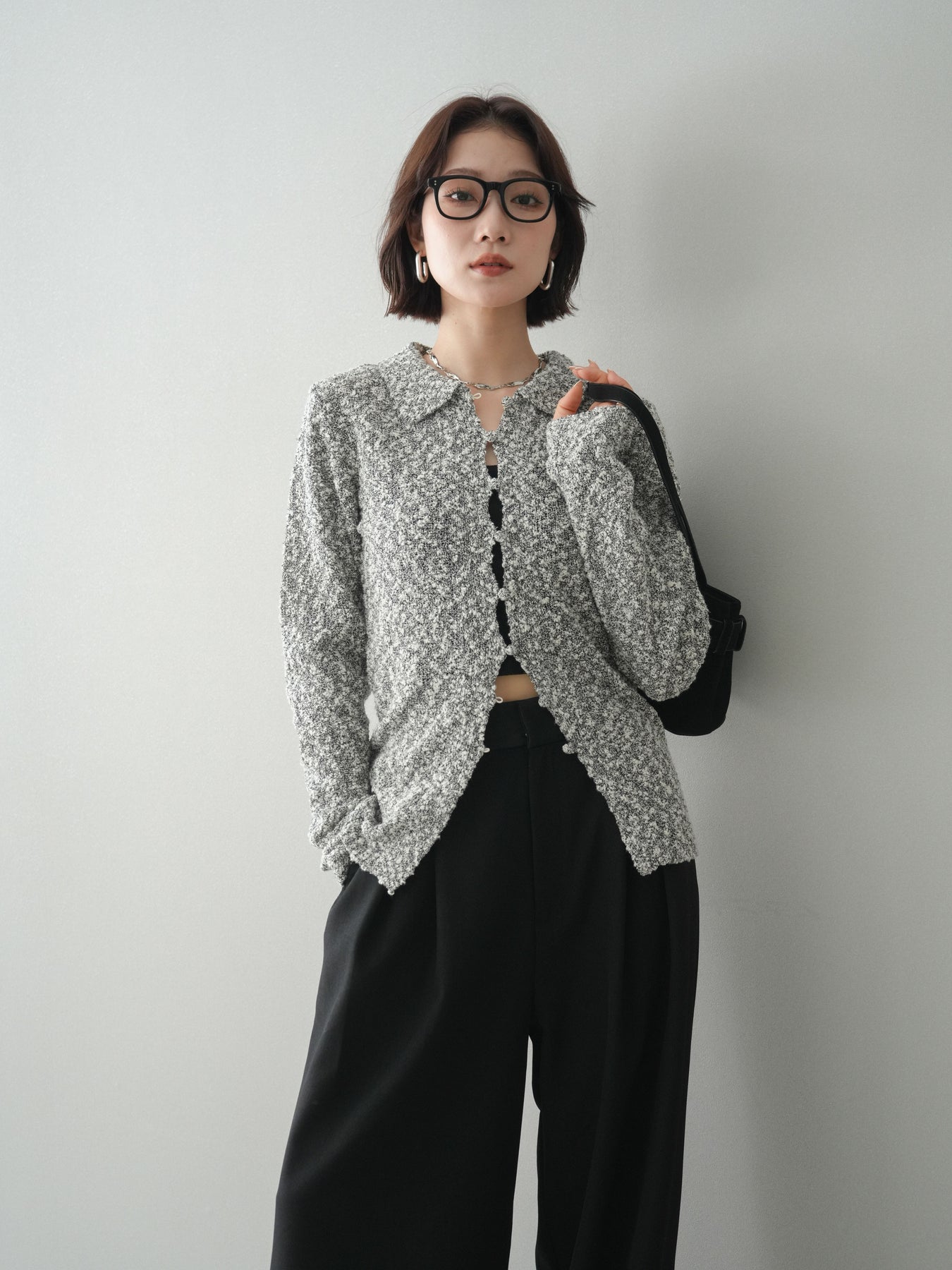 透かし編みとブークレ糸の表情が印象的な、ポロデザインのニットトップス。 立体感のある編み地がシンプルになりすぎず、着るだけで奥行きのあるスタイルに仕上がります。 ほどよくフィット感のあるシルエットに、襟付きデザインを掛け合わせることで、抜け感ときちんと感をバランスよくプラス。 透かし編みならではの軽やかさがあり、レイヤードもしやすく、インナー次第で雰囲気の変化を楽しめます。 デニムなどのカジュアルなボトムスはもちろん、きれいめなアイテムとも相性がよく、幅広いスタイリングに活躍する一着です。 ※ボトムス、キャミソール(インナー)以外の商品は一律でインナーは付属していません。