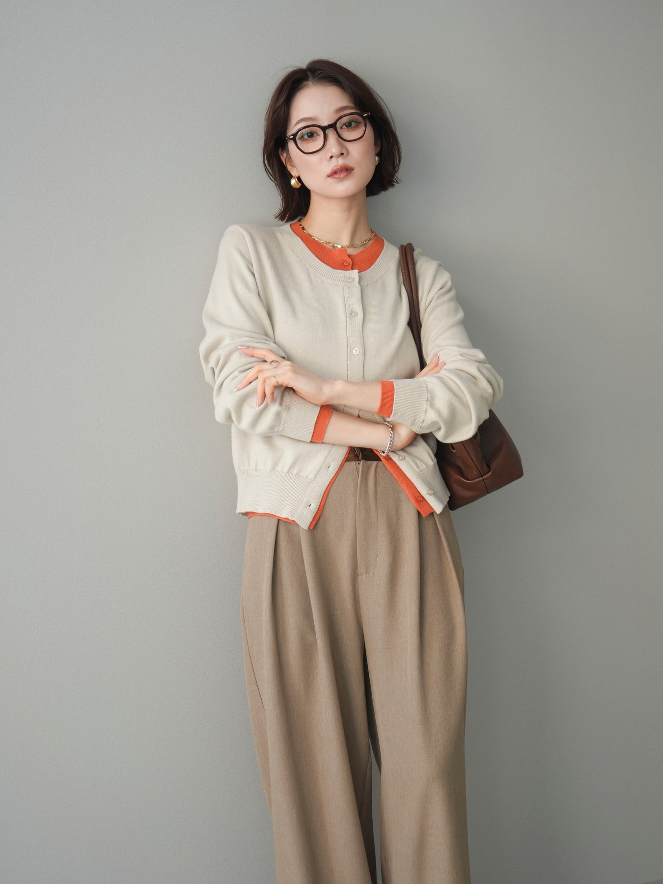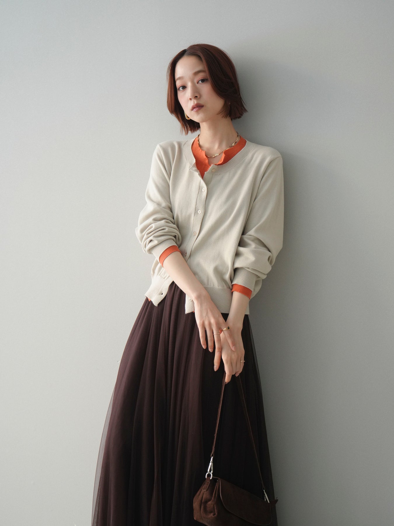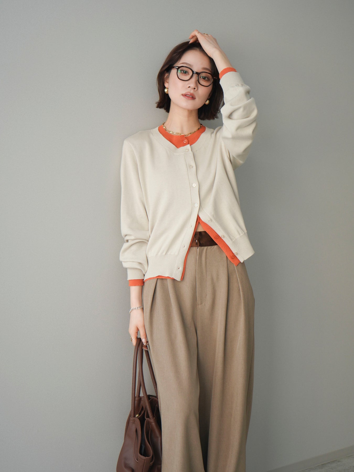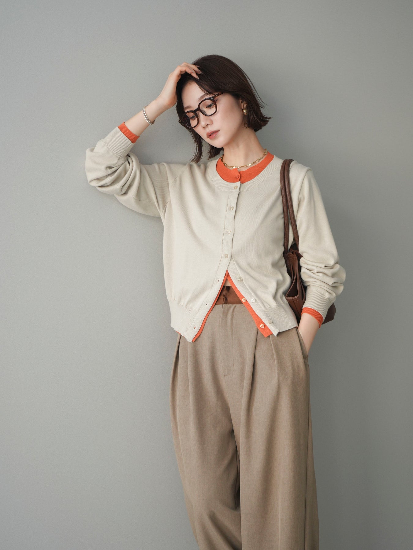 配色のレイヤードデザインが目を惹く、コットンアクリル素材のニットカーディガン。 インナーを重ねたような見え方が一枚で決まり、スタイリングに自然な奥行きを加えます。 程よくゆとりのあるシルエットで、前を留めても開けてもバランスよく着用可能。 コットンアクリルならではの軽やかさがあり、長時間の着用でも心地よく過ごせます。 デニムなどのカジュアルなボトムスから、きれいめなパンツまで幅広く合わせやすく、日常使いに取り入れやすい一着です。 ※ボトムス、キャミソール(インナー)以外の商品は一律でインナーは付属していません。