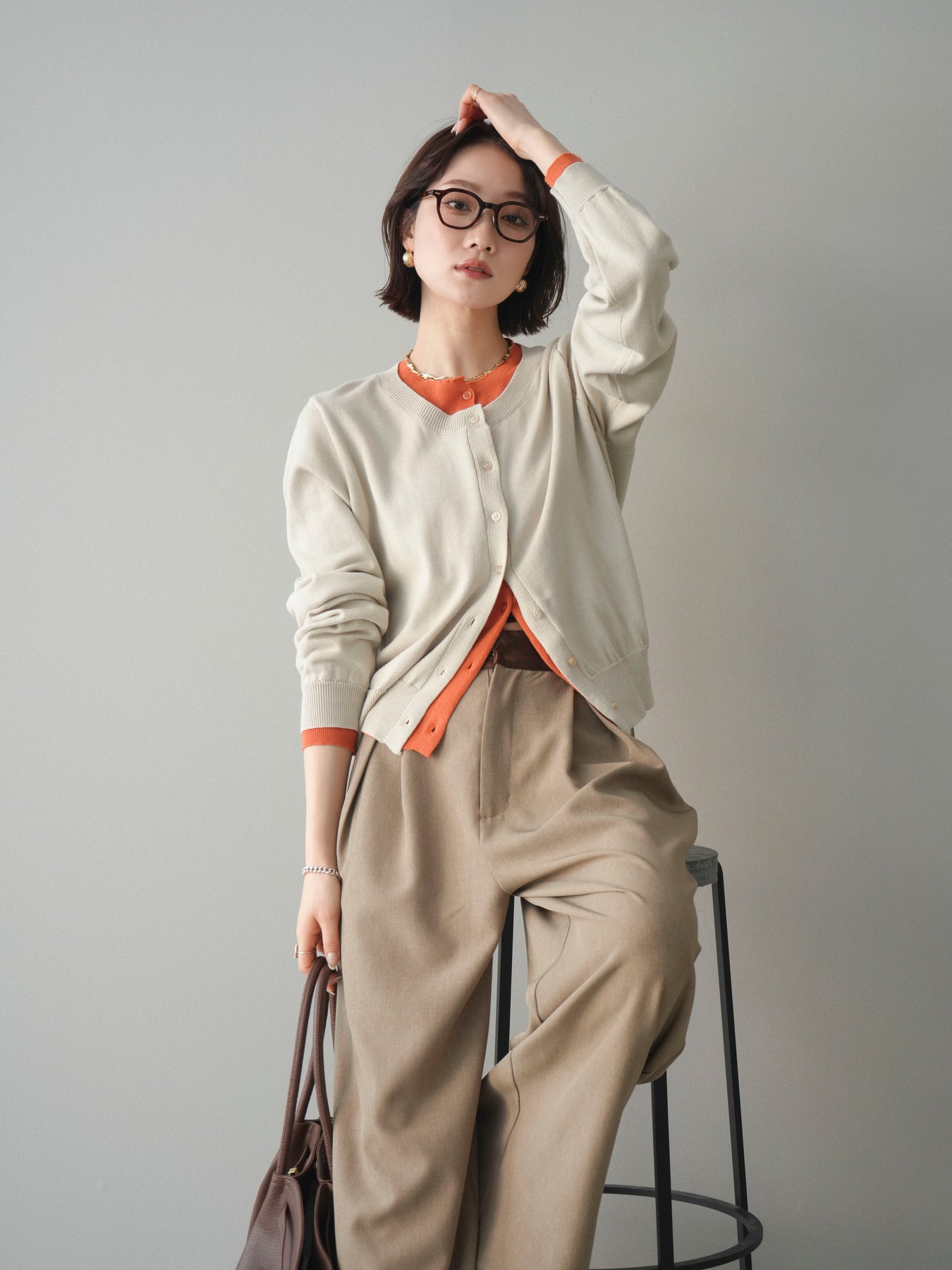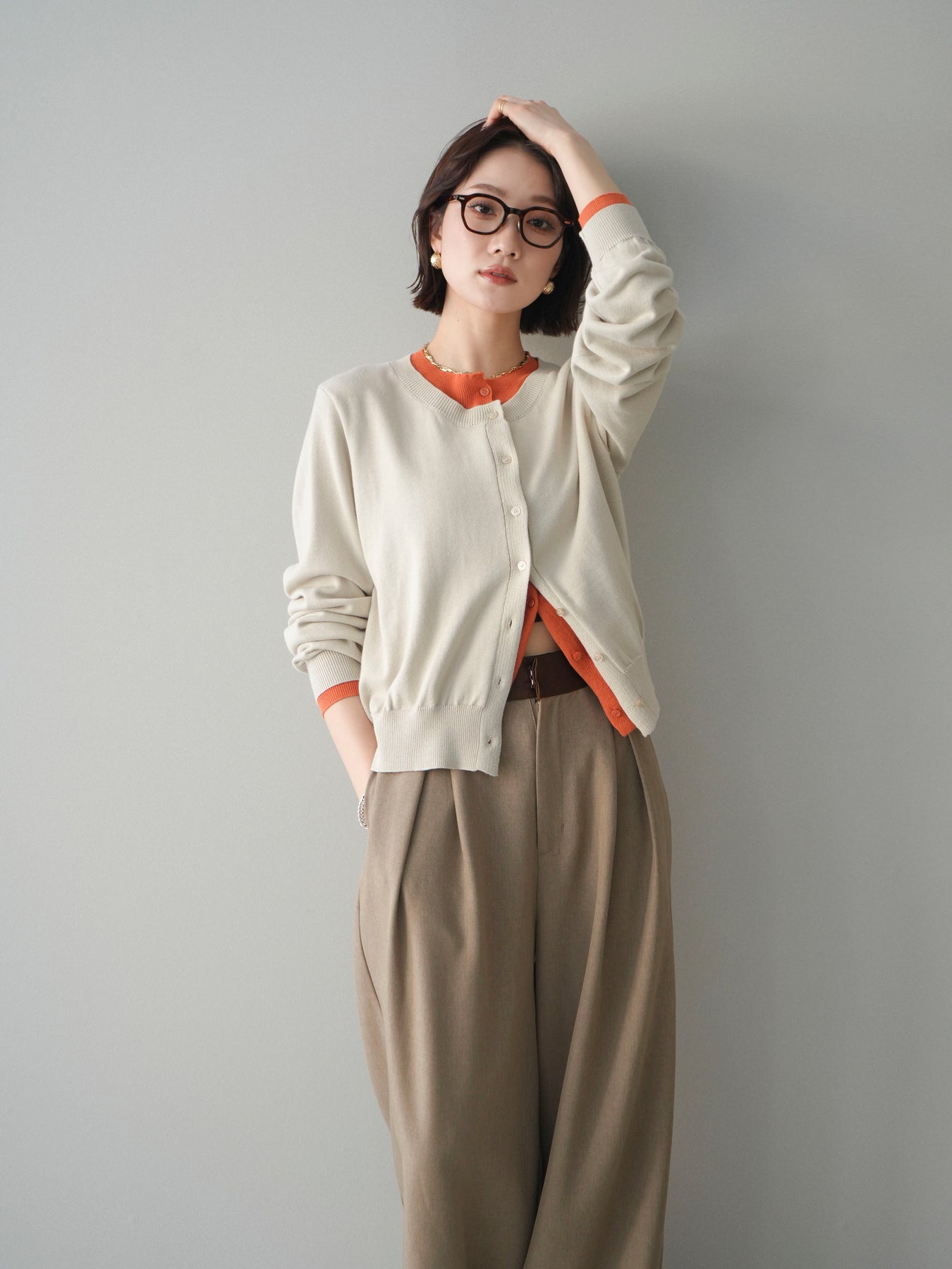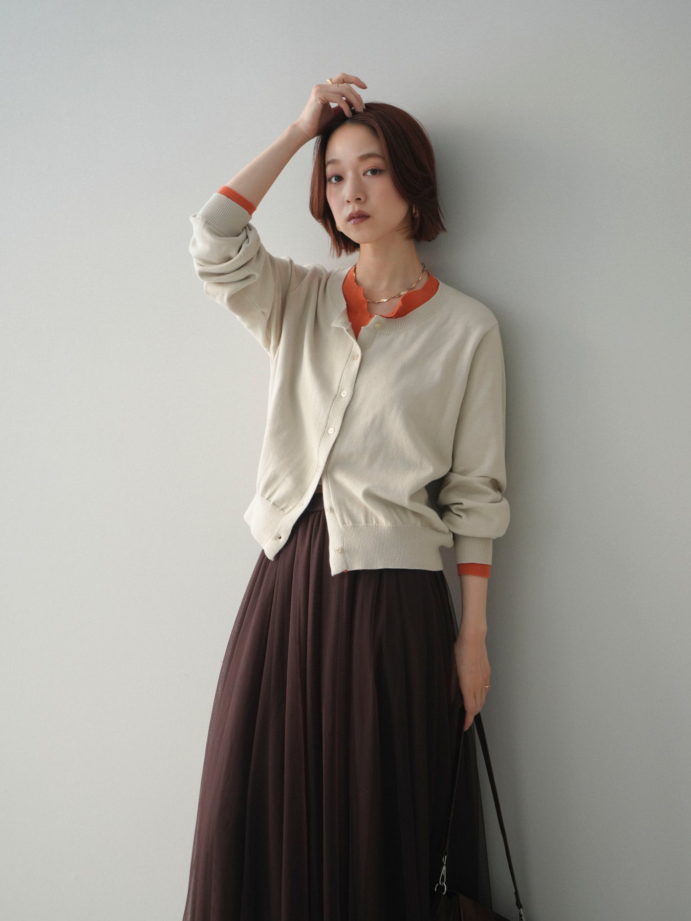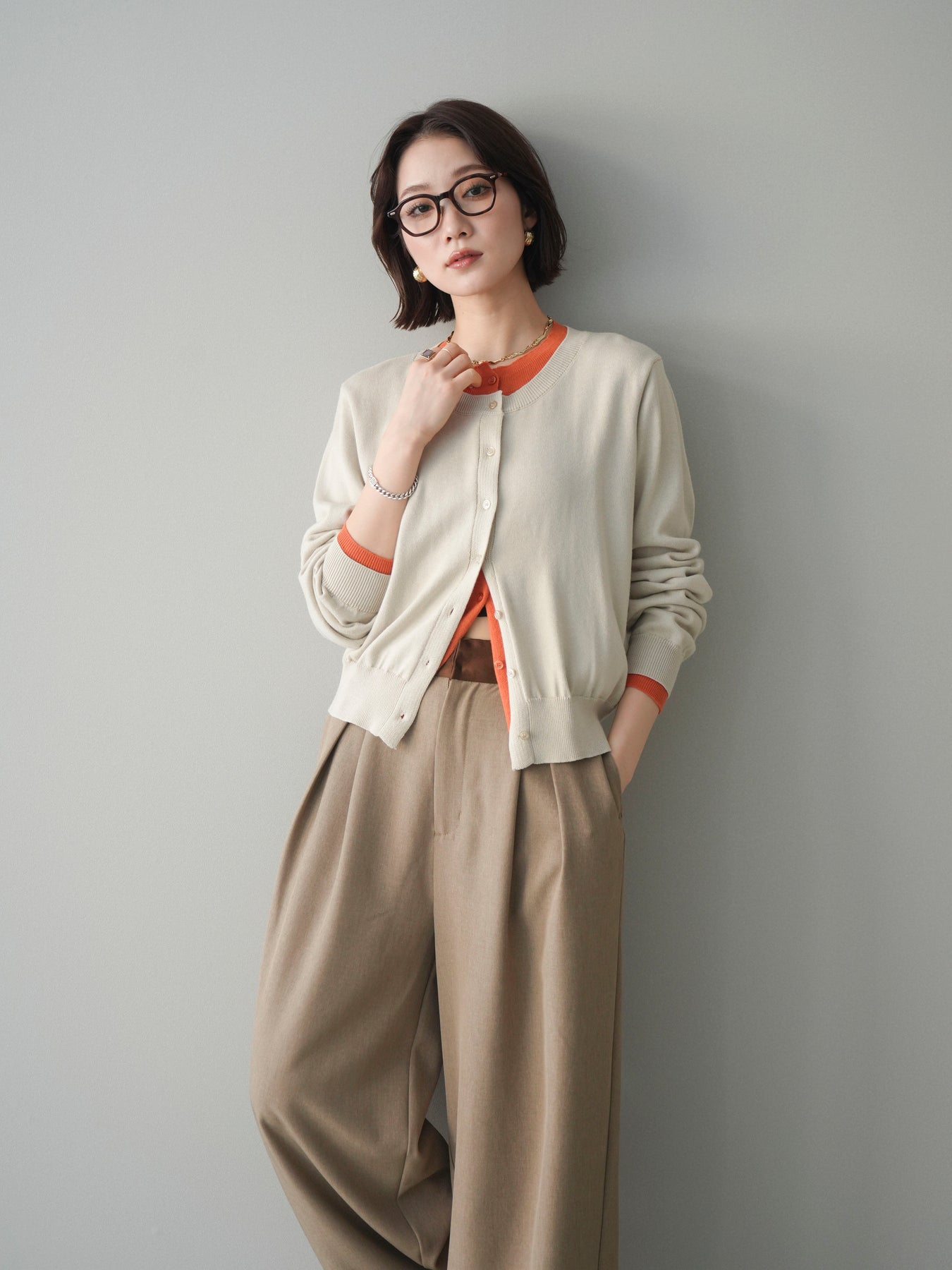 配色のレイヤードデザインが目を惹く、コットンアクリル素材のニットカーディガン。 インナーを重ねたような見え方が一枚で決まり、スタイリングに自然な奥行きを加えます。 程よくゆとりのあるシルエットで、前を留めても開けてもバランスよく着用可能。 コットンアクリルならではの軽やかさがあり、長時間の着用でも心地よく過ごせます。 デニムなどのカジュアルなボトムスから、きれいめなパンツまで幅広く合わせやすく、日常使いに取り入れやすい一着です。 ※ボトムス、キャミソール(インナー)以外の商品は一律でインナーは付属していません。