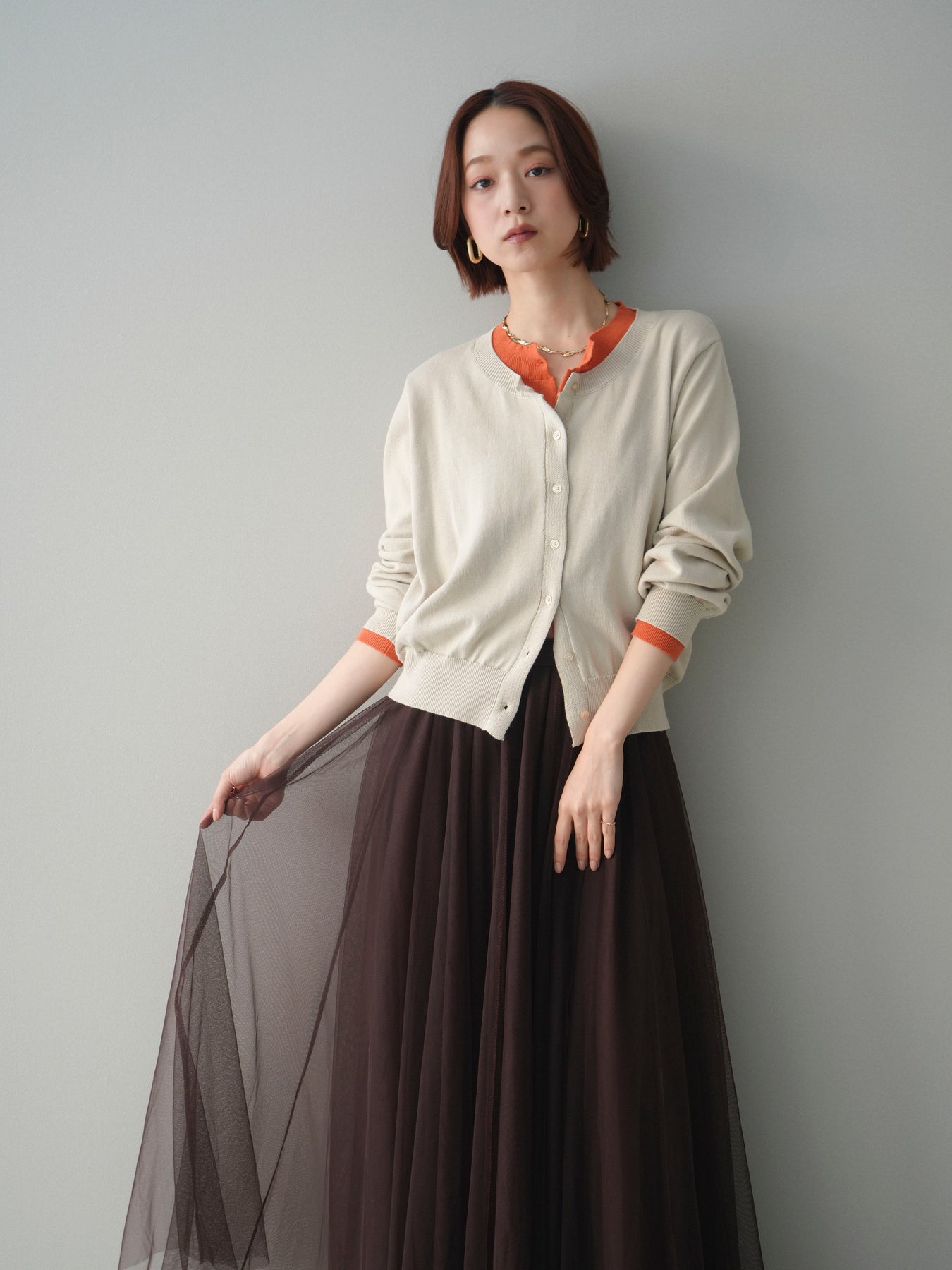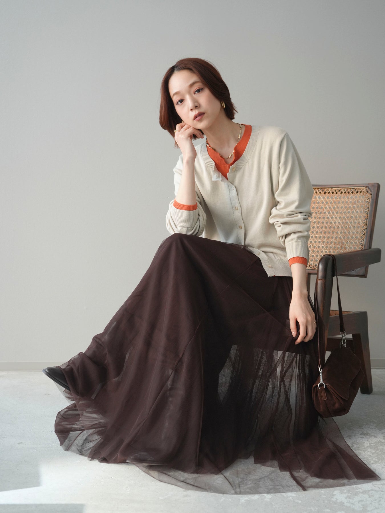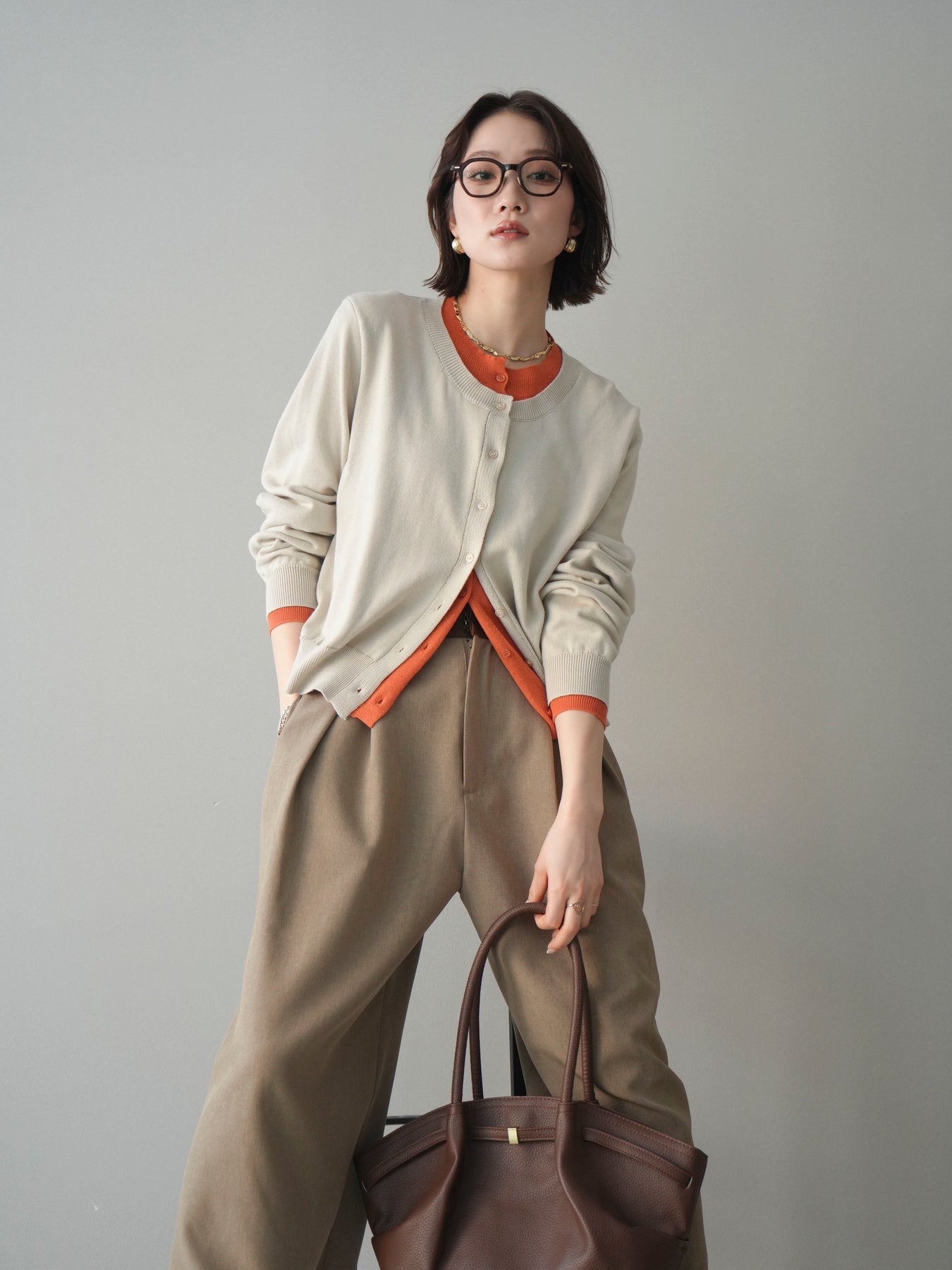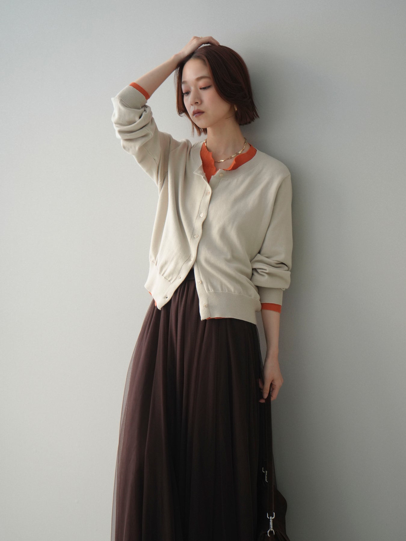 配色のレイヤードデザインが目を惹く、コットンアクリル素材のニットカーディガン。 インナーを重ねたような見え方が一枚で決まり、スタイリングに自然な奥行きを加えます。 程よくゆとりのあるシルエットで、前を留めても開けてもバランスよく着用可能。 コットンアクリルならではの軽やかさがあり、長時間の着用でも心地よく過ごせます。 デニムなどのカジュアルなボトムスから、きれいめなパンツまで幅広く合わせやすく、日常使いに取り入れやすい一着です。 ※ボトムス、キャミソール(インナー)以外の商品は一律でインナーは付属していません。