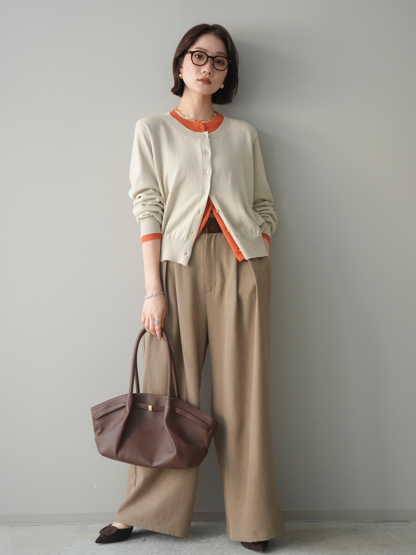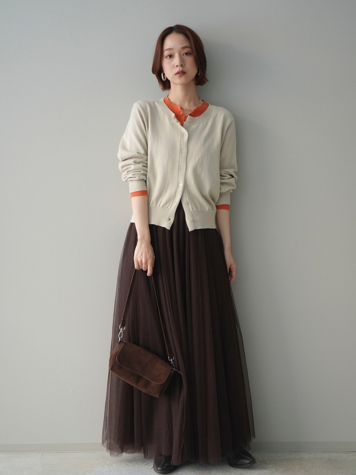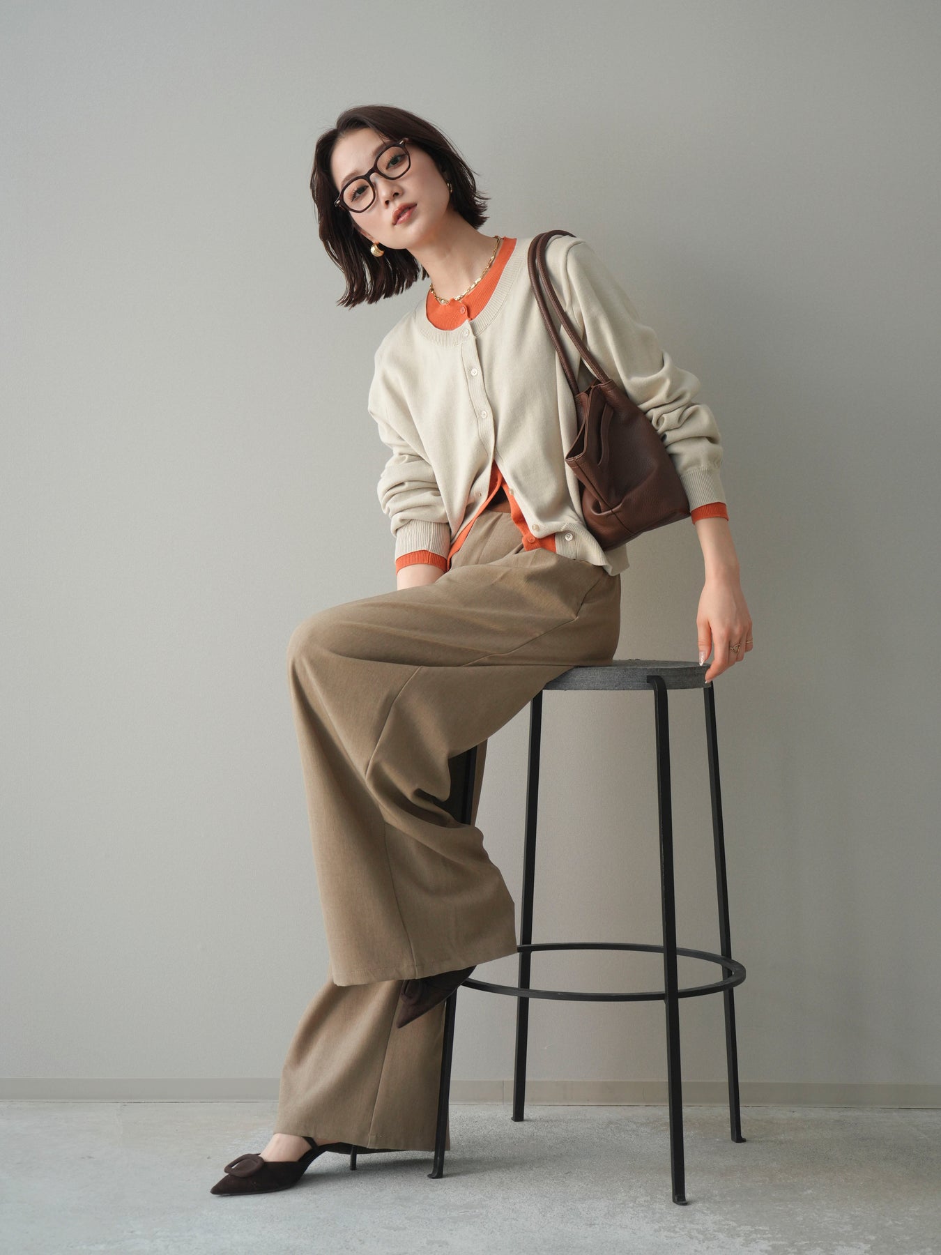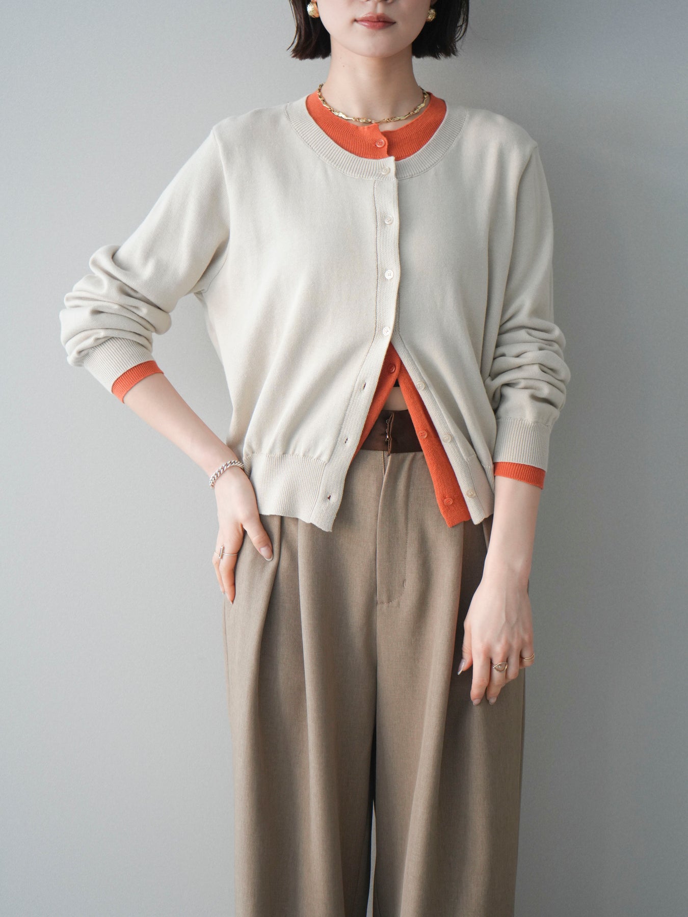 配色のレイヤードデザインが目を惹く、コットンアクリル素材のニットカーディガン。 インナーを重ねたような見え方が一枚で決まり、スタイリングに自然な奥行きを加えます。 程よくゆとりのあるシルエットで、前を留めても開けてもバランスよく着用可能。 コットンアクリルならではの軽やかさがあり、長時間の着用でも心地よく過ごせます。 デニムなどのカジュアルなボトムスから、きれいめなパンツまで幅広く合わせやすく、日常使いに取り入れやすい一着です。 ※ボトムス、キャミソール(インナー)以外の商品は一律でインナーは付属していません。