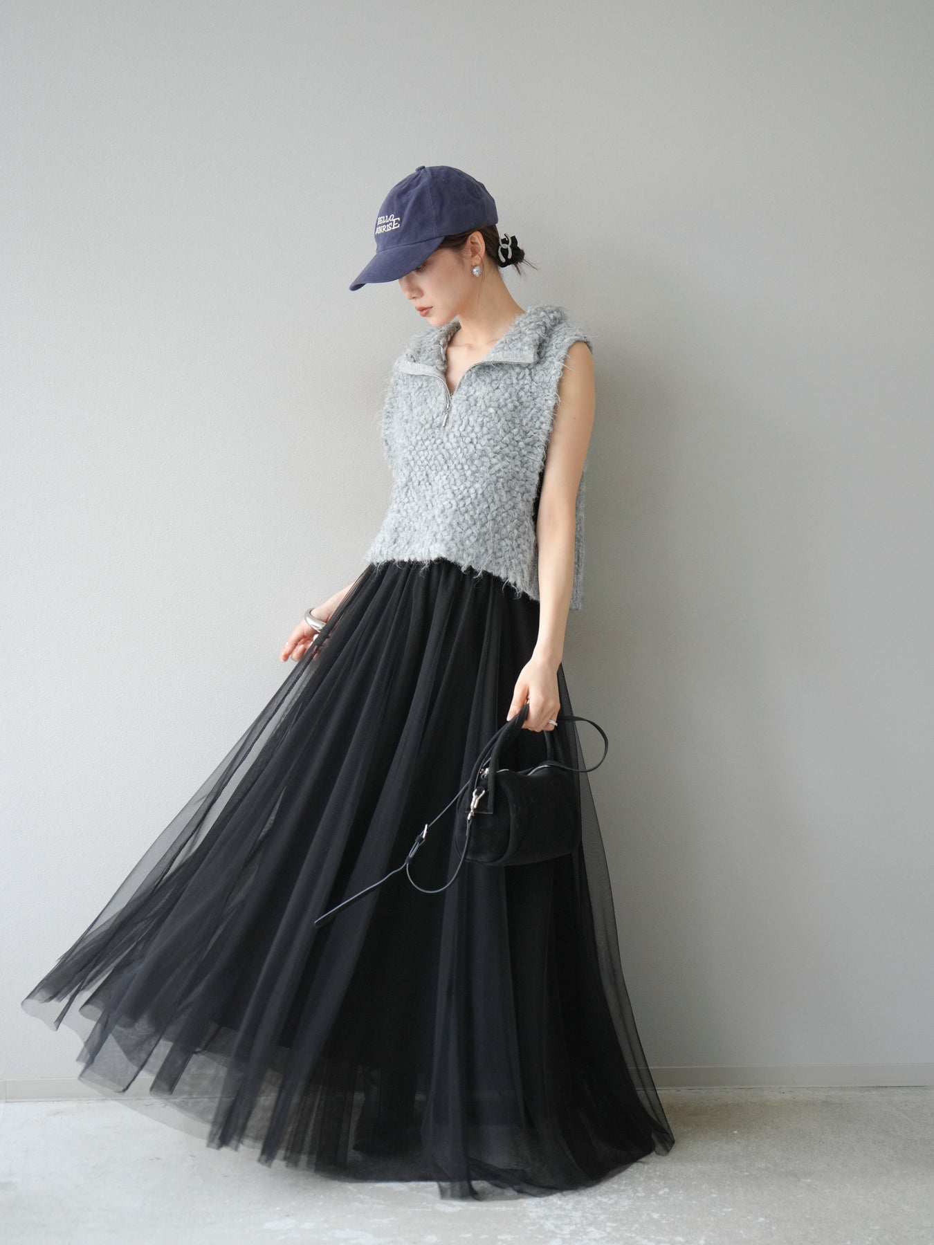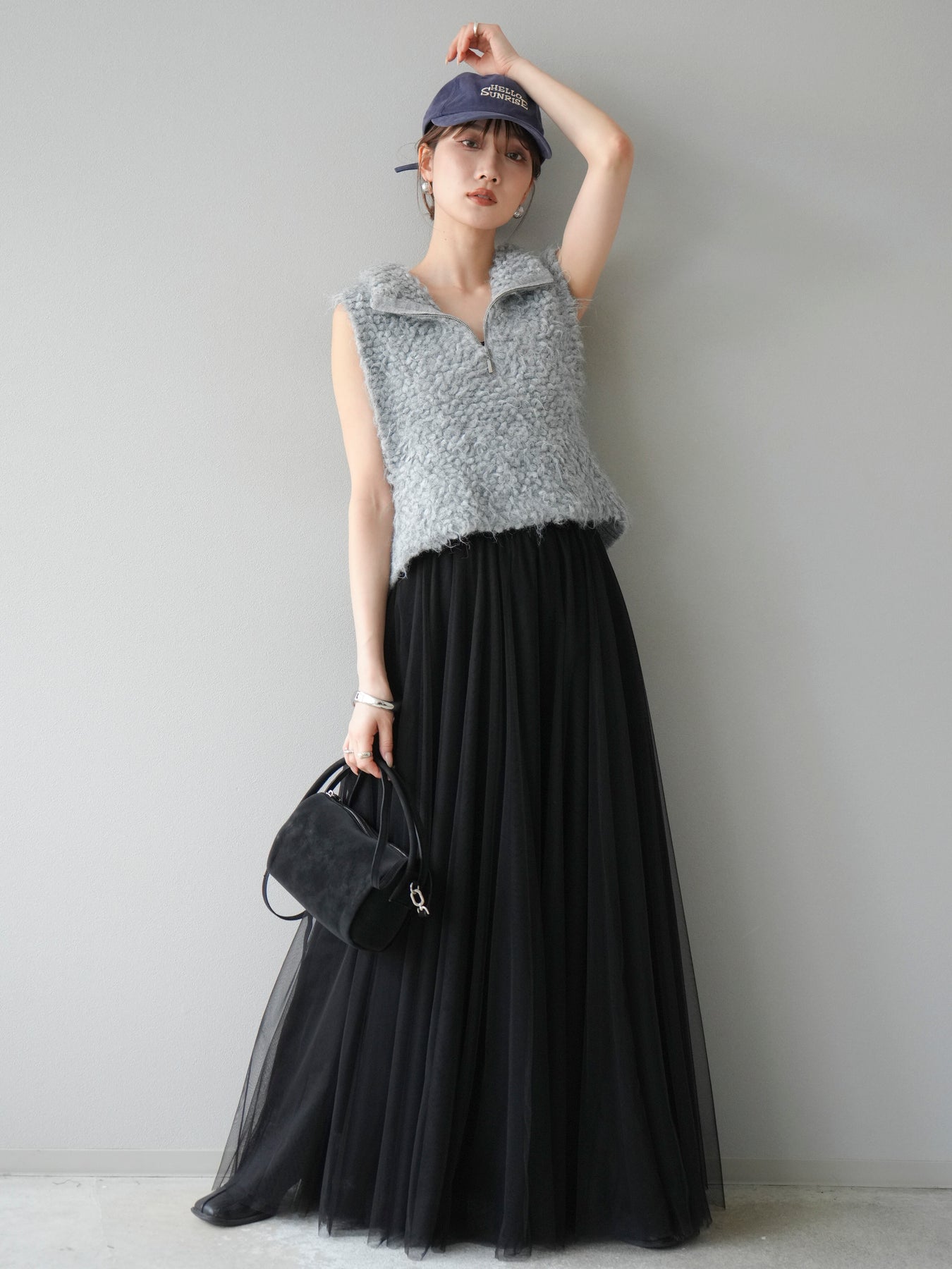 表情豊かなブークレ素材を使用したハーフジップデザインのニットベスト。メランジ調の風合いがスタイリングに奥行きを与え、カジュアルながらも上品な印象を演出します。ハーフジップで首元のアレンジが可能で、インナーとのレイヤードスタイルも自在。コンパクトなシルエットでバランスが取りやすく、デイリーに活躍する万能アイテムです。 ※ボトムス、キャミソール(インナー)以外の商品は一律でインナーは付属していません。