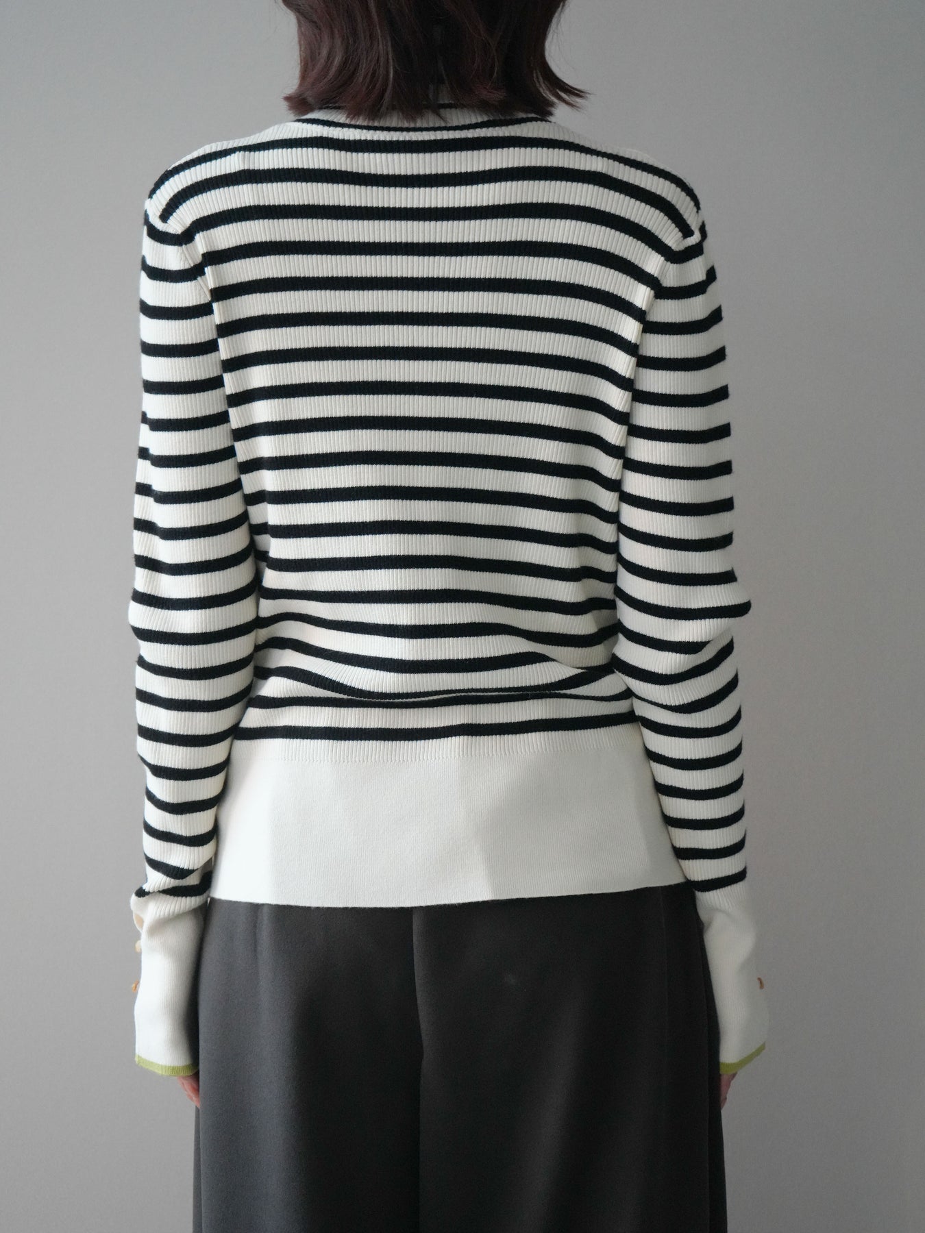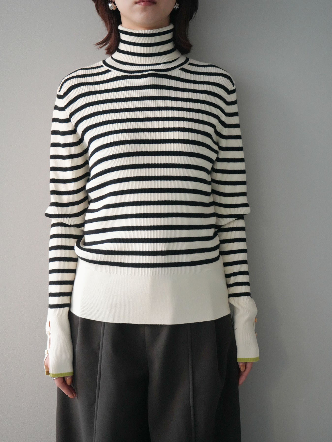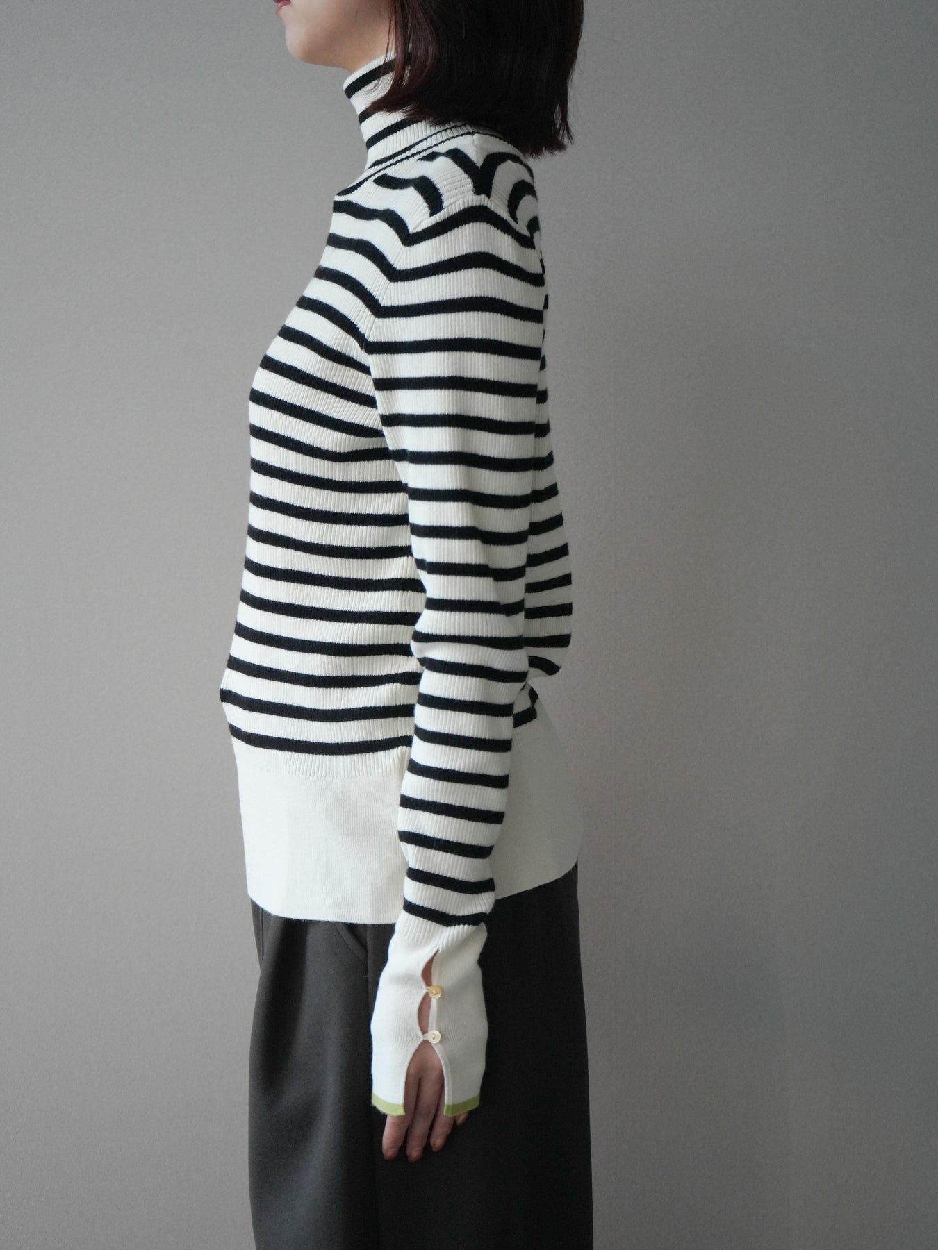 クラシックなボーダー柄に配色スリット袖を組み合わせた、ひとクセあるデザインが魅力のリブニットトップス。程よく身体に沿うリブ編みがシルエットをすっきり見せ、ハイネックが上品な印象をプラスします。袖口にはスリットとボタンを施し、配色のレイヤードが覗く遊び心のある仕上がりに。1枚で存在感がありながら、アウターのインにも合わせやすく、デイリーコーデに取り入れやすい万能アイテムです。 ※ボトムス、キャミソール(インナー)以外の商品は一律でインナーは付属していません。