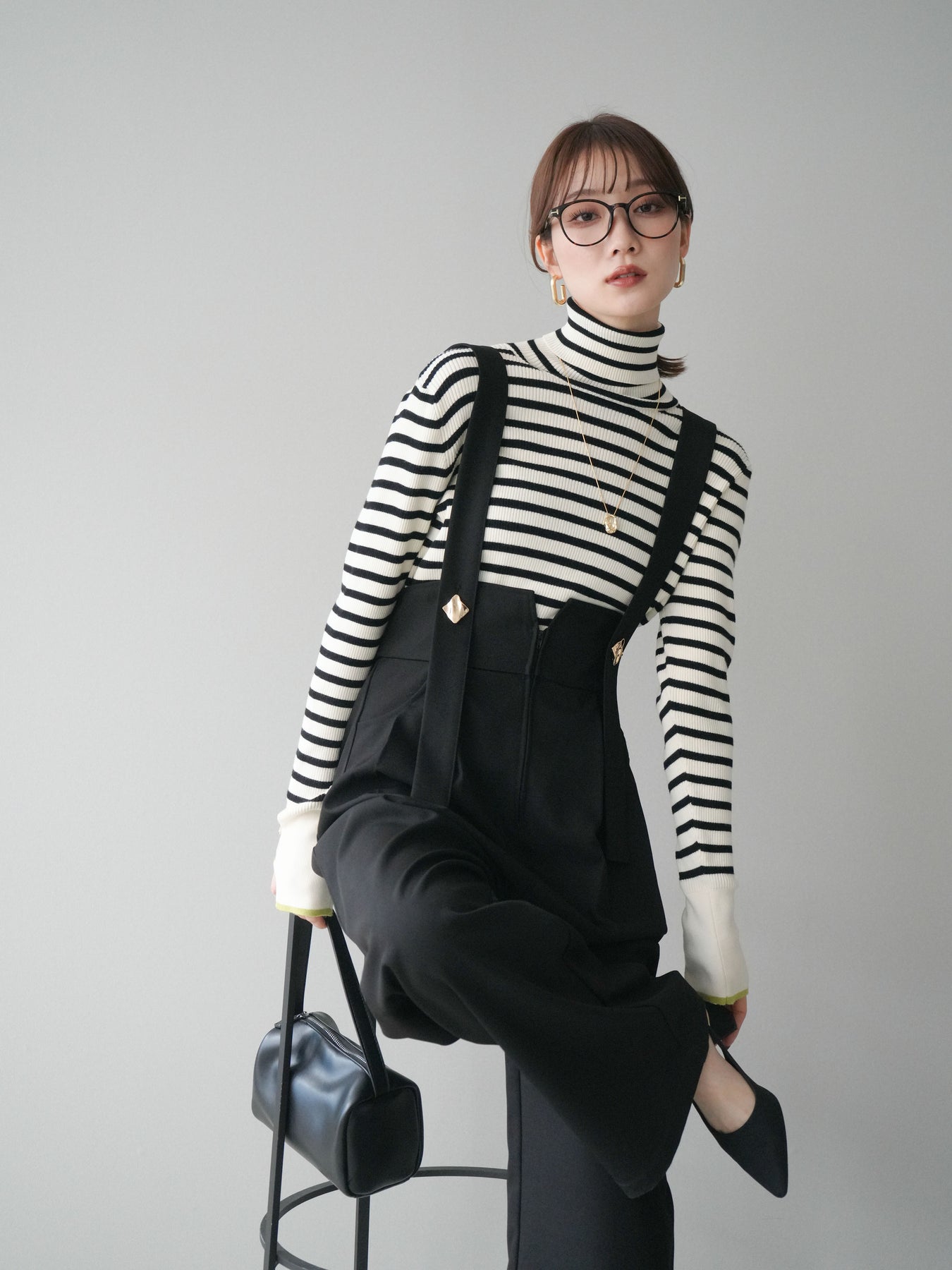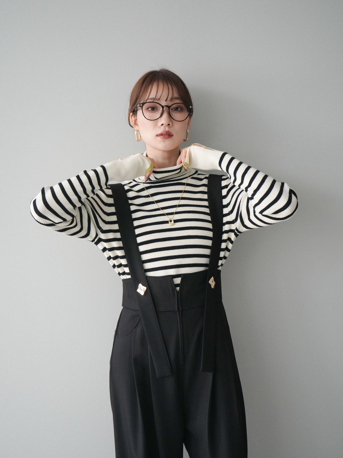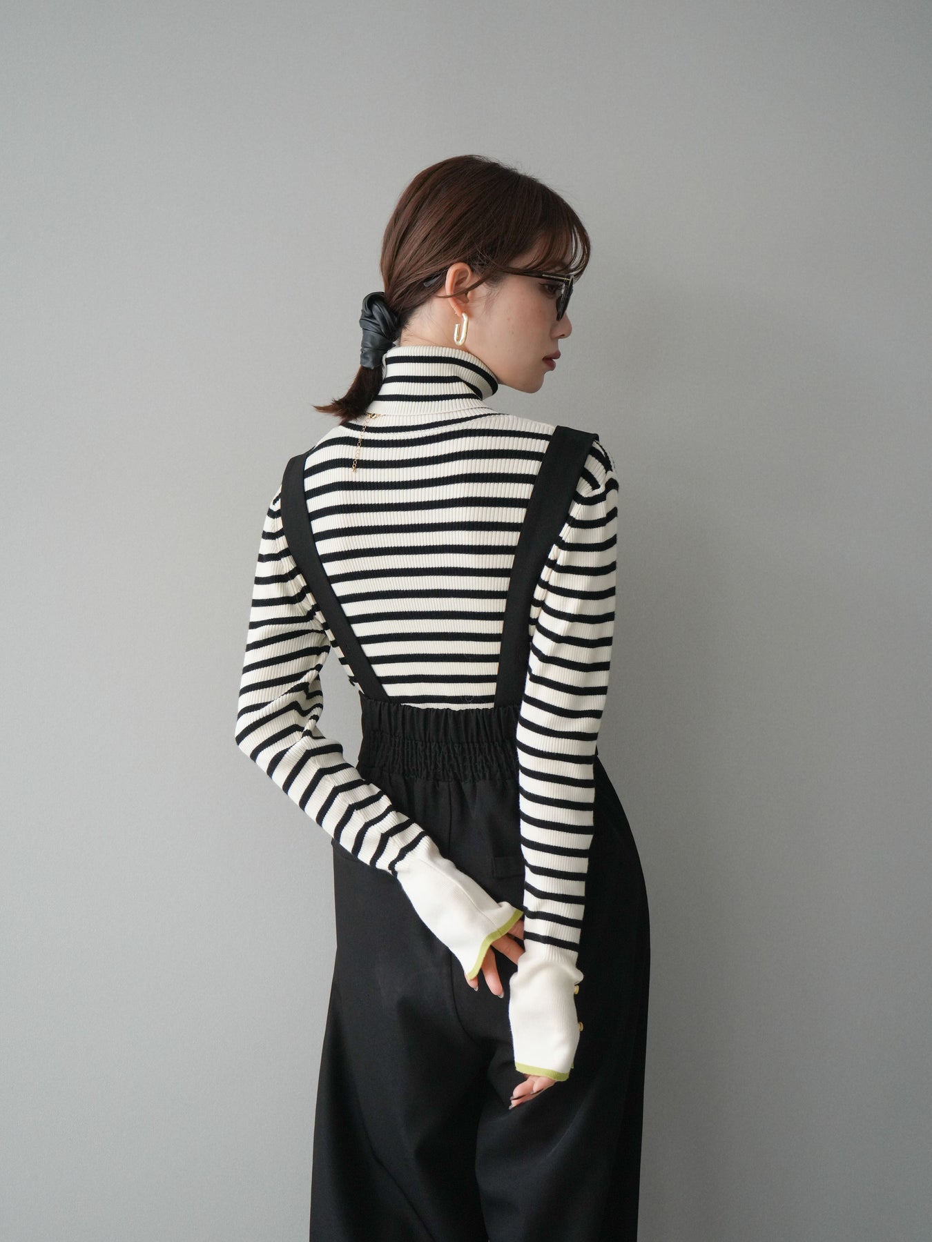 クラシックなボーダー柄に配色スリット袖を組み合わせた、ひとクセあるデザインが魅力のリブニットトップス。程よく身体に沿うリブ編みがシルエットをすっきり見せ、ハイネックが上品な印象をプラスします。袖口にはスリットとボタンを施し、配色のレイヤードが覗く遊び心のある仕上がりに。1枚で存在感がありながら、アウターのインにも合わせやすく、デイリーコーデに取り入れやすい万能アイテムです。 ※ボトムス、キャミソール(インナー)以外の商品は一律でインナーは付属していません。