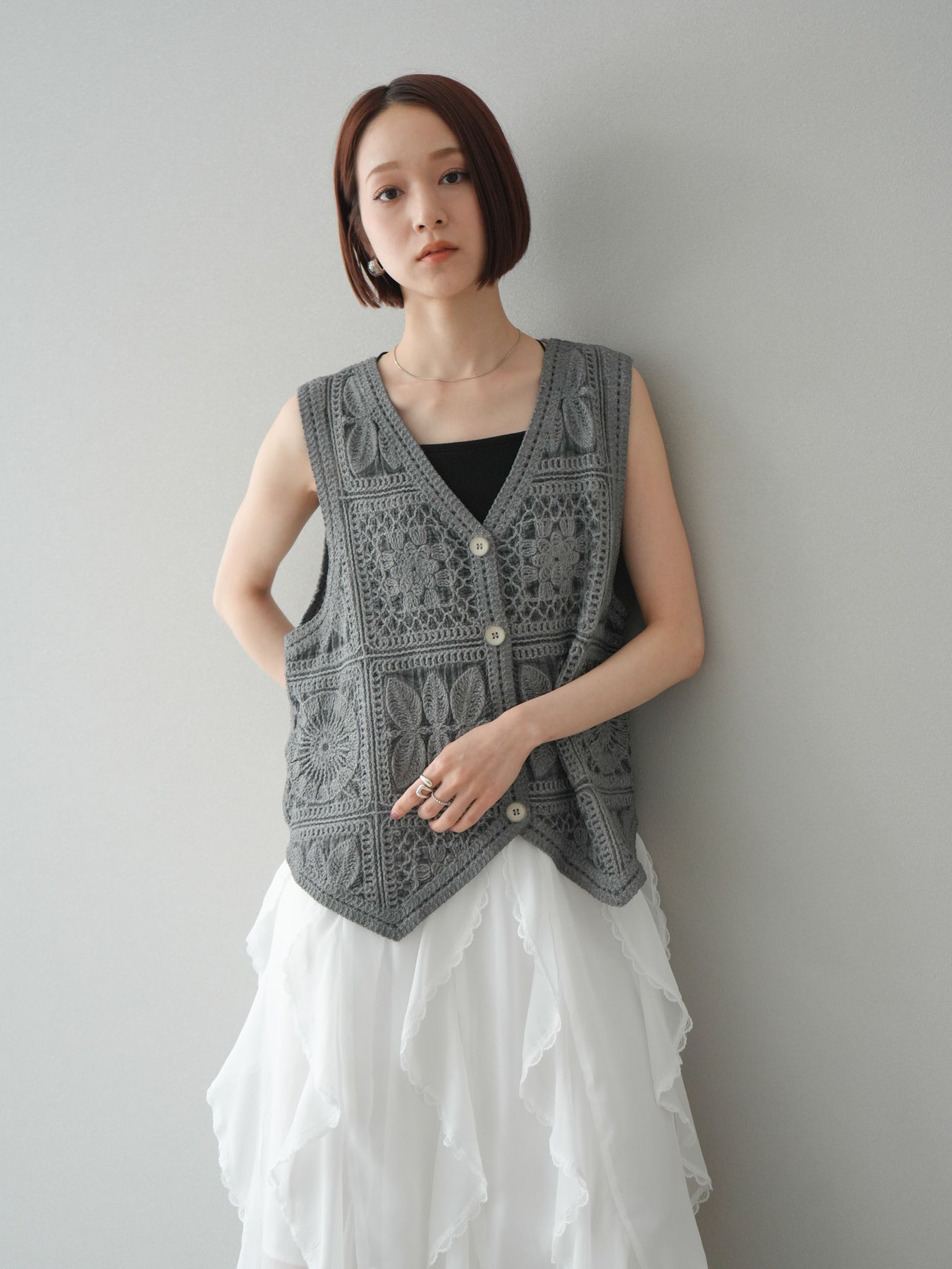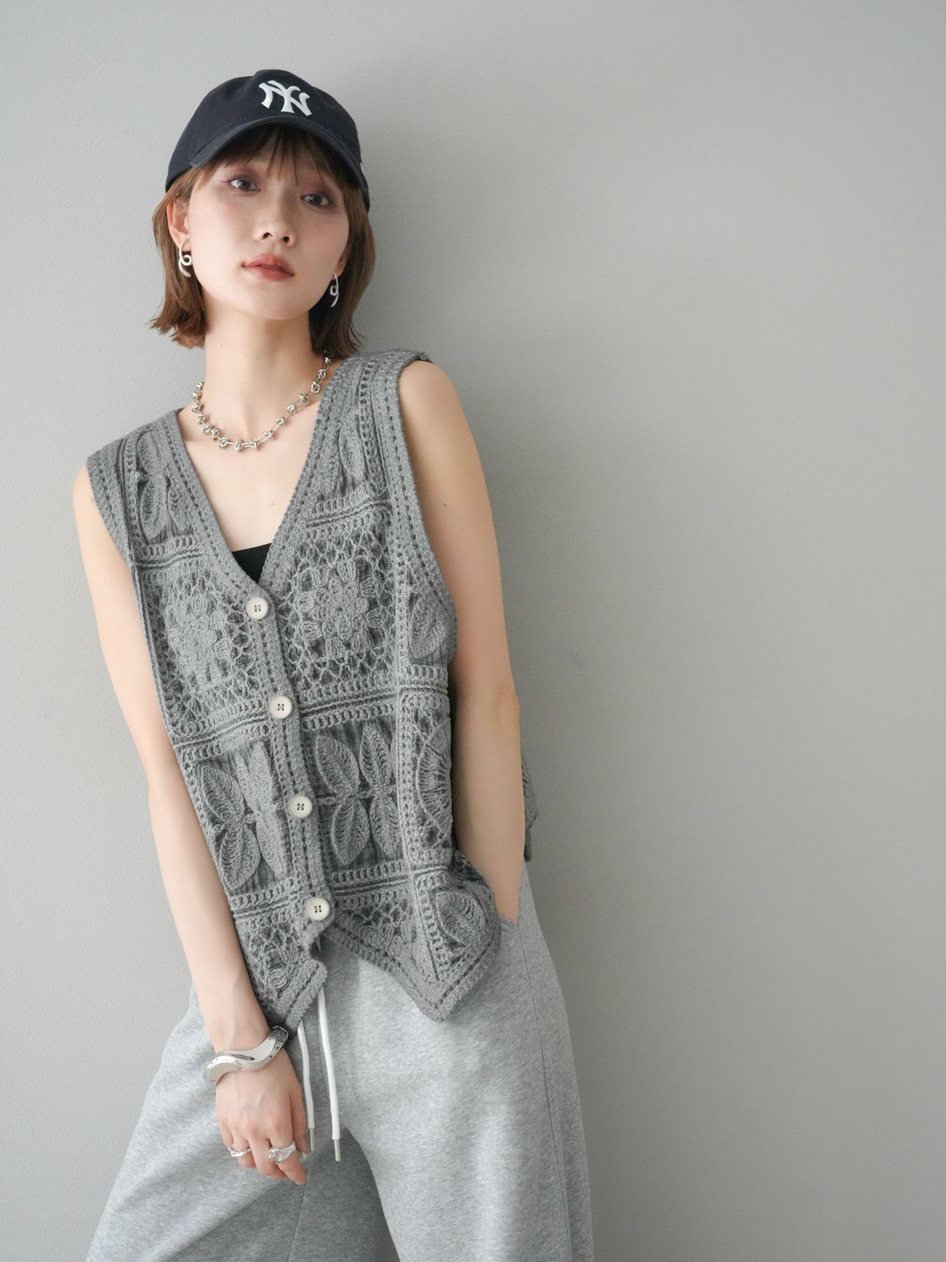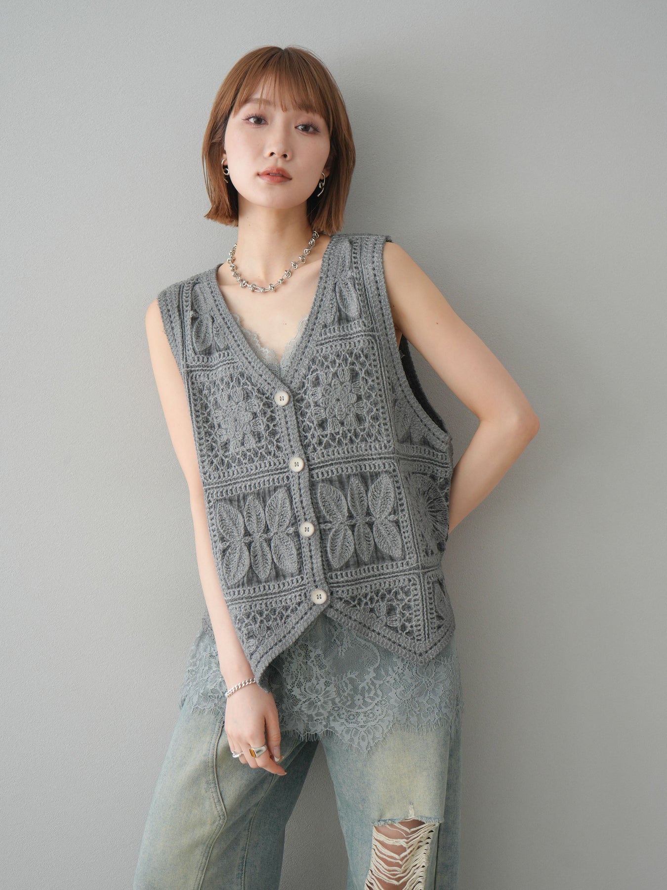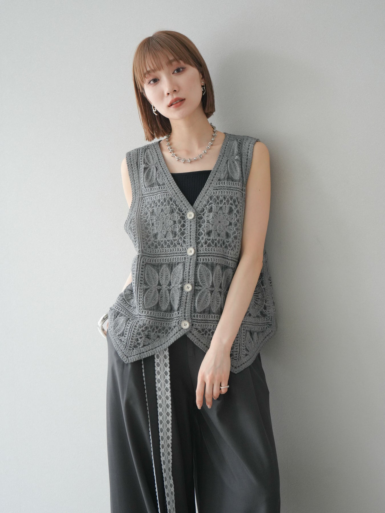 トレンドのクロシェ編みを取り入れたジレが登場。繊細な編み模様が魅力で、ナチュラルながらも程よく個性を演出します。フロントのボタンデザインがアクセントになり、開けても閉めても着こなしを楽しめるのがポイント。シンプルなインナーとレイヤードするだけで、こなれたスタイリングが完成。ワンピースやTシャツとの相性も抜群で、幅広いコーディネートに活躍するアイテムです。 ※ボトムス、キャミソール(インナー)以外の商品は一律でインナーは付属していません